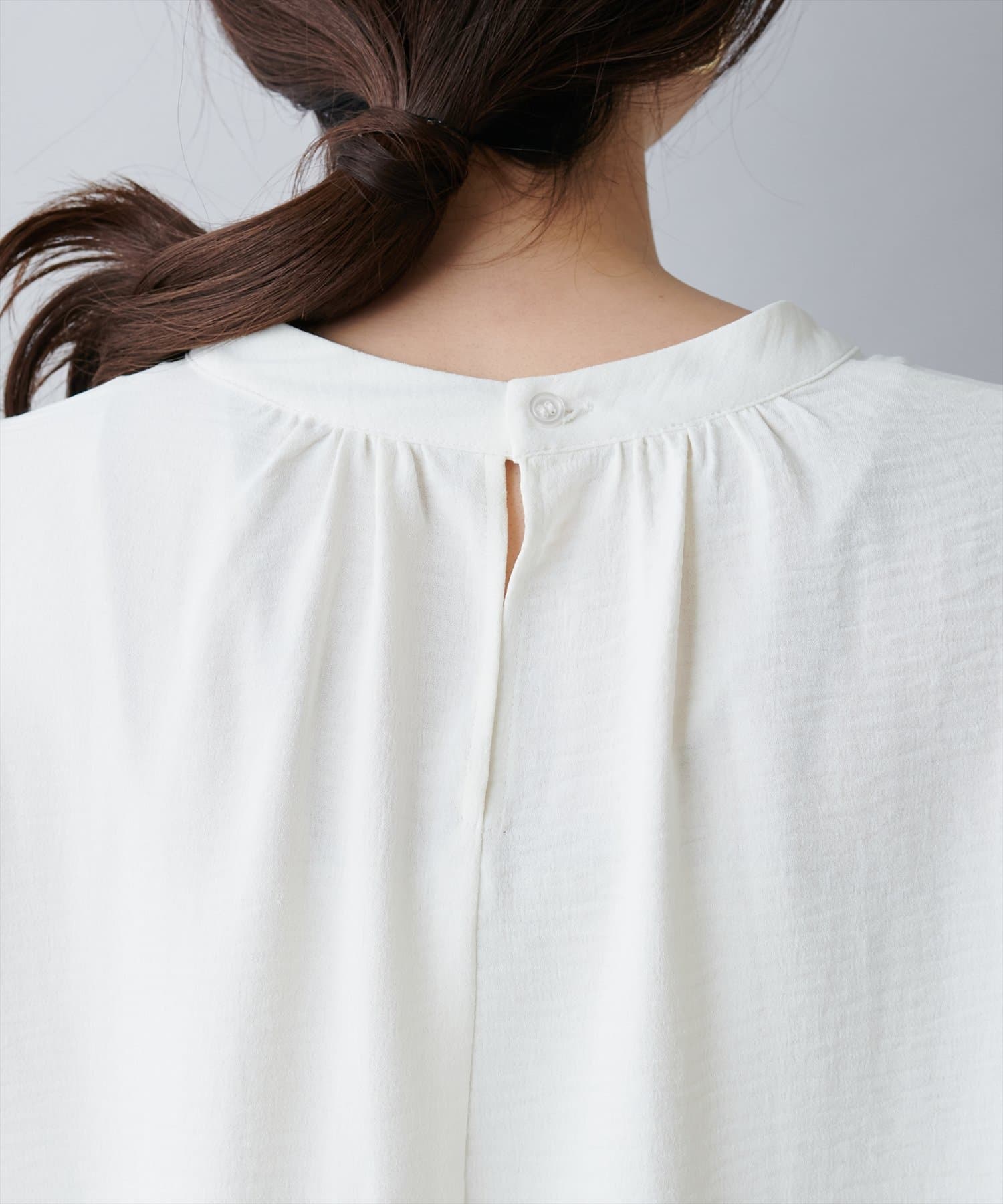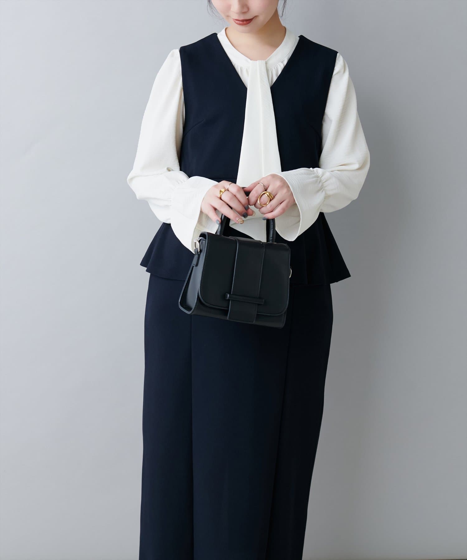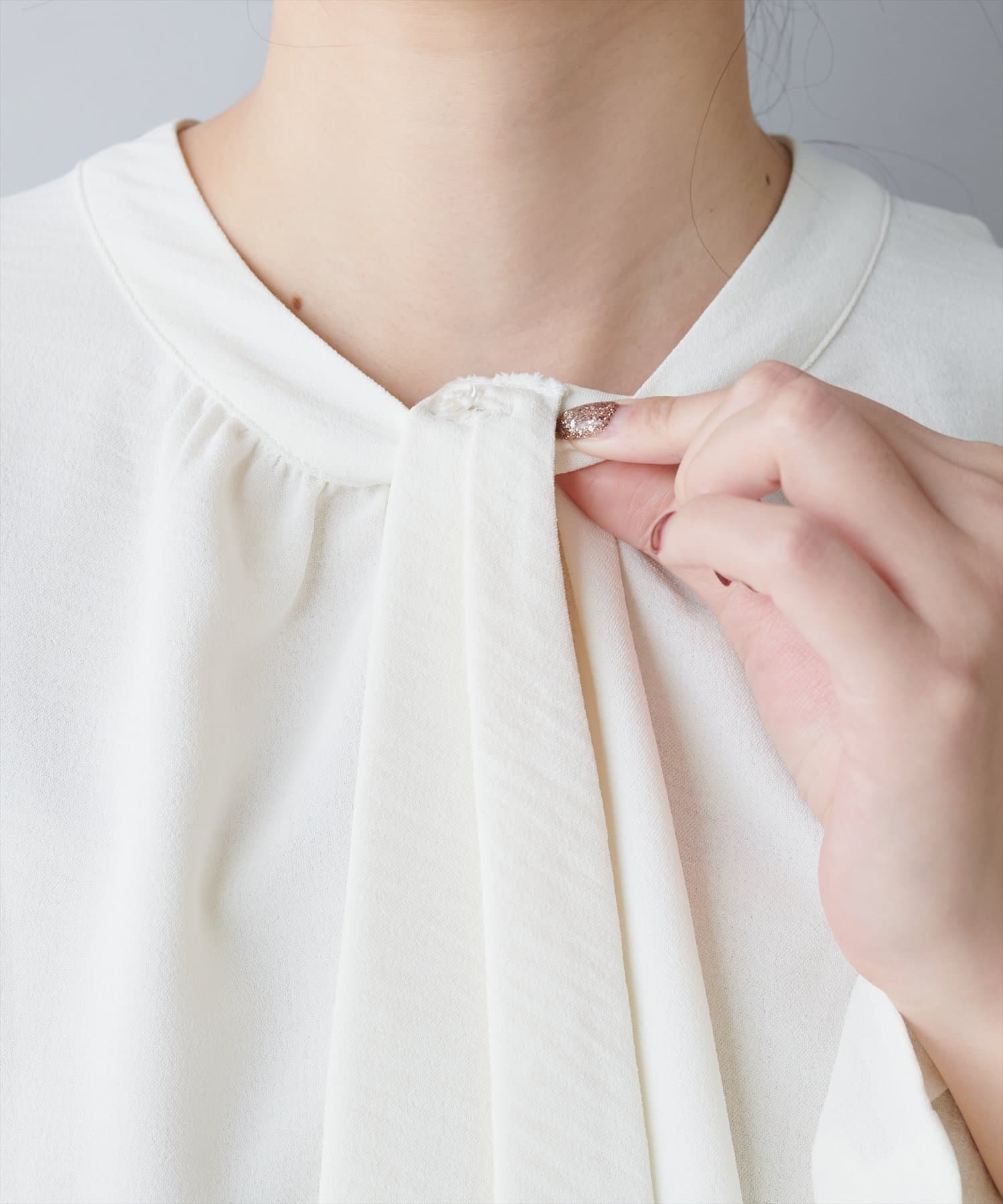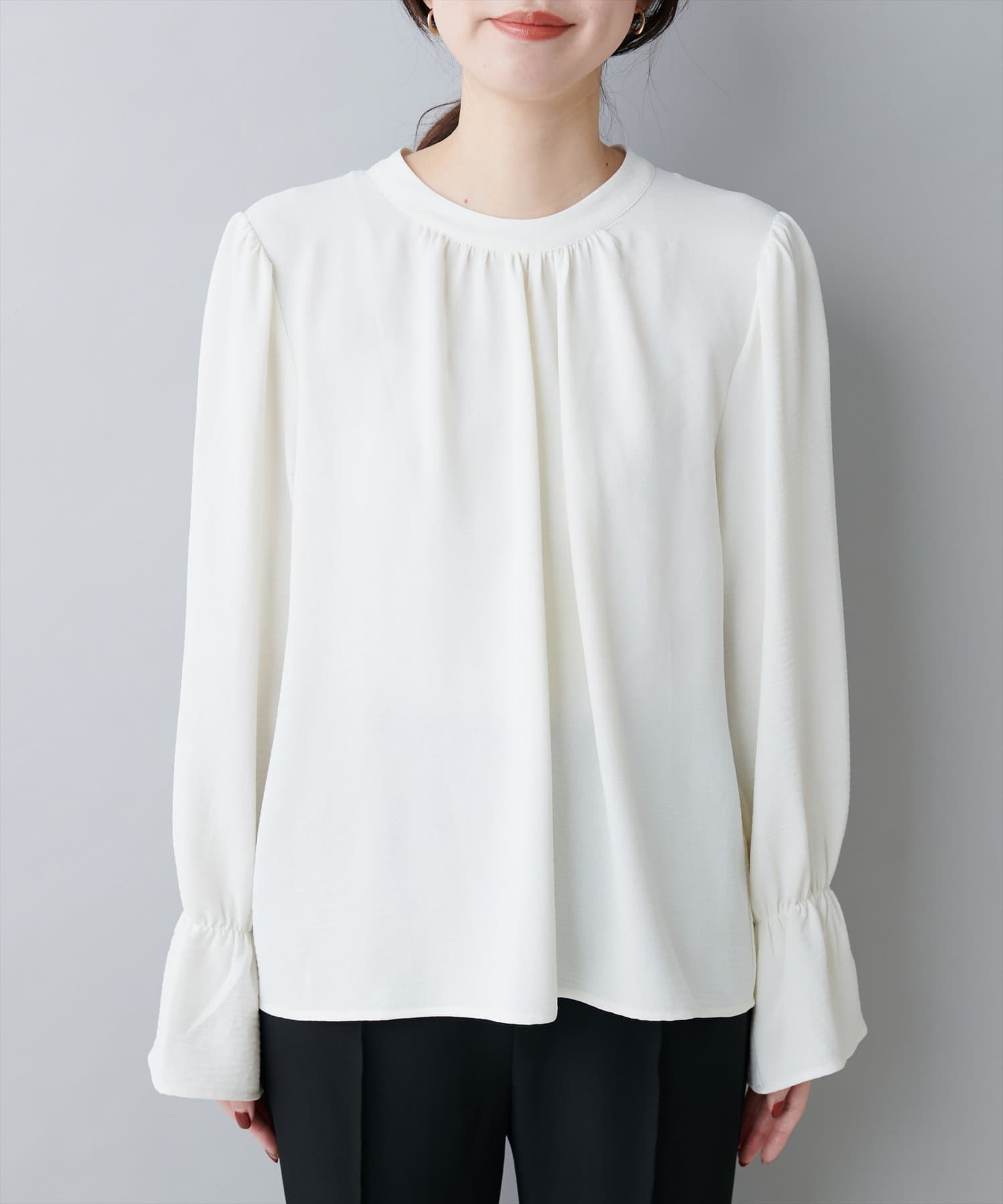 大人気のボウタイブラウスは、なめらかでマットな艶感のある素材を使用。