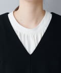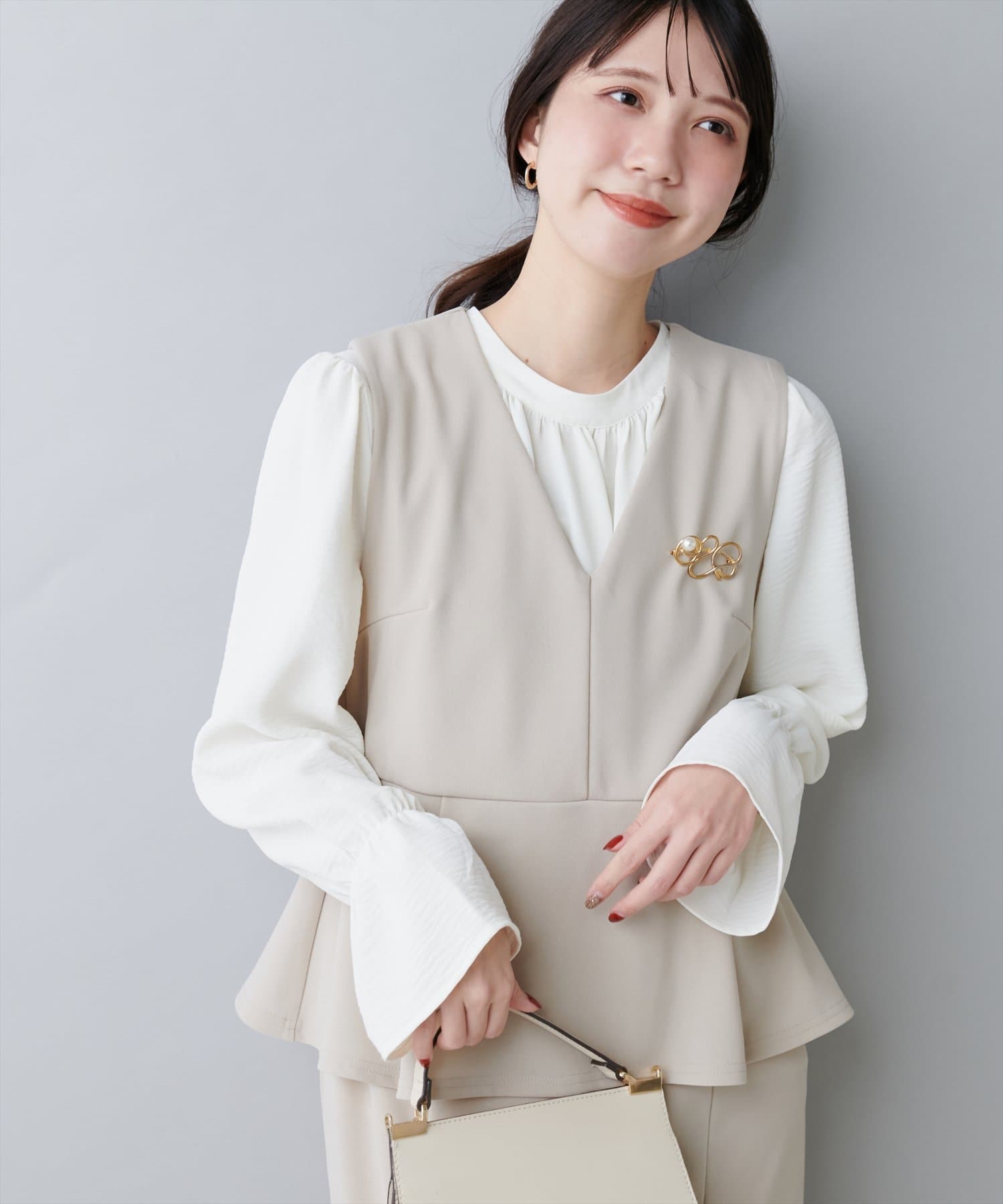ブラウスは薄金釦テーラードジャケットのインナーとして、