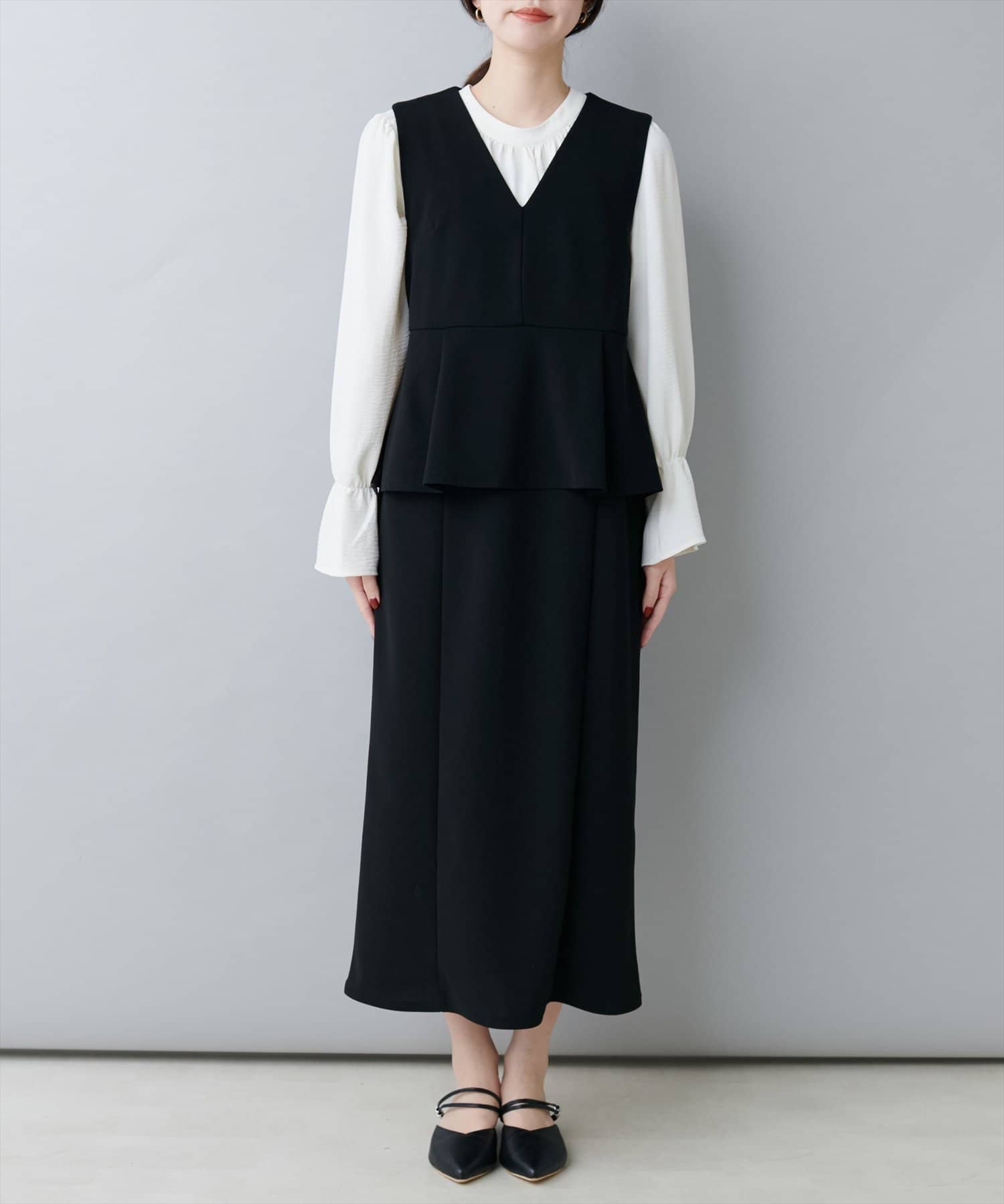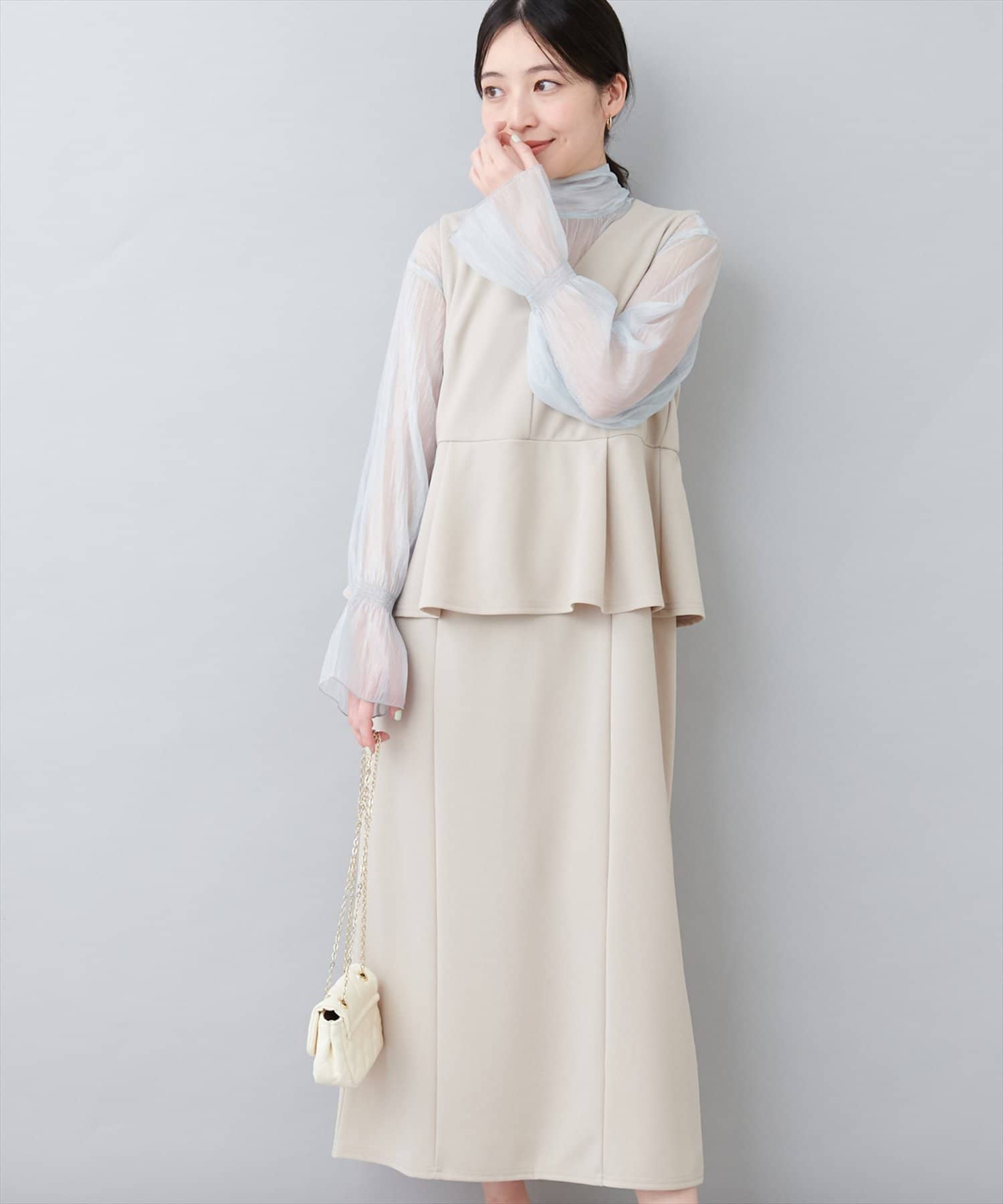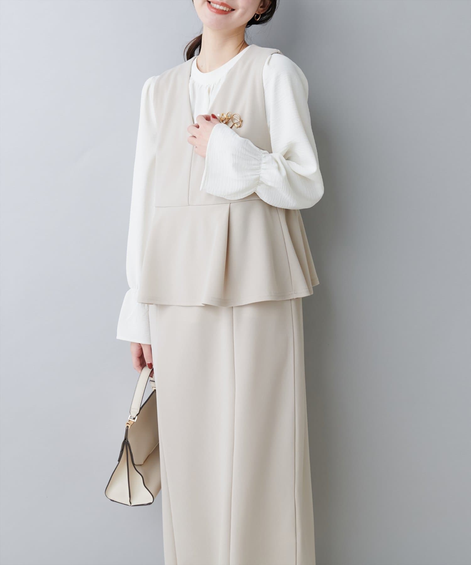 ブラウスとワンピースをセットでお召いただいたスタイルがおすすめ。