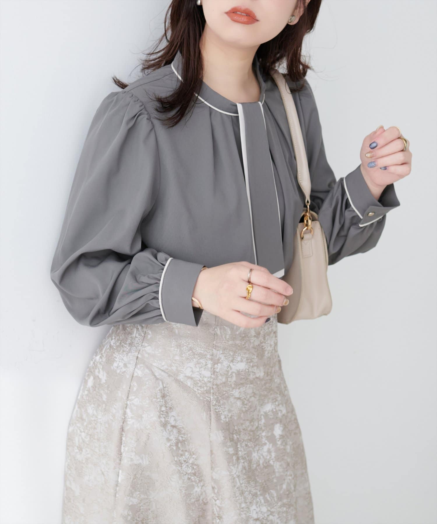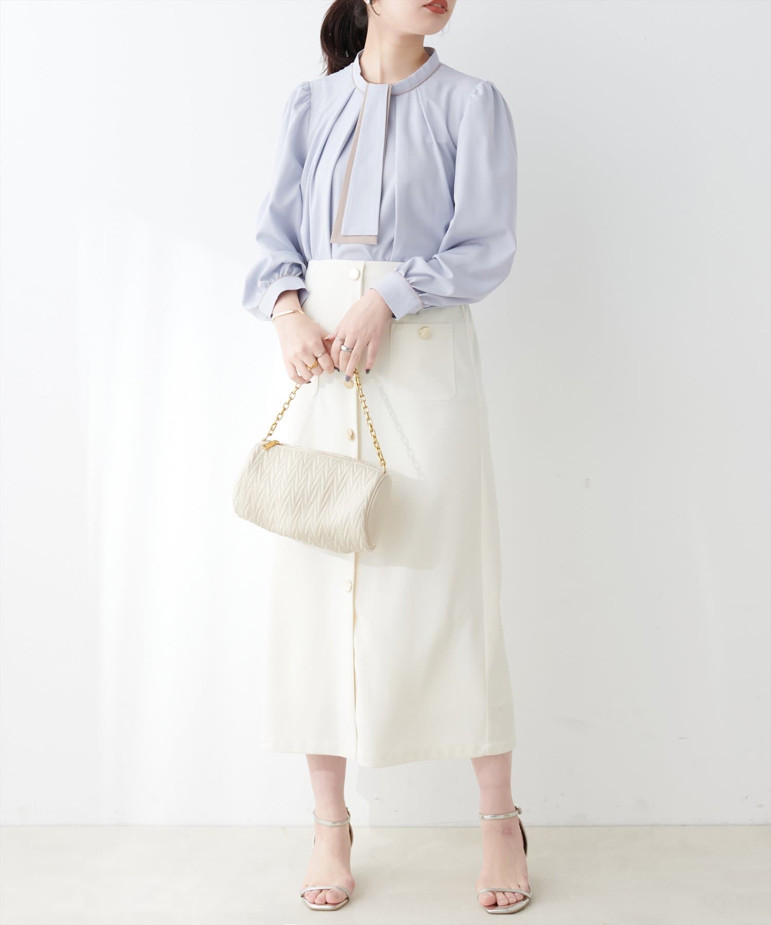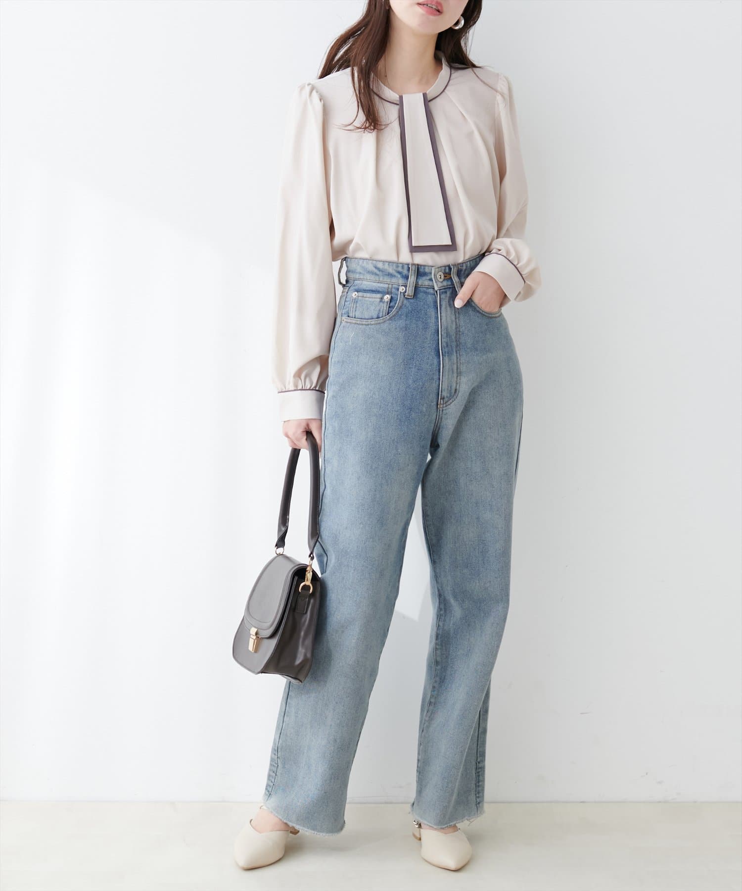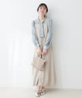 ブラウスがさらりとしている分、ボトムは厚みのあるアイテムを合わせて素材感にメリハリを付けるのがおすすめです。