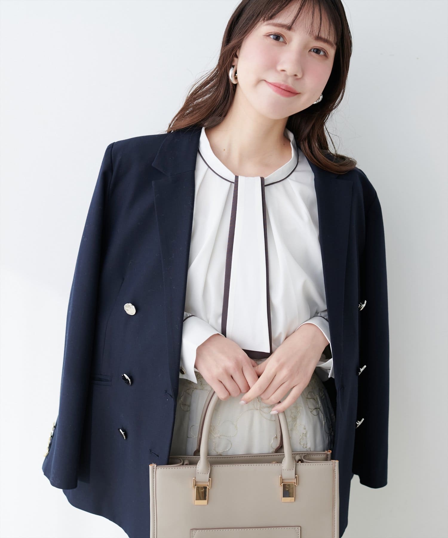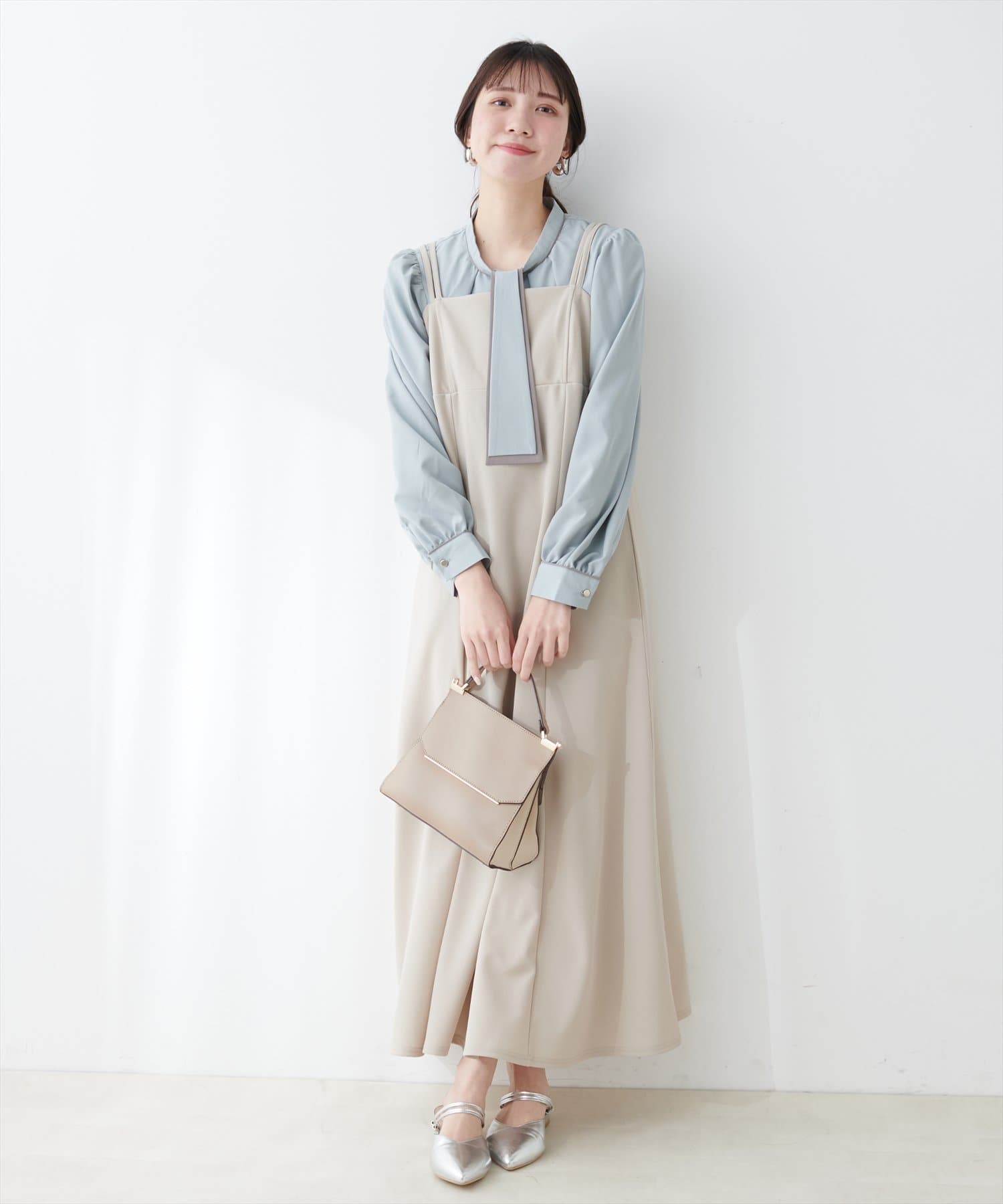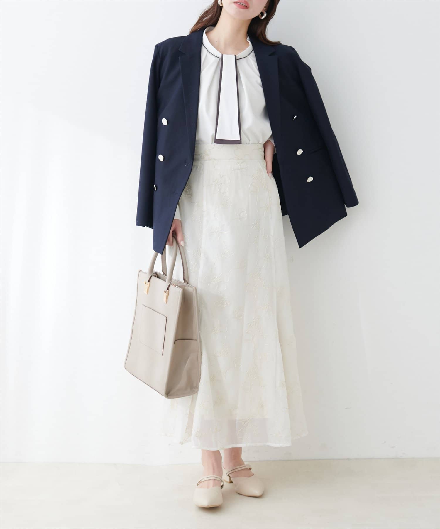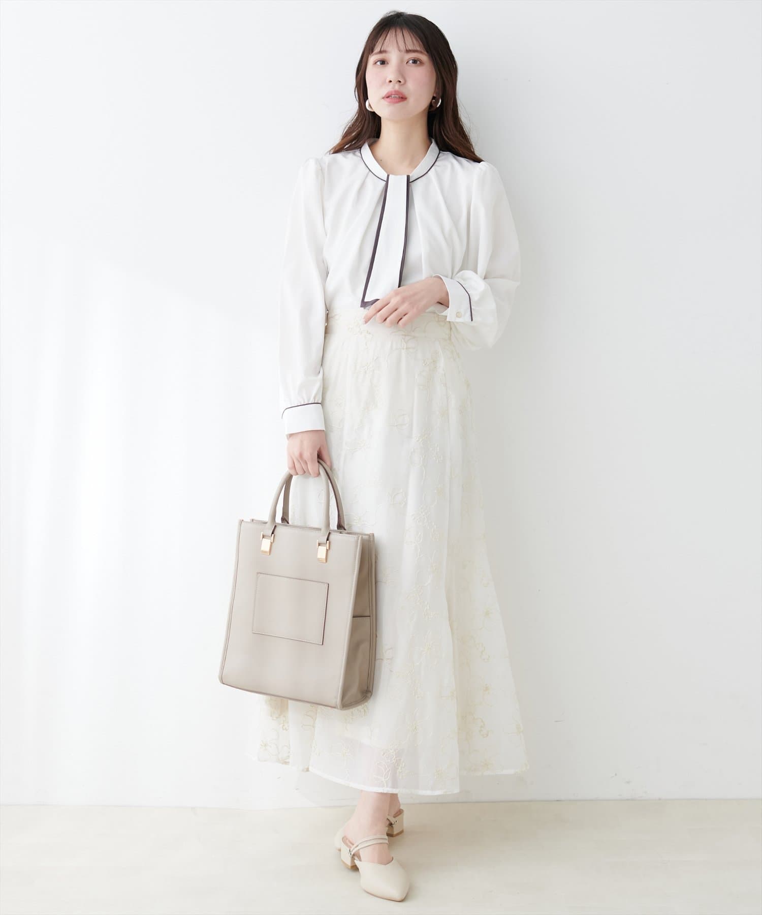 ブラウスがさらりとしている分、ボトムは厚みのあるアイテムを合わせて素材感にメリハリを付けるのがおすすめです。