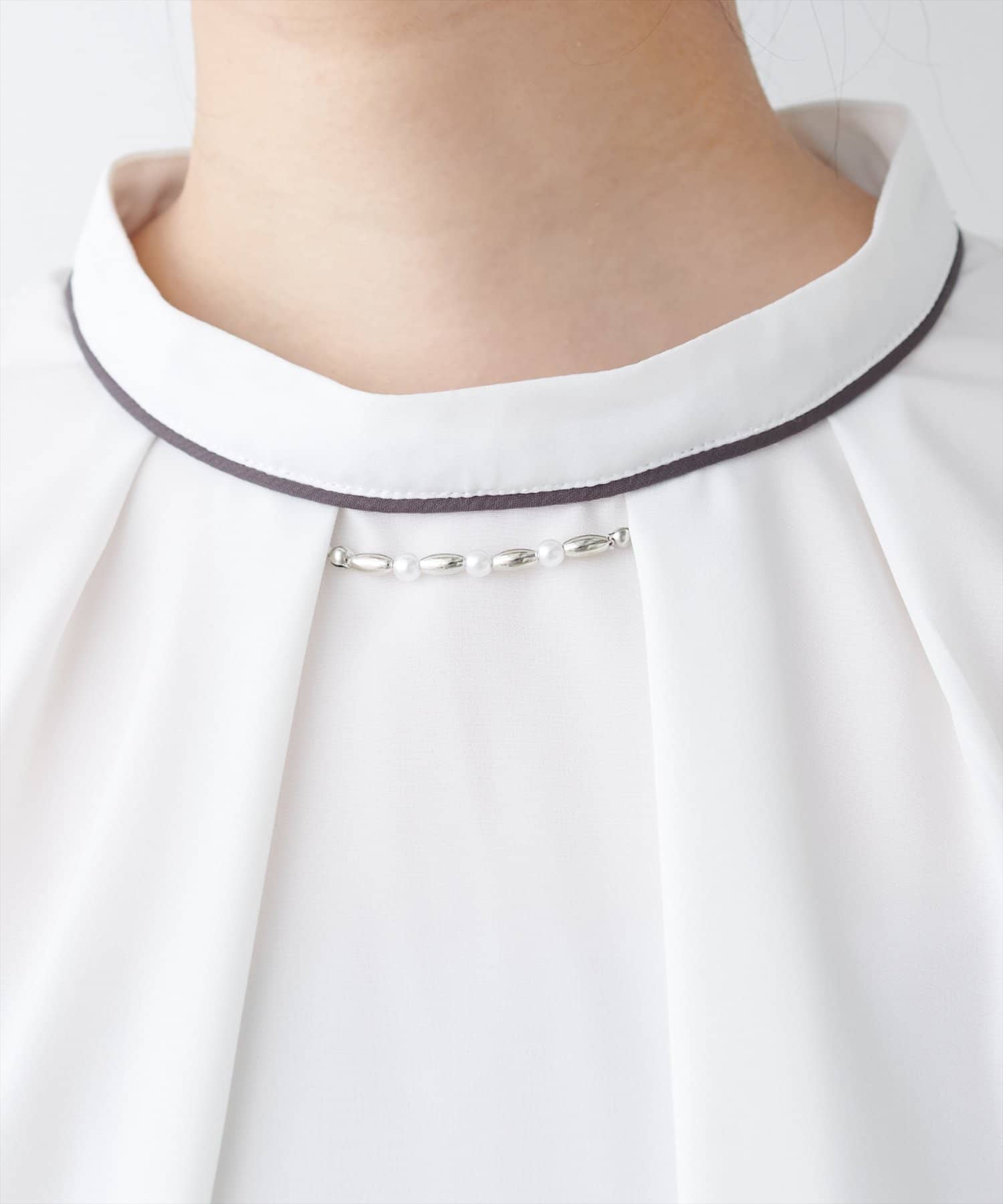 胸元のボウタイを外して、シルバーアクセントのスタイルや