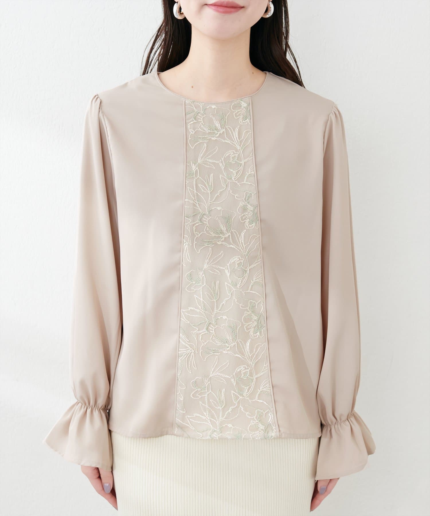 フロントレースが上品な華やかさを演出してくれるブラウス。