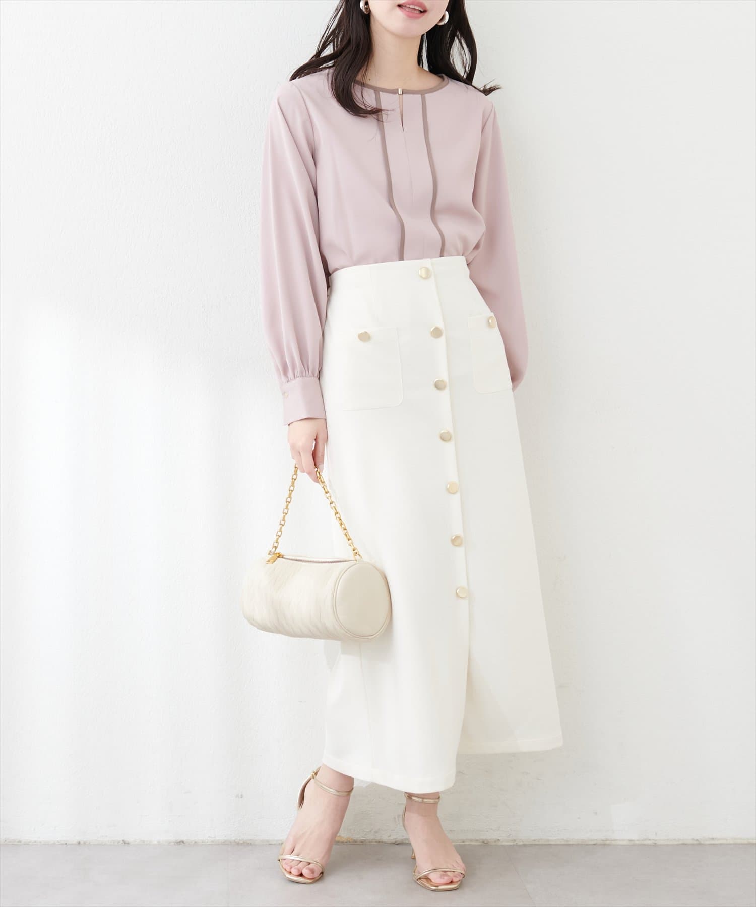 さらっとしたポリエステル素材で落ち感のある生地が、コーデを上品さと女性らしい印象に仕上げてくれます。