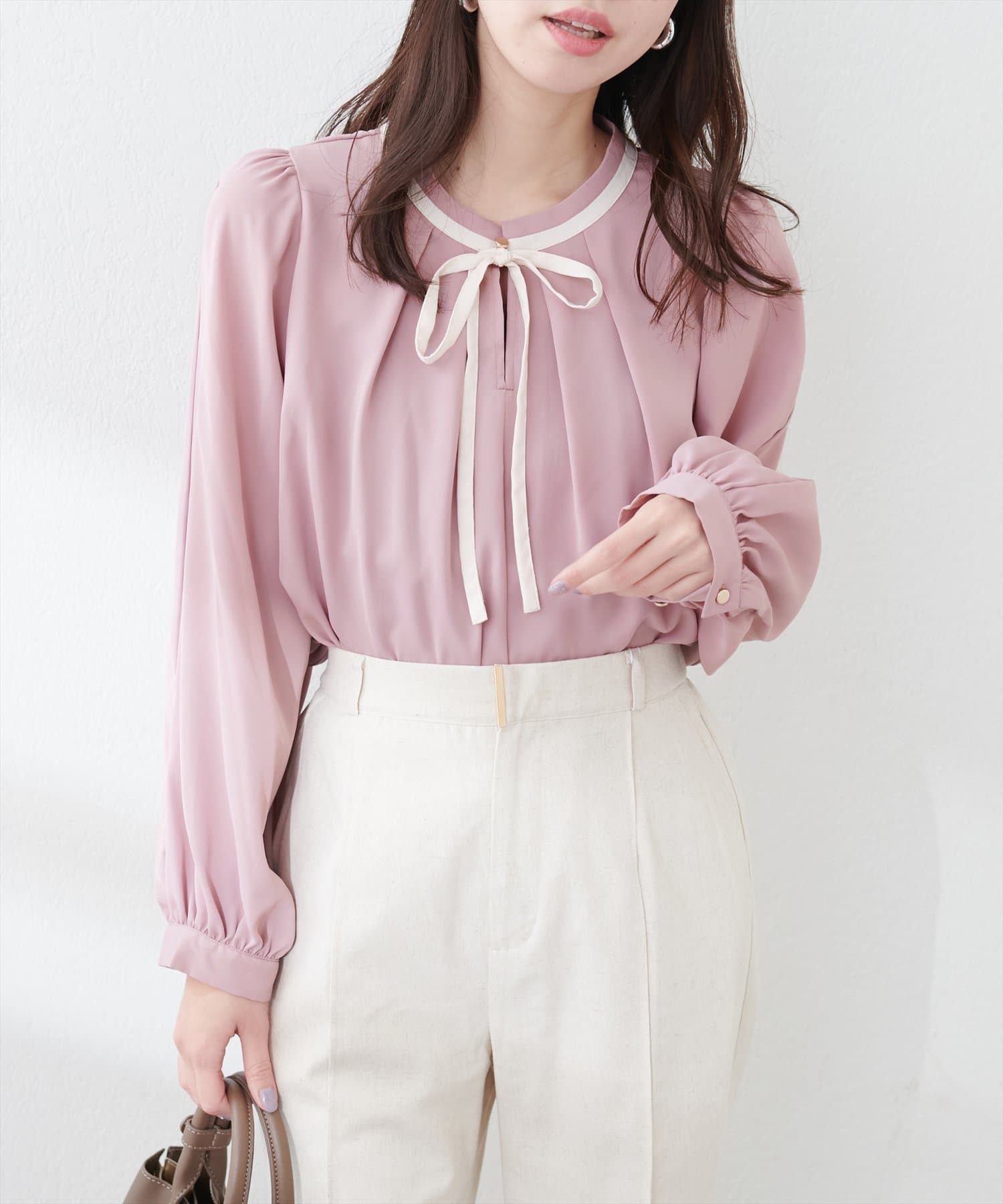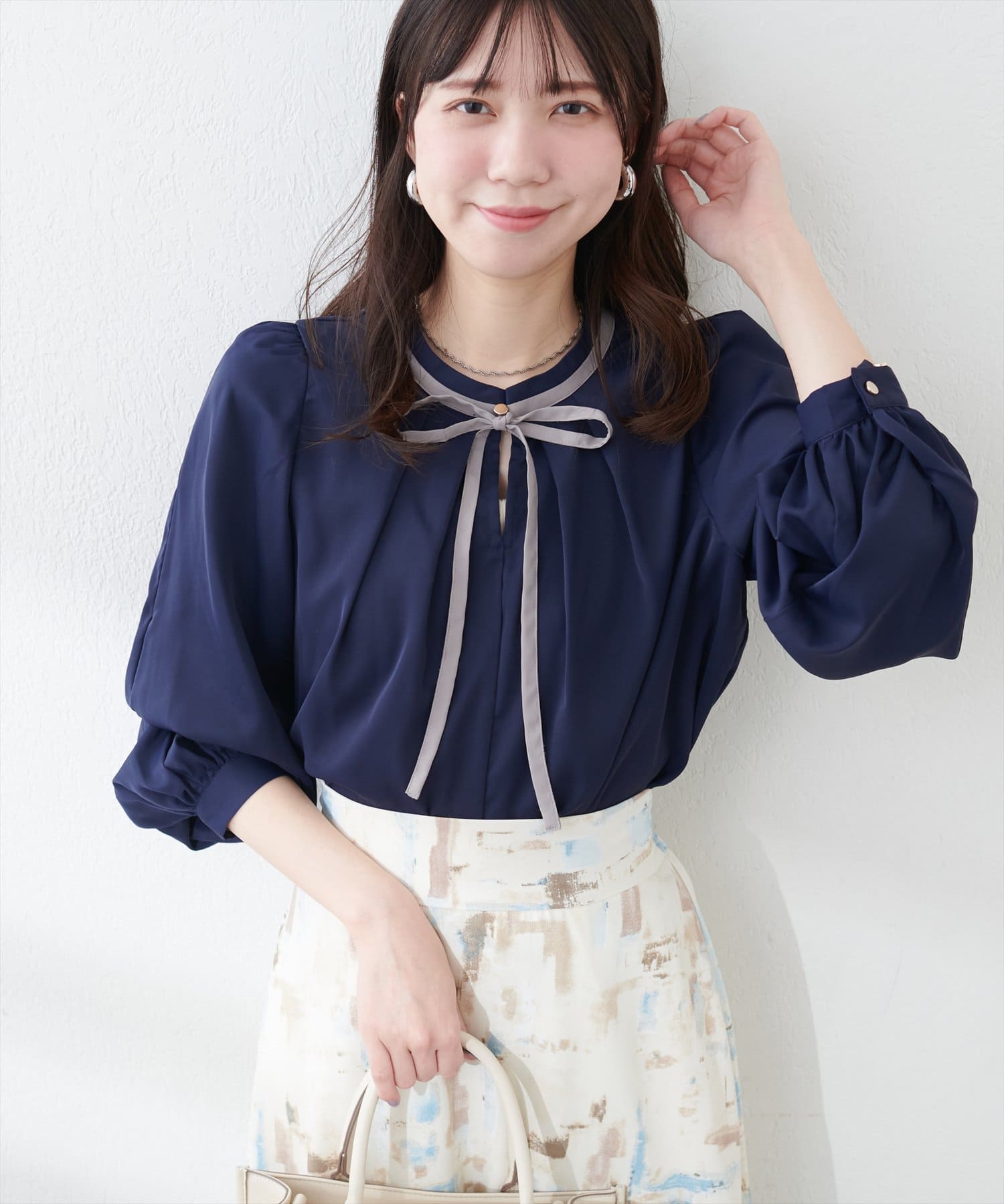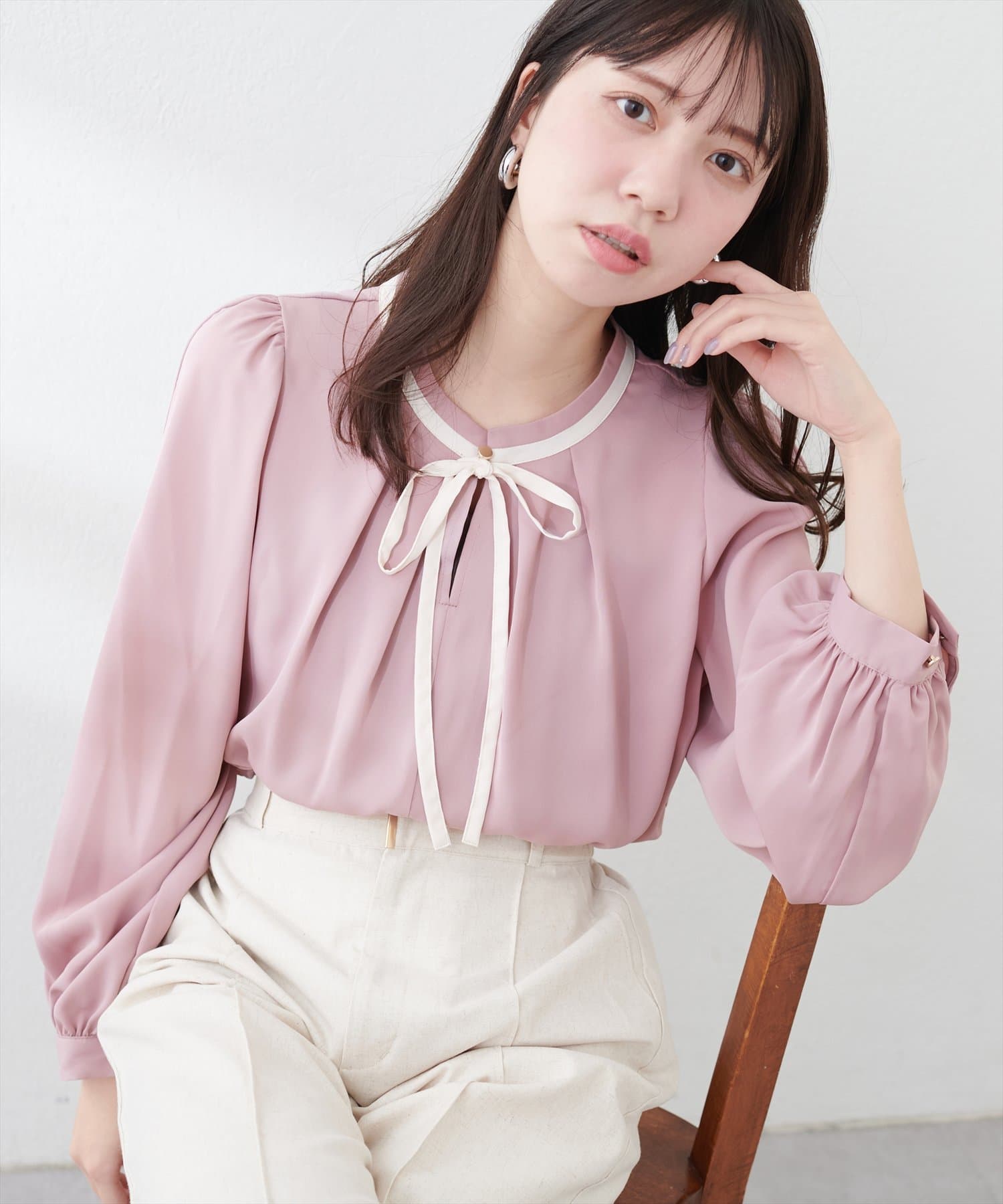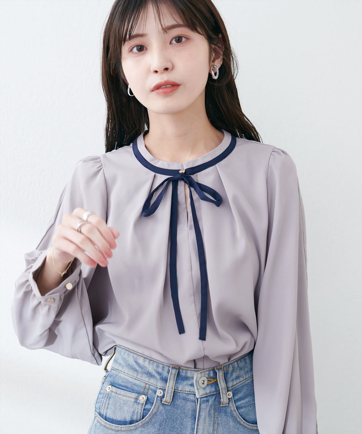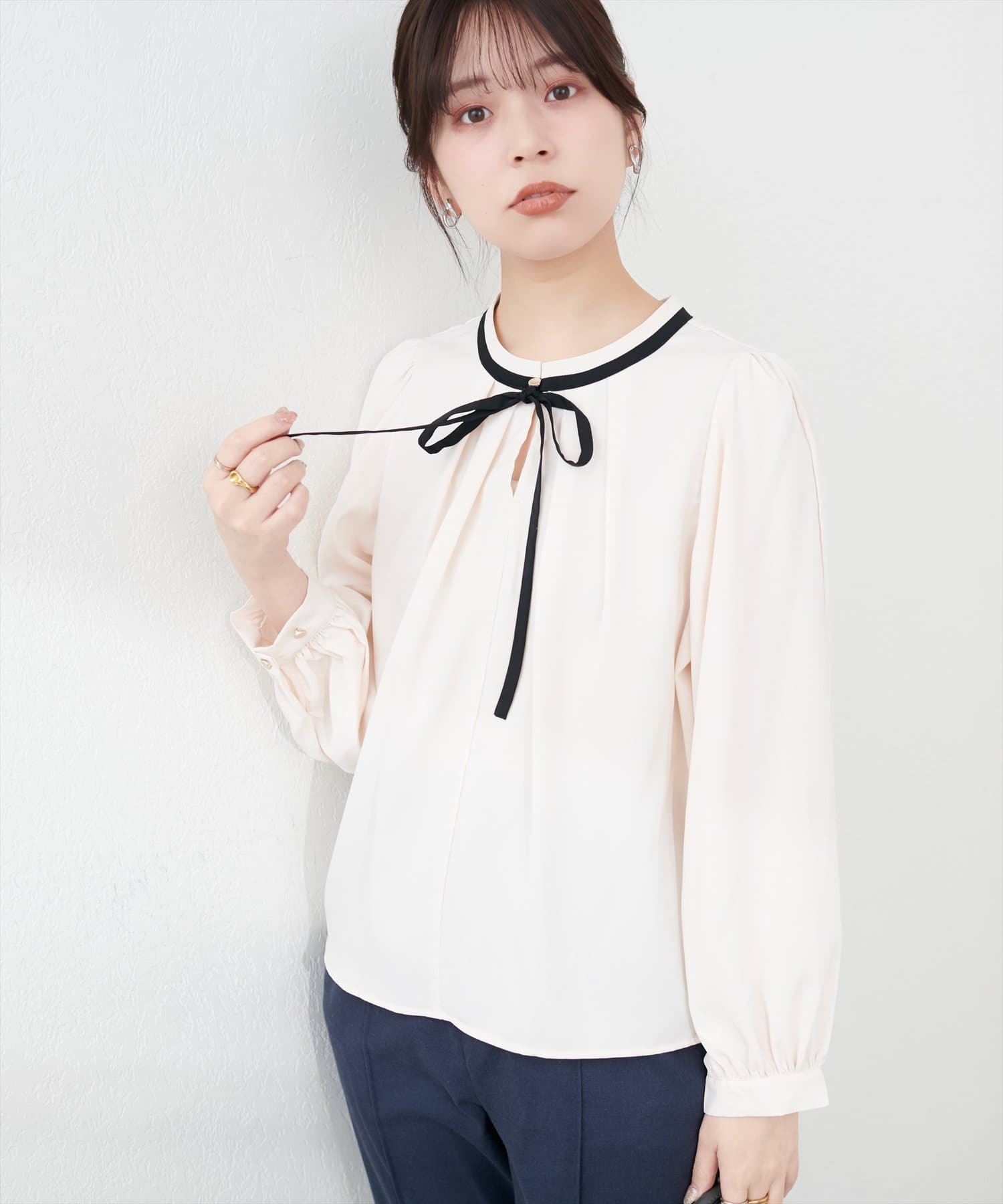 配色のリボンがシンプルのなかに華やかさをプラスしてくれるブラウス。