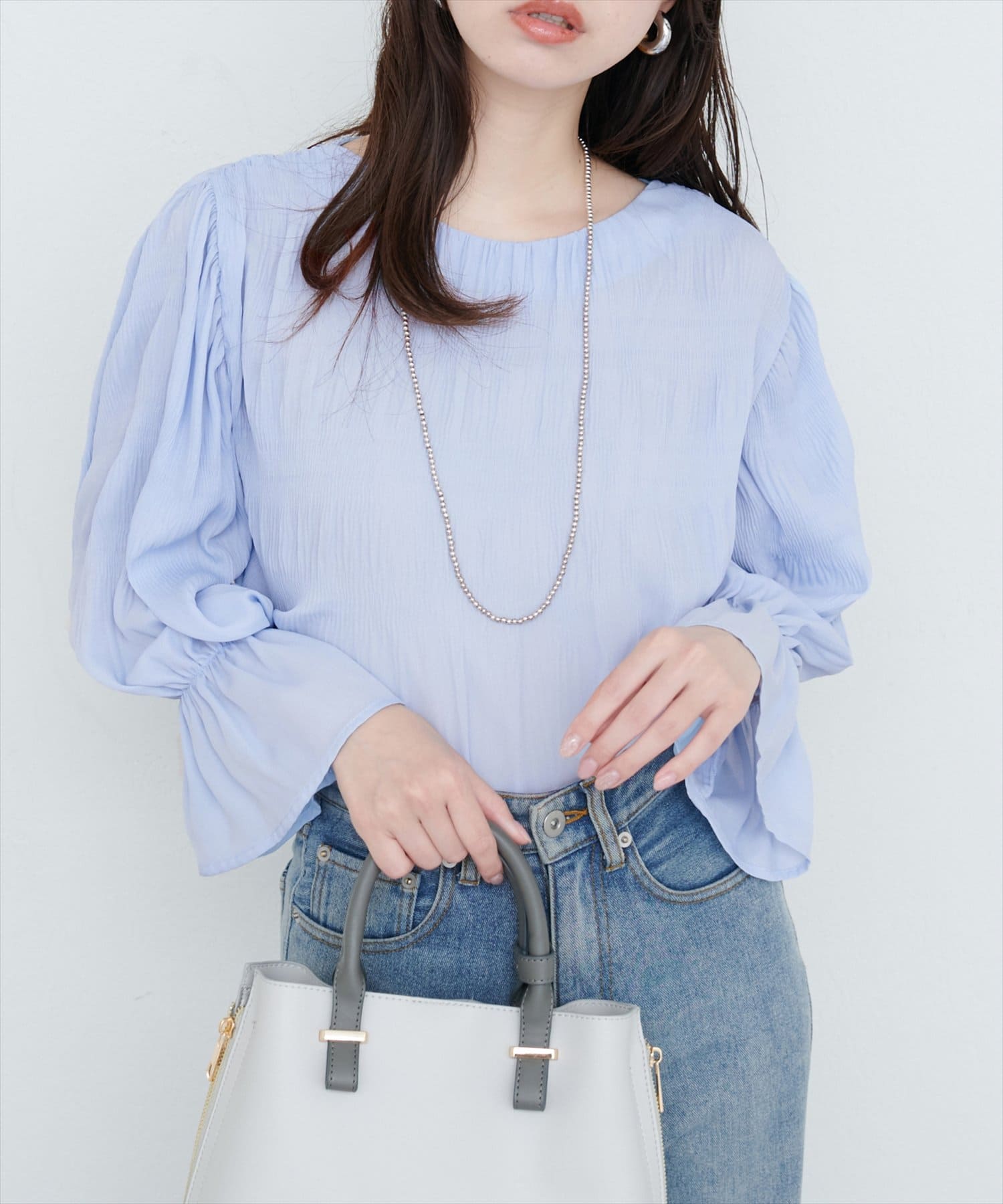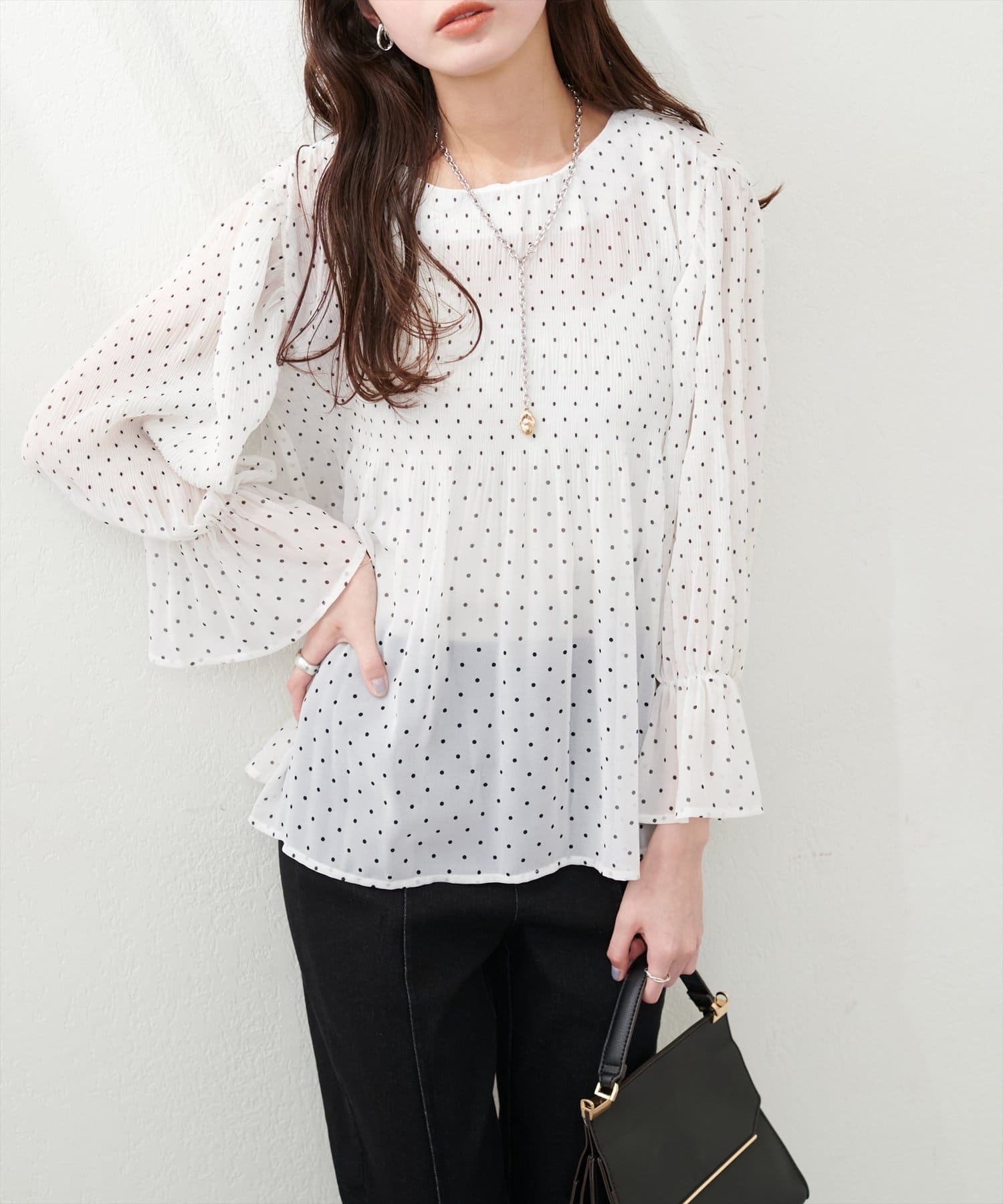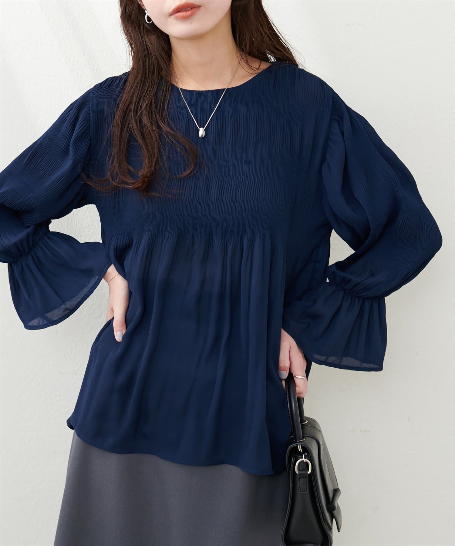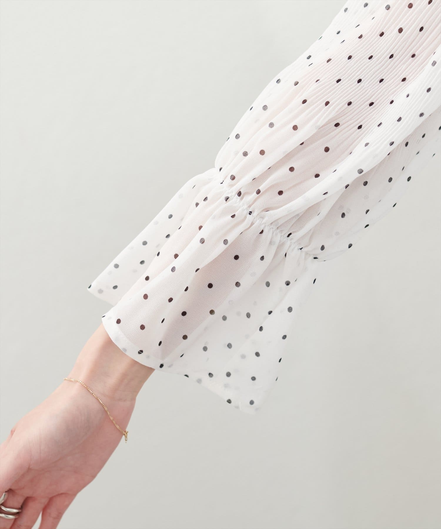 プリーツ素材が柔らかに揺れるフェミニンブラウス
