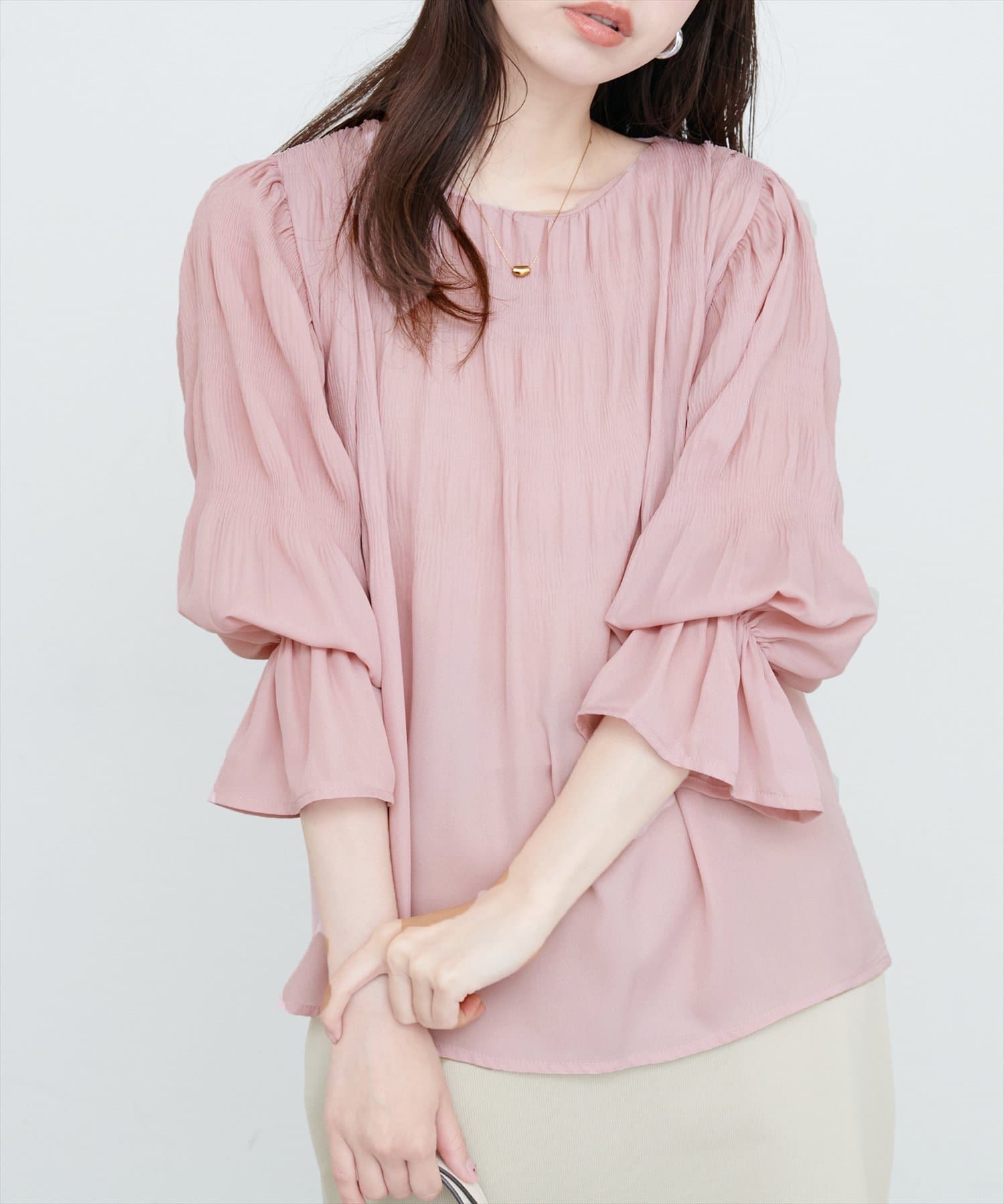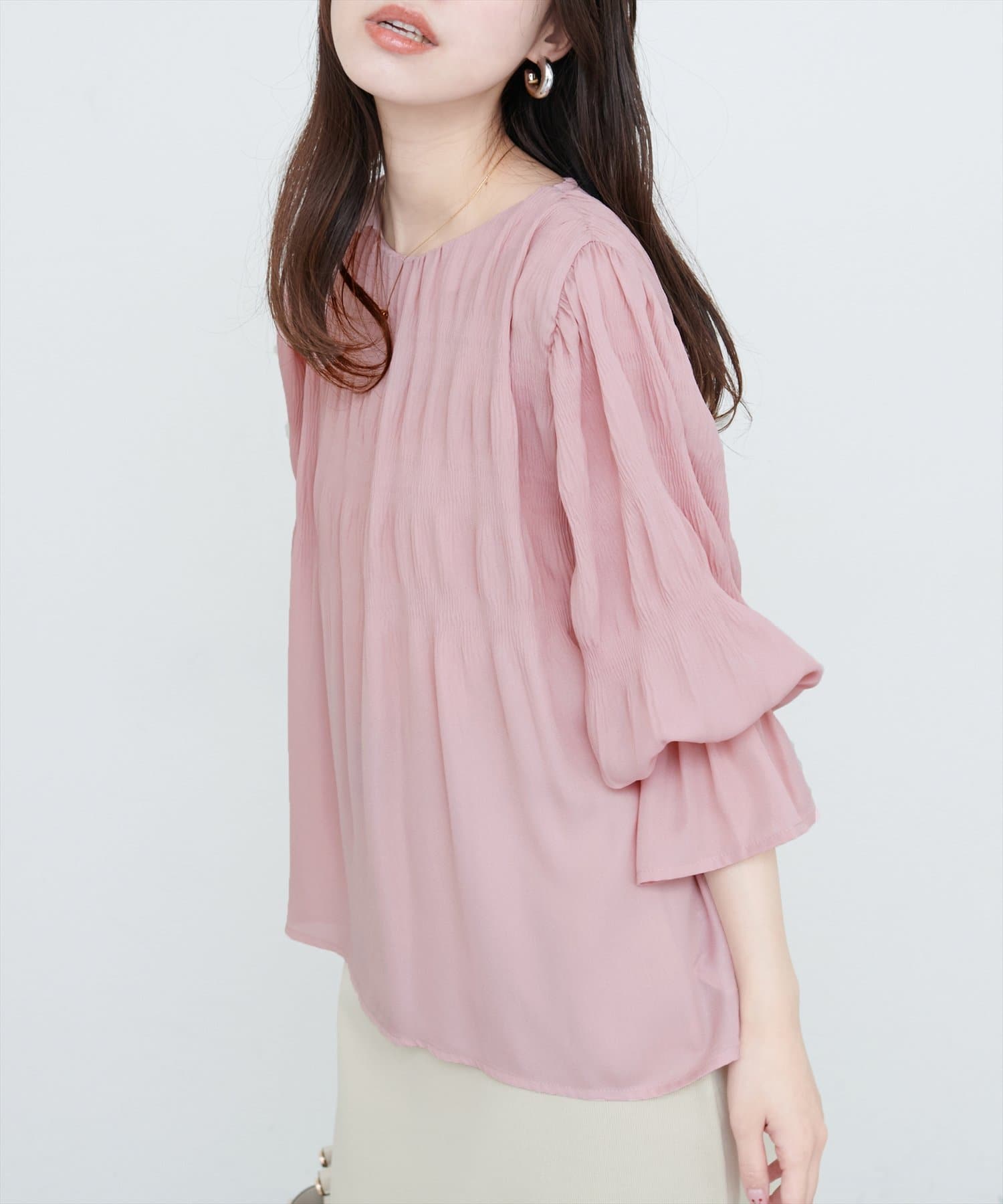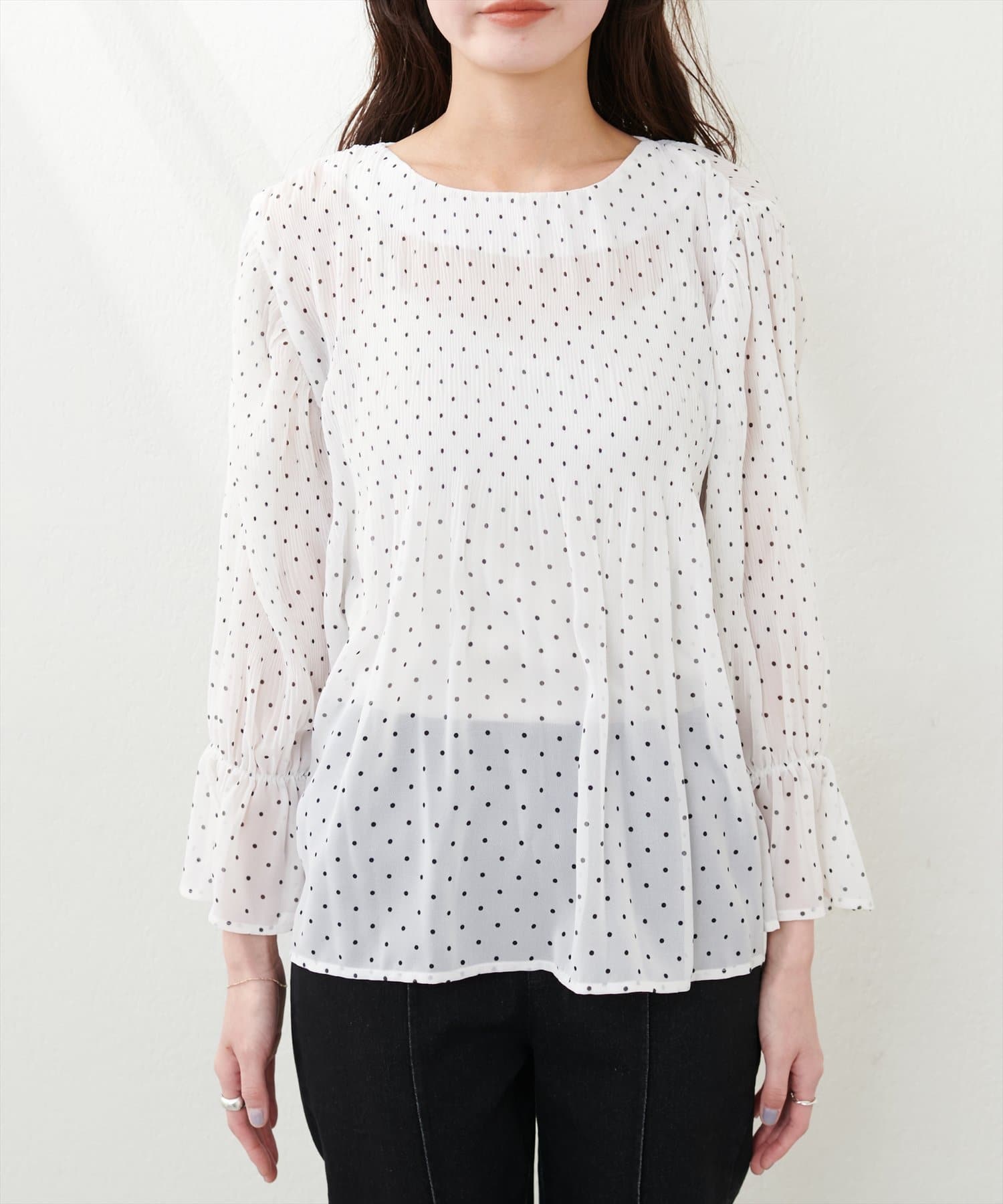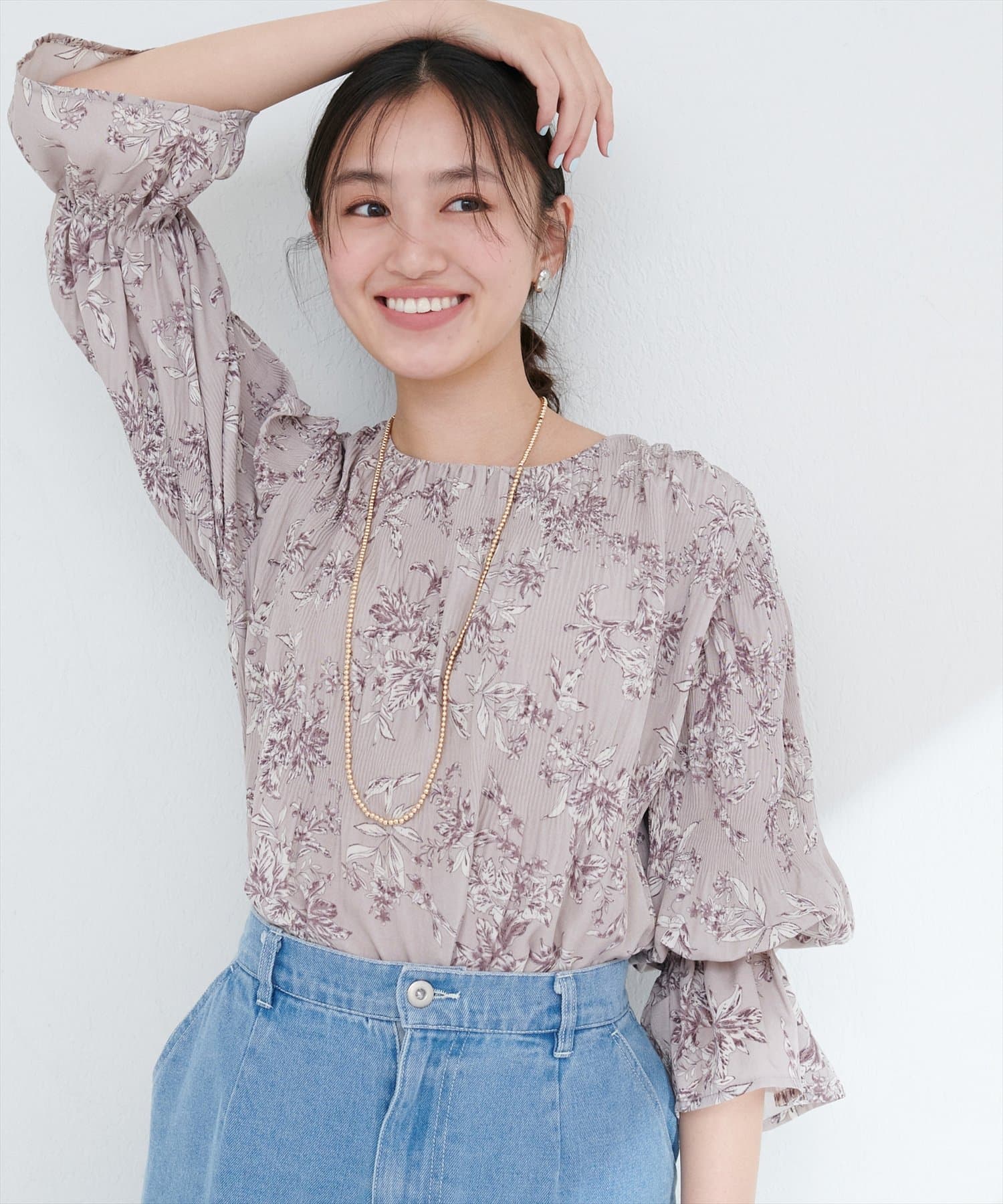 プリーツ素材が柔らかに揺れるフェミニンブラウス