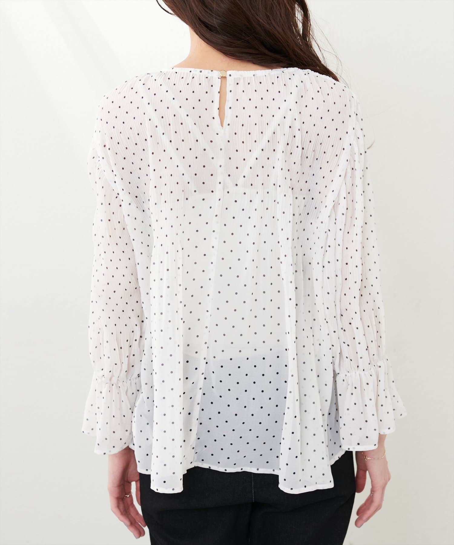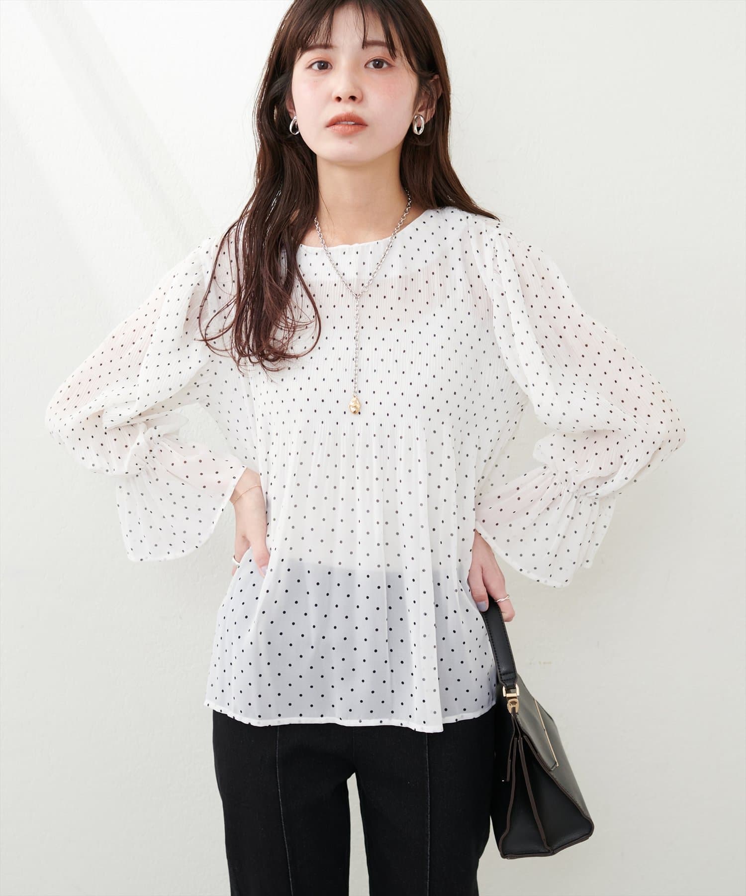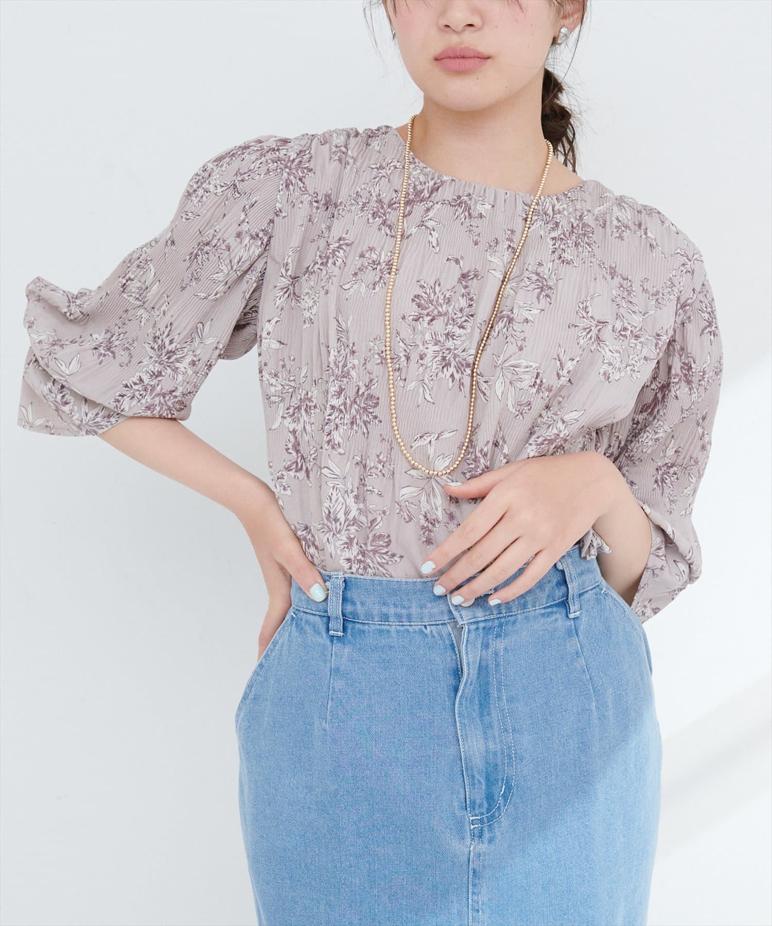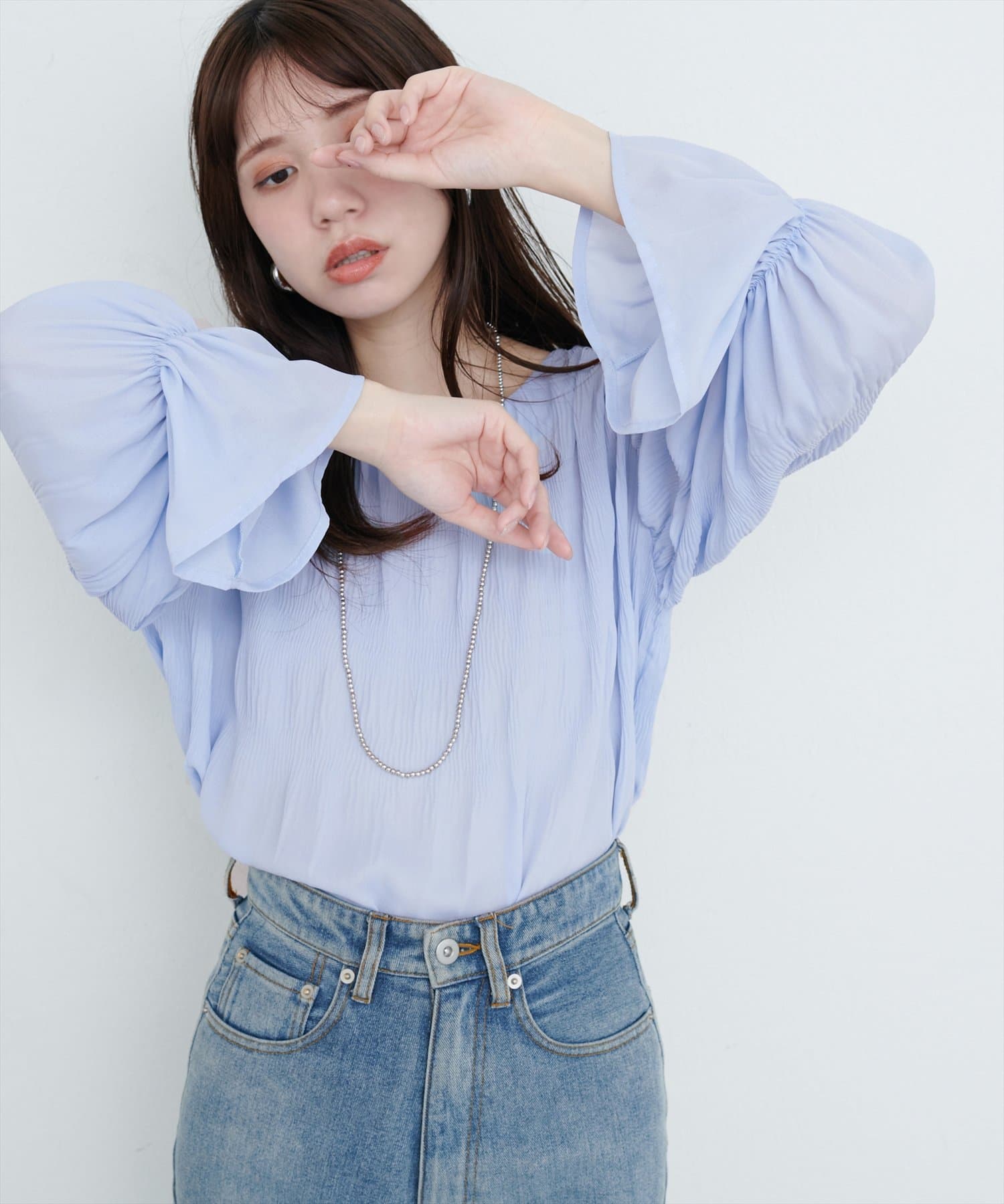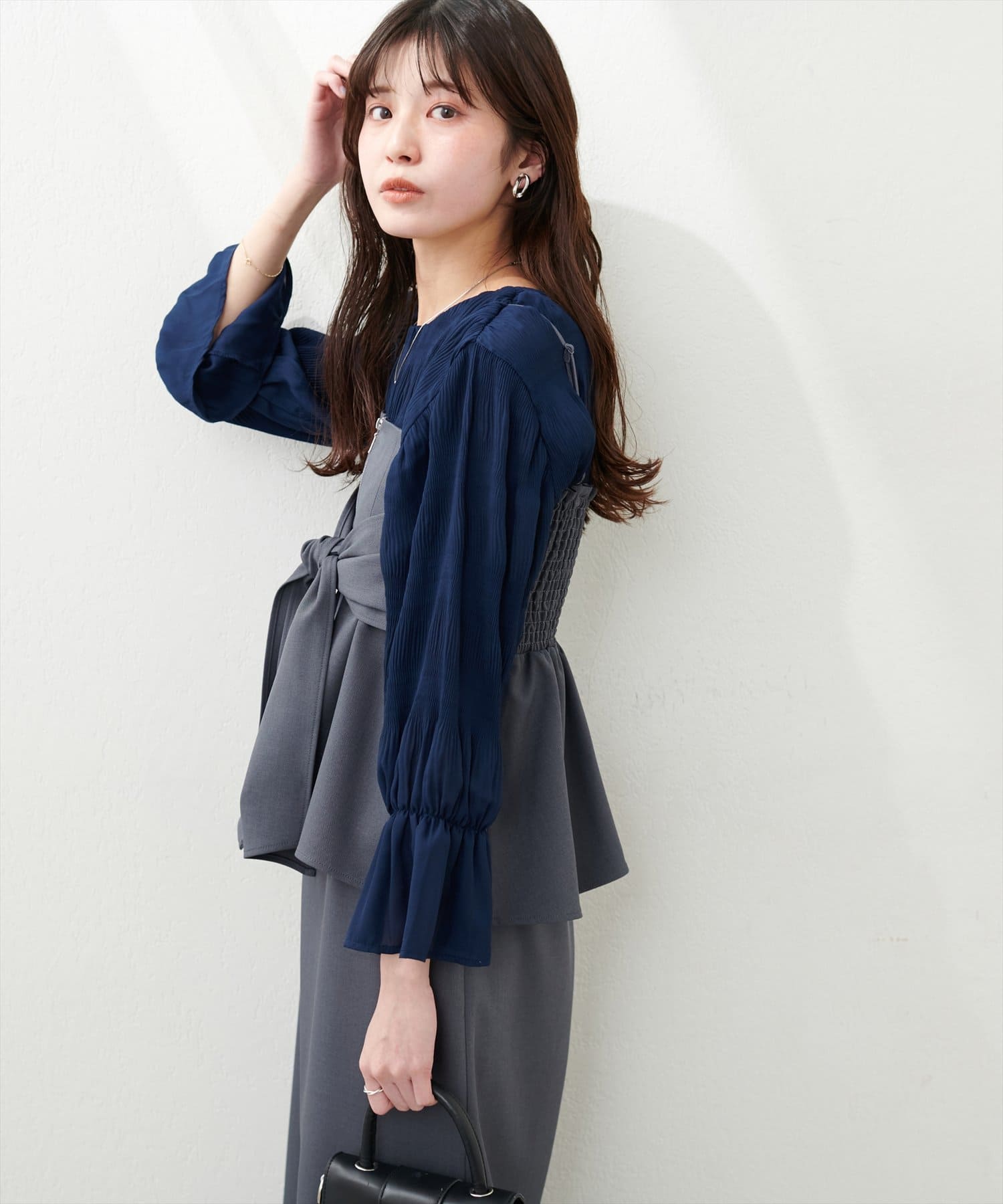 プリーツ素材が柔らかに揺れるフェミニンブラウス