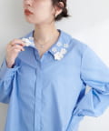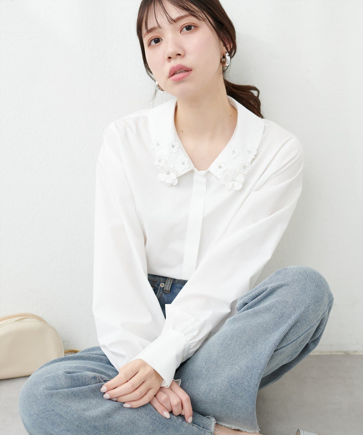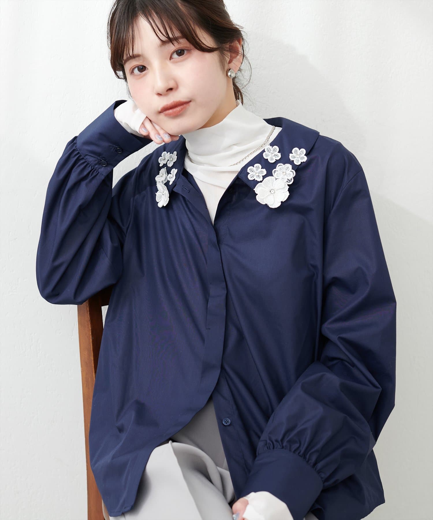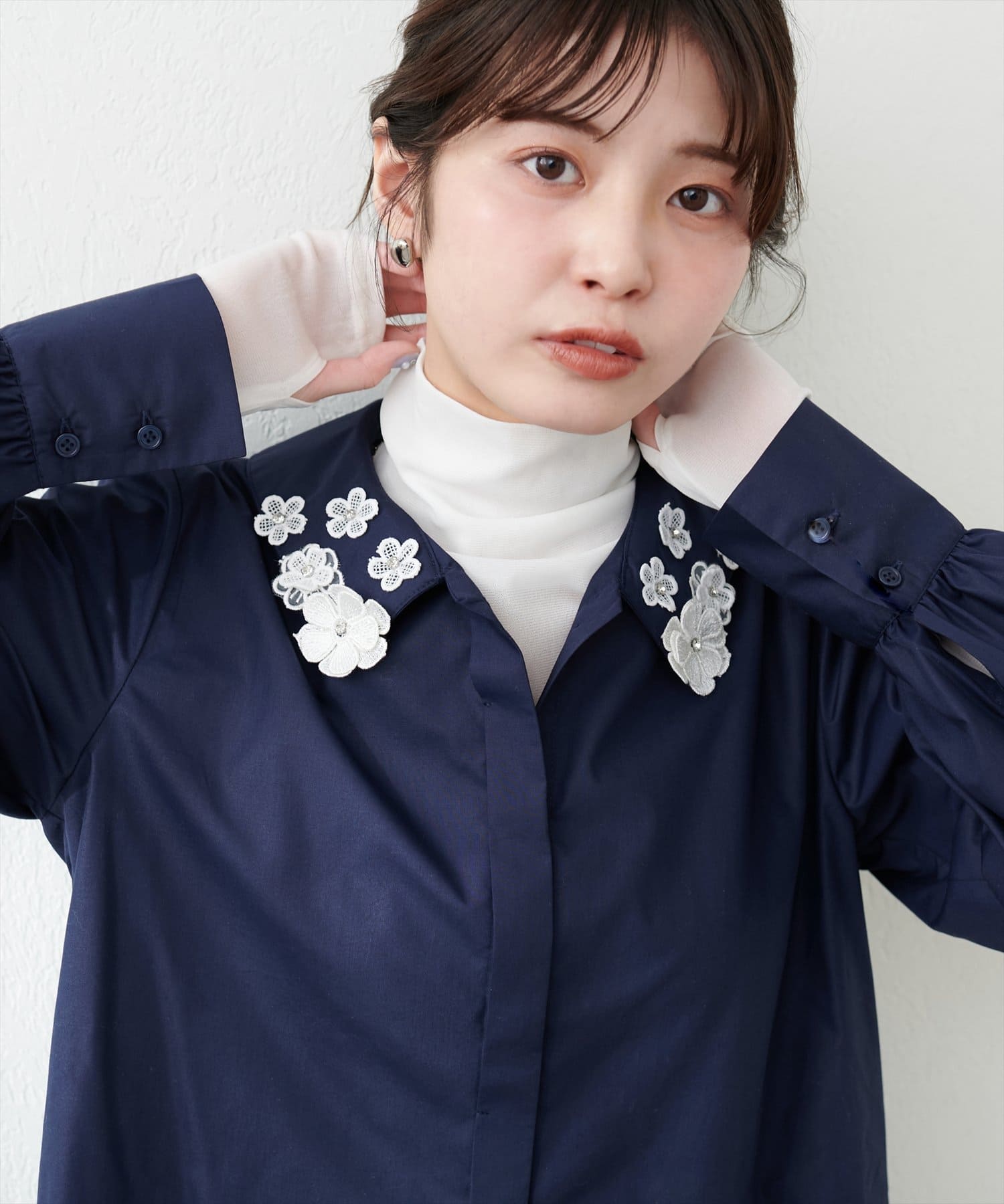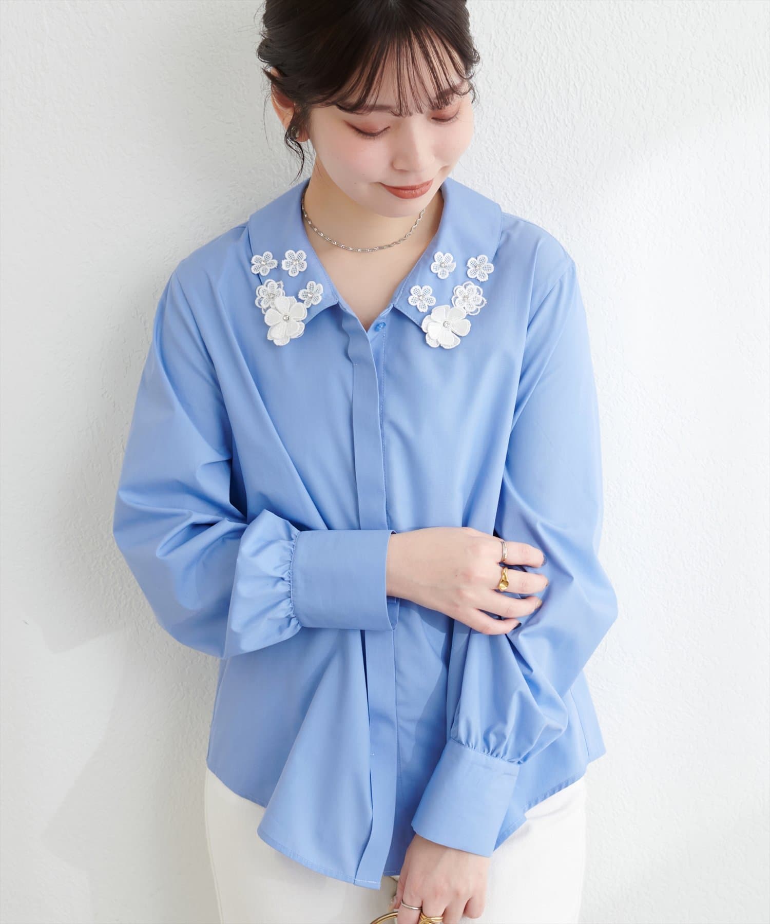 パッと見ただけで可愛らしい、衿ぐりにあしらわれたお花が印象的なシャツ。