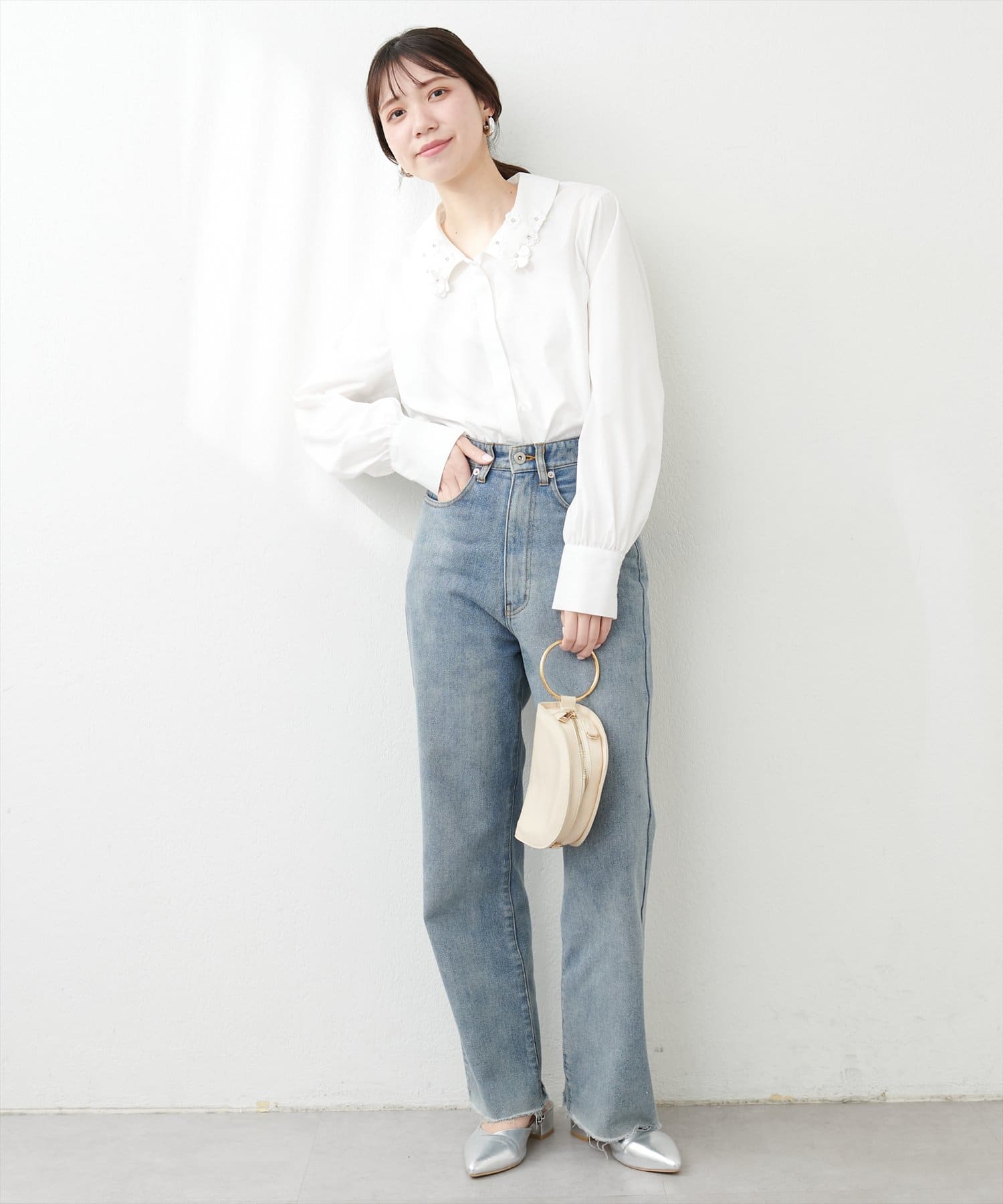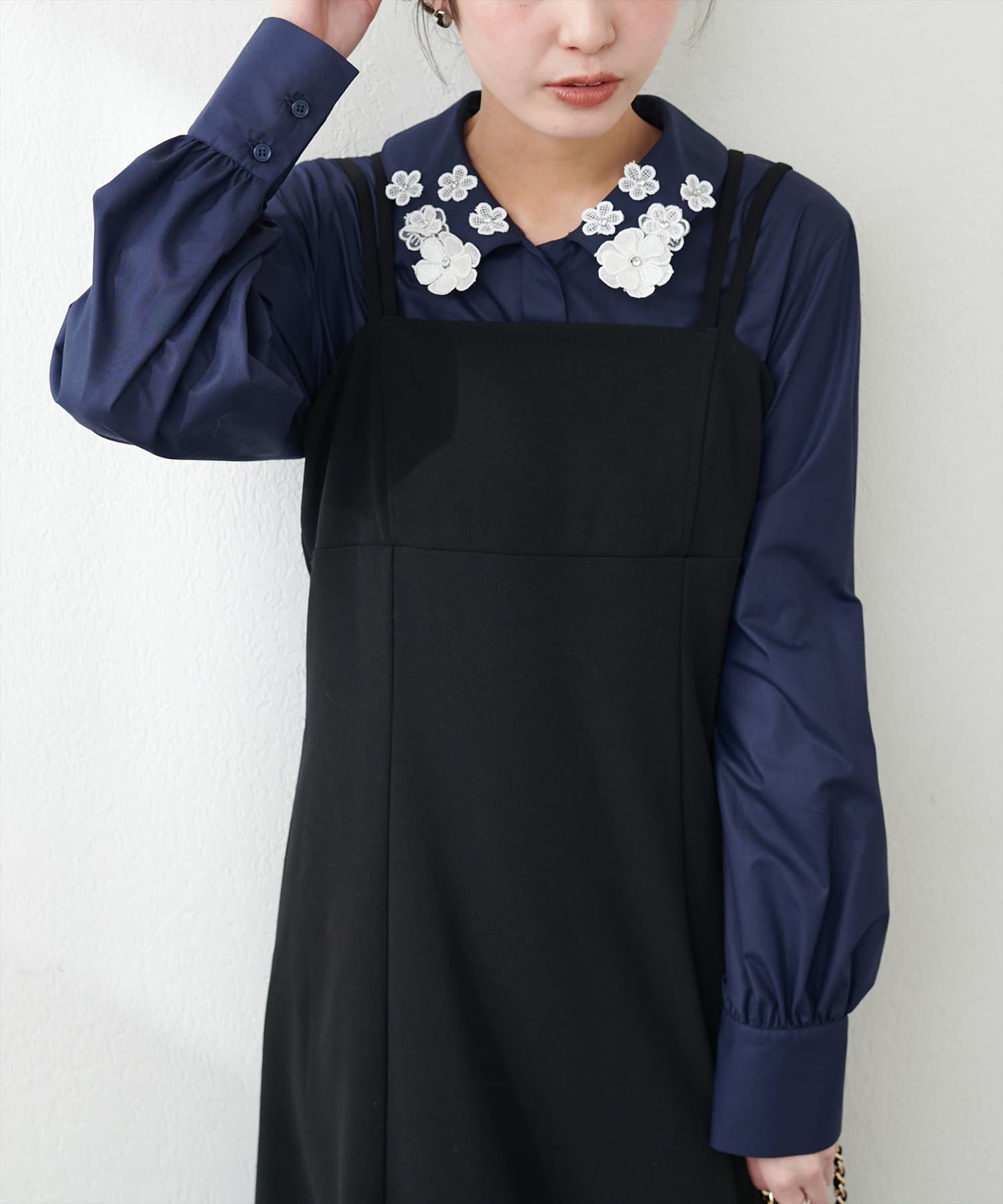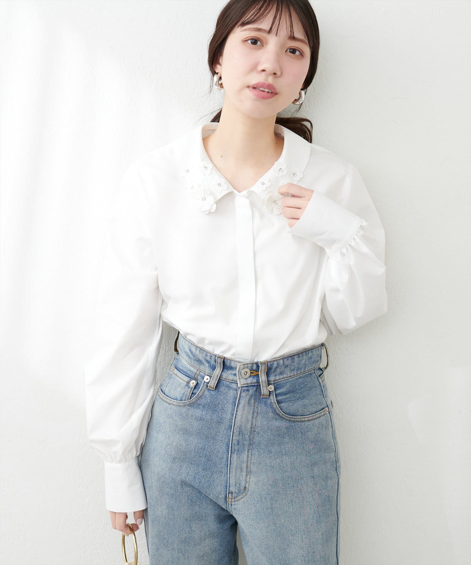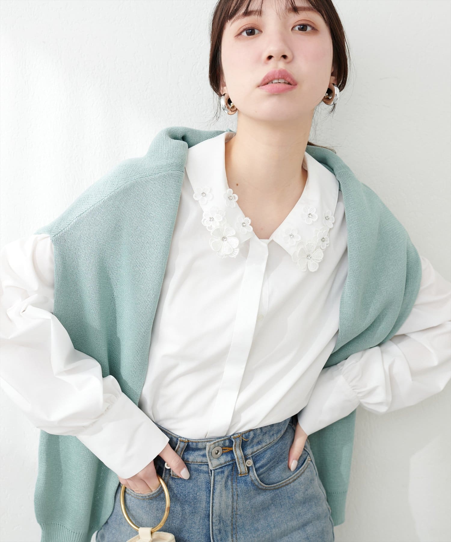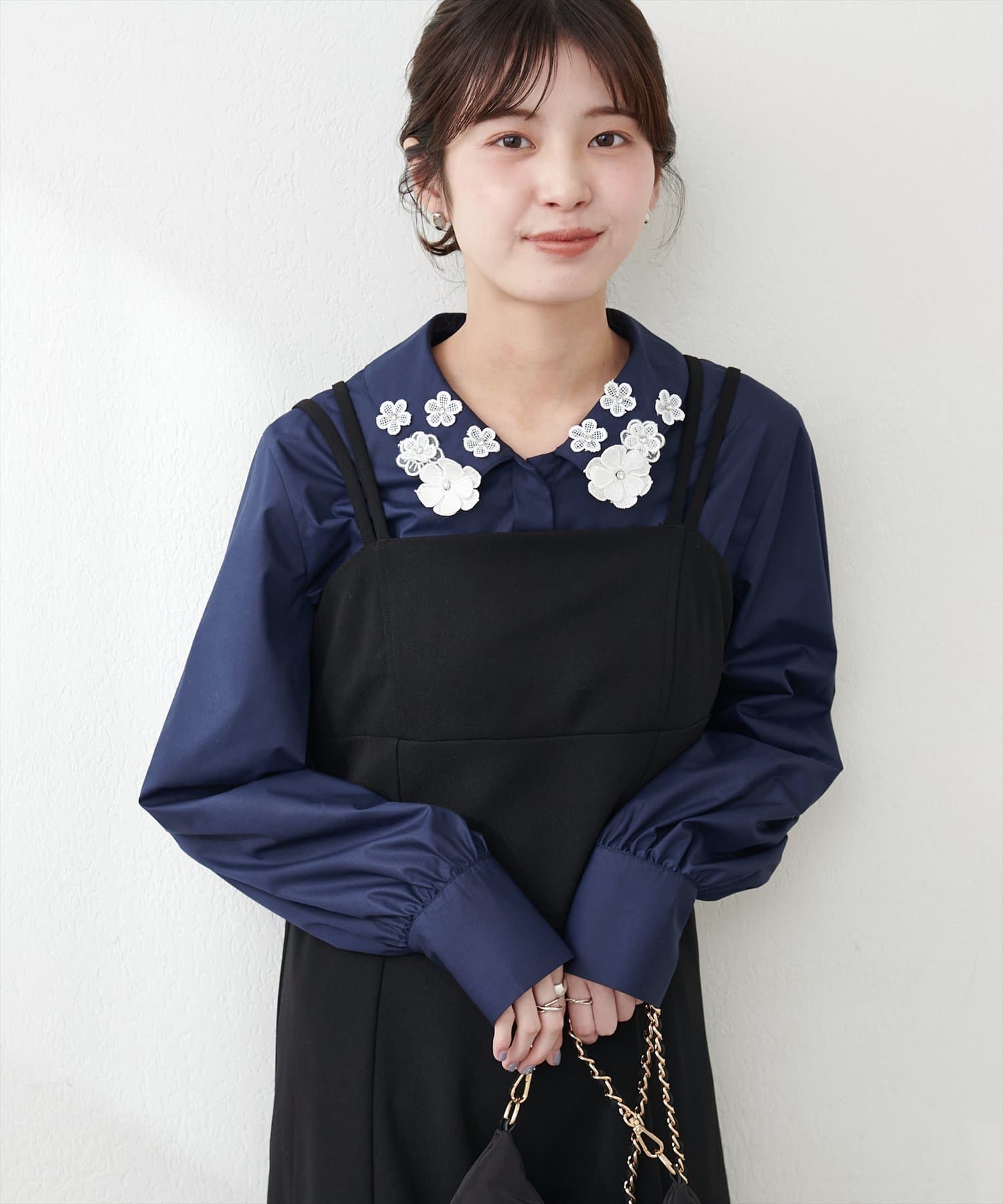 パッと見ただけで可愛らしい、衿ぐりにあしらわれたお花が印象的なシャツ。