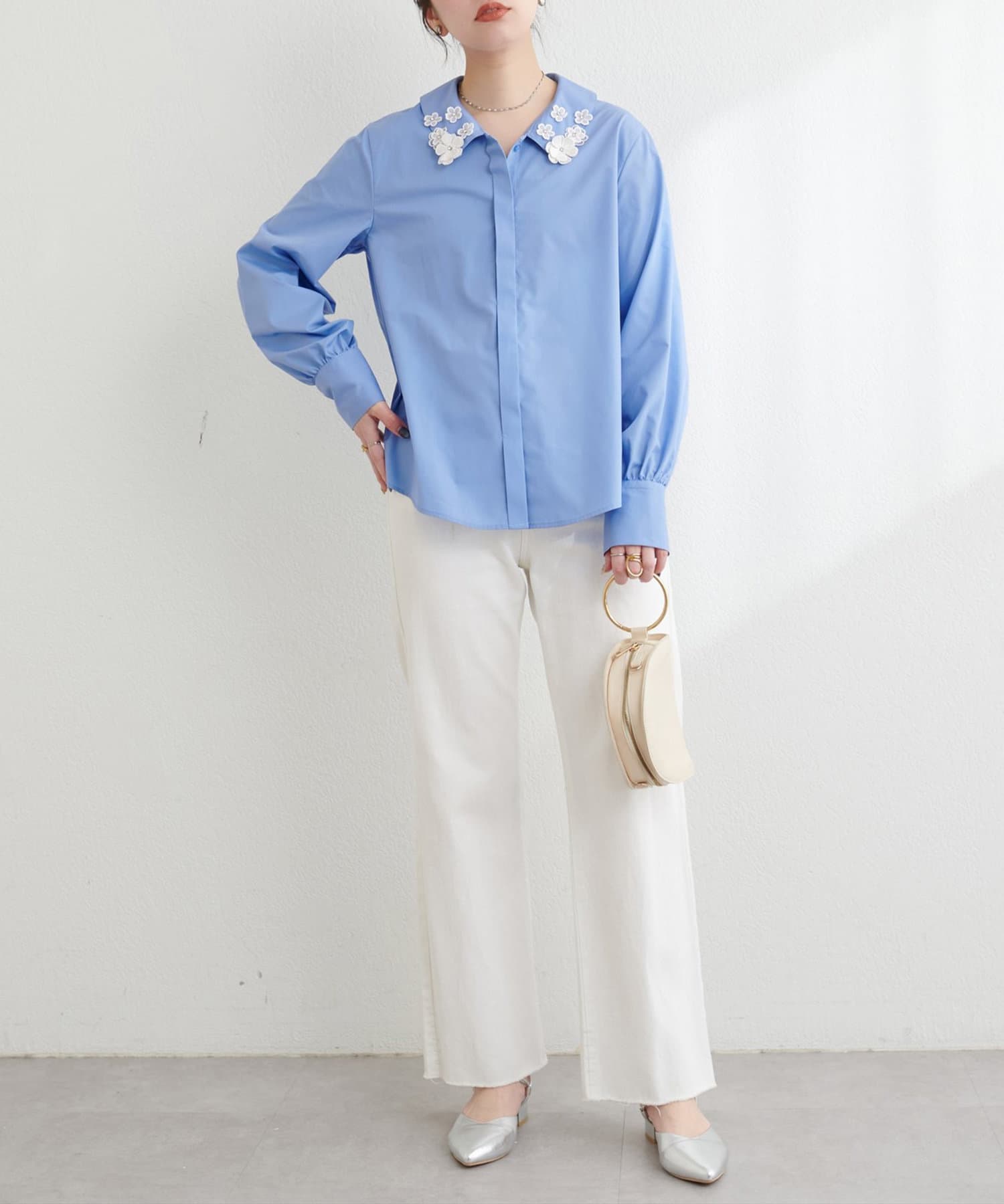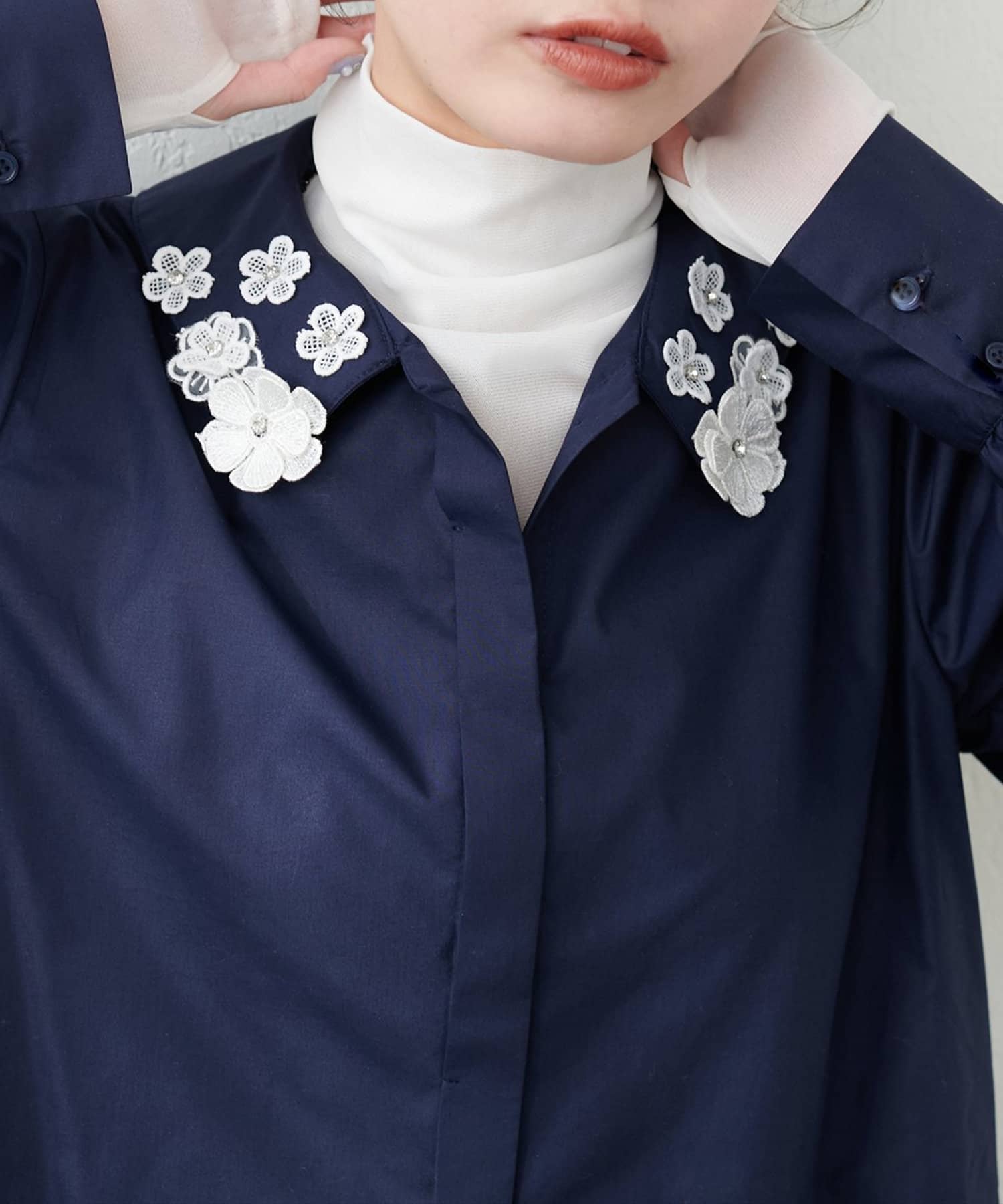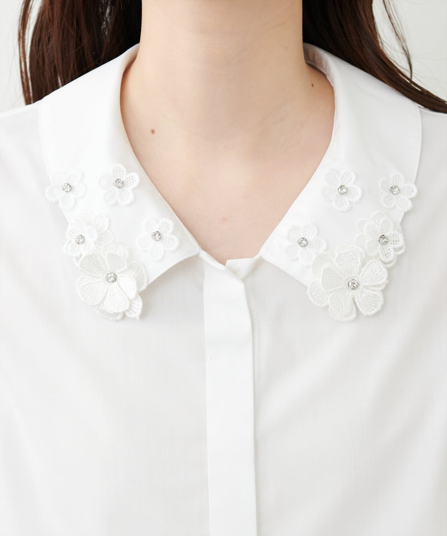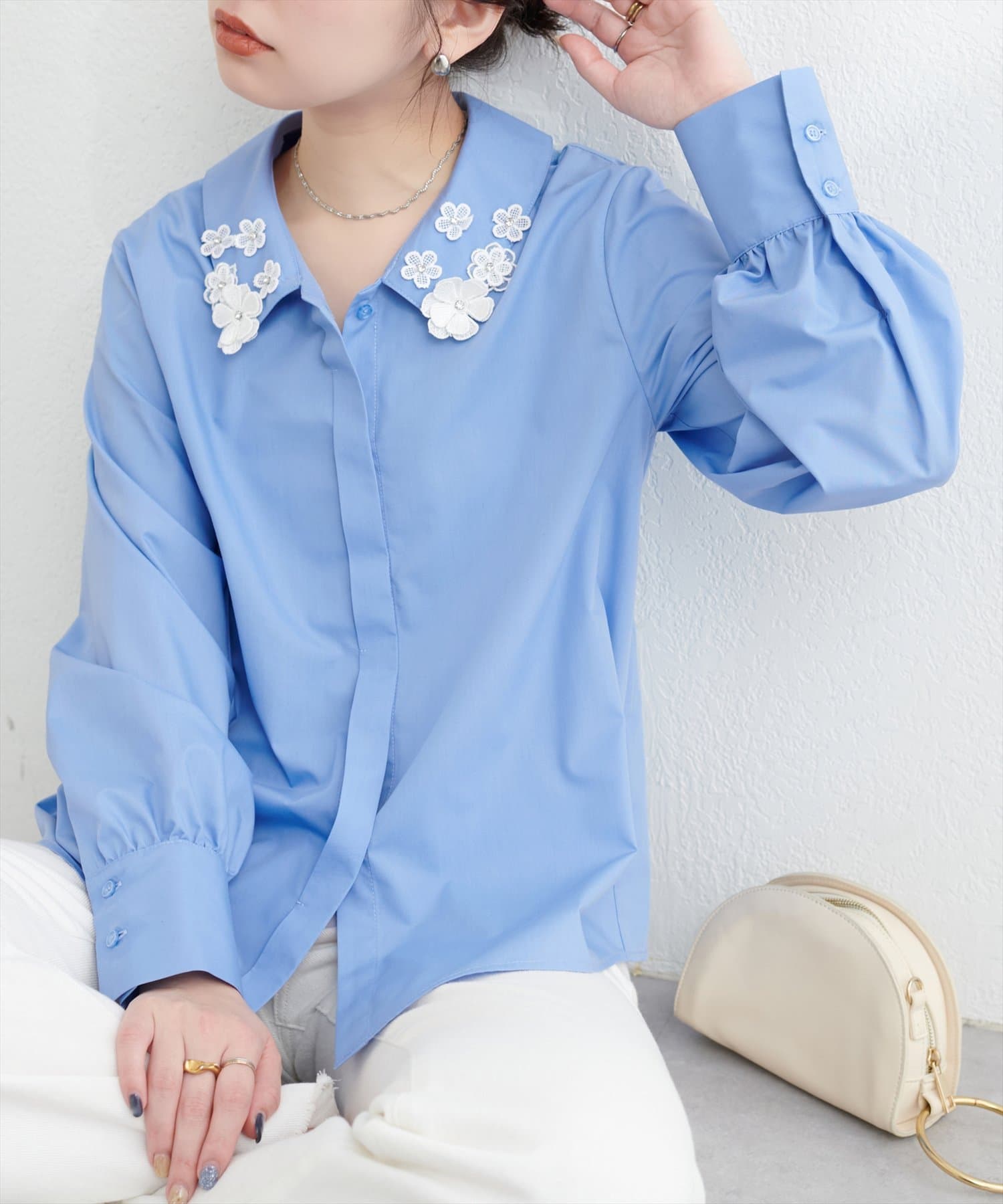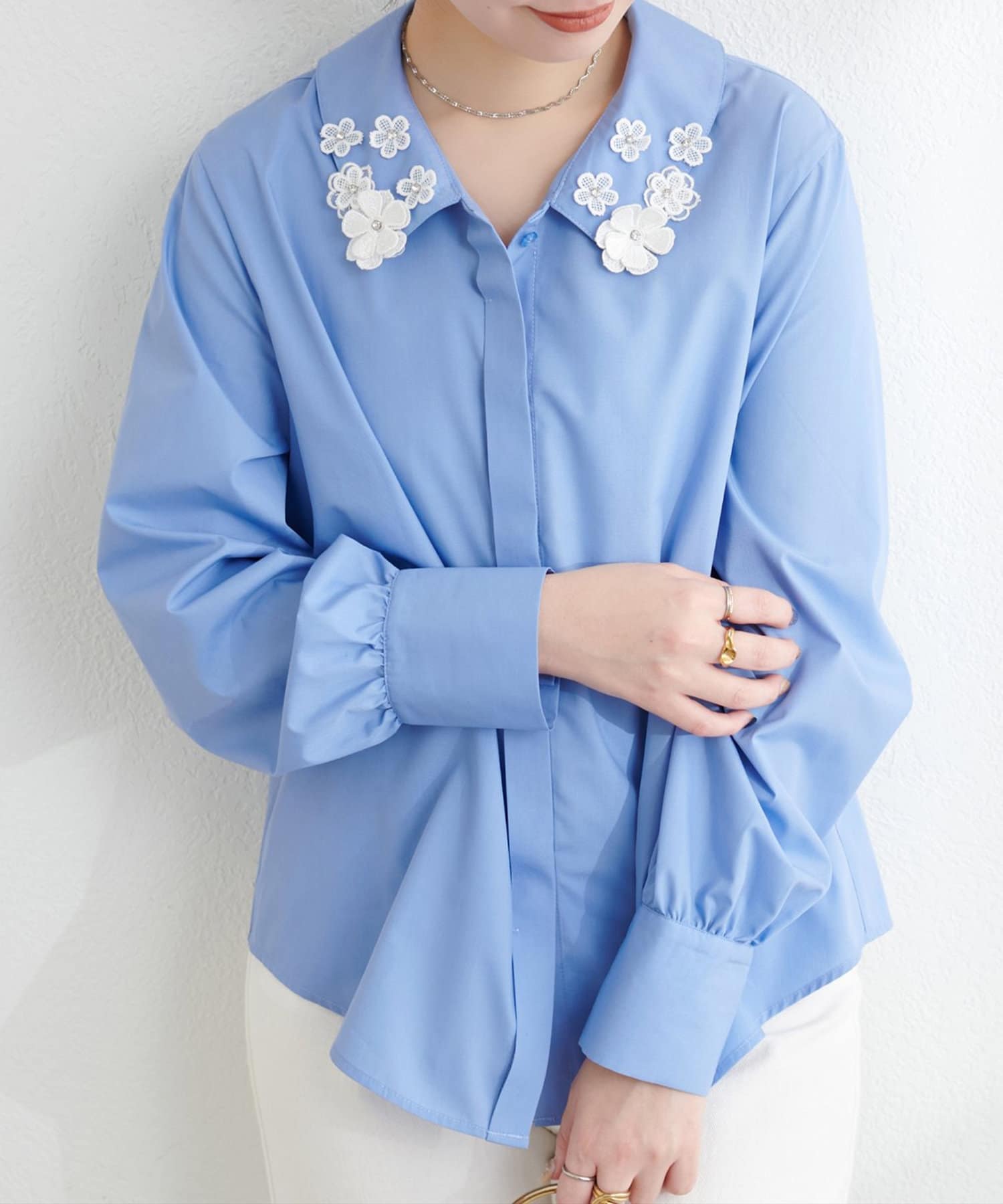 パッと見ただけで可愛らしい、衿ぐりにあしらわれたお花が印象的なシャツ。