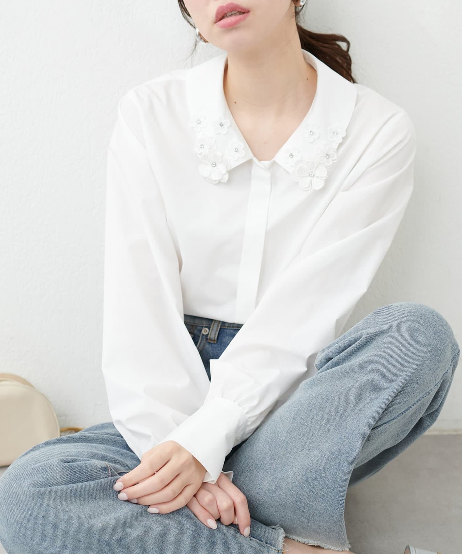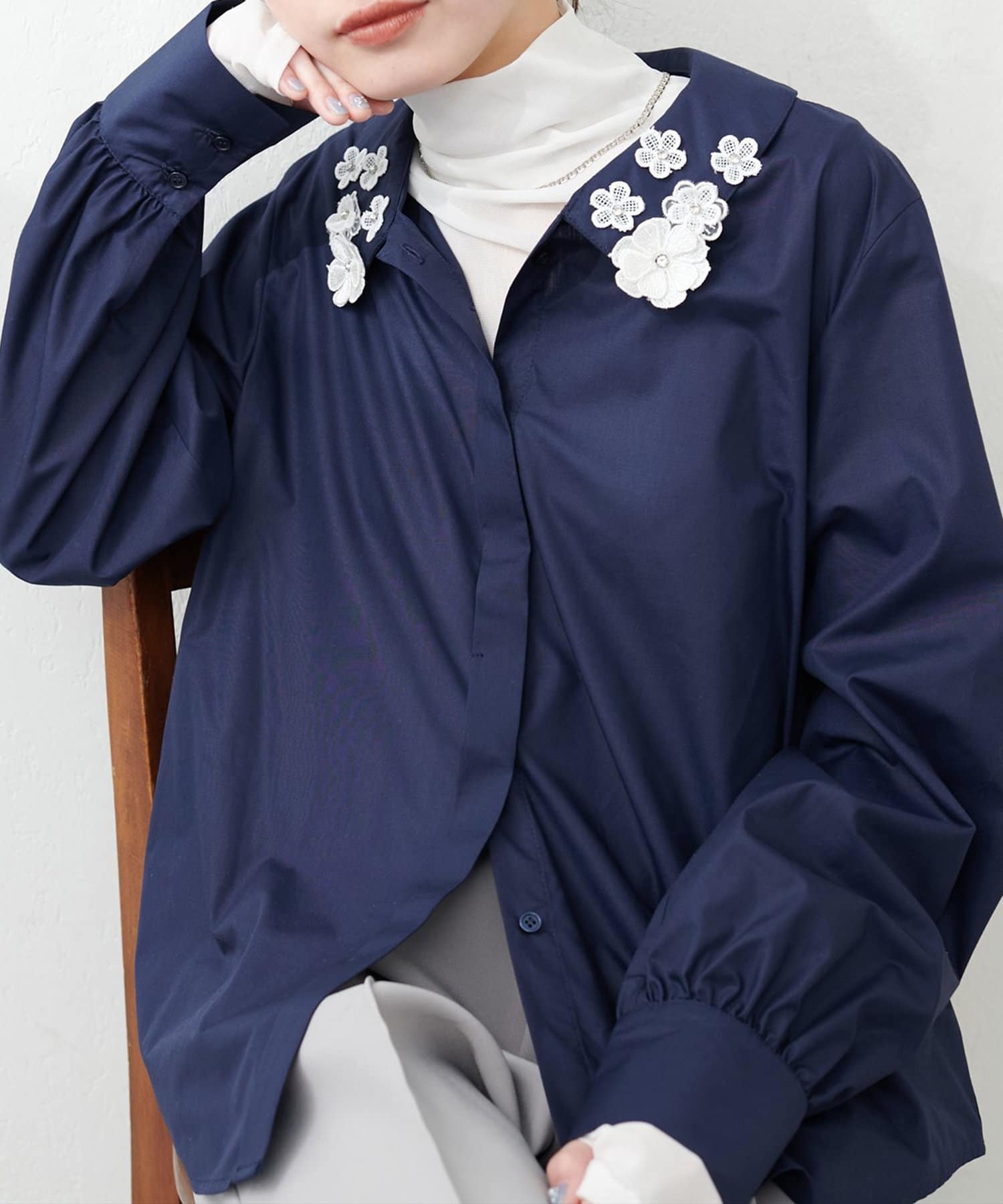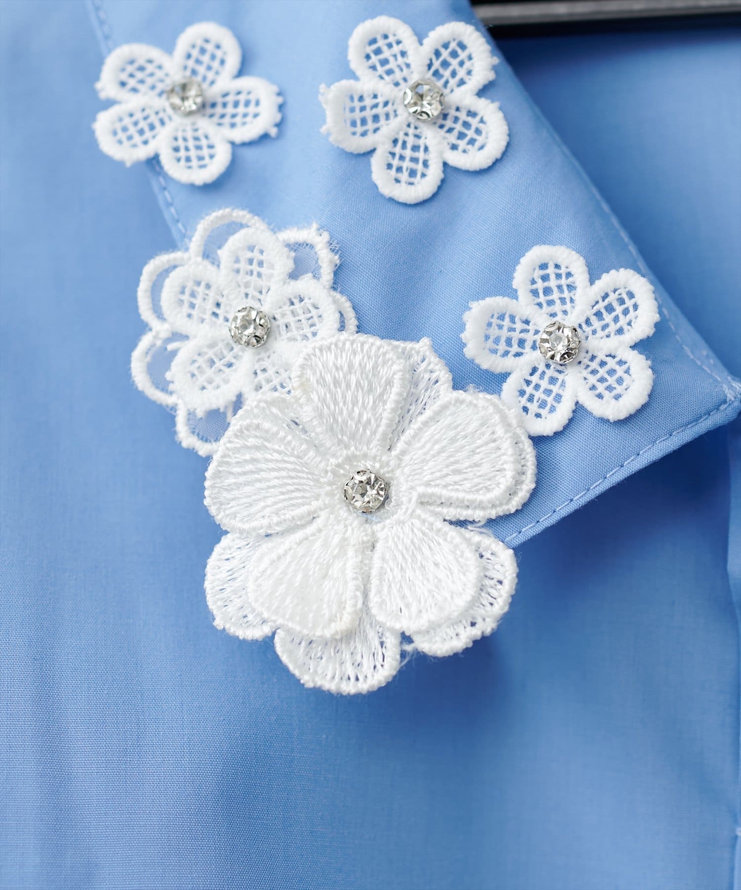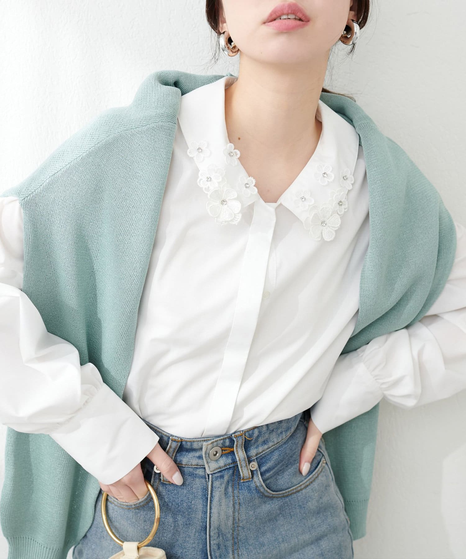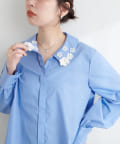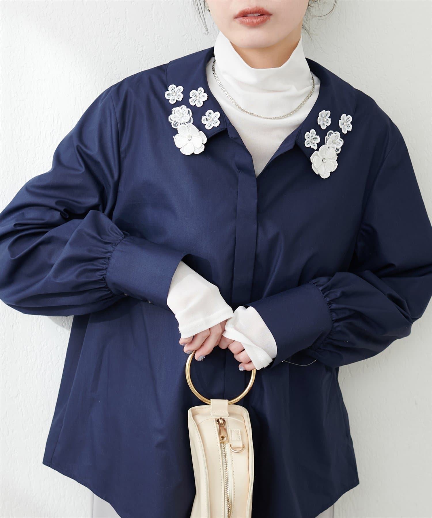 パッと見ただけで可愛らしい、衿ぐりにあしらわれたお花が印象的なシャツ。