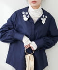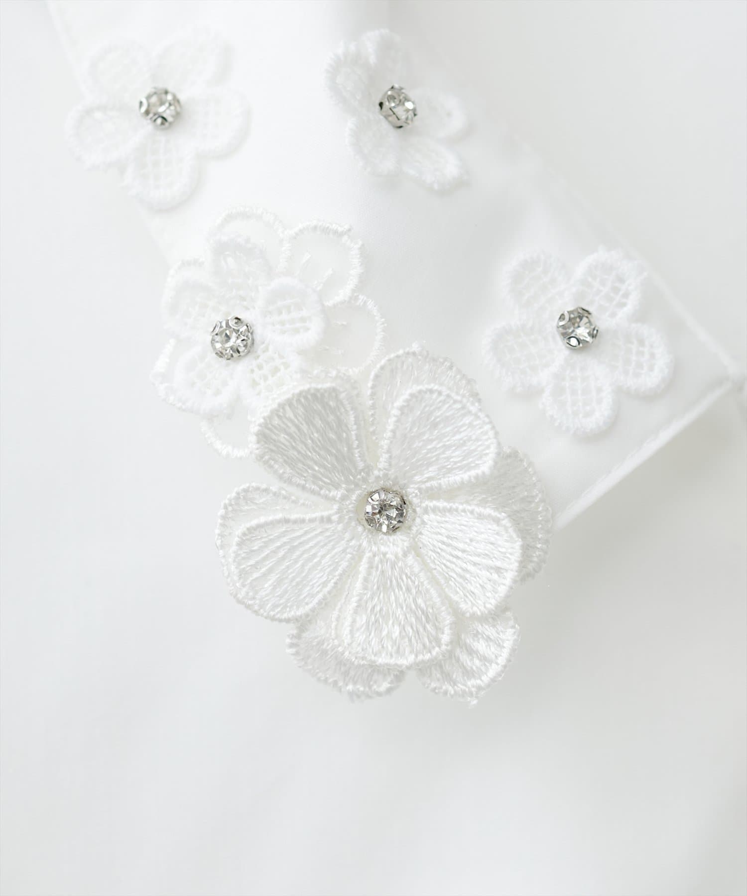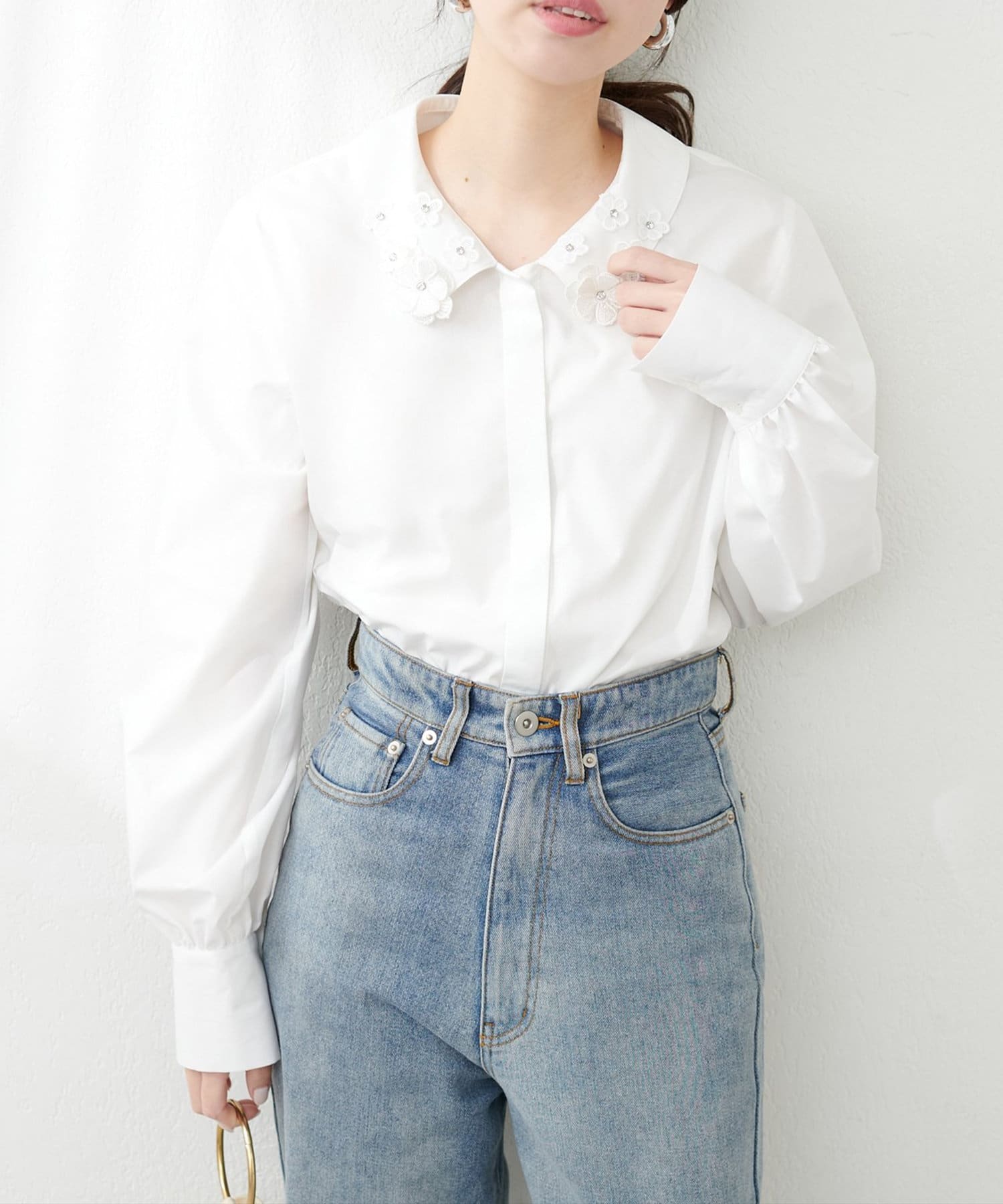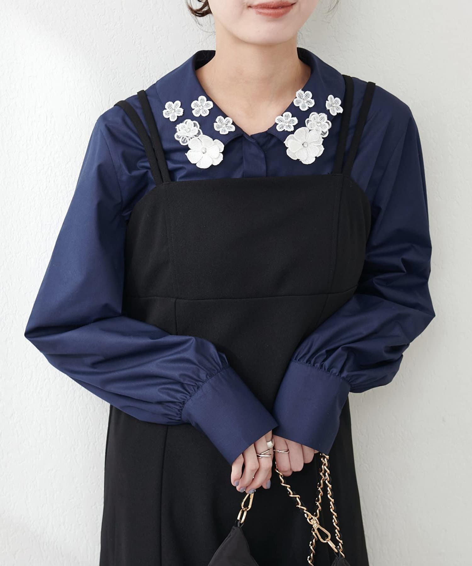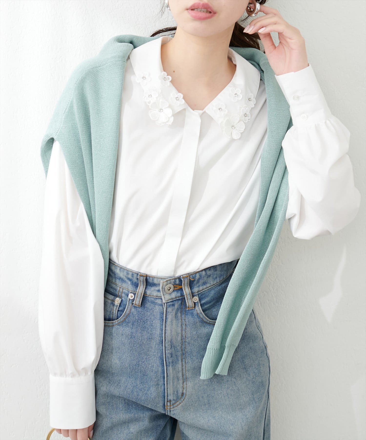 パッと見ただけで可愛らしい、衿ぐりにあしらわれたお花が印象的なシャツ。