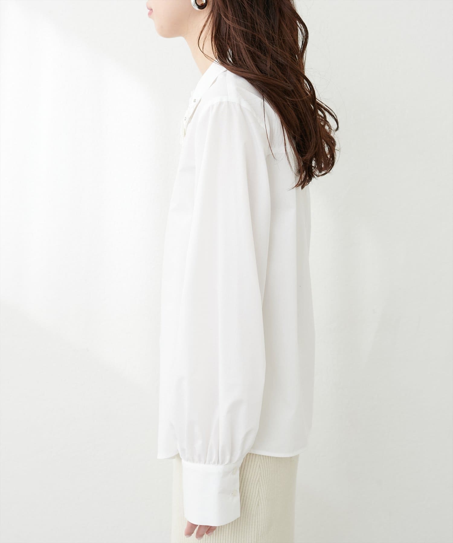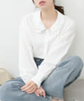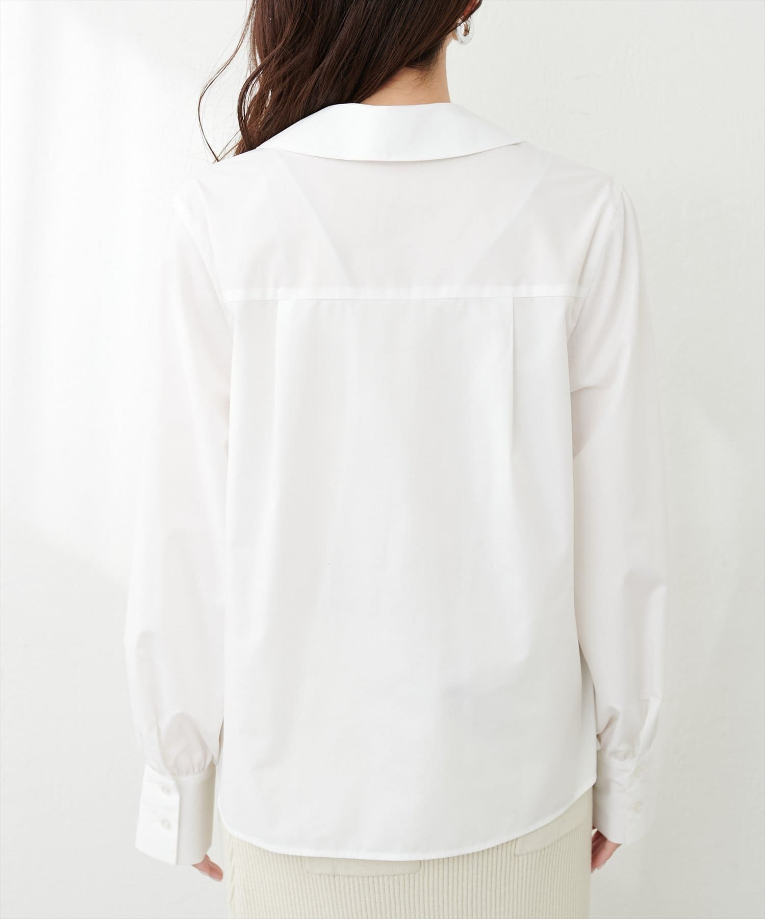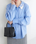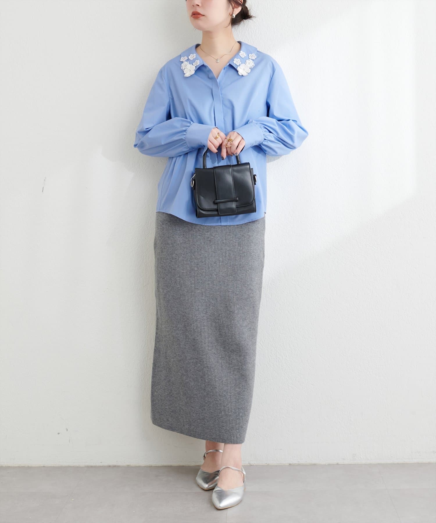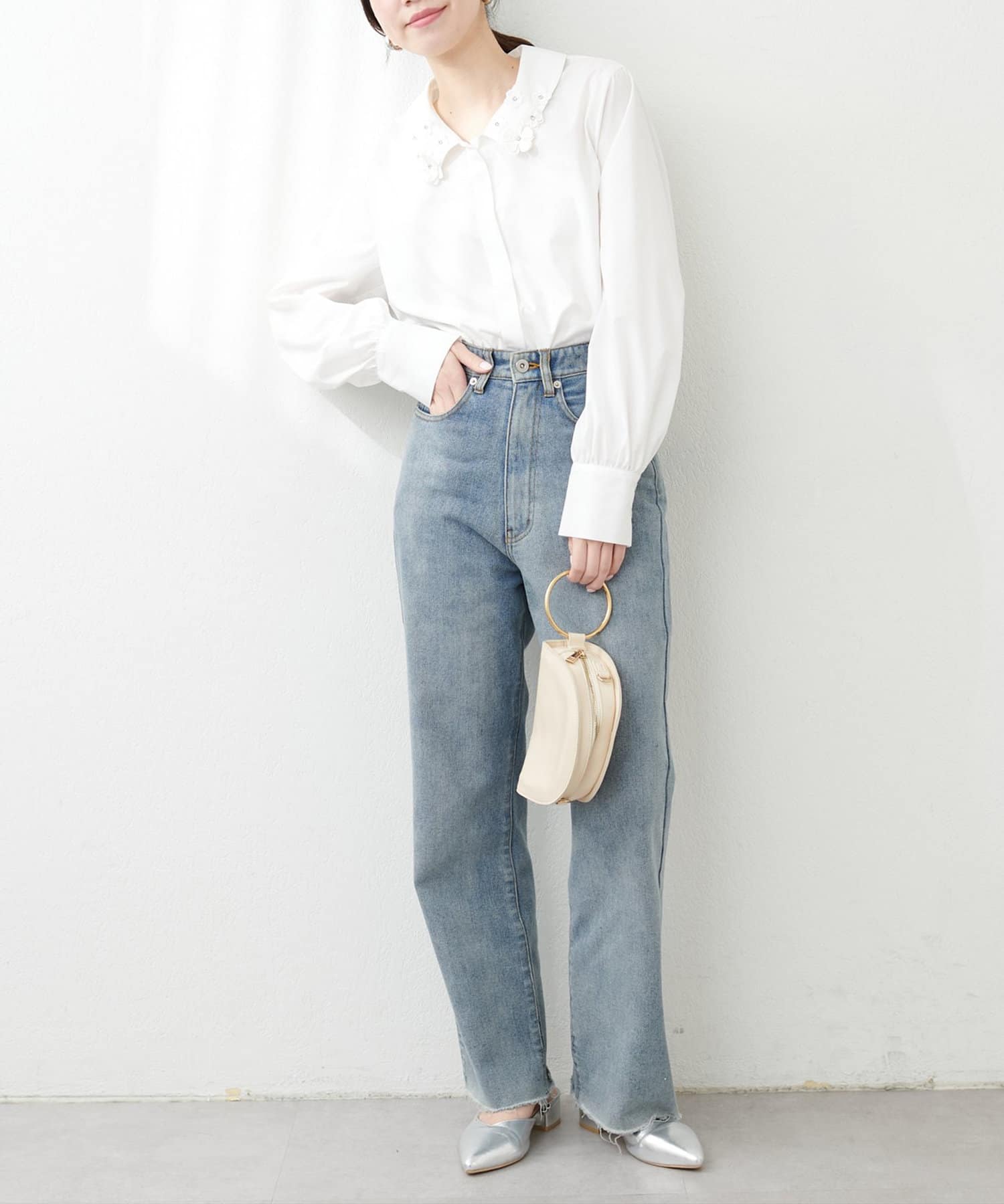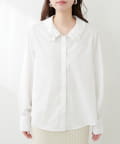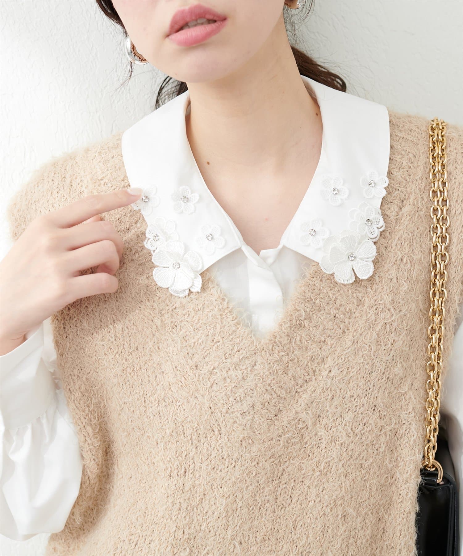 パッと見ただけで可愛らしい、衿ぐりにあしらわれたお花が印象的なシャツ。
