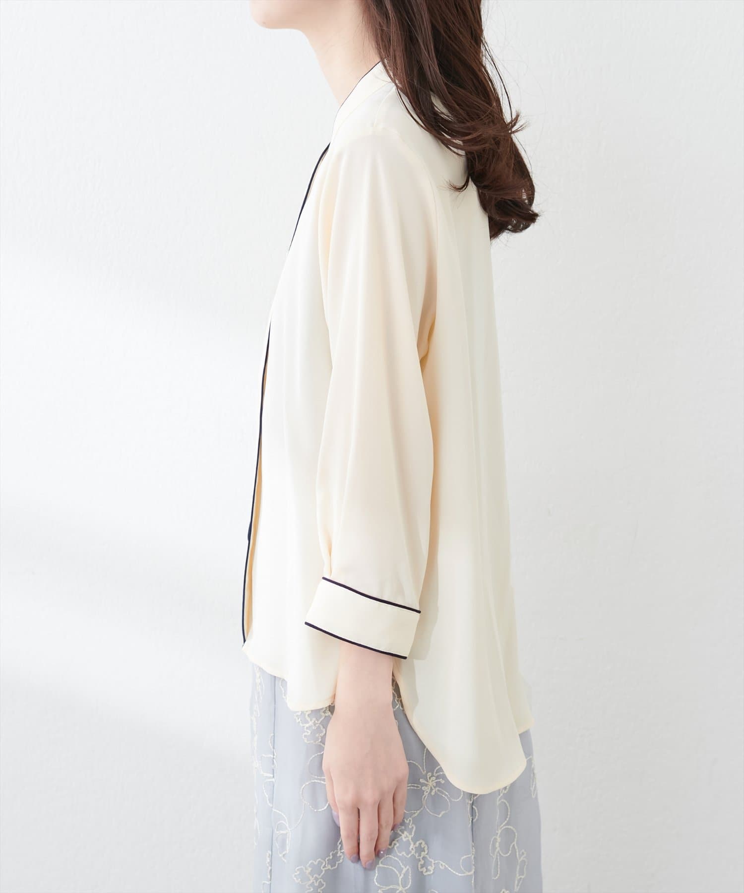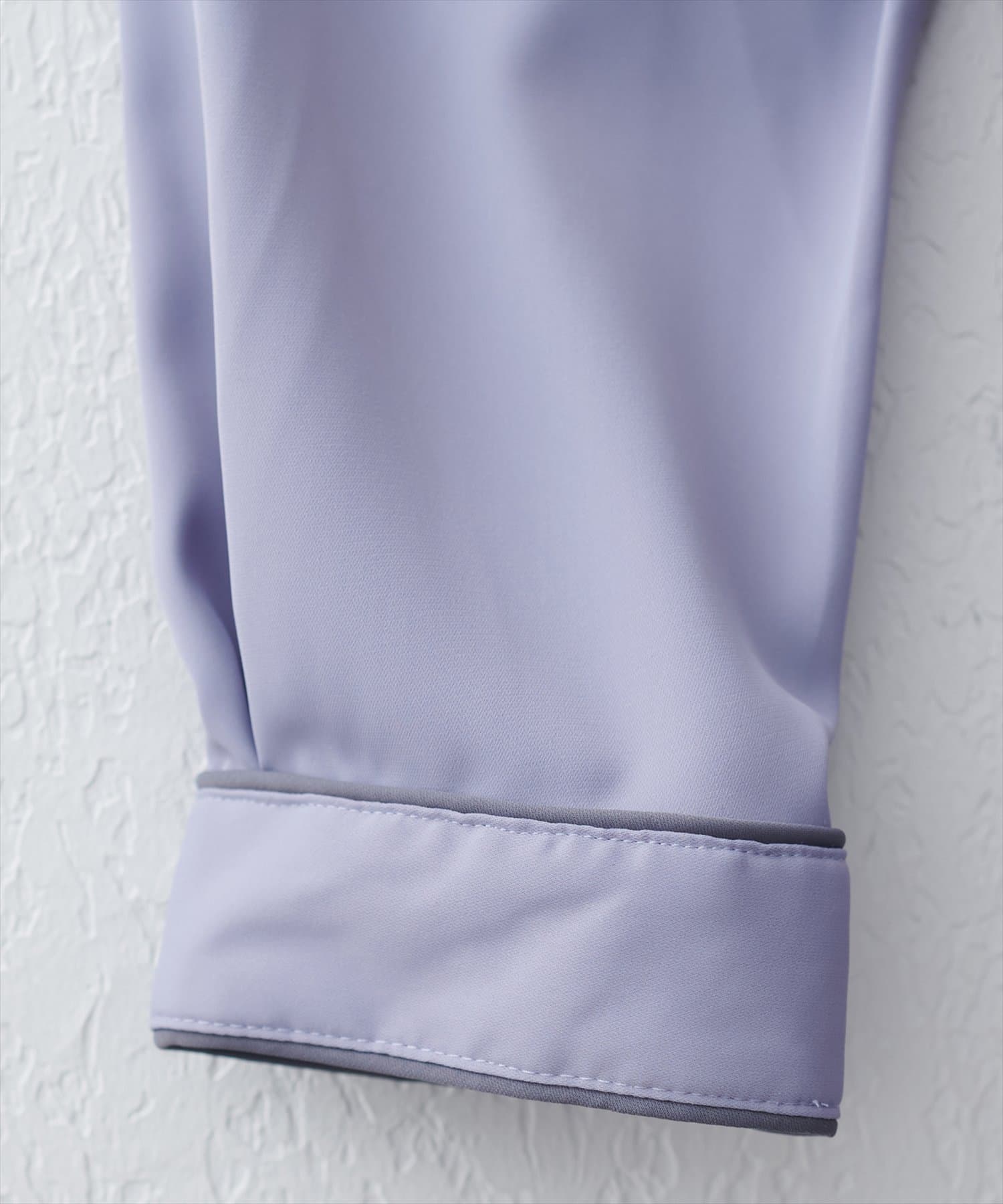 襟と袖口にはパイピングデザインが施されており、無地でも目の惹くデザイン。