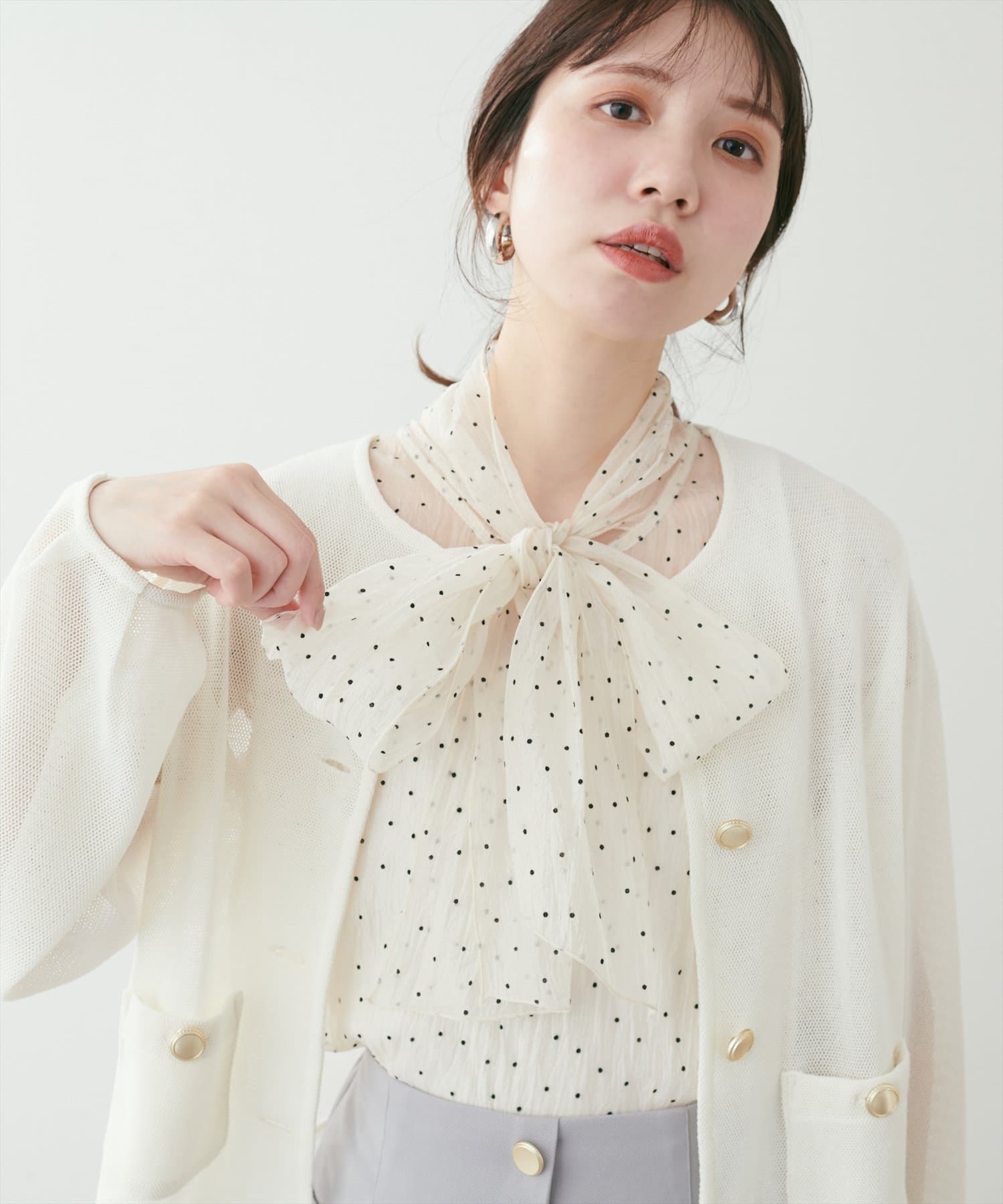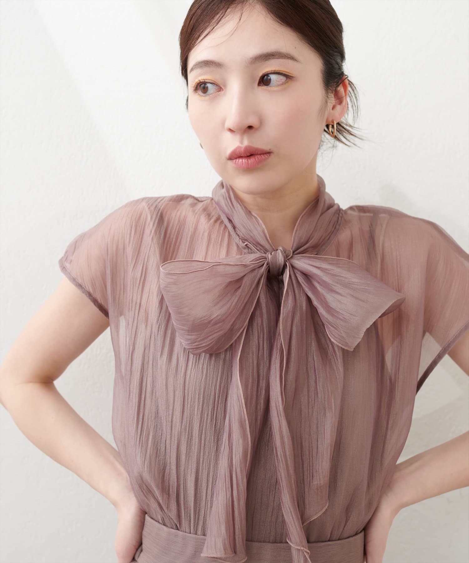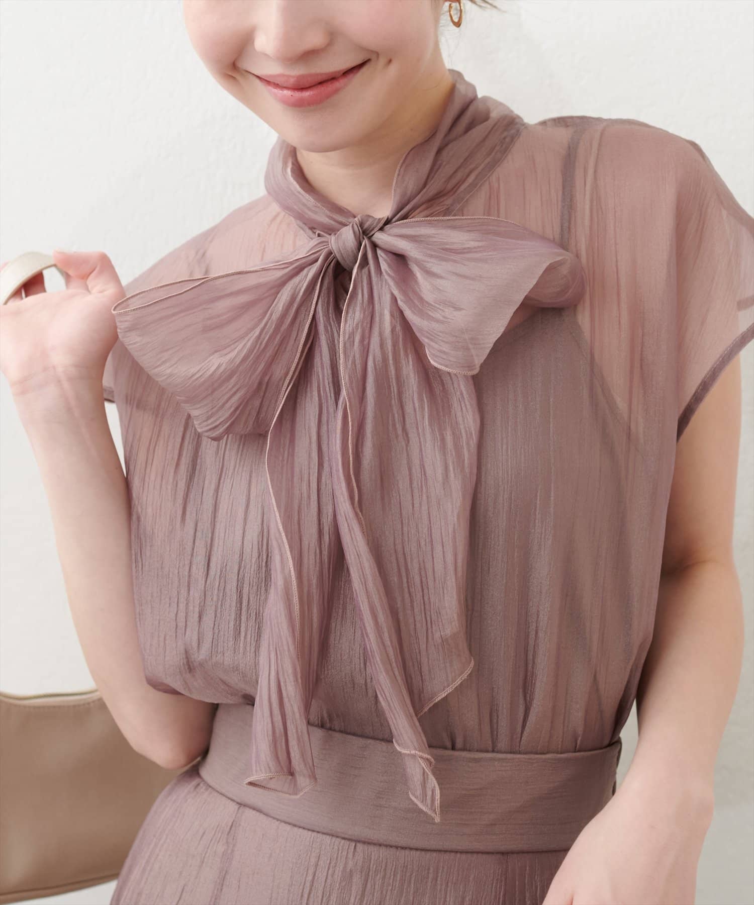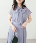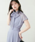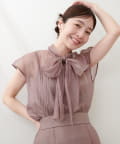 リボンボータイがフェミニンで華やかな印象に。