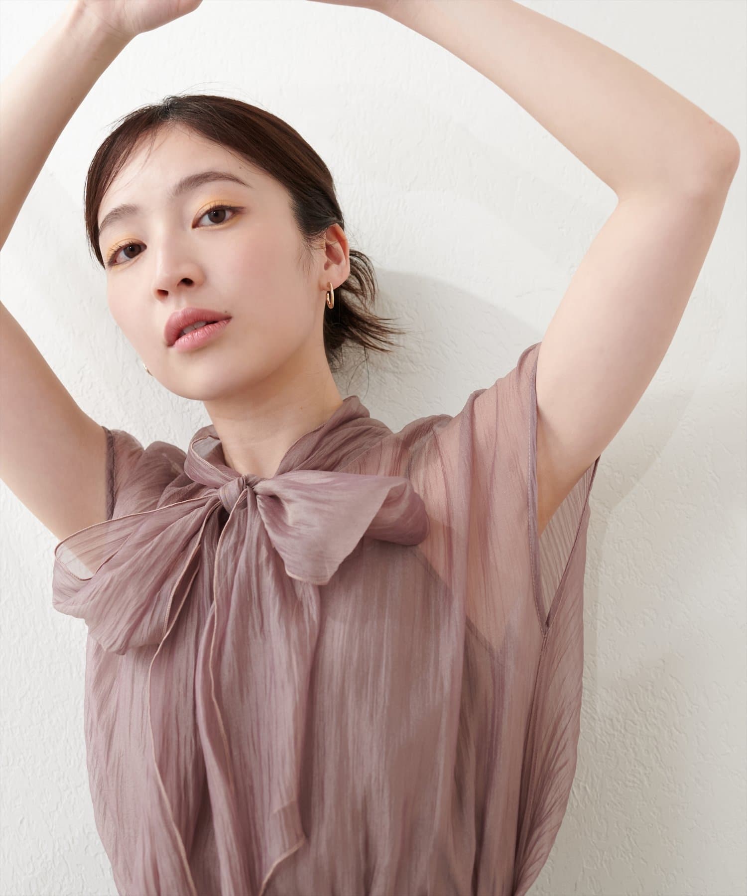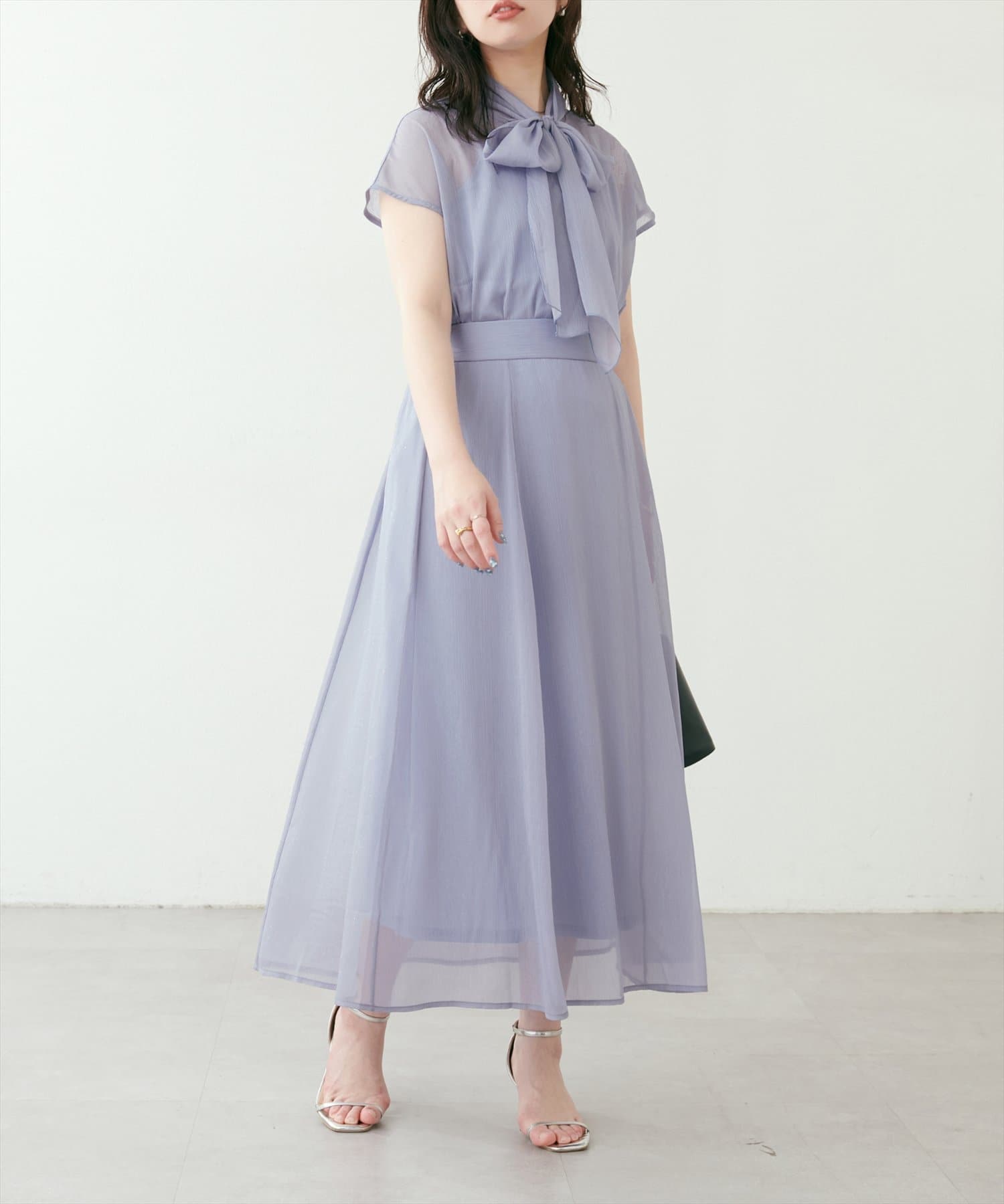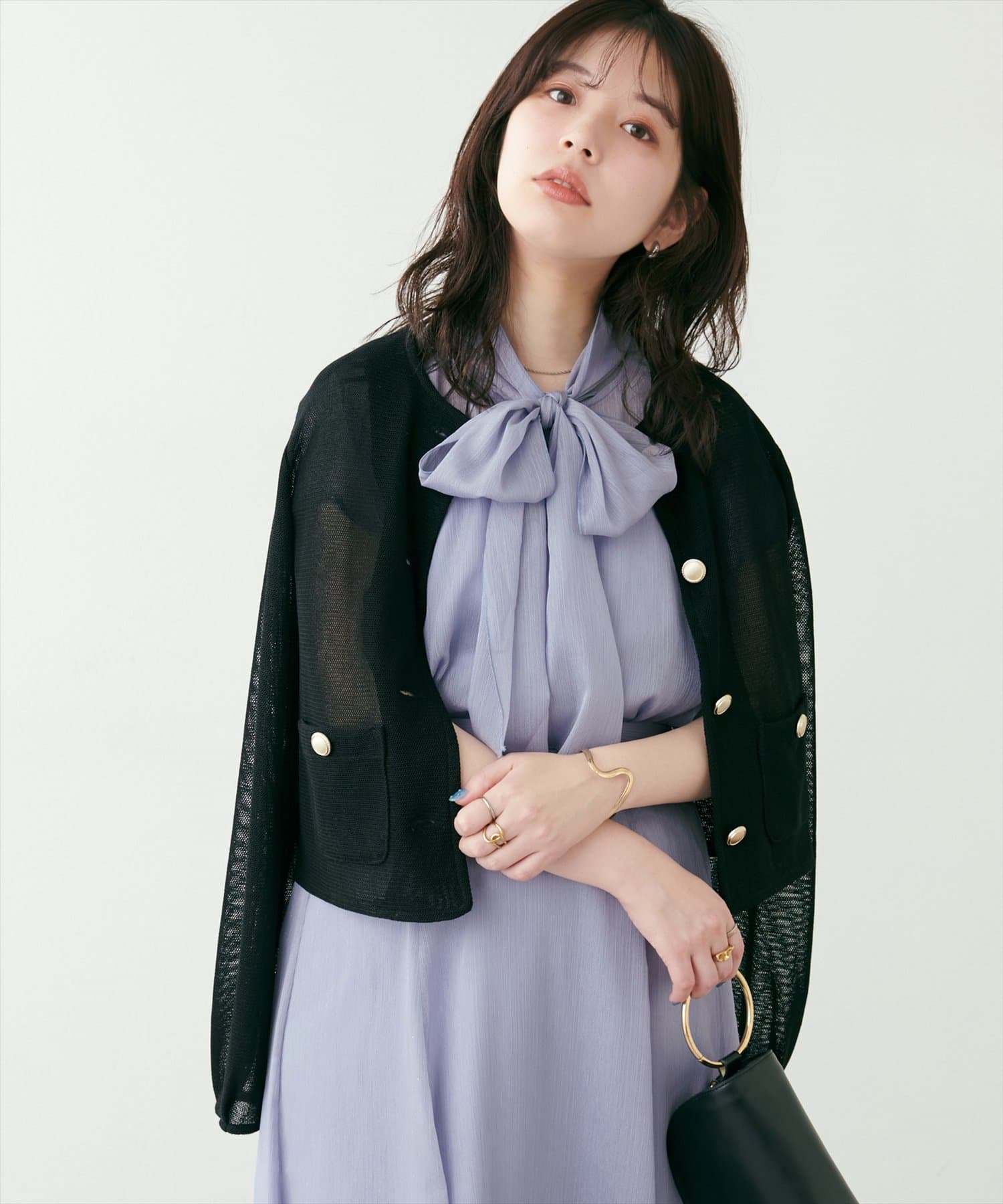 リボンボータイがフェミニンで華やかな印象に。