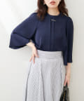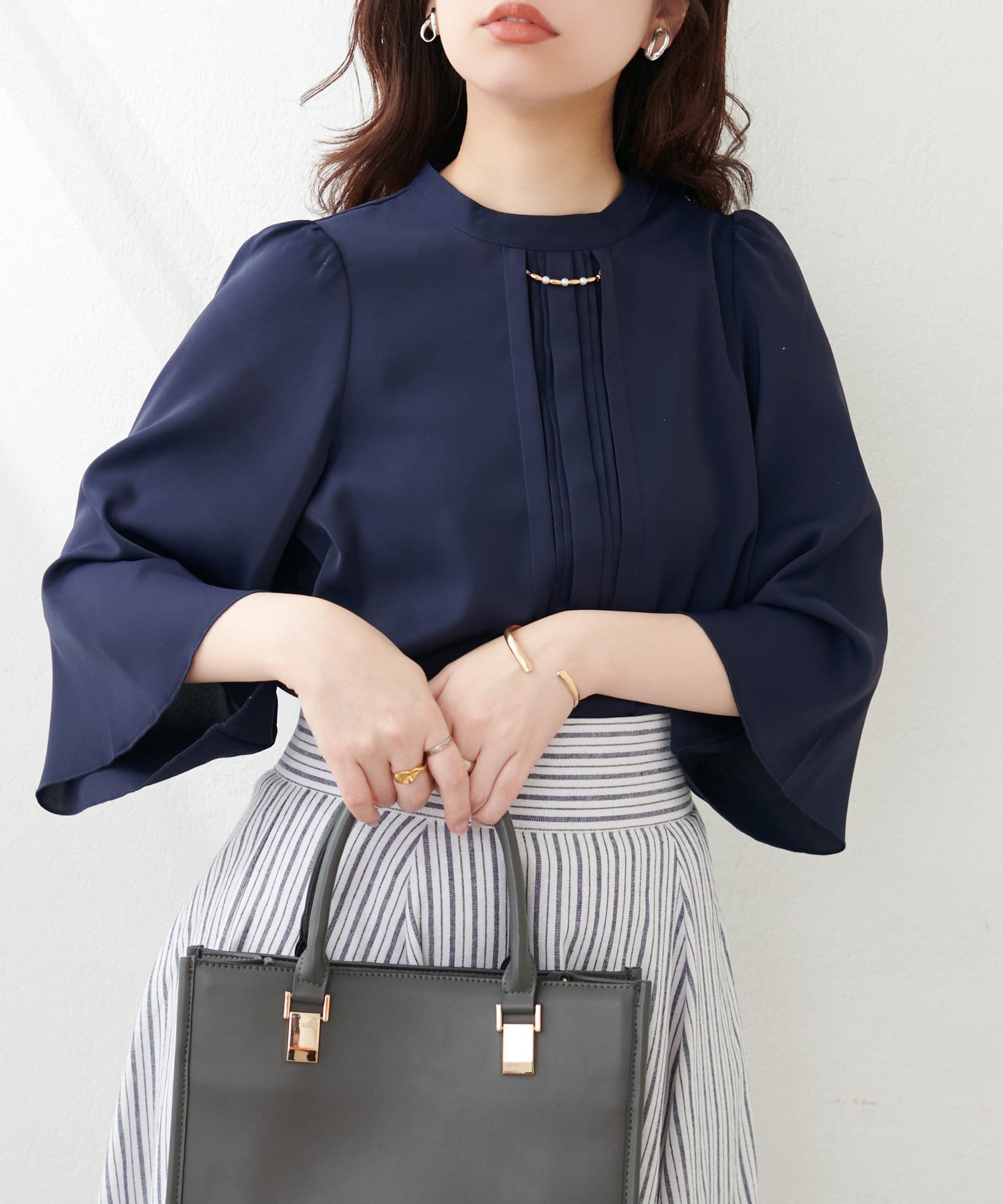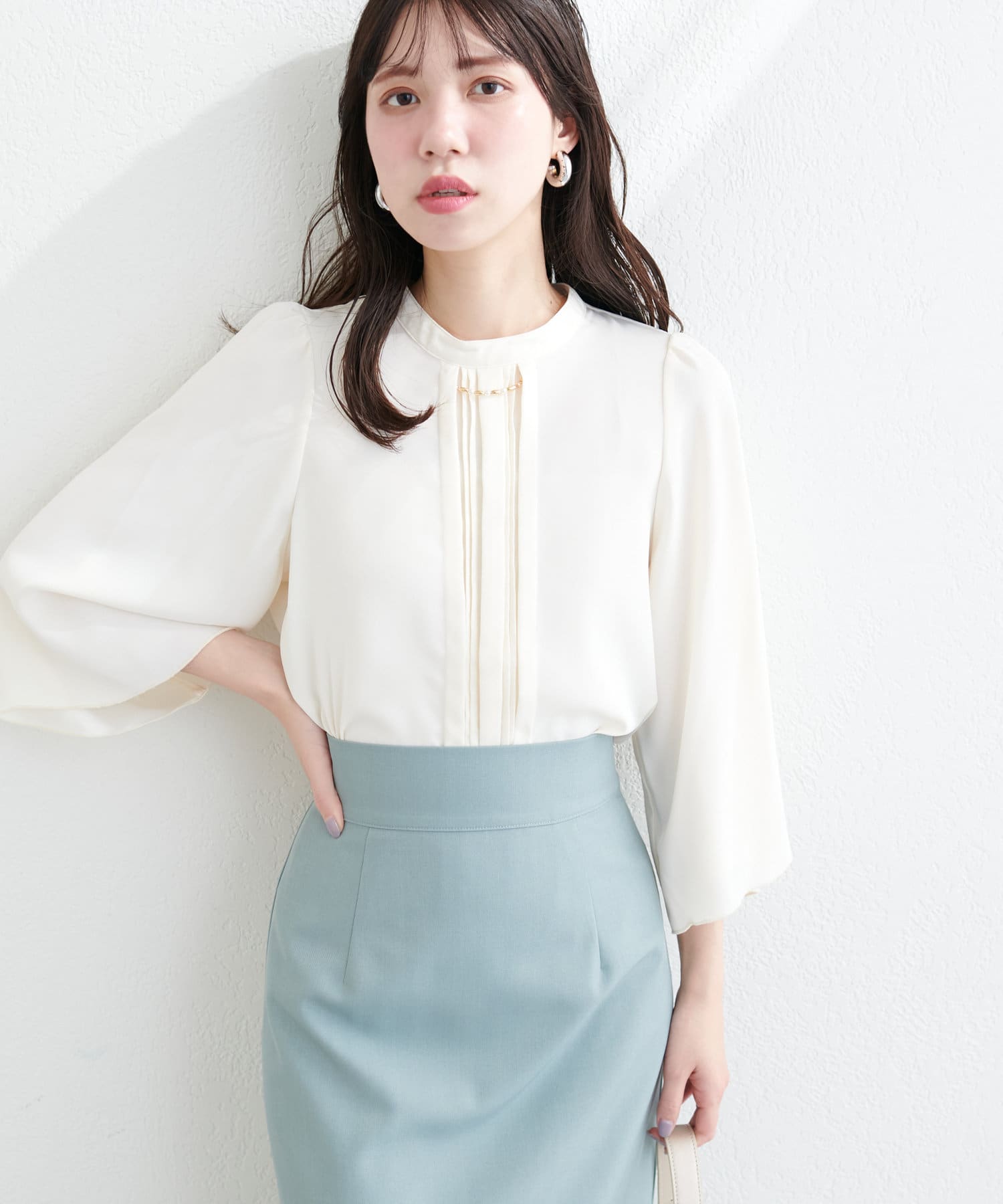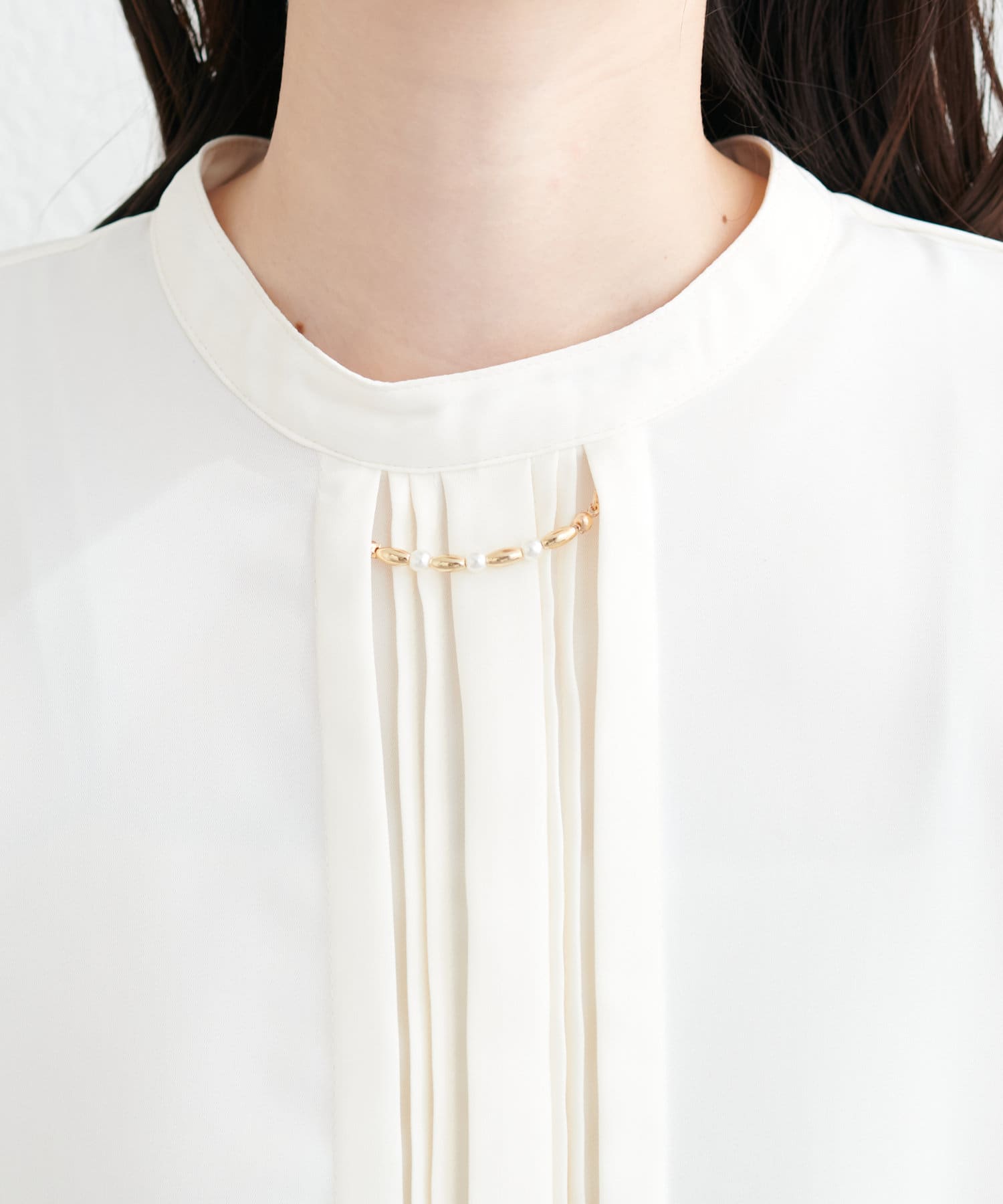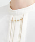シンプルなブラウスにメタルチャームがアクセントで添えたエレガントな大人の雰囲気のブラウス。