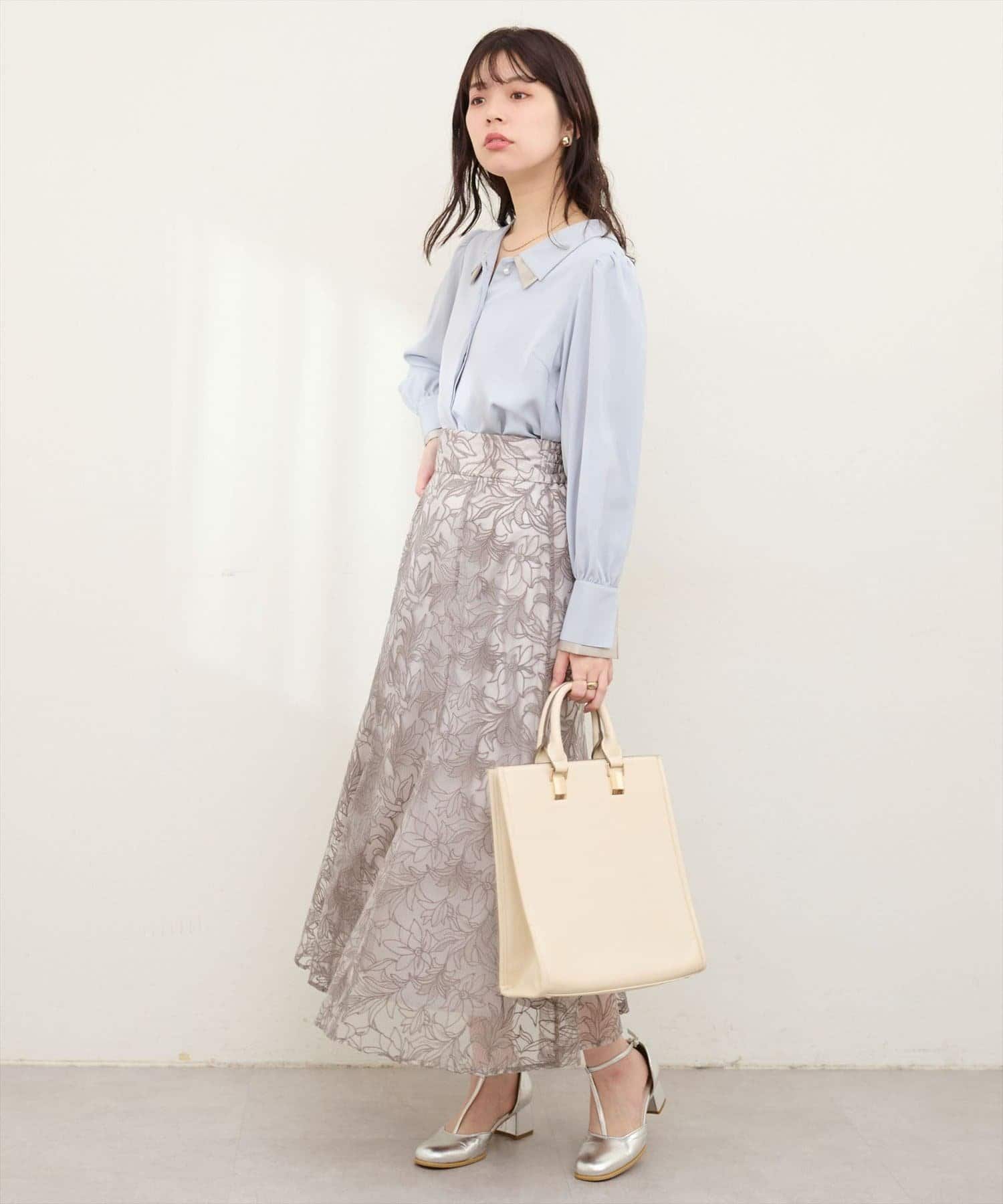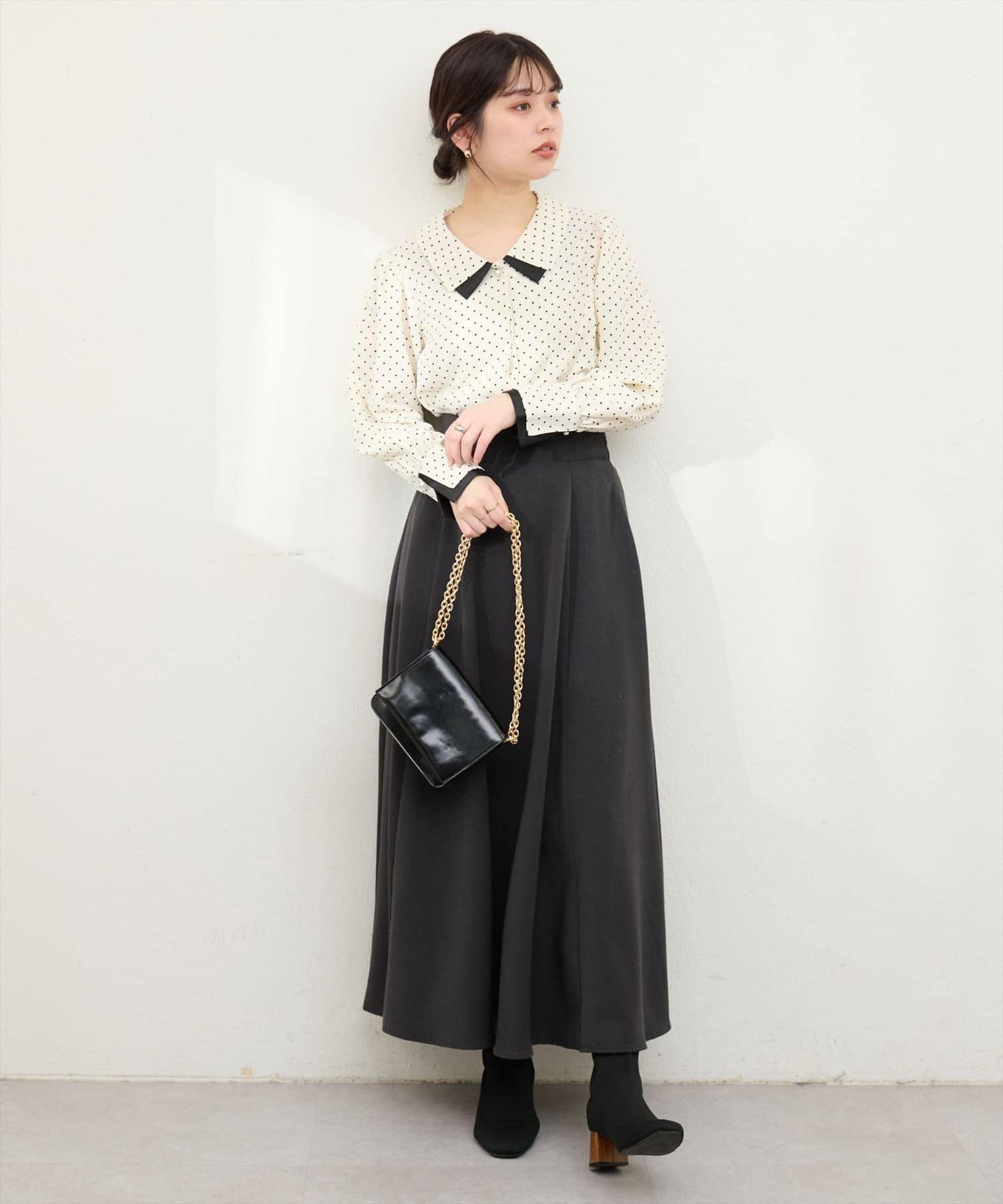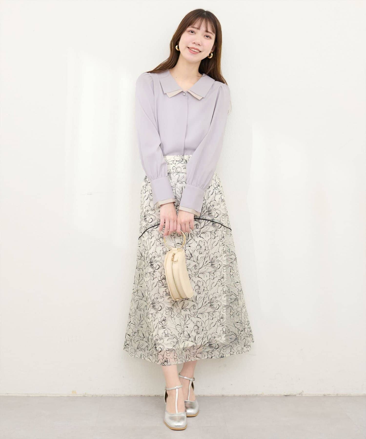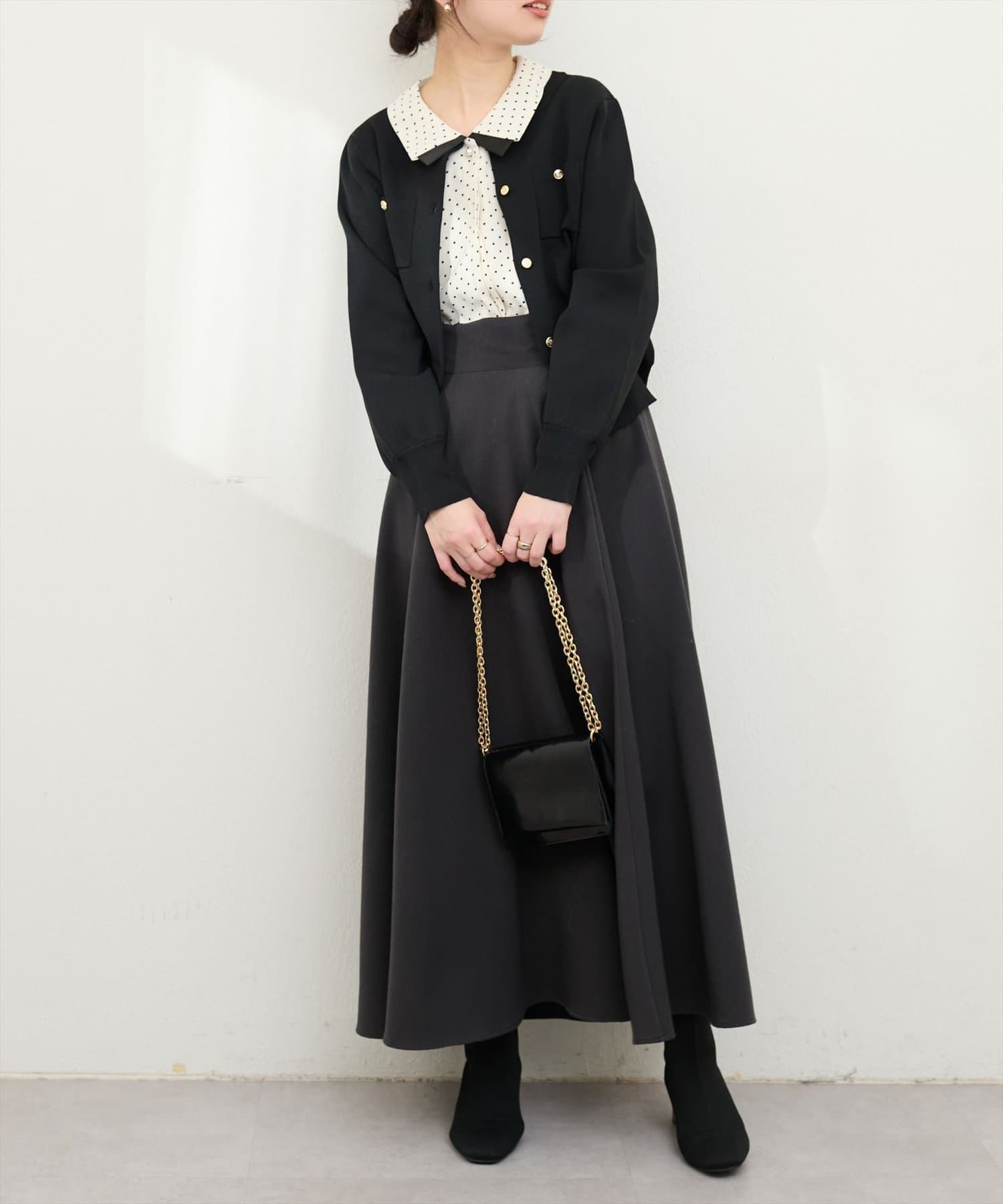 ボトムはパンツでもスカートでも合わせやすい丈感になっておりますので、着回しにも悩まず着ていただけます。