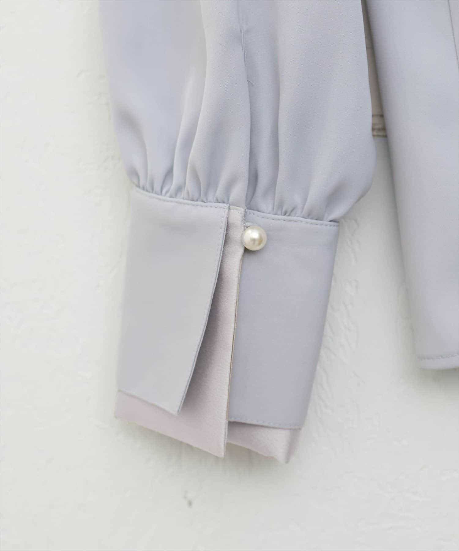 サテン生地が上品見えなブラウスが登場です。衿は重ね風になっているので、一番上のパールボタンを開けて着ていただいても