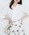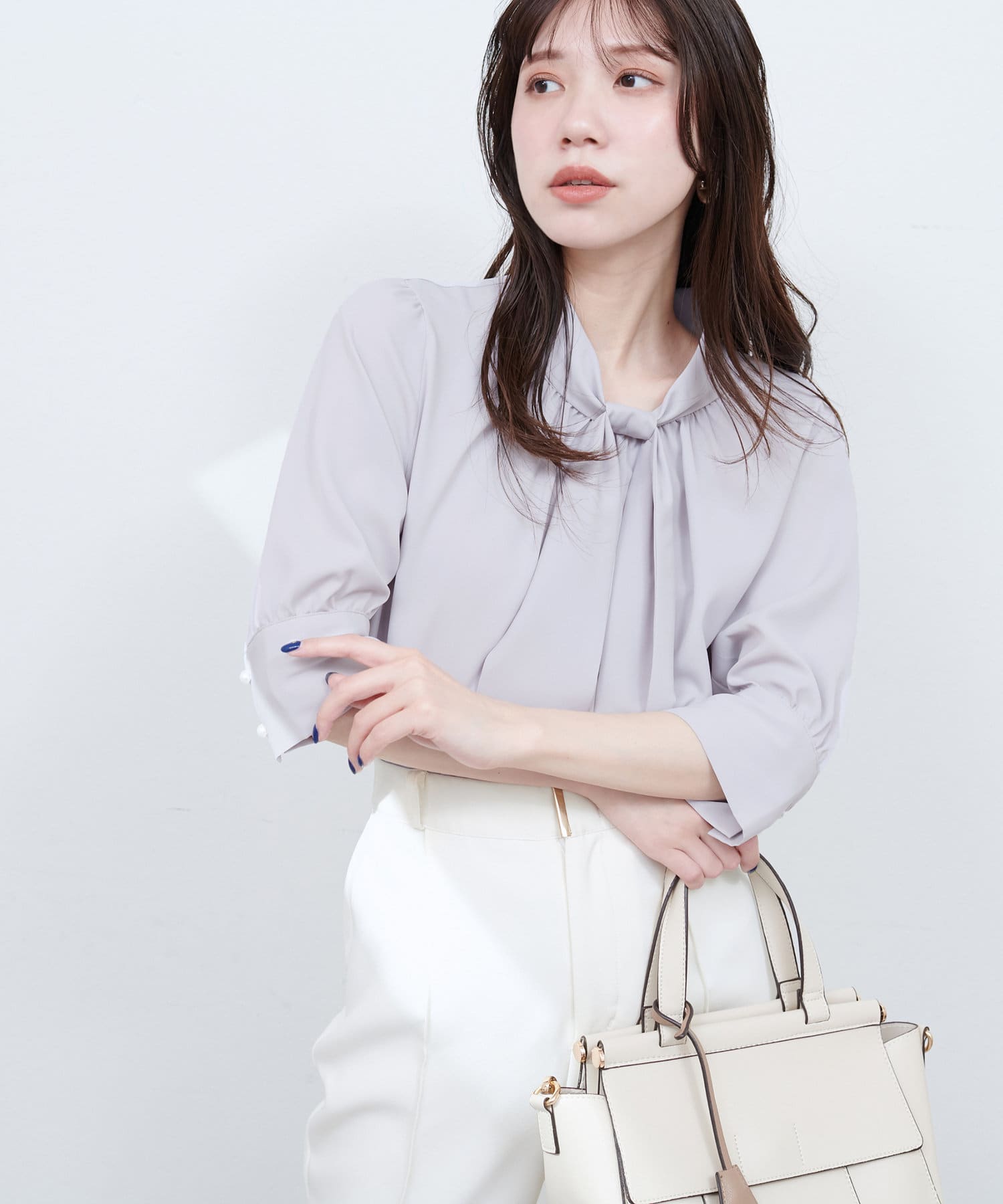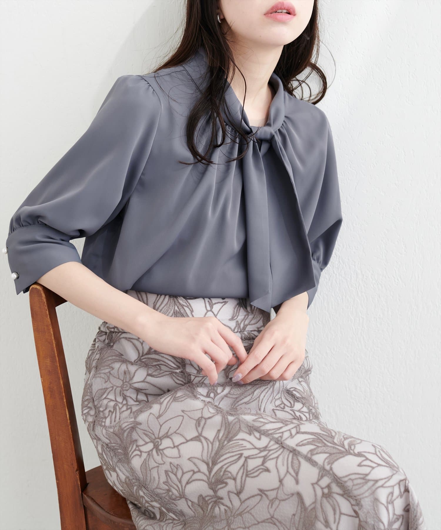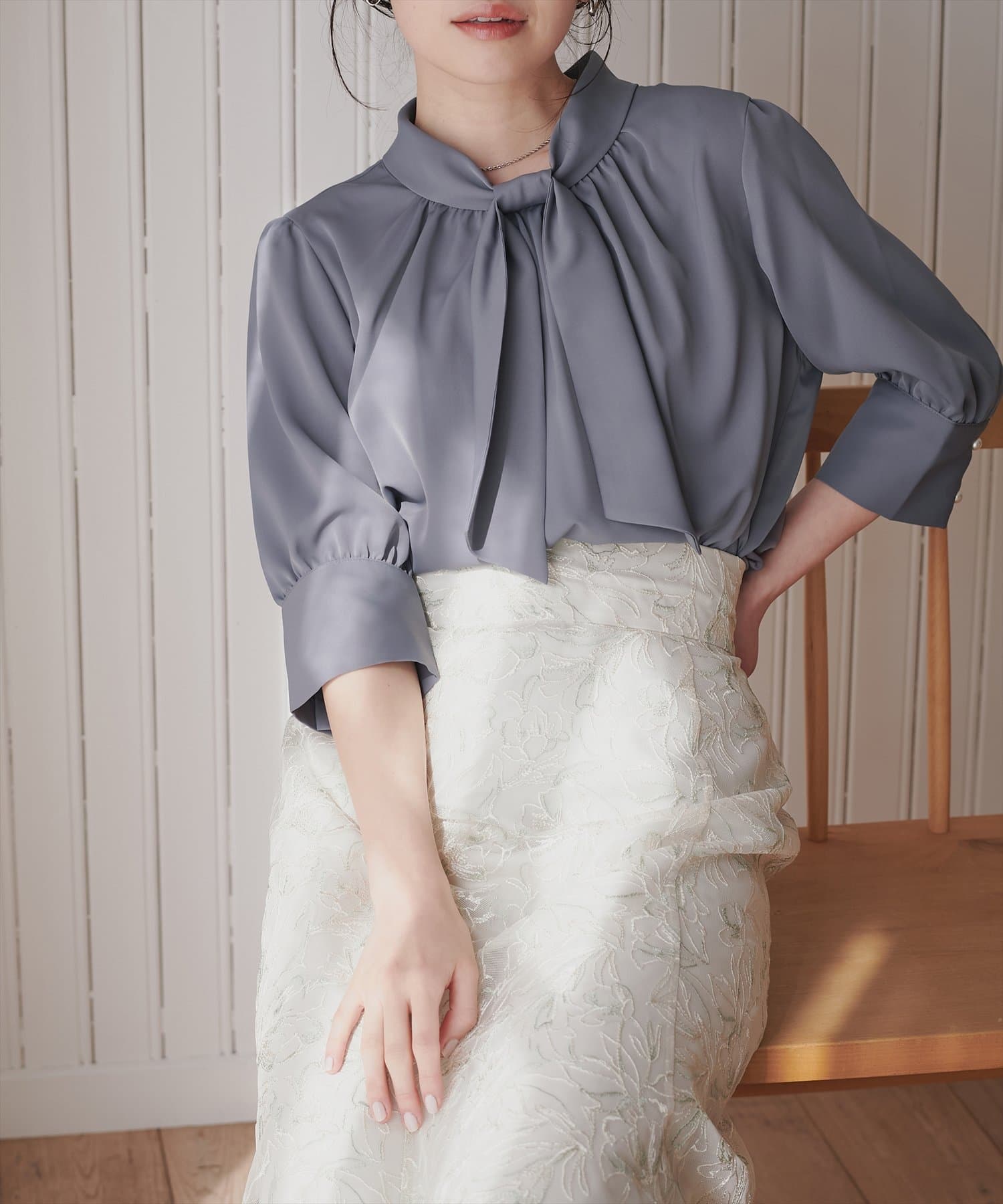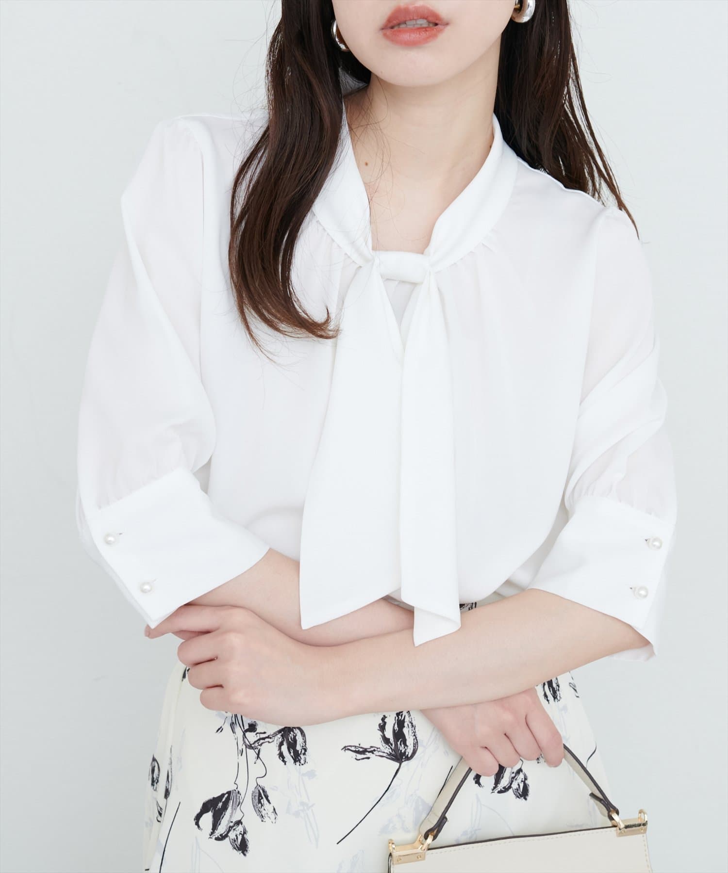 袖口パールノット結び6分袖ブラウス
