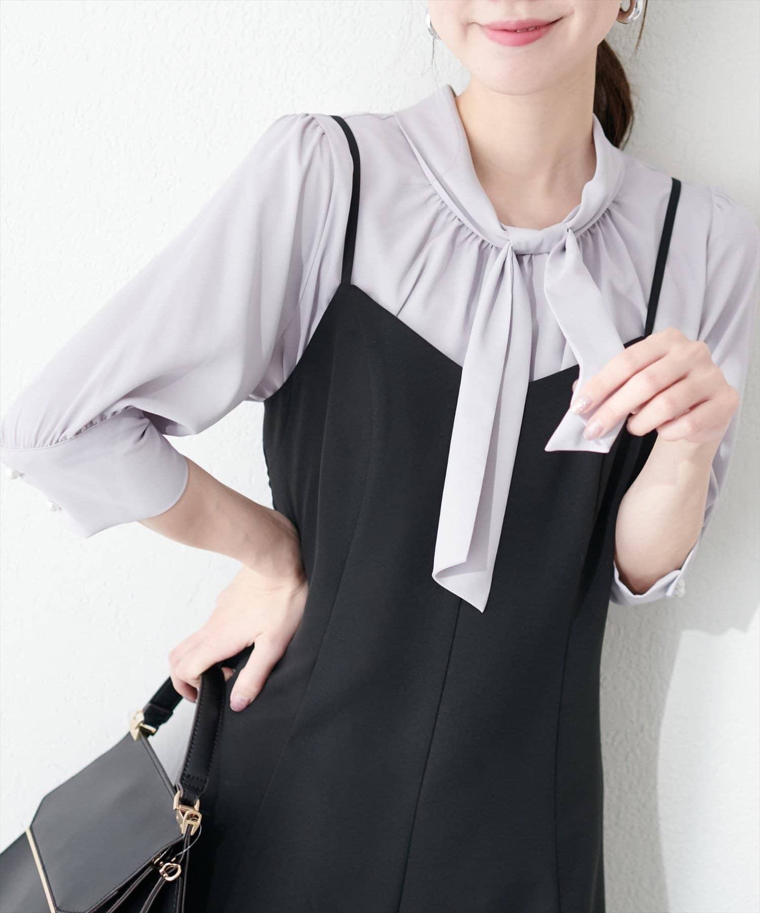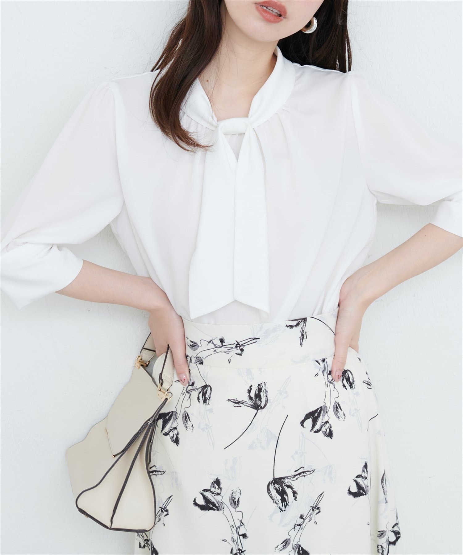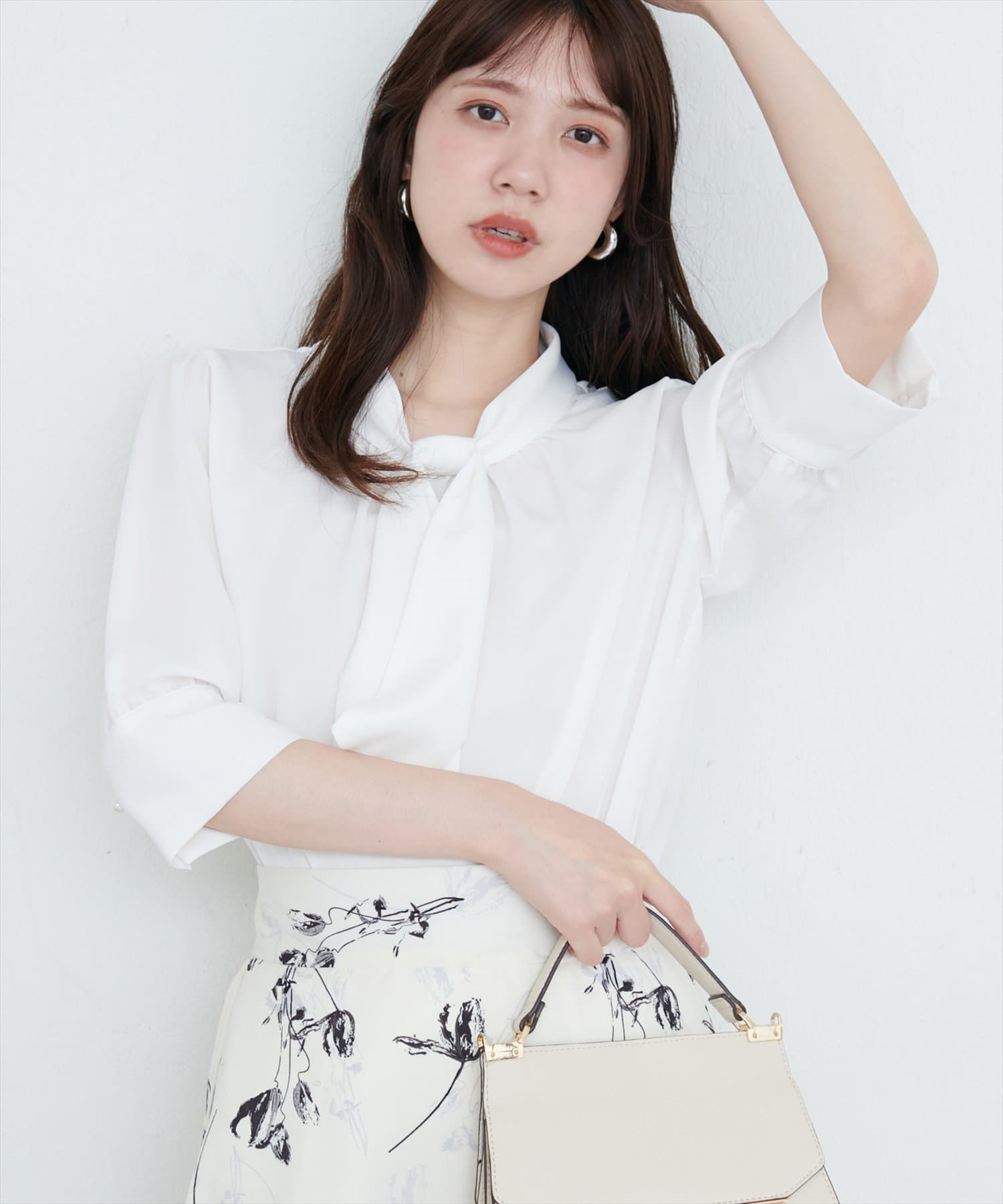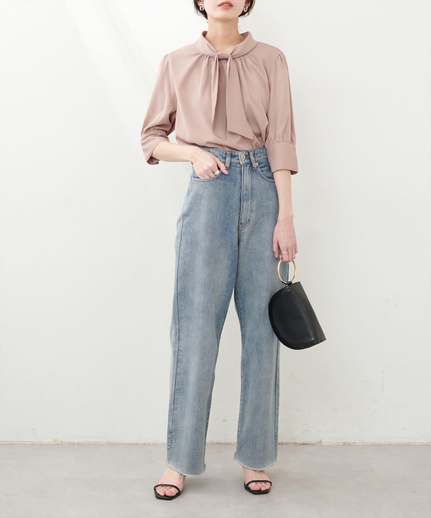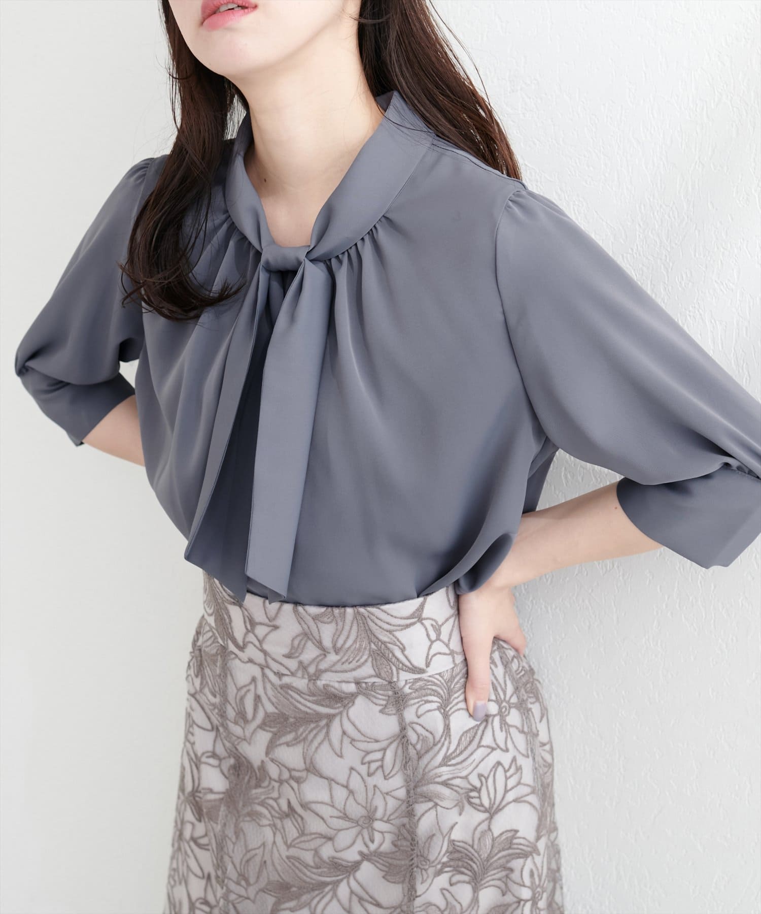 袖口パールノット結び6分袖ブラウス