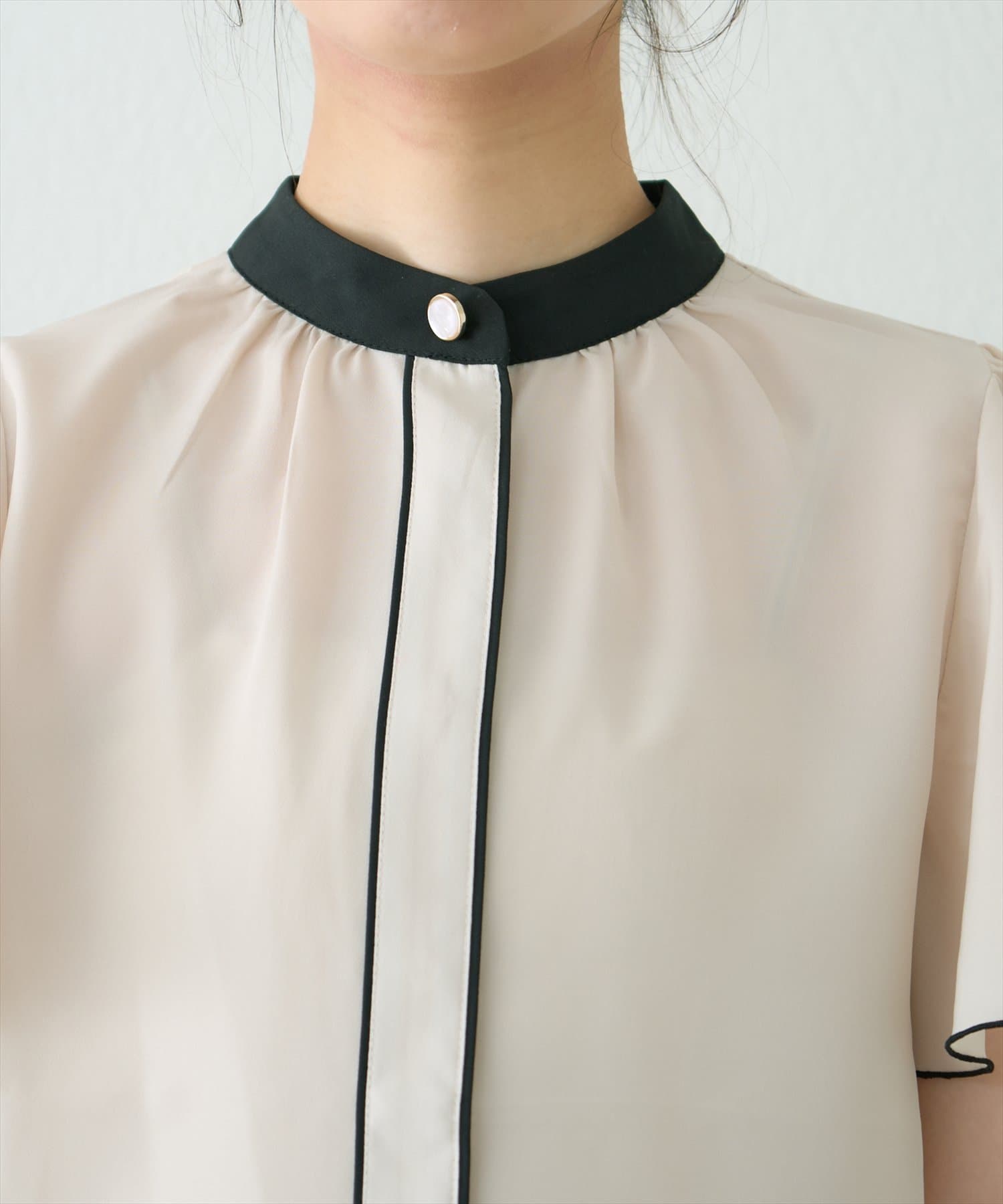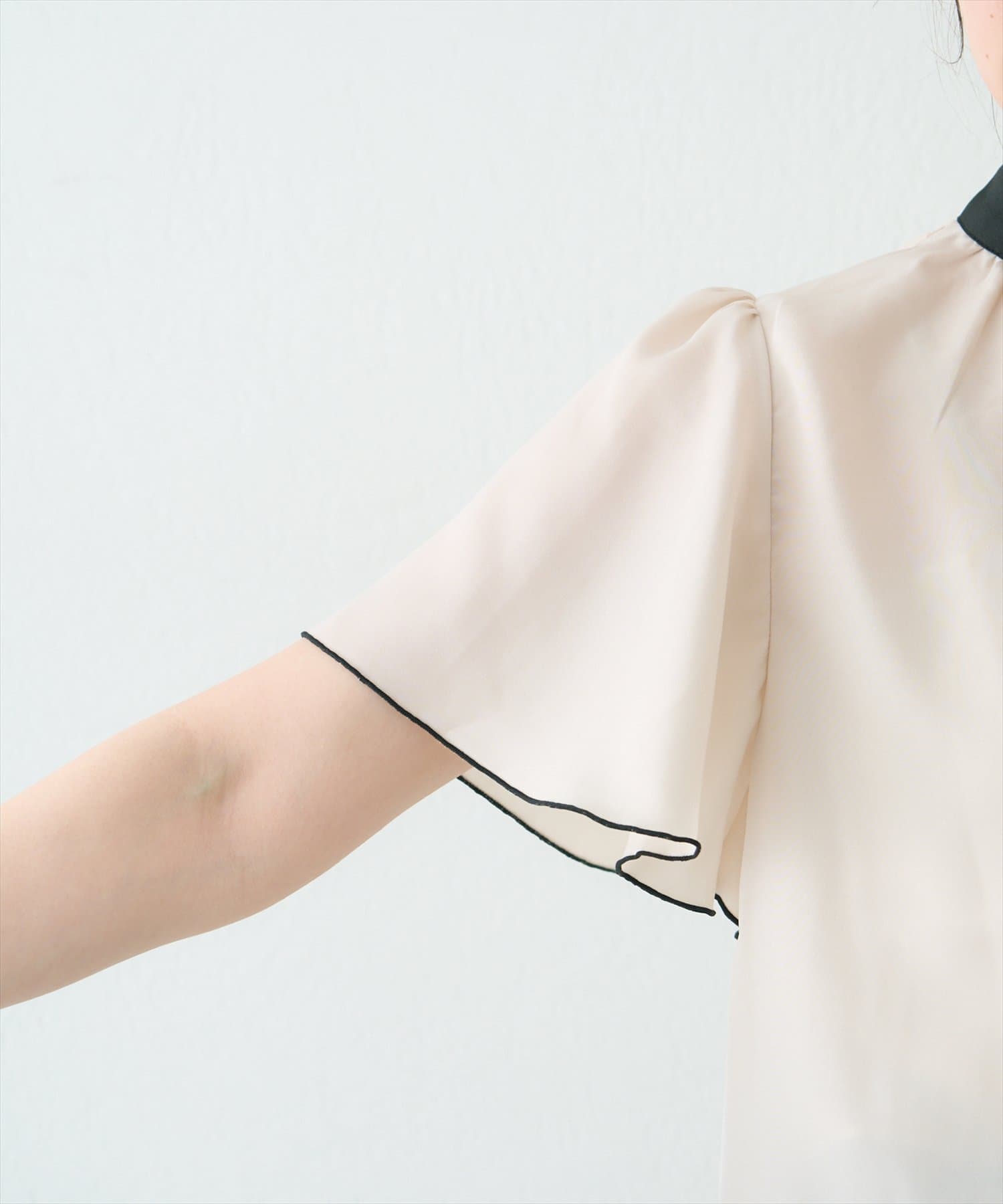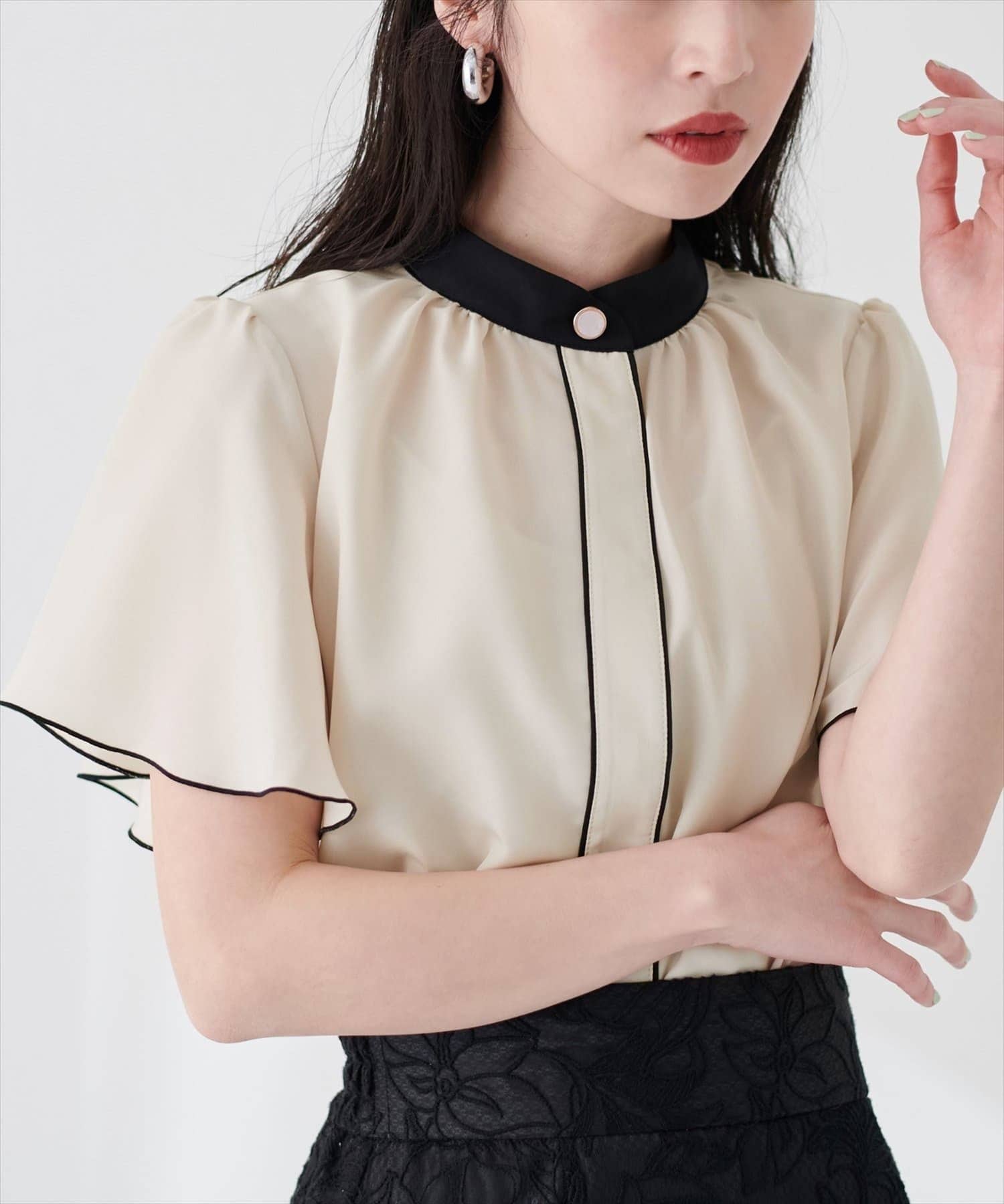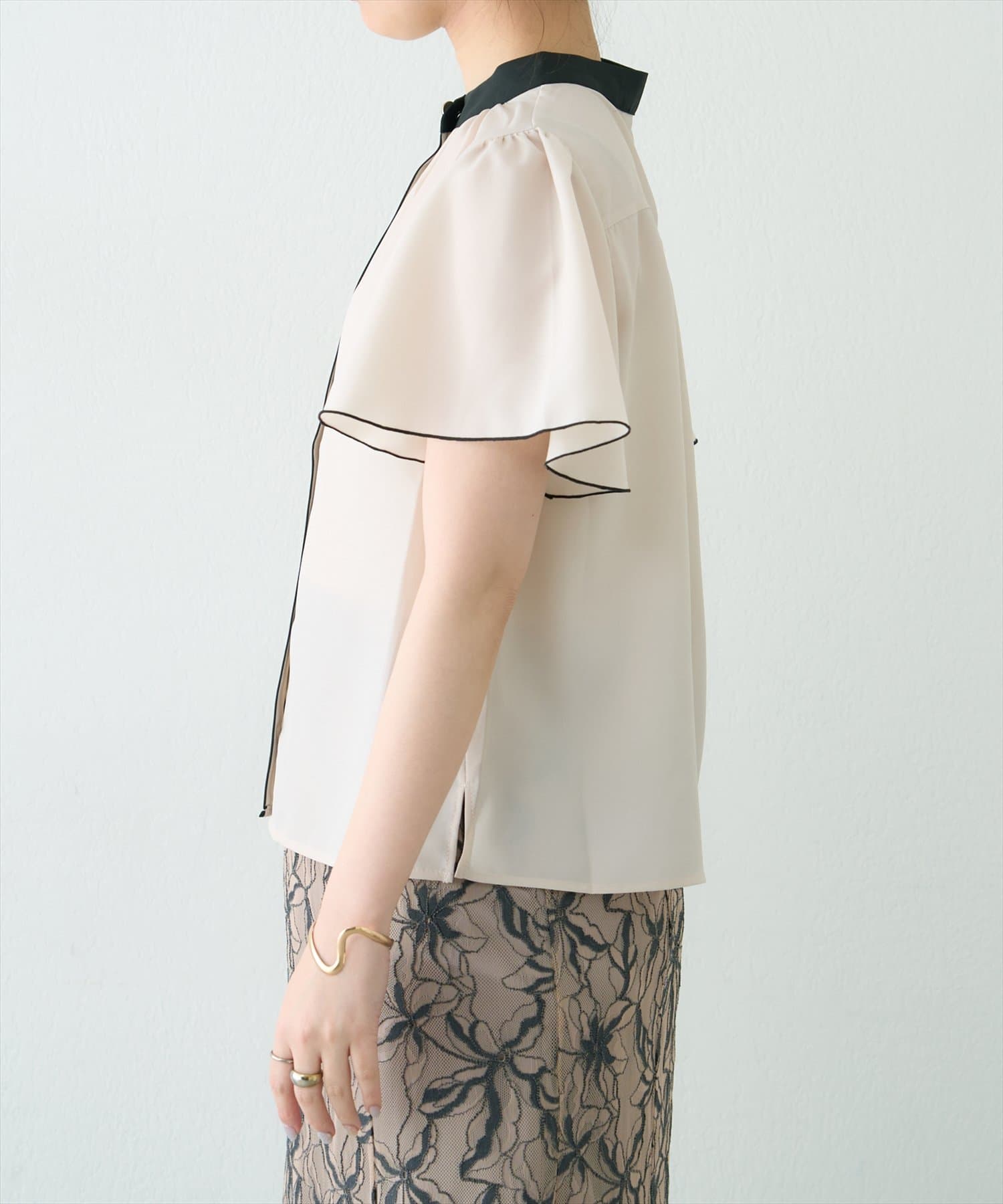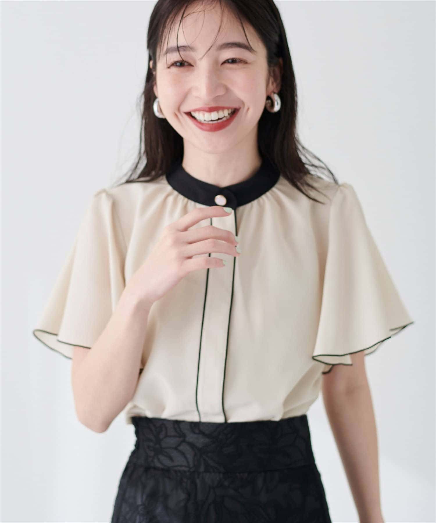 華やかで女性らしい雰囲気と配色のトリミングをアクセントにメリハリをつけたフェミニンブラウス。