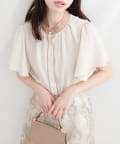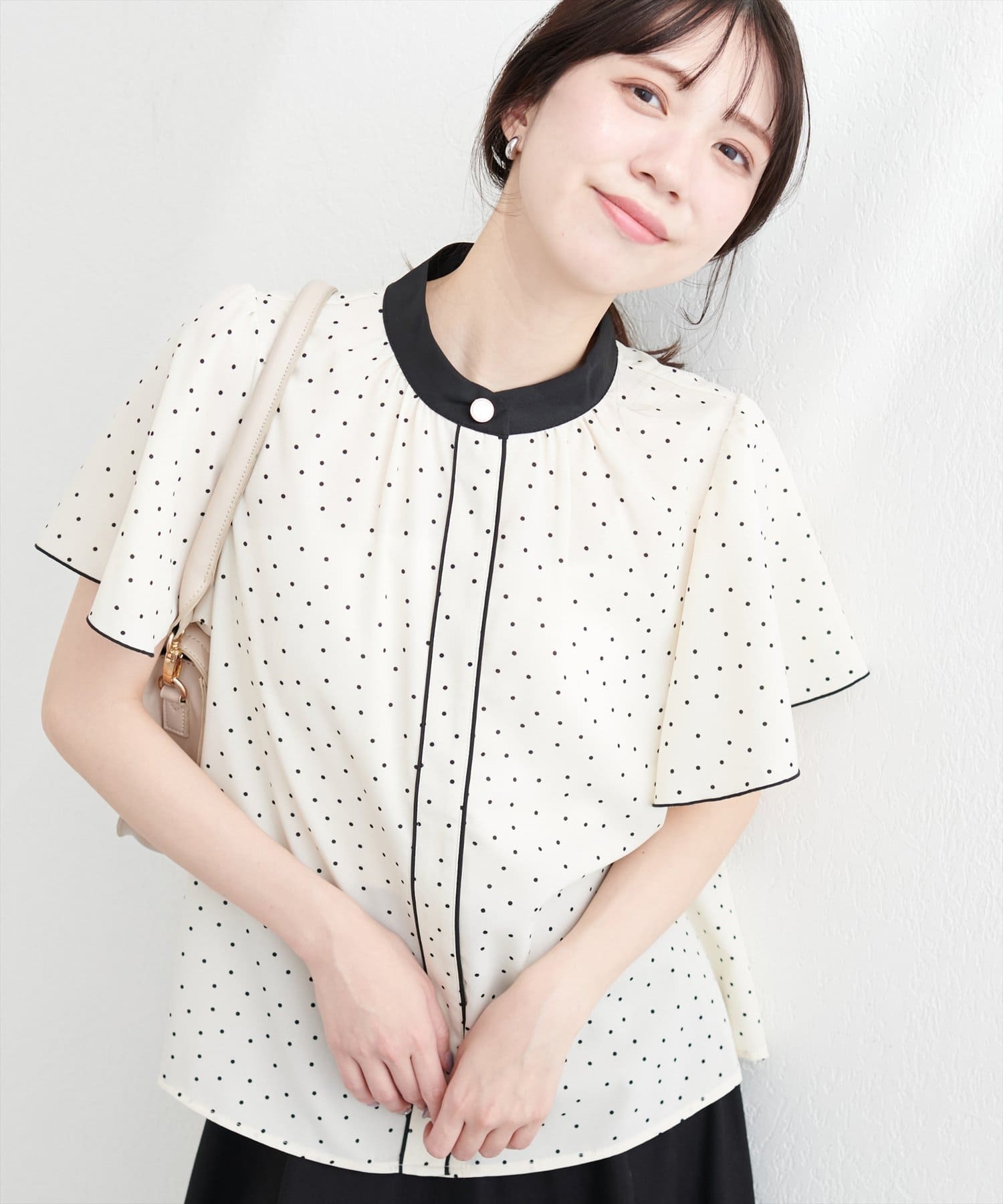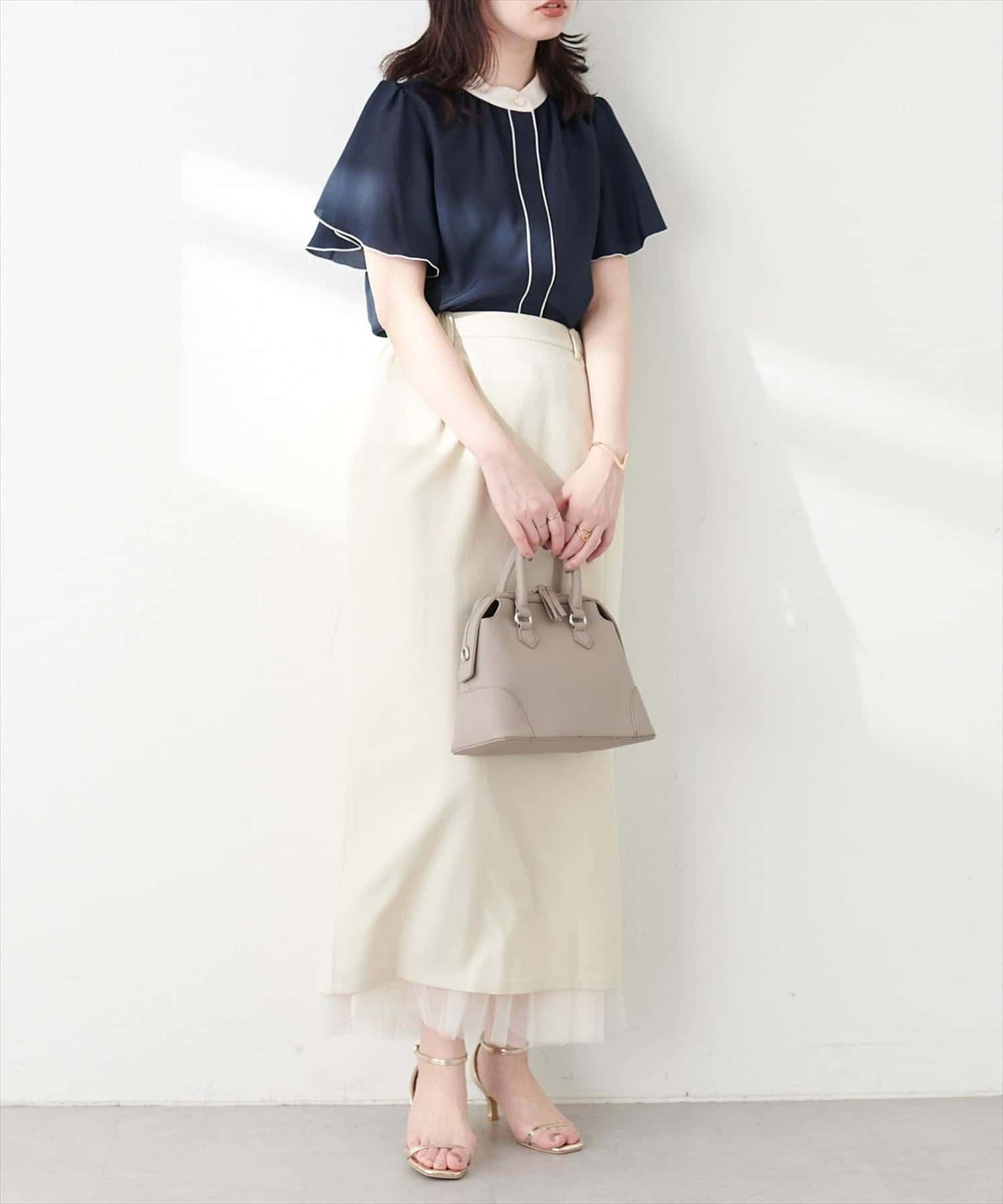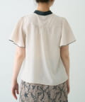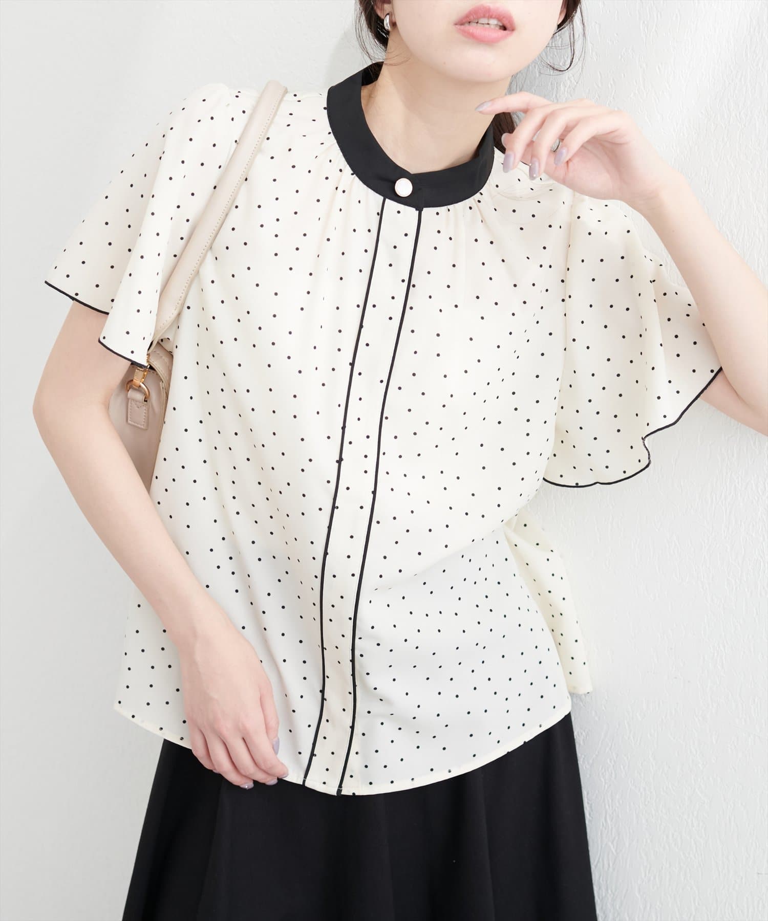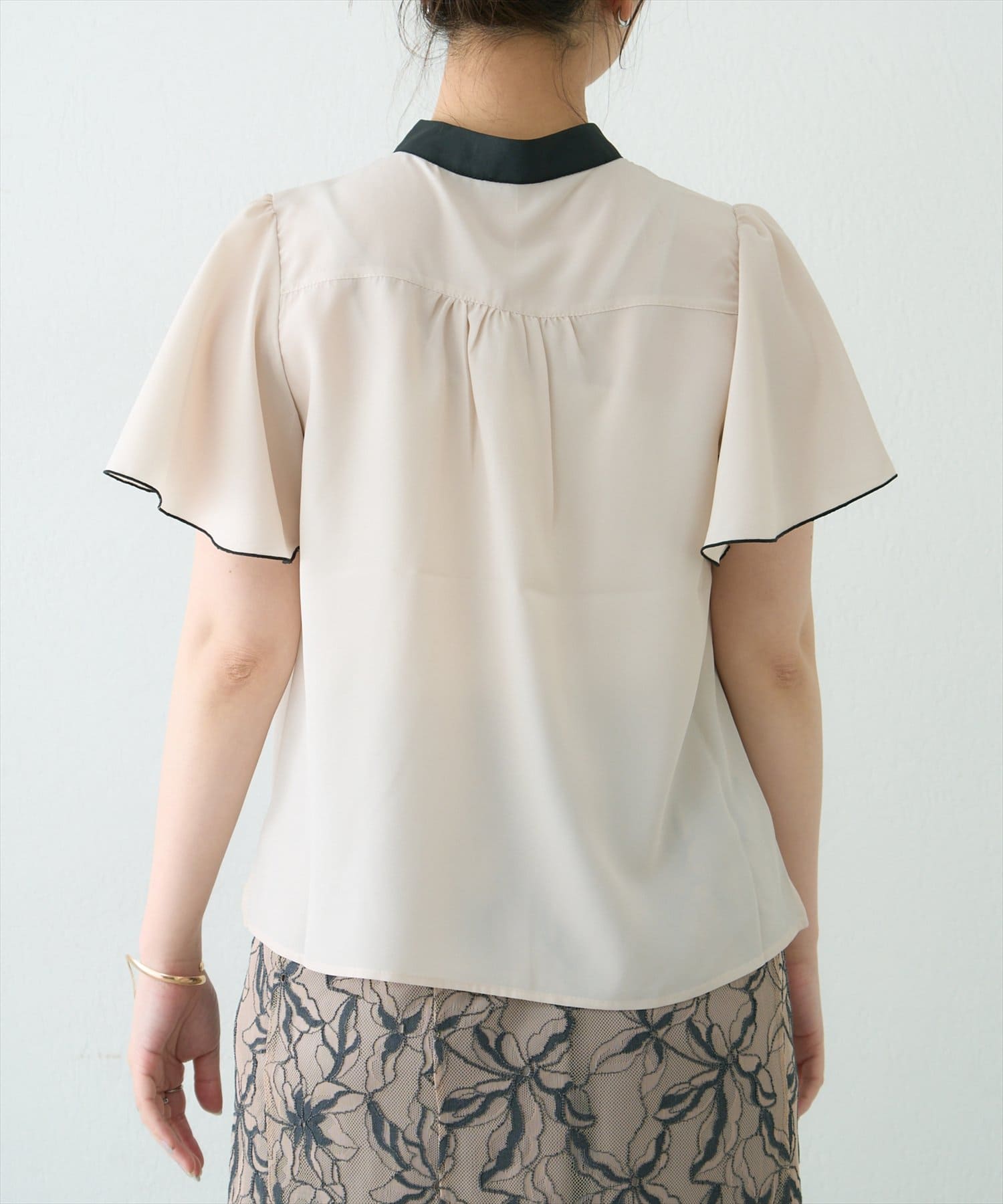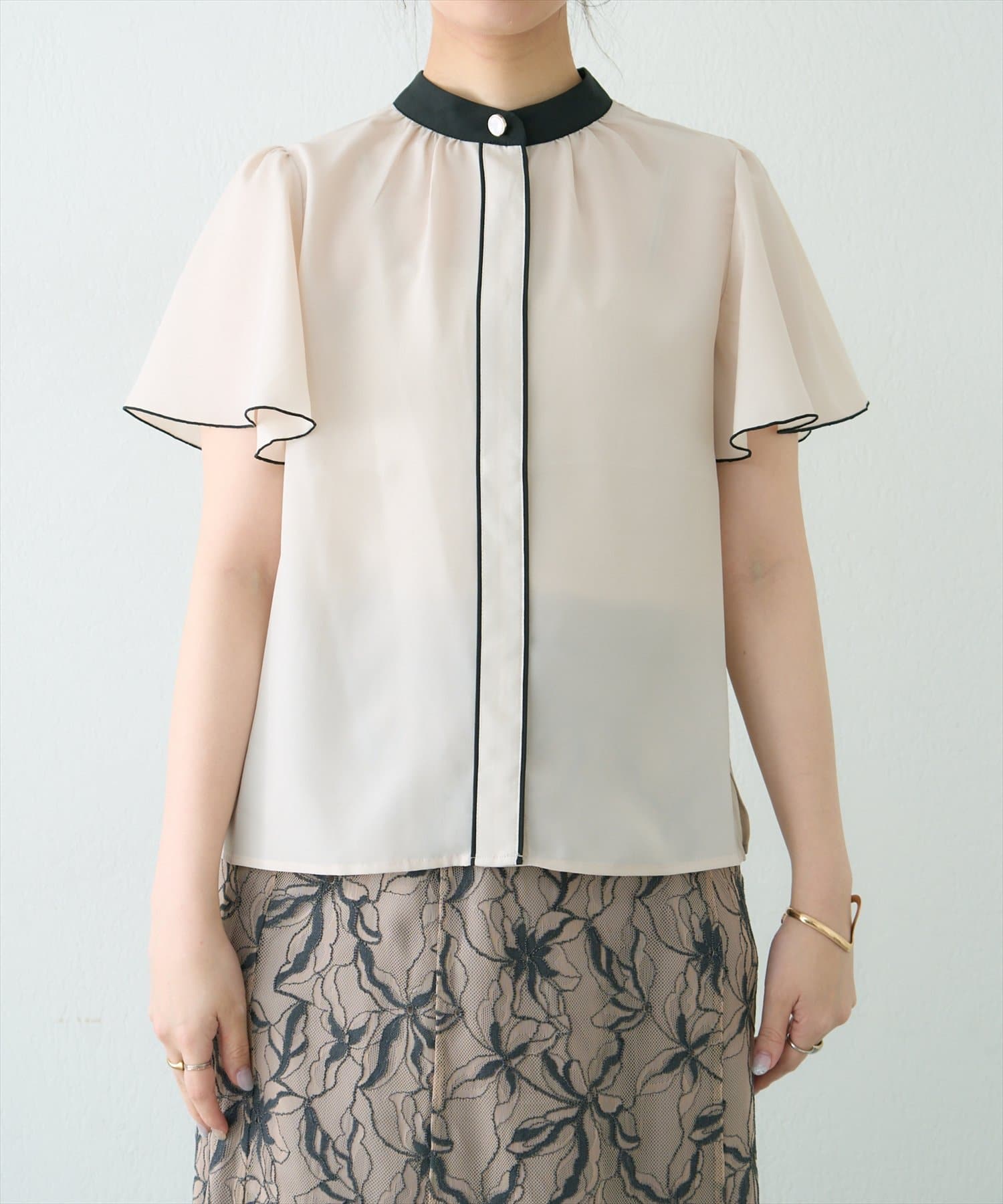 華やかで女性らしい雰囲気と配色のトリミングをアクセントにメリハリをつけたフェミニンブラウス。
