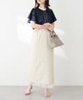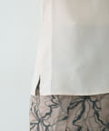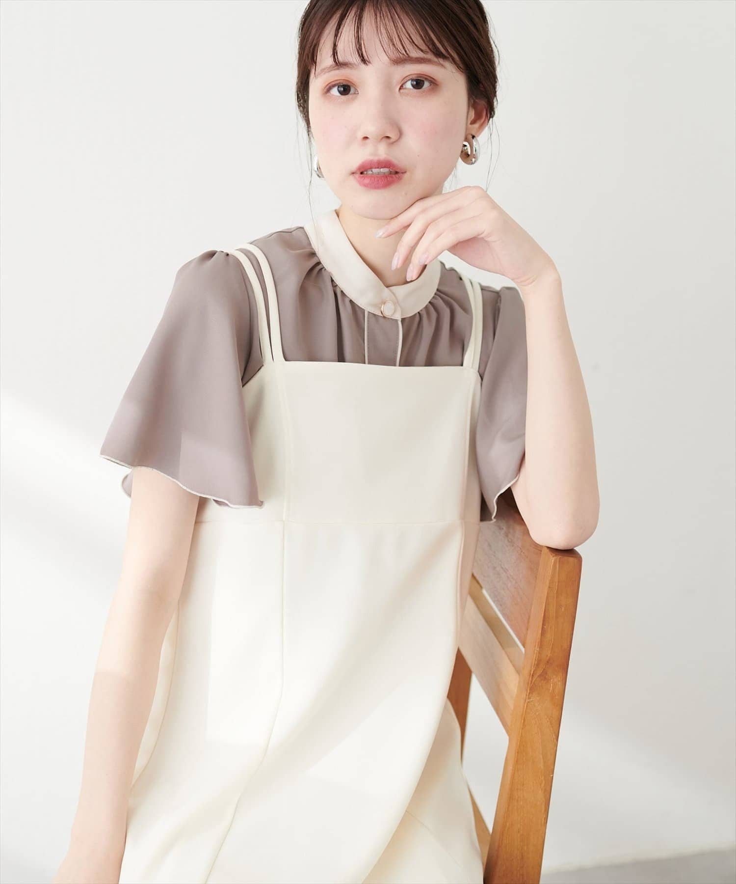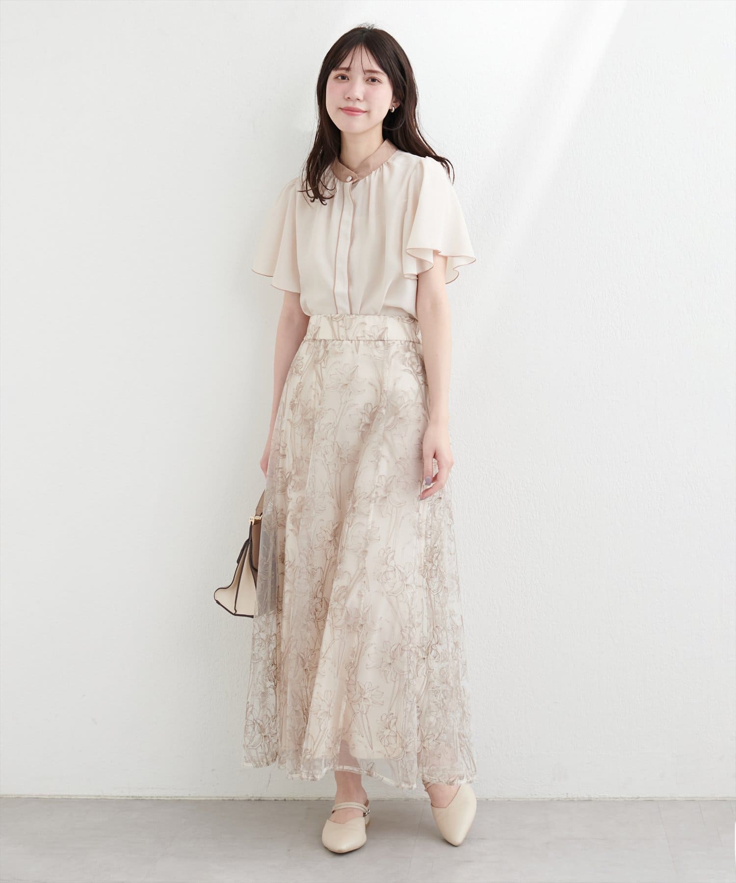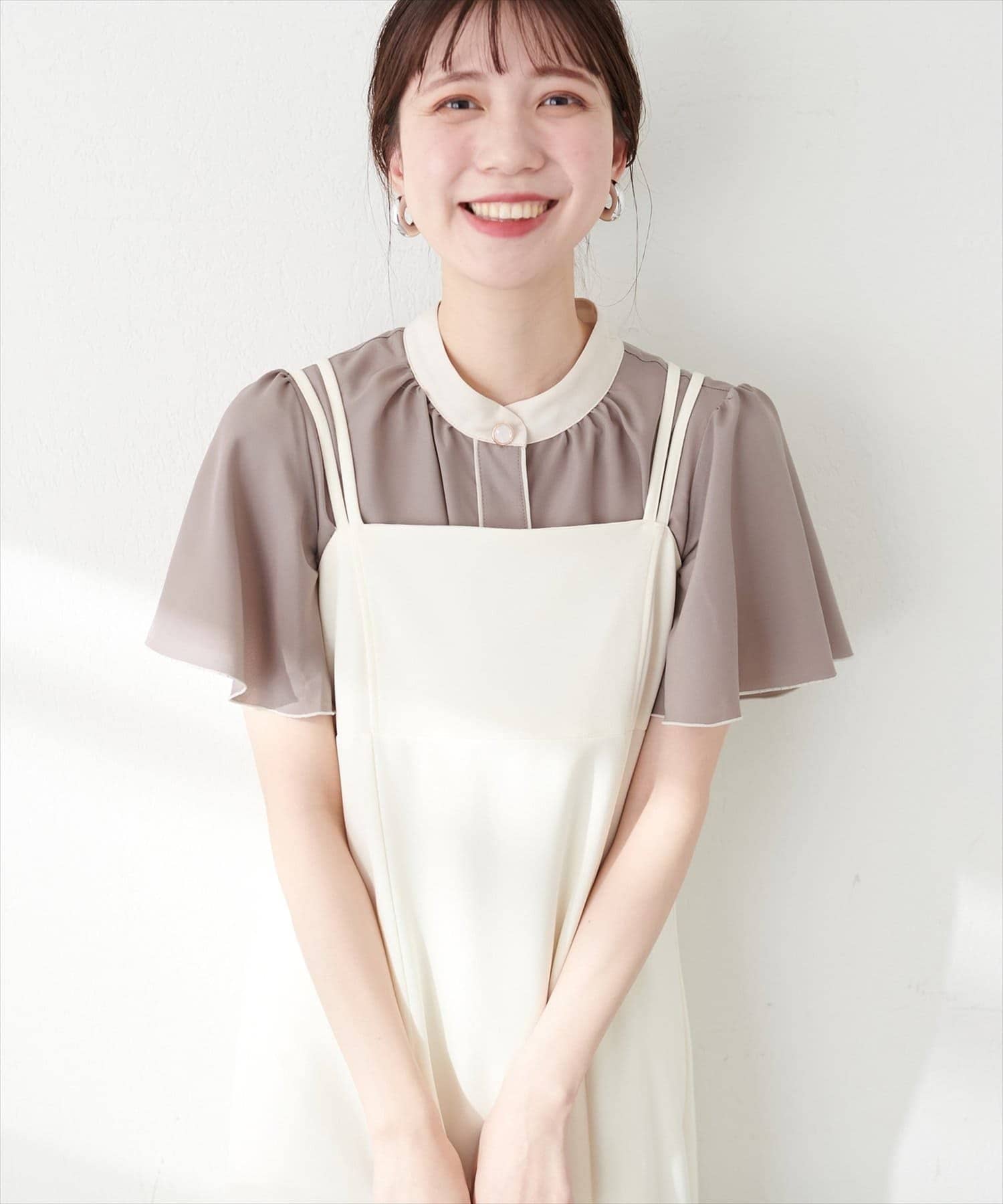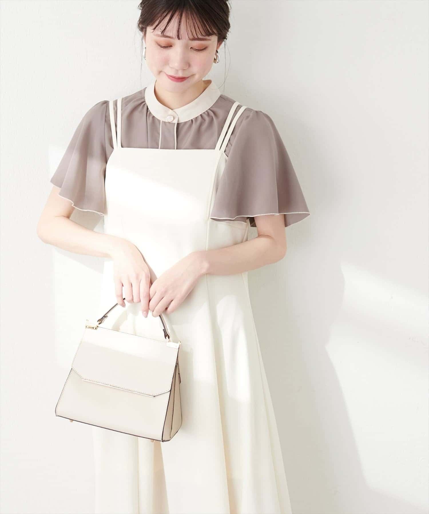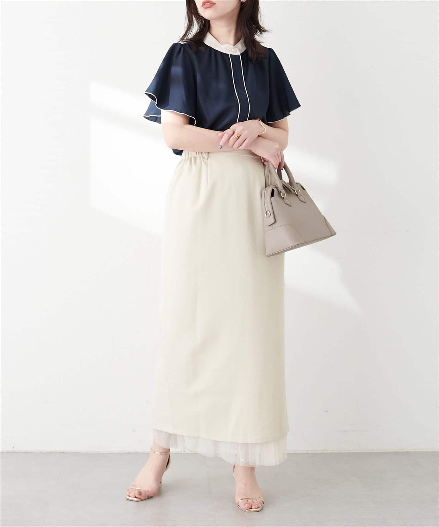 華やかで女性らしい雰囲気と配色のトリミングをアクセントにメリハリをつけたフェミニンブラウス。