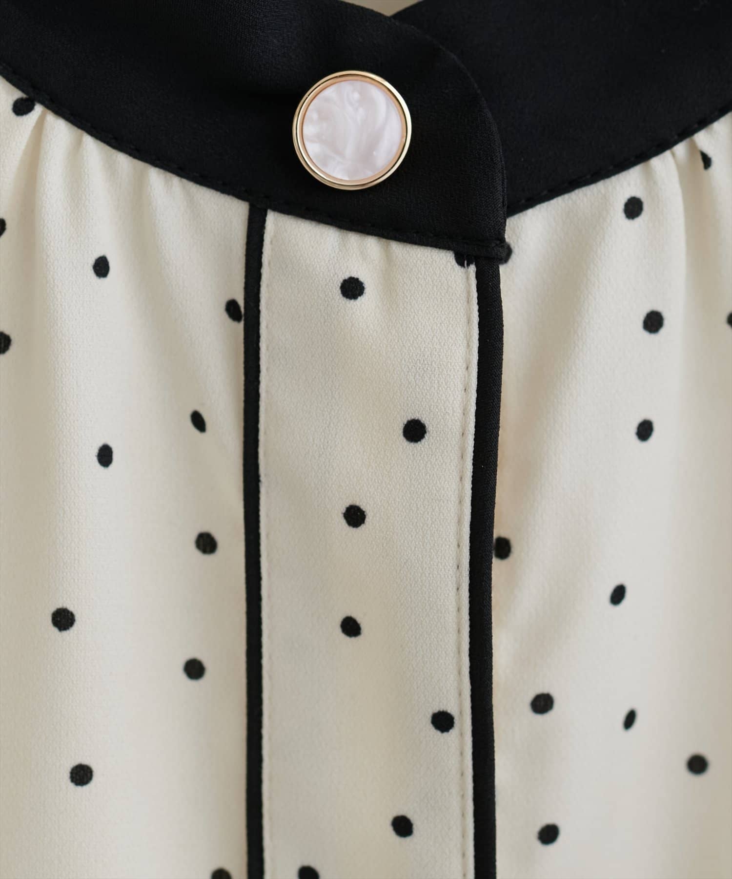 シェル素材とゴールドを組み合わせた上品な印象の釦を襟元に施し、