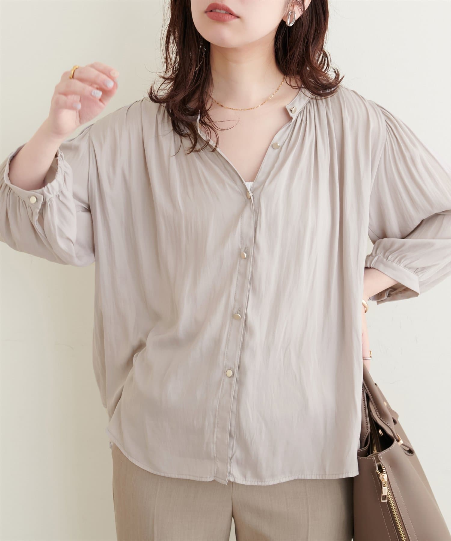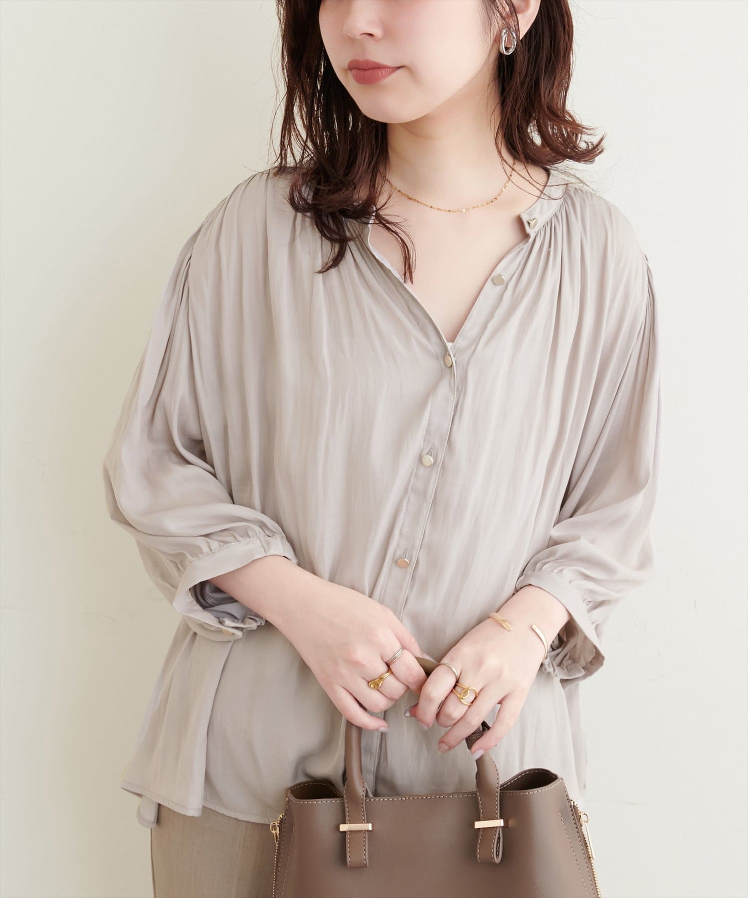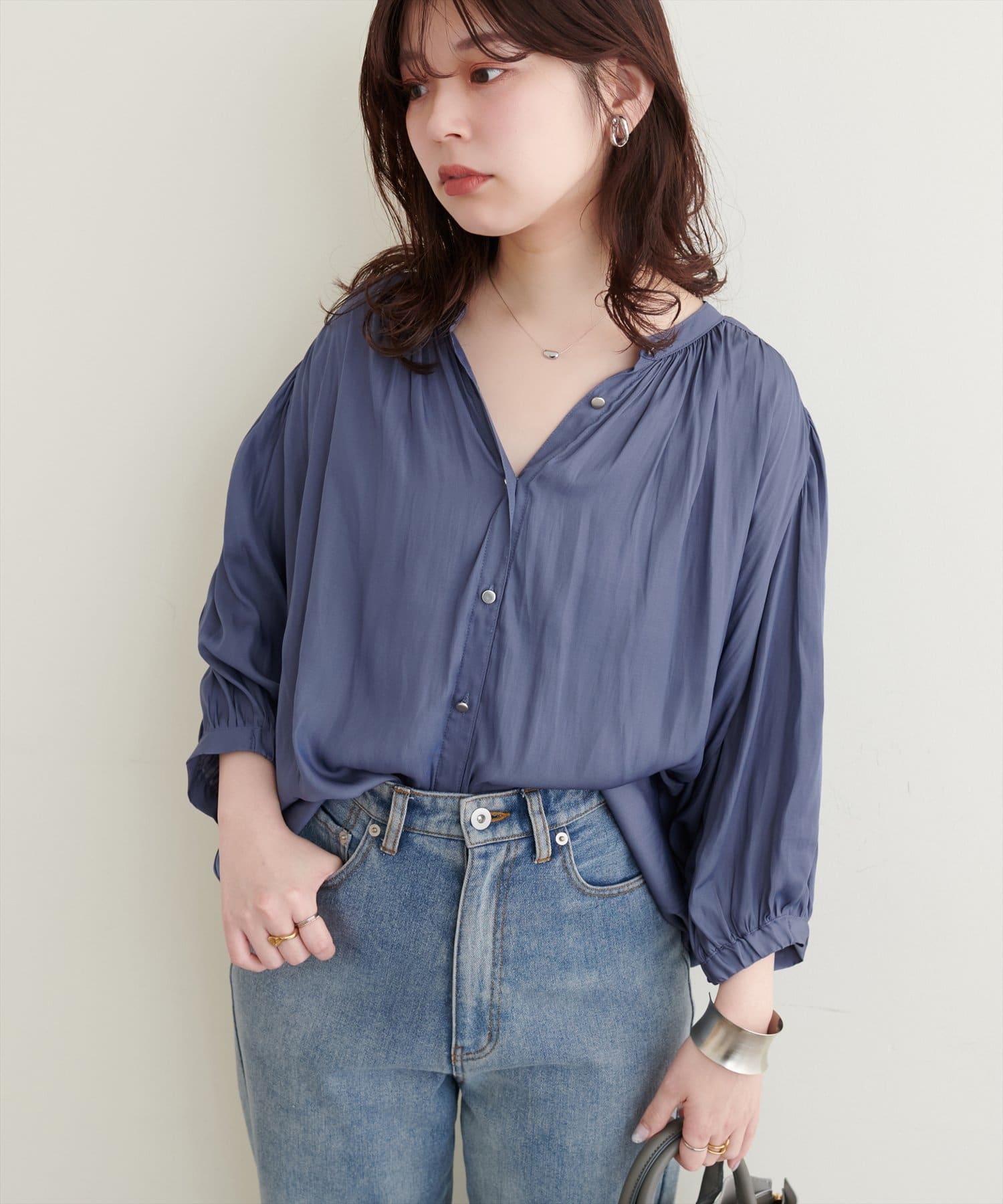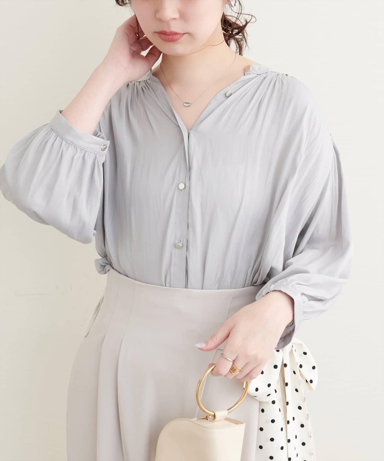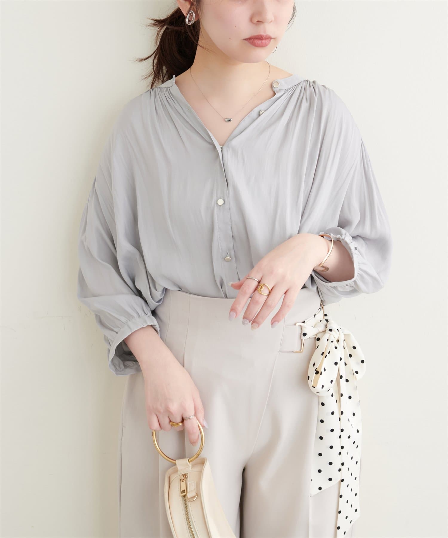 落ち感のあるとろみ素材と、たっぷりと施したギャザーが魅力の7分袖ブラウス。