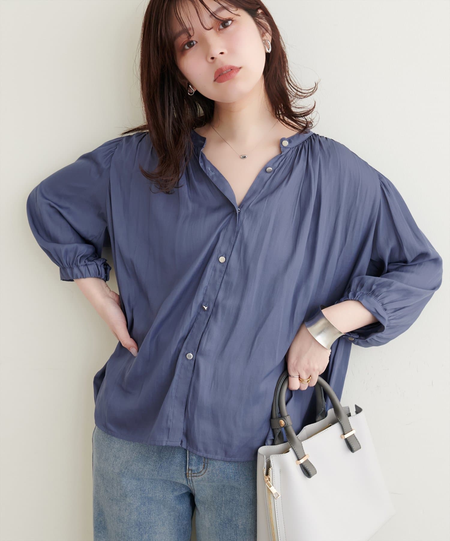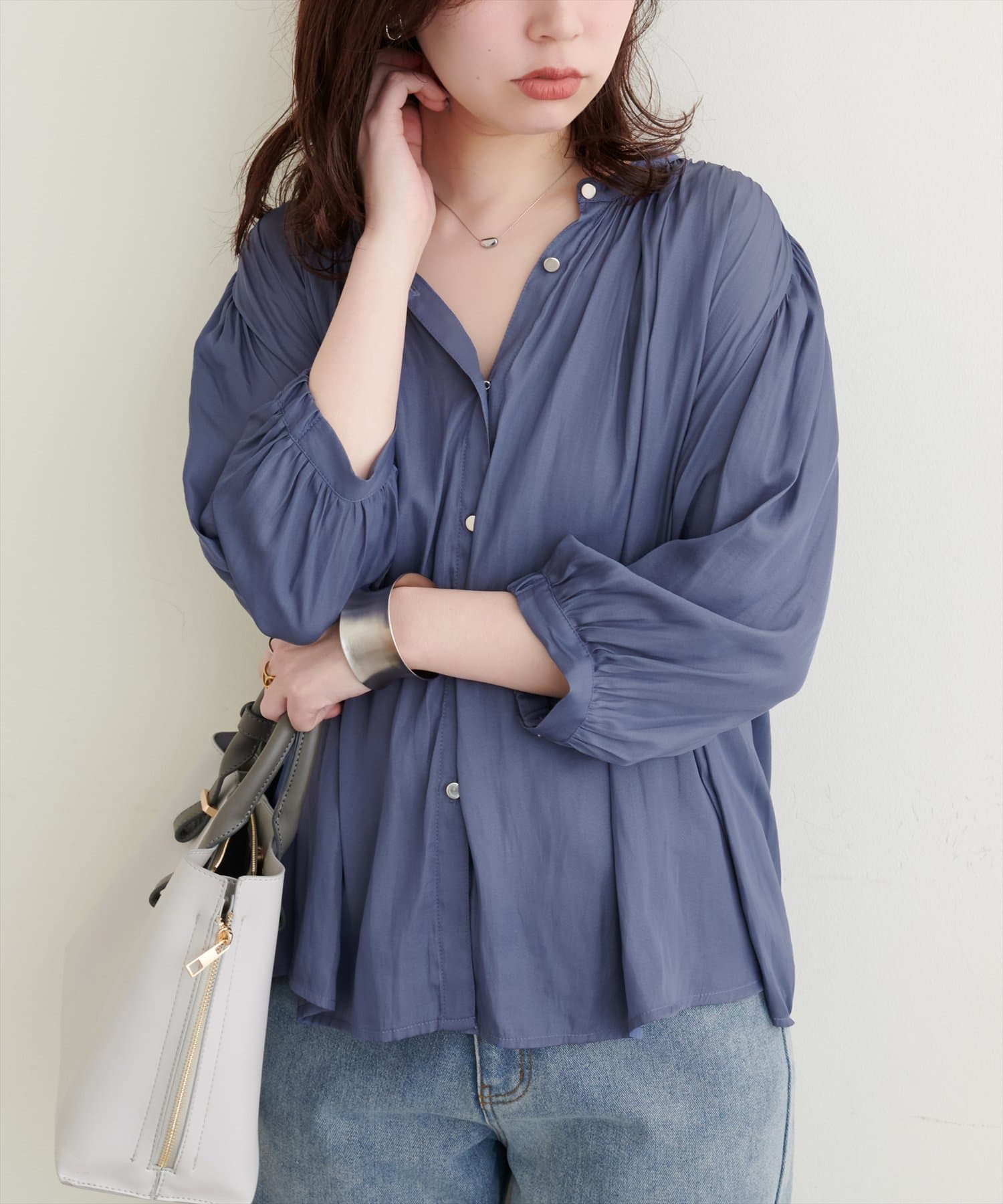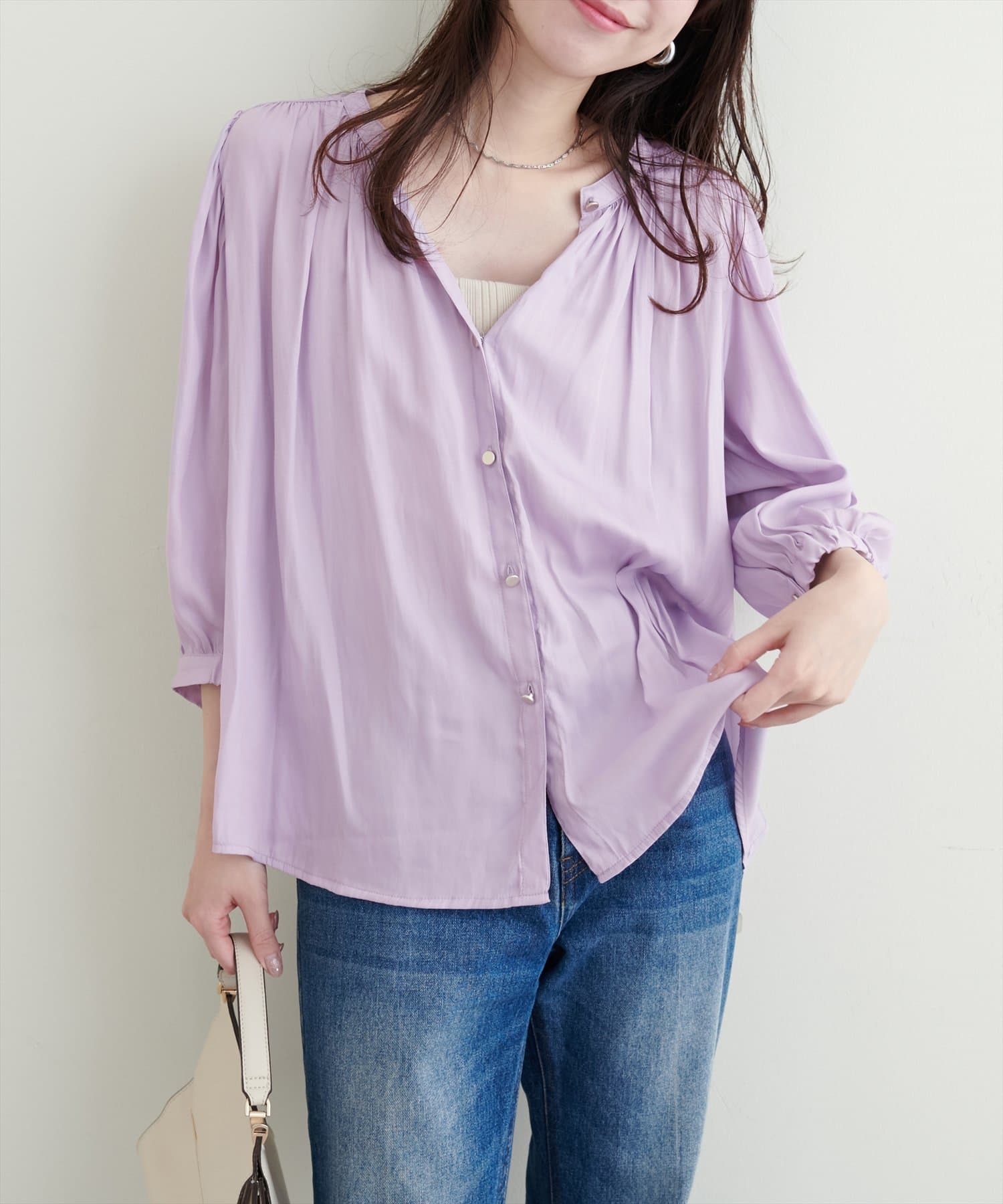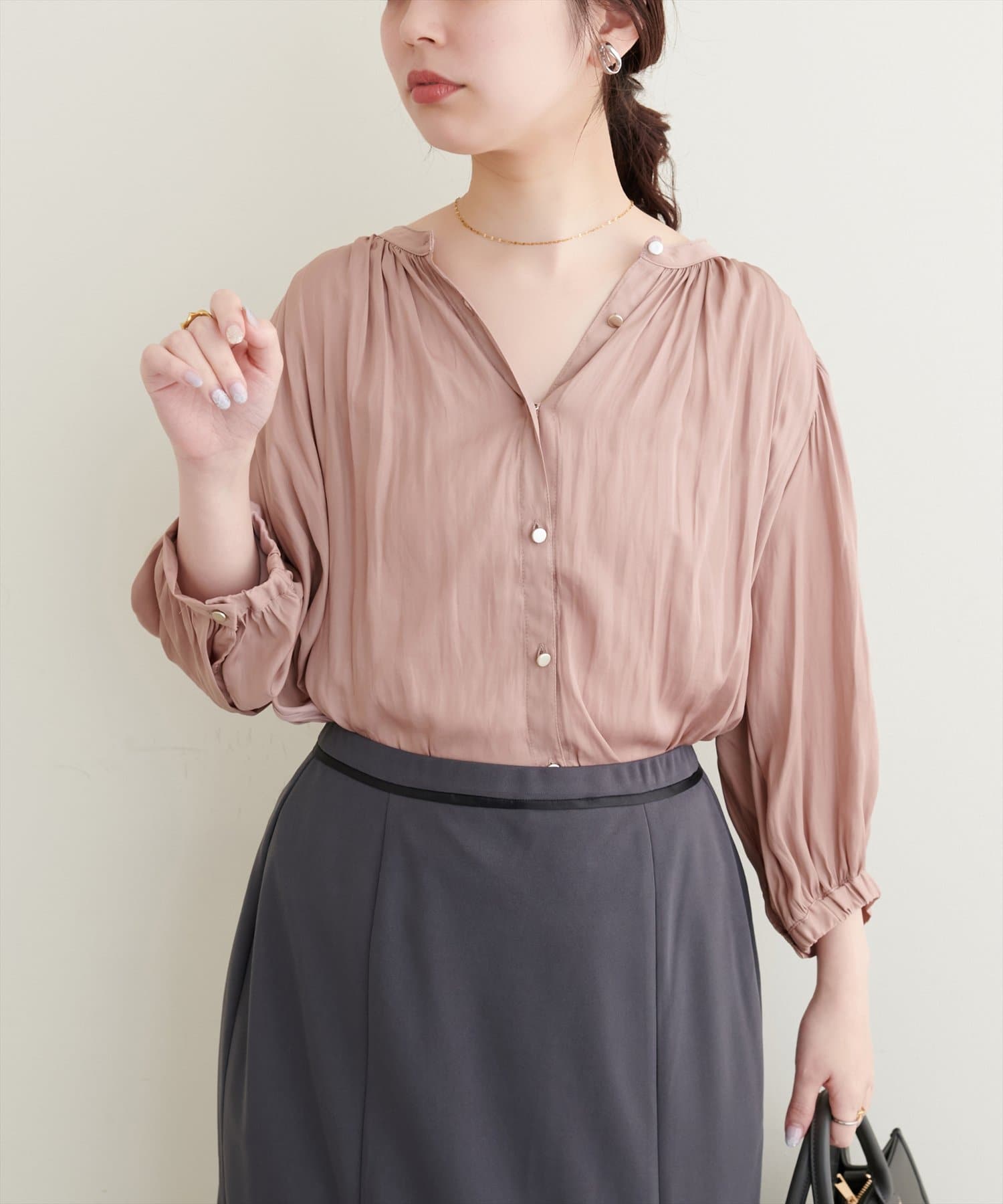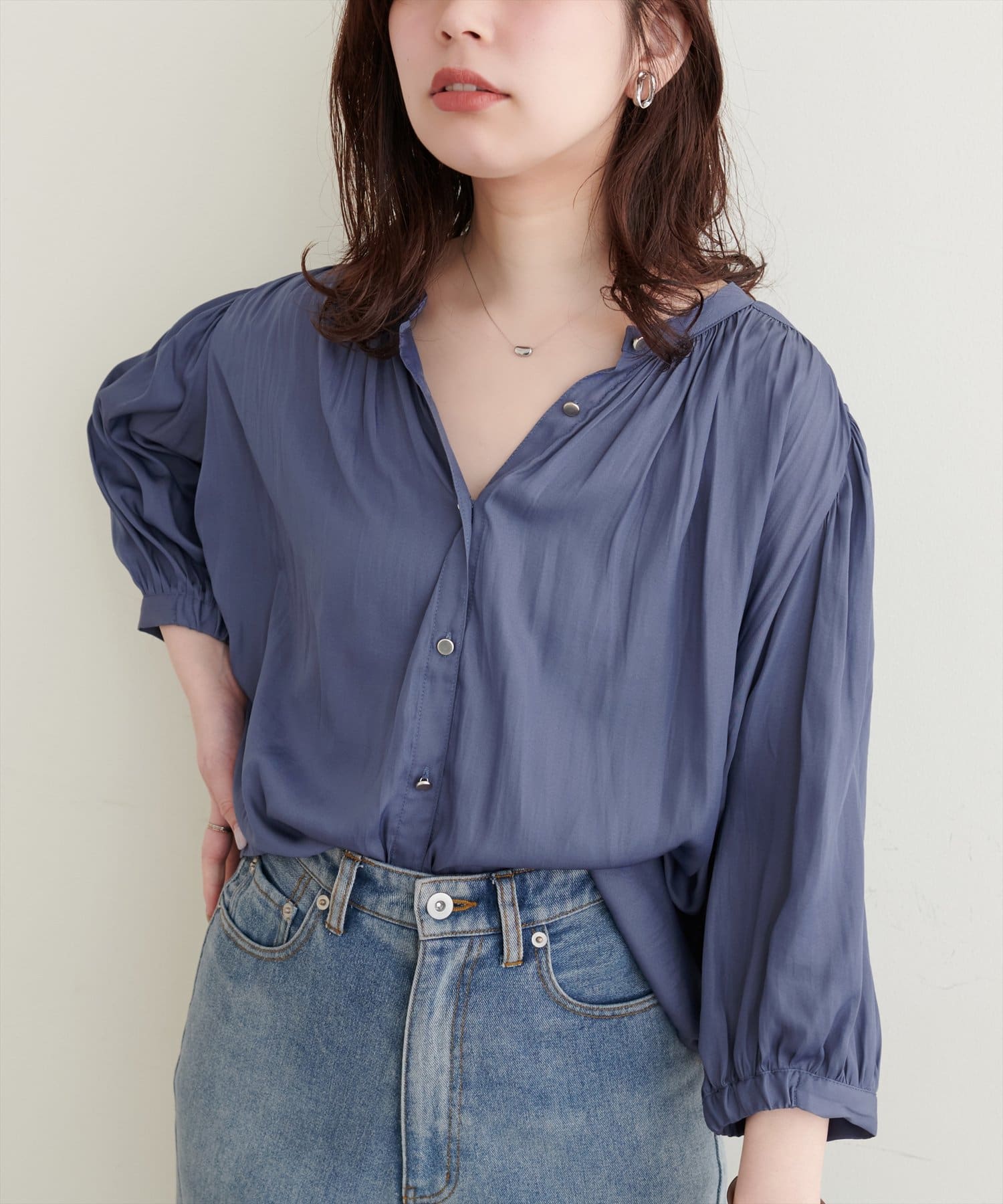 落ち感のあるとろみ素材と、たっぷりと施したギャザーが魅力の7分袖ブラウス。