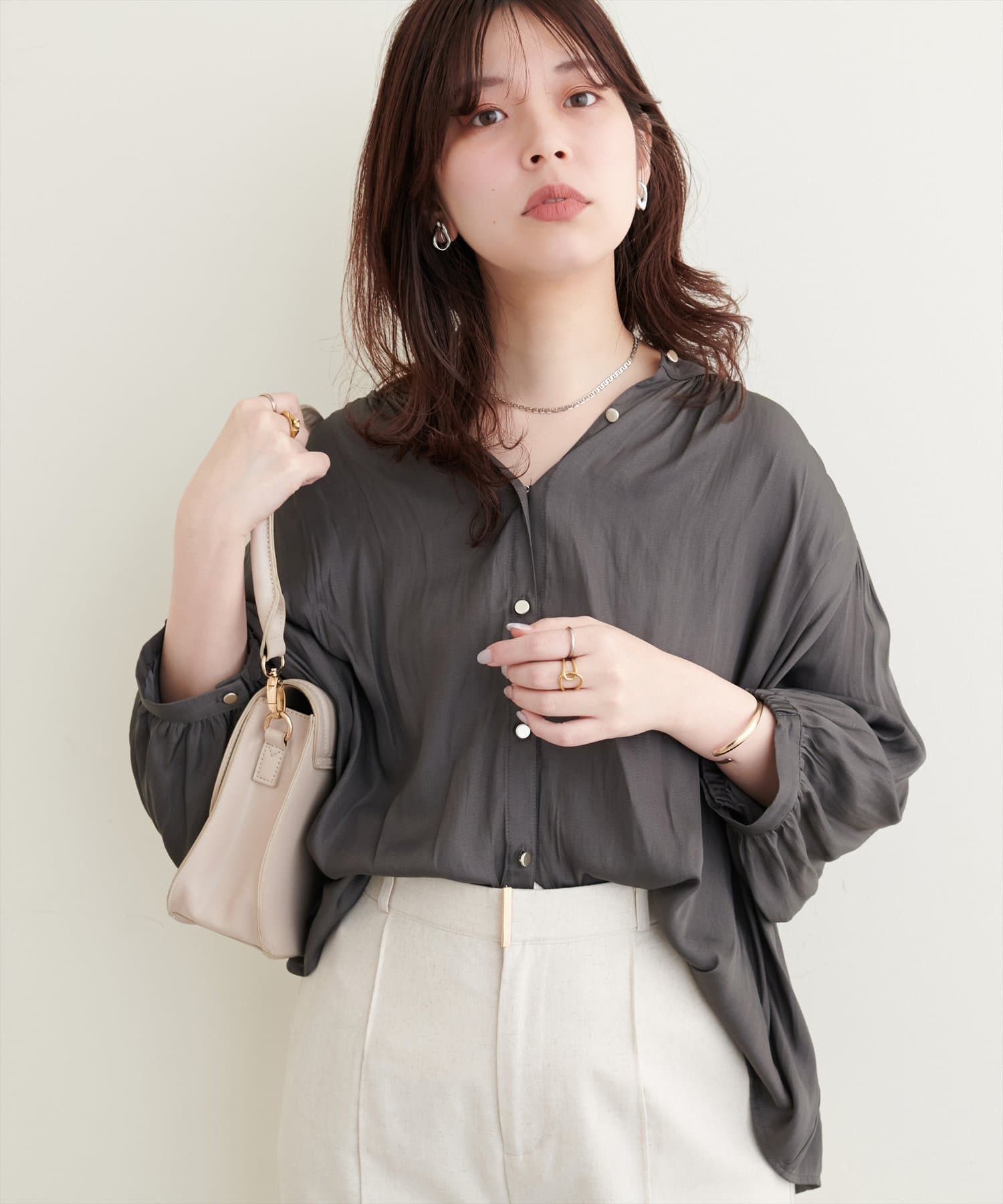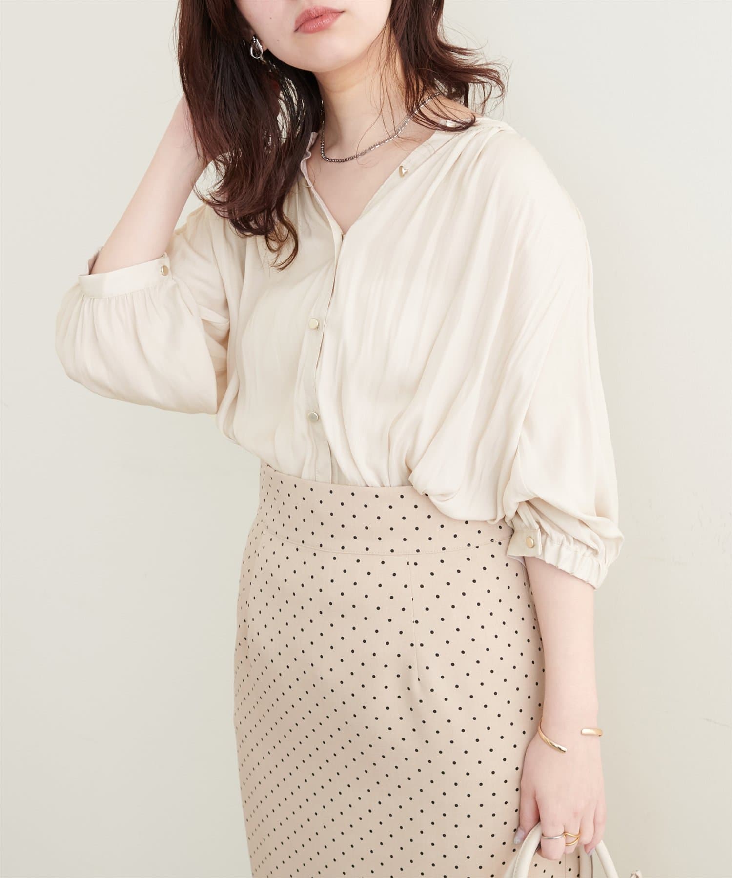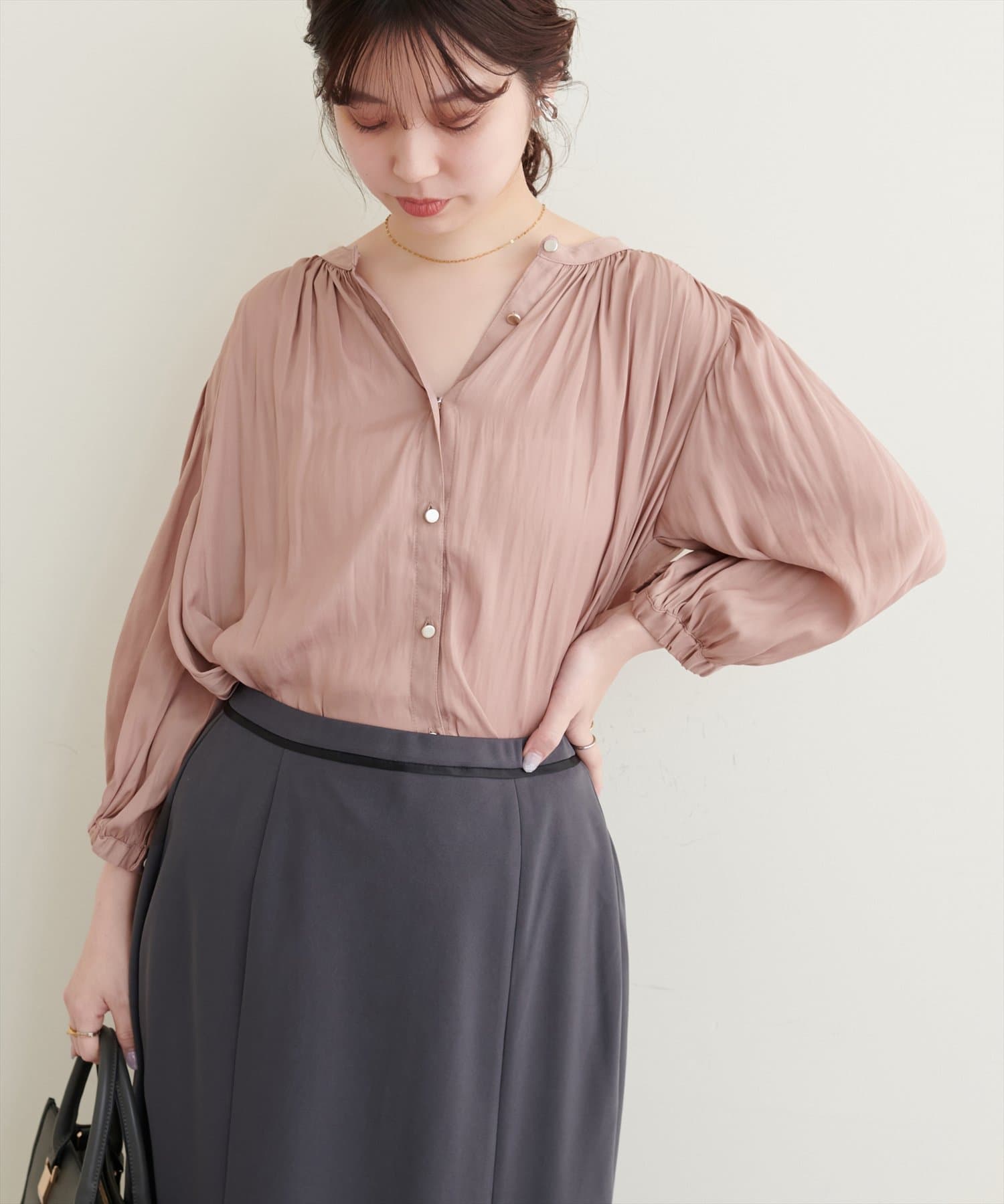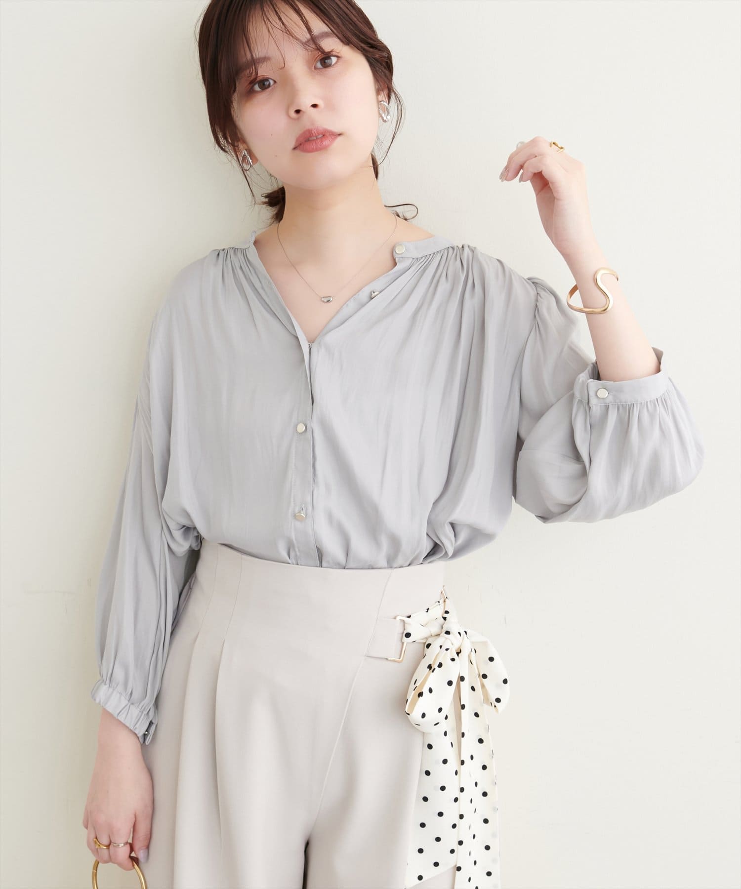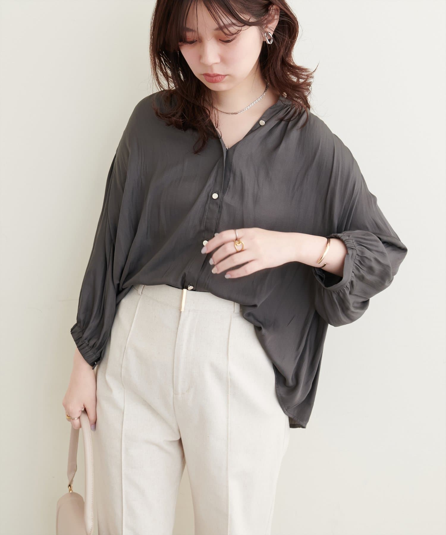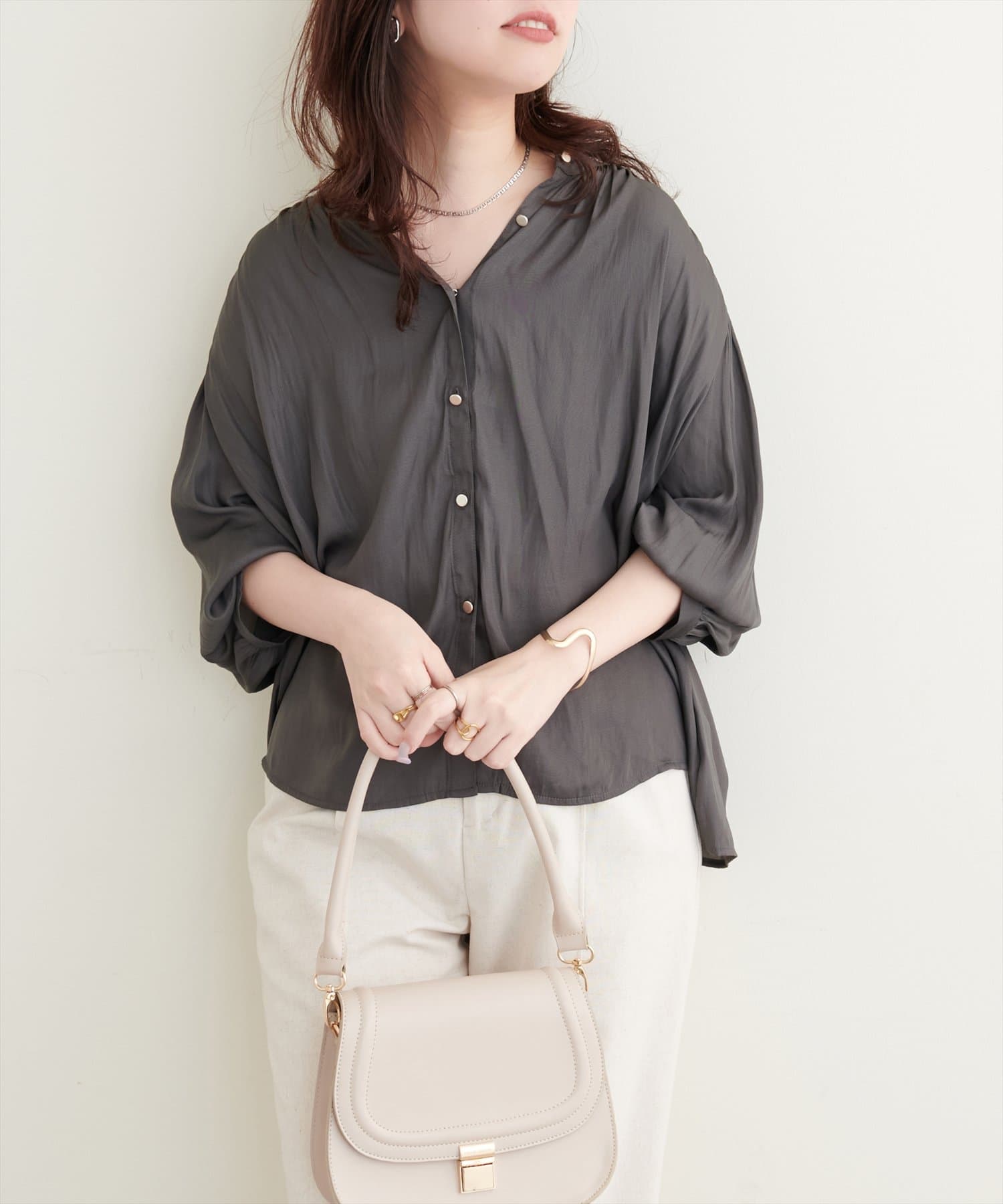 落ち感のあるとろみ素材と、たっぷりと施したギャザーが魅力の7分袖ブラウス。