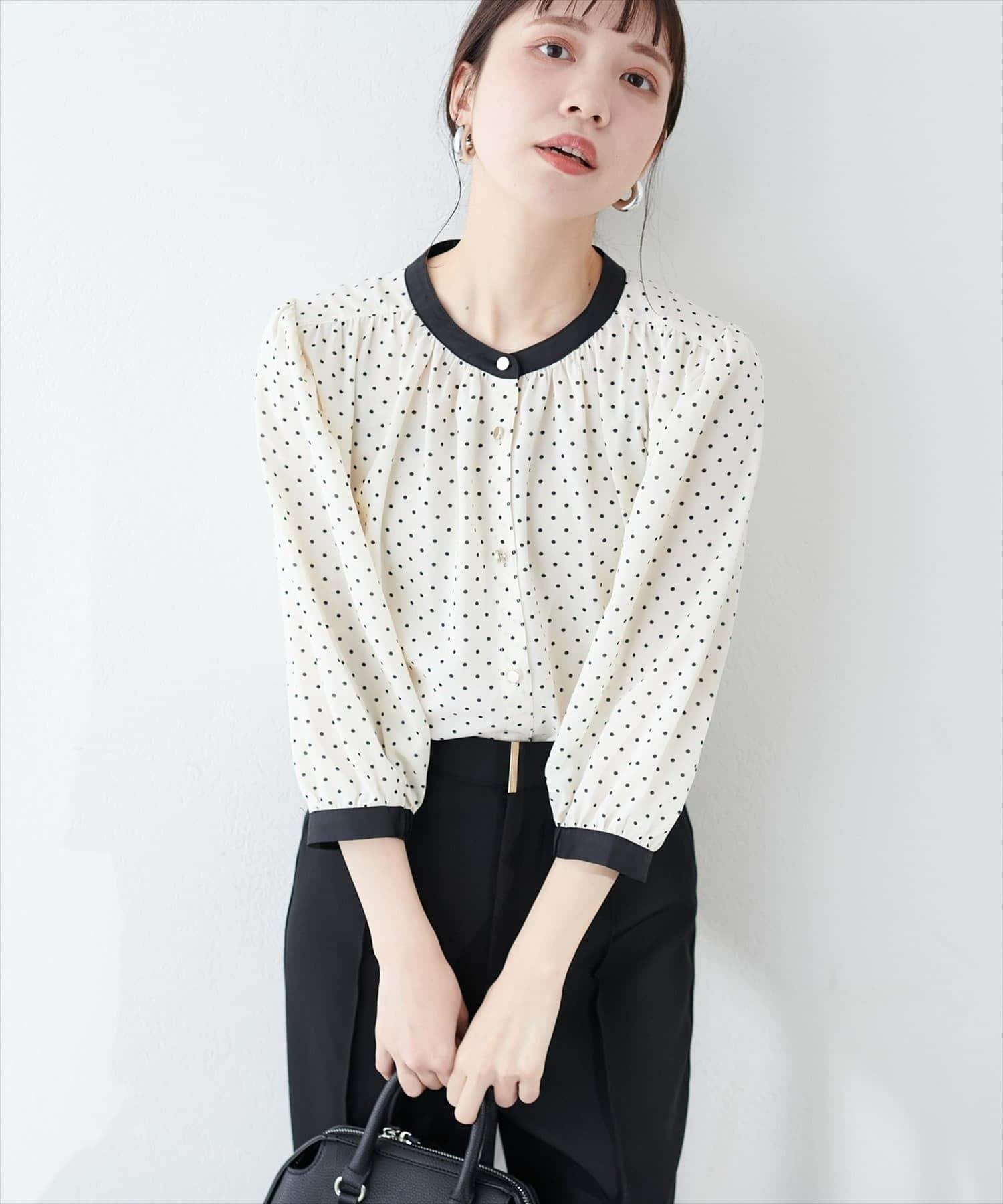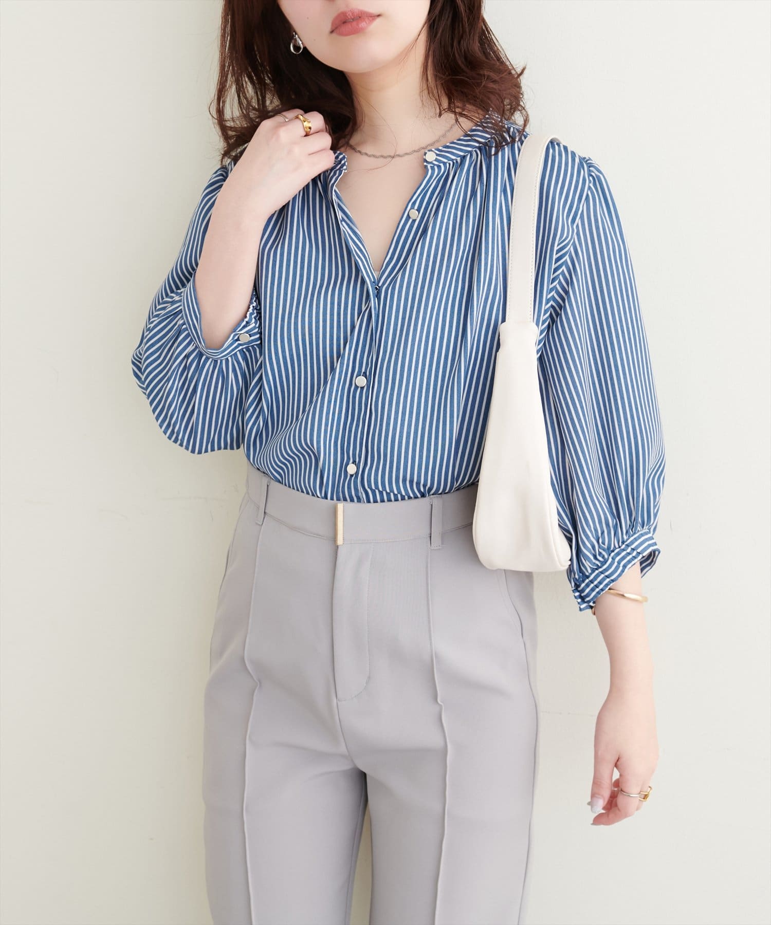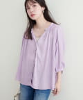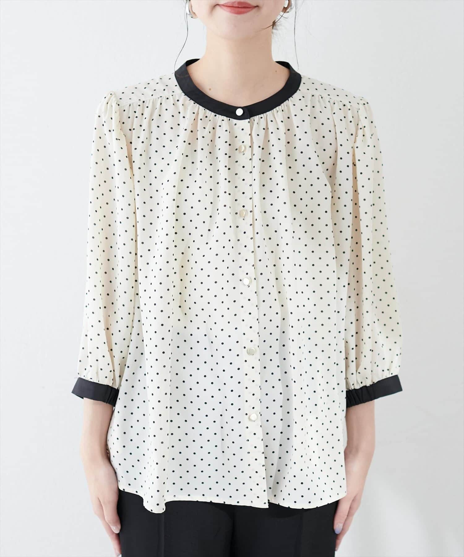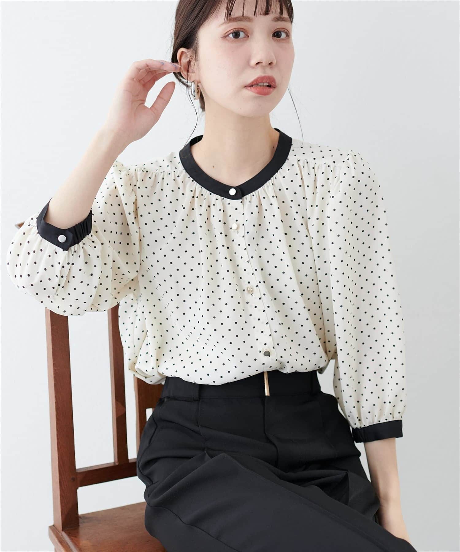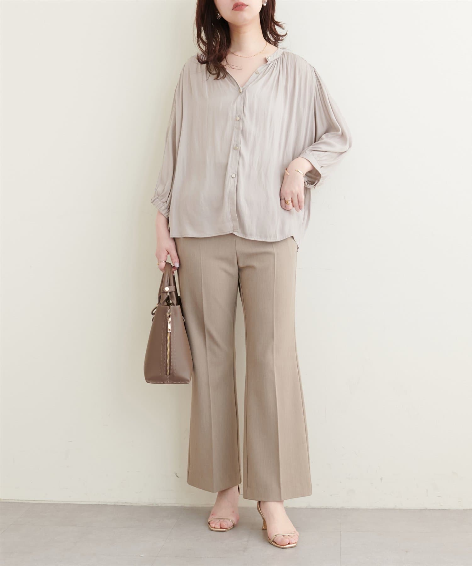 落ち感のあるとろみ素材と、たっぷりと施したギャザーが魅力の7分袖ブラウス。