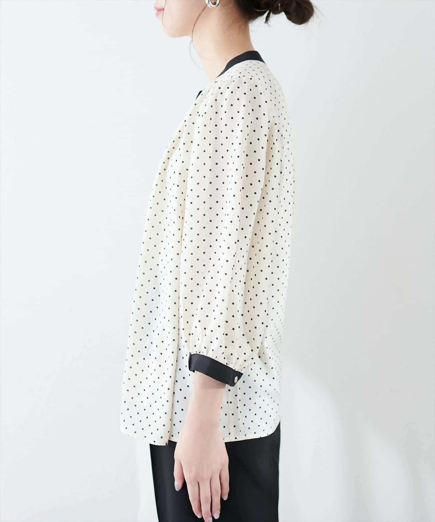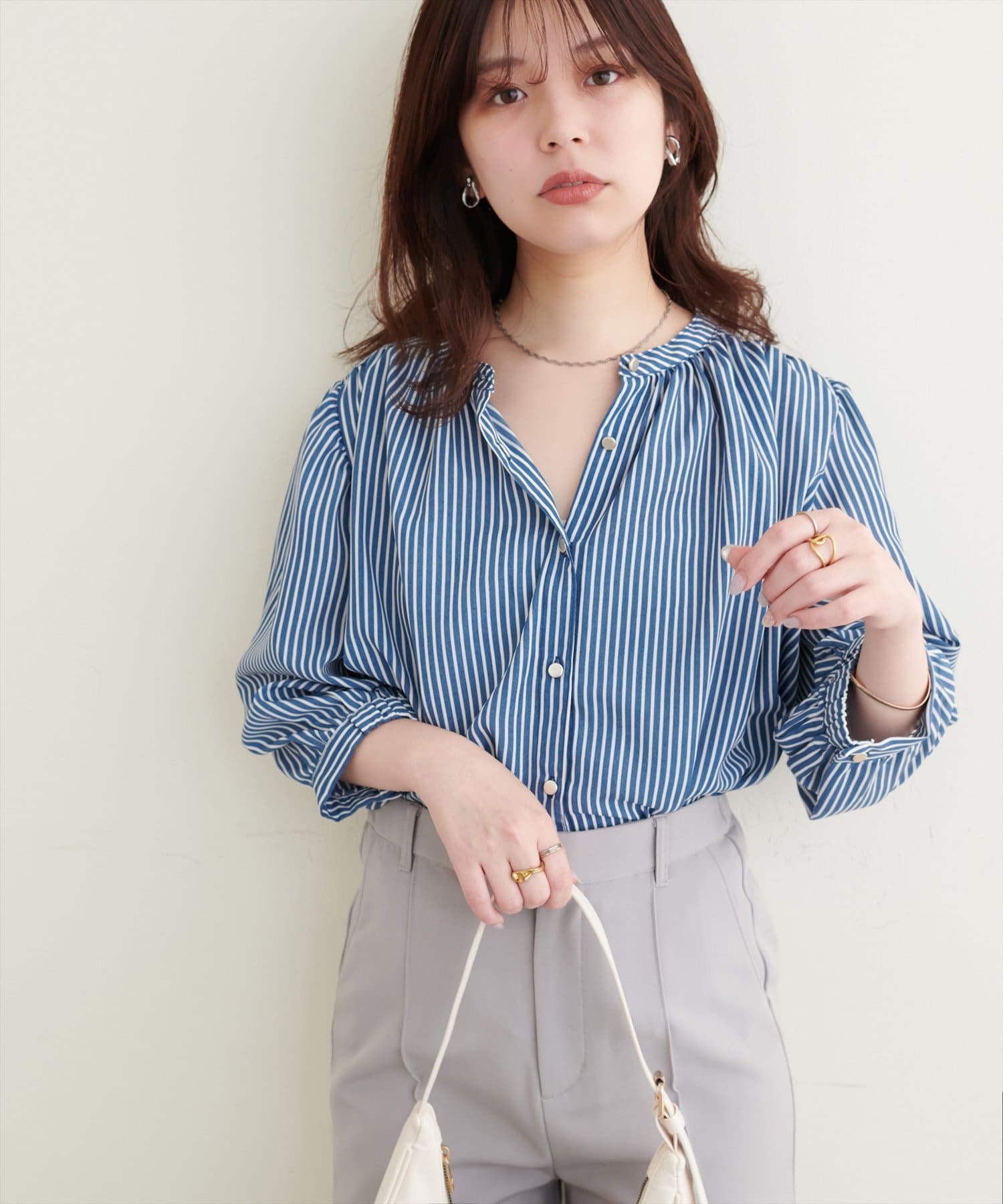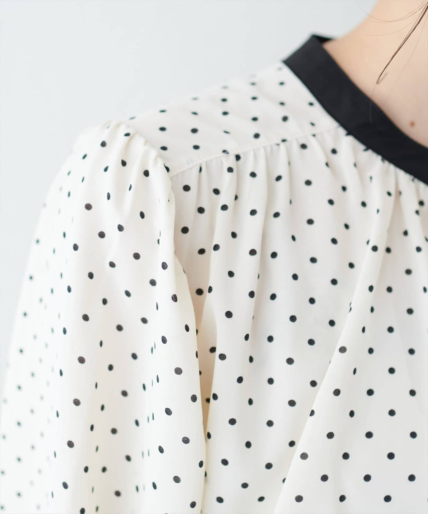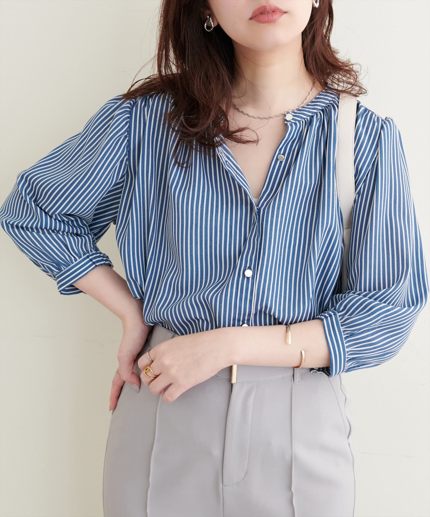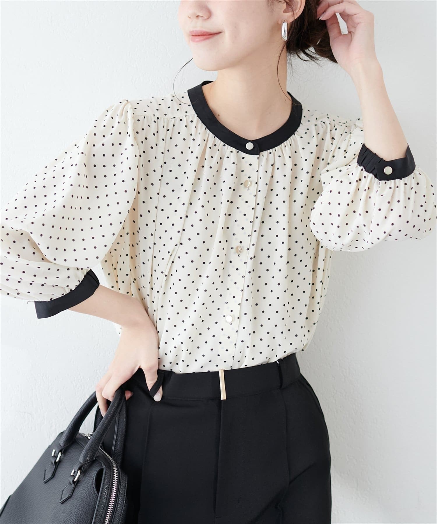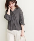 落ち感のあるとろみ素材と、たっぷりと施したギャザーが魅力の7分袖ブラウス。