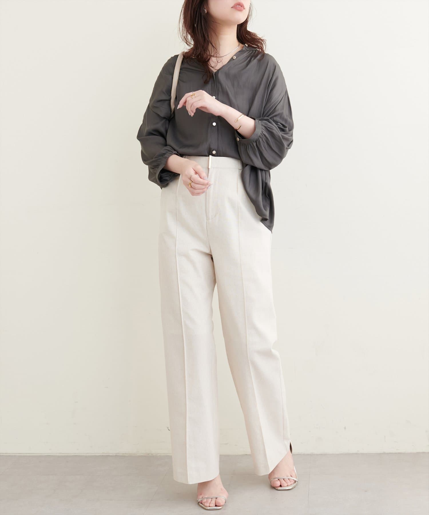 ほんのり光沢感と落ち感のある滑らかな生地が魅力の生地感とさらっとした着心地です。