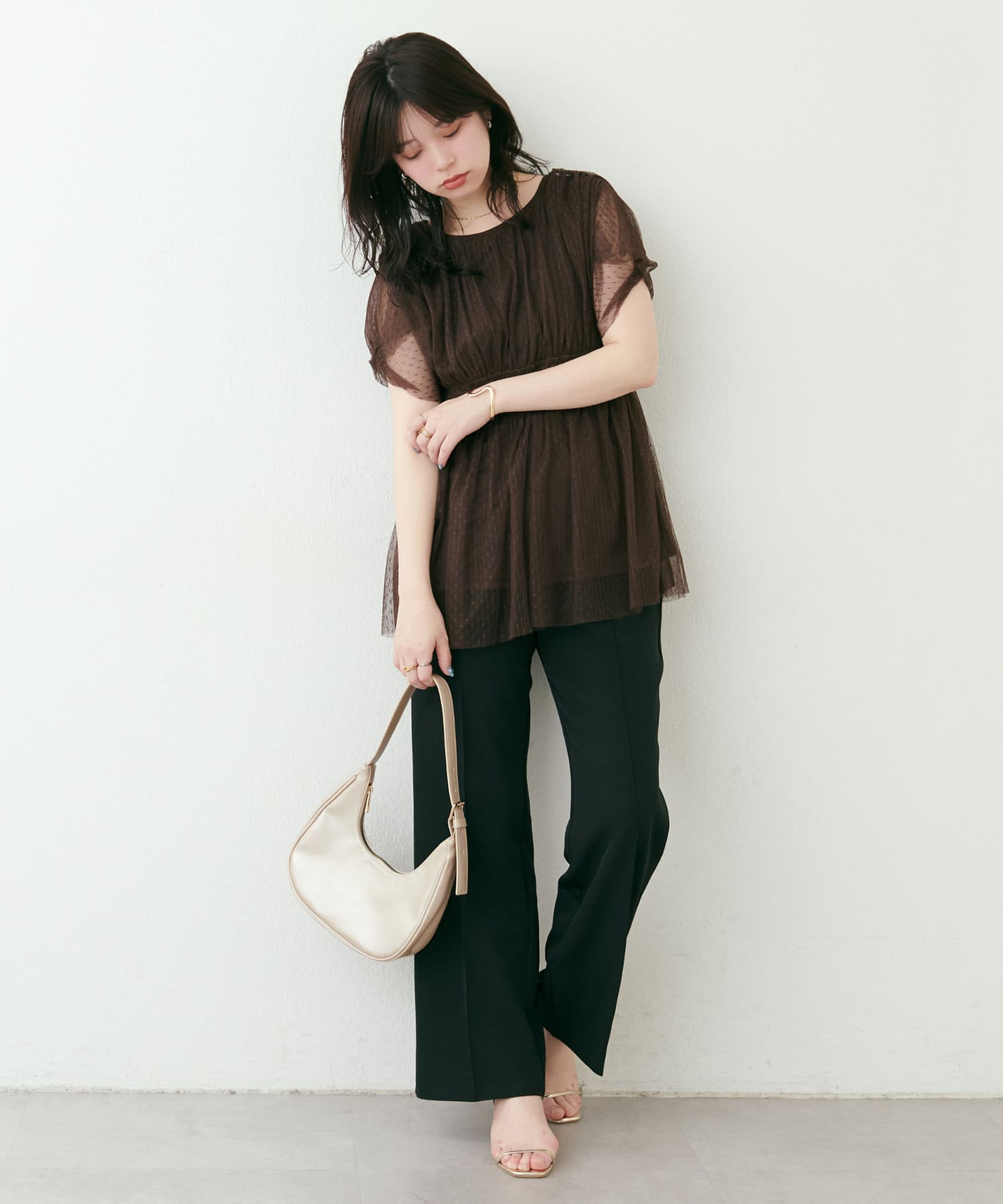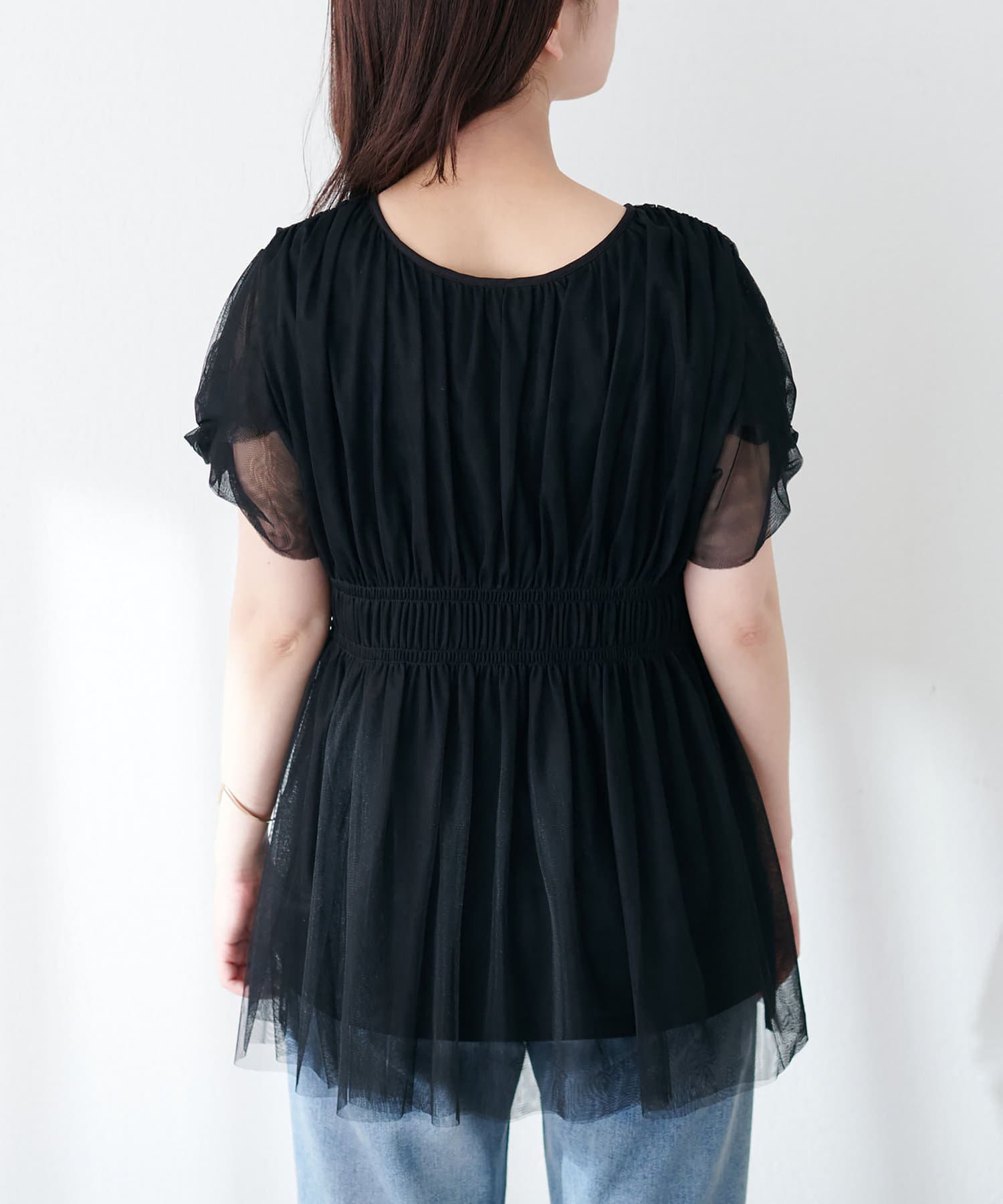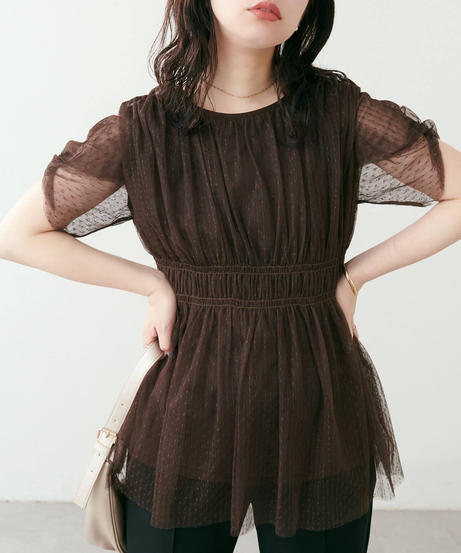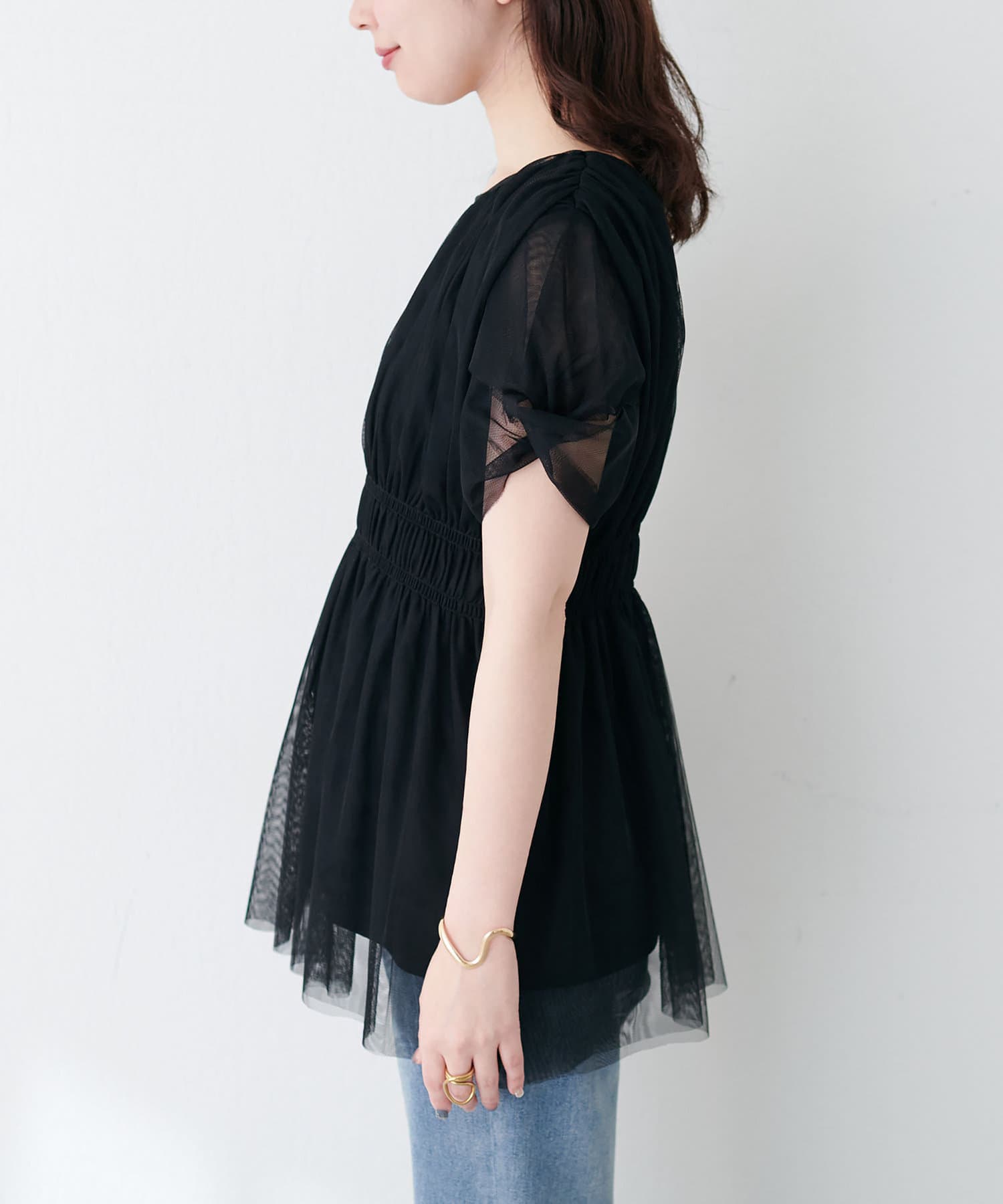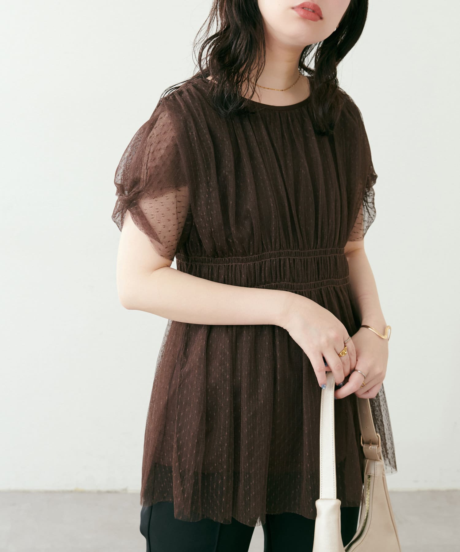 袖はチュールだけを重ねたデザインなので、大人レディな印象に。