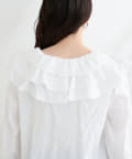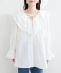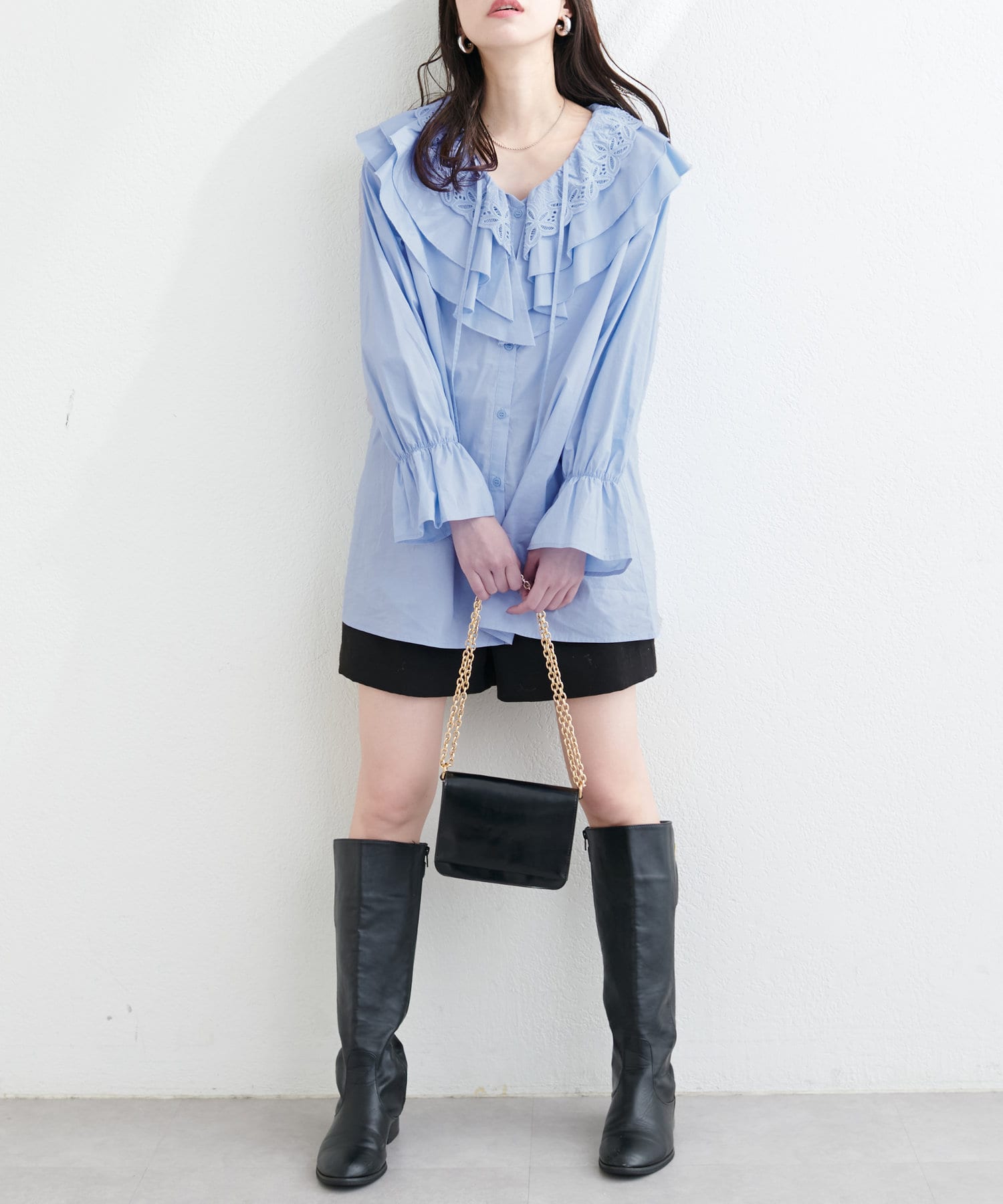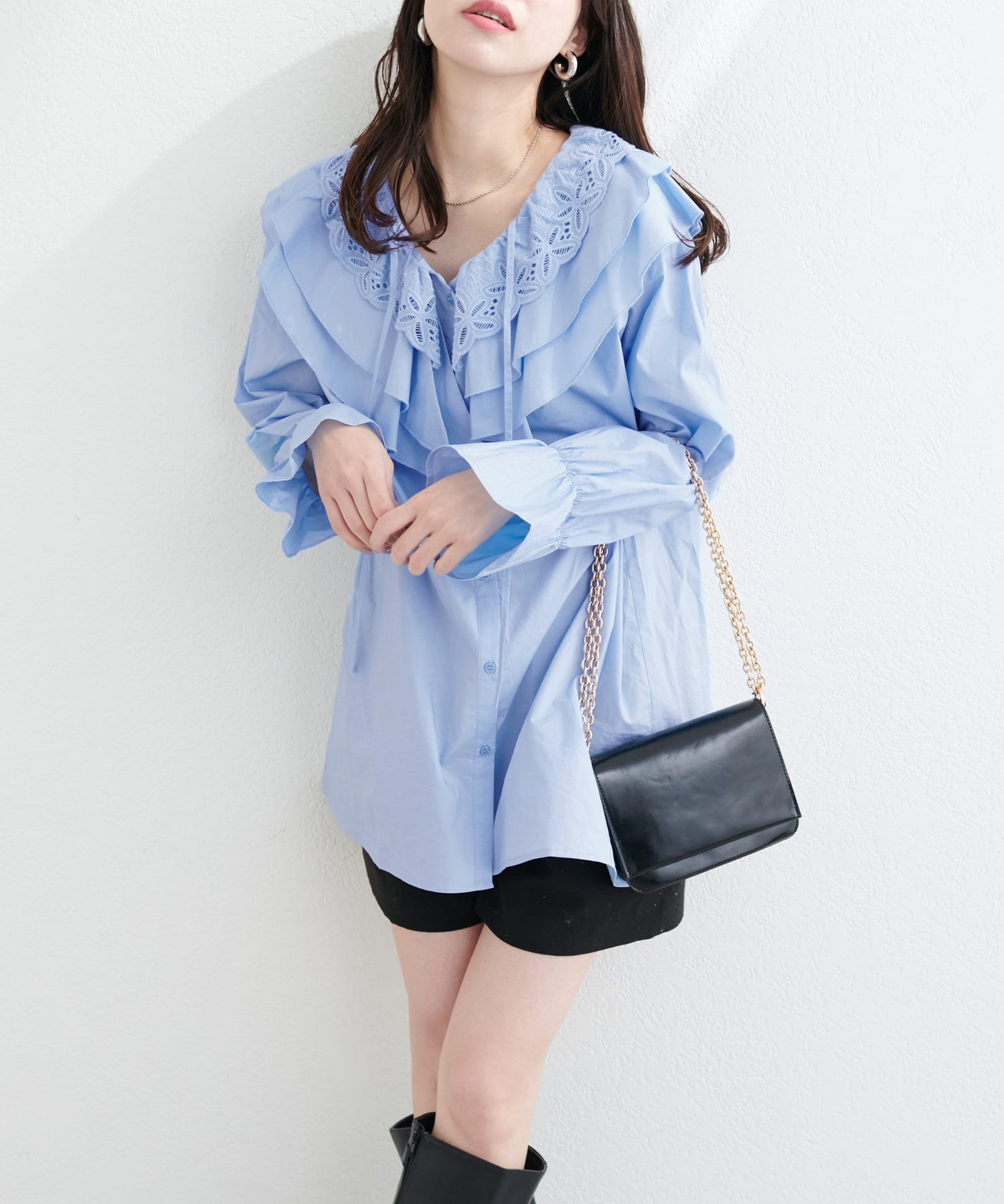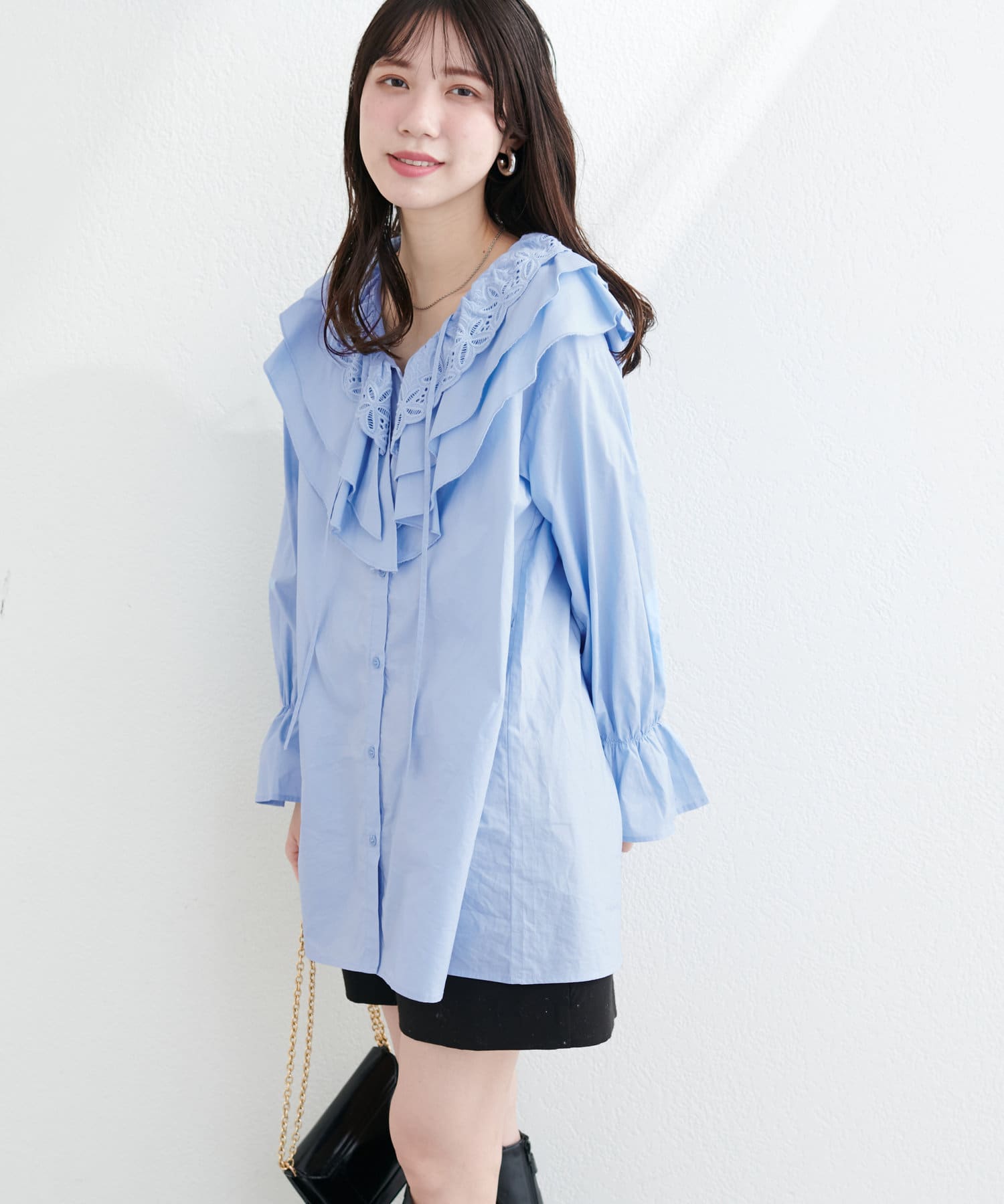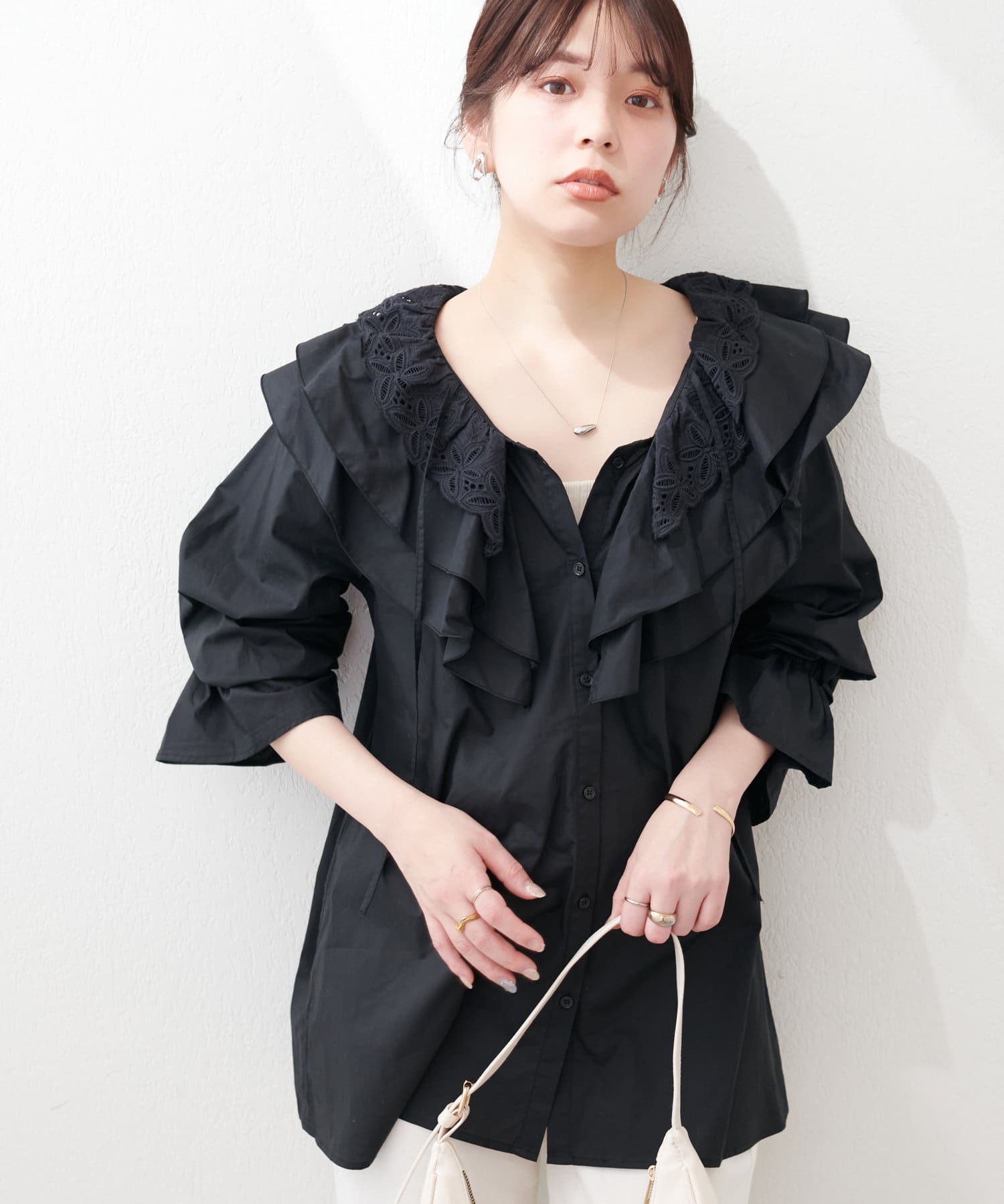 肩まわりを覆った大きなラッフルレースが着映えるチュニックブラウス。