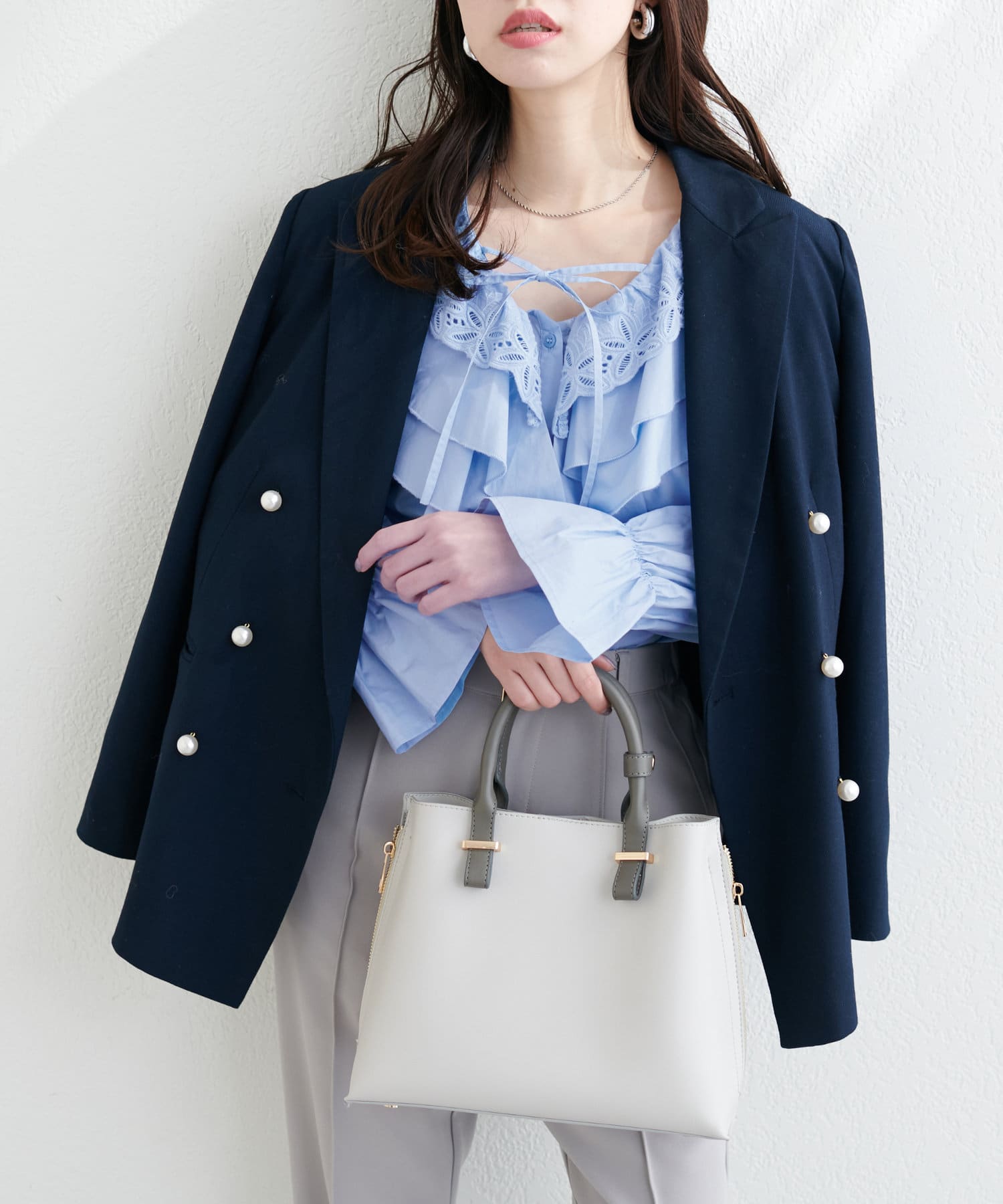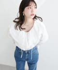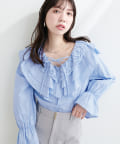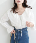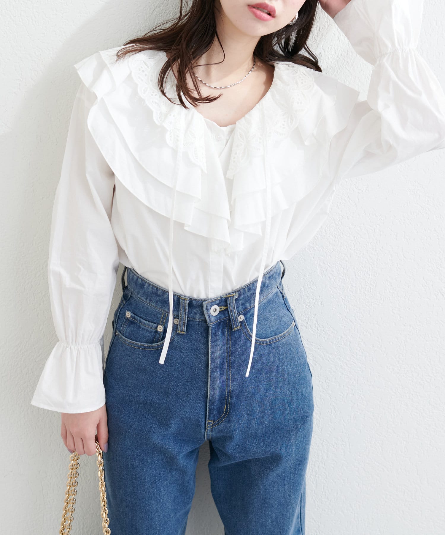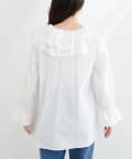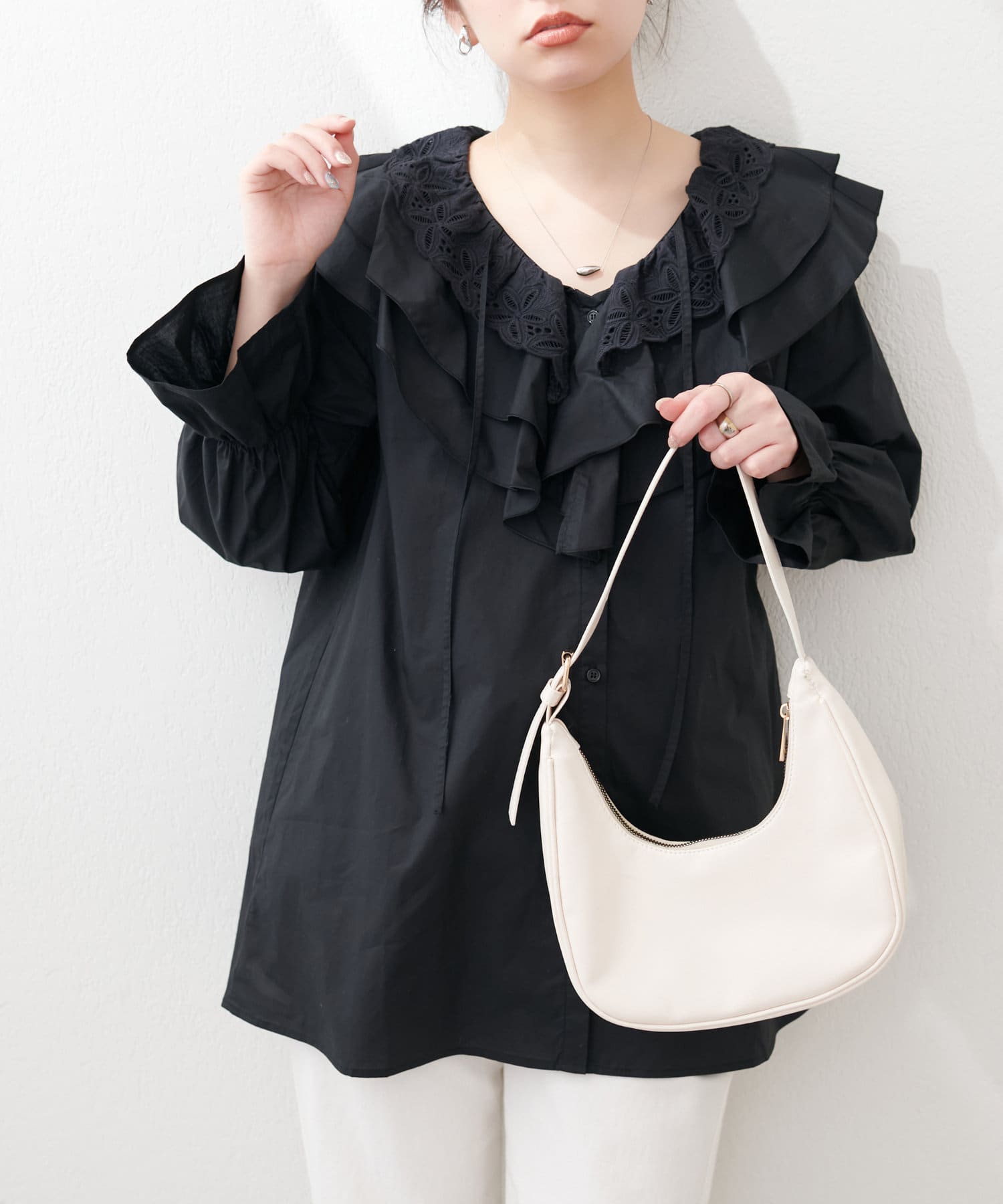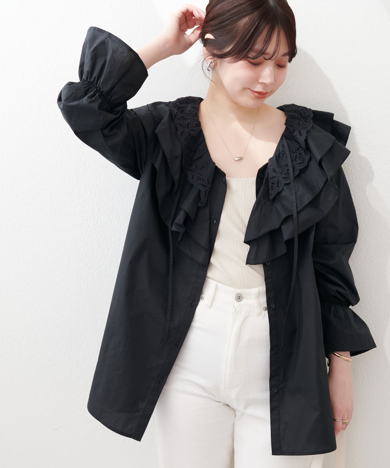 肩まわりを覆った大きなラッフルレースが着映えるチュニックブラウス。