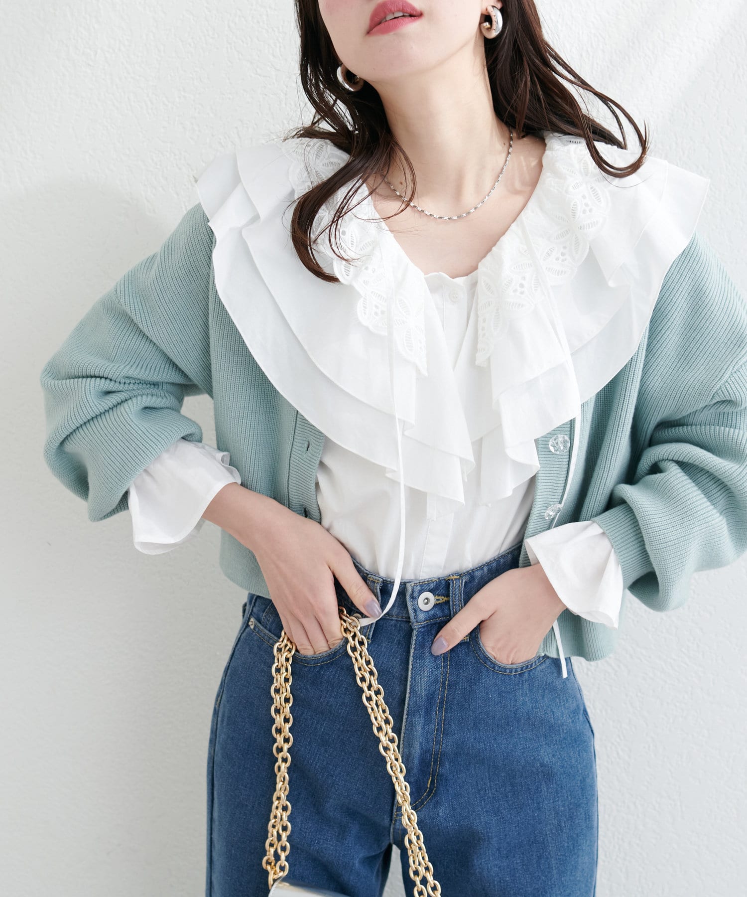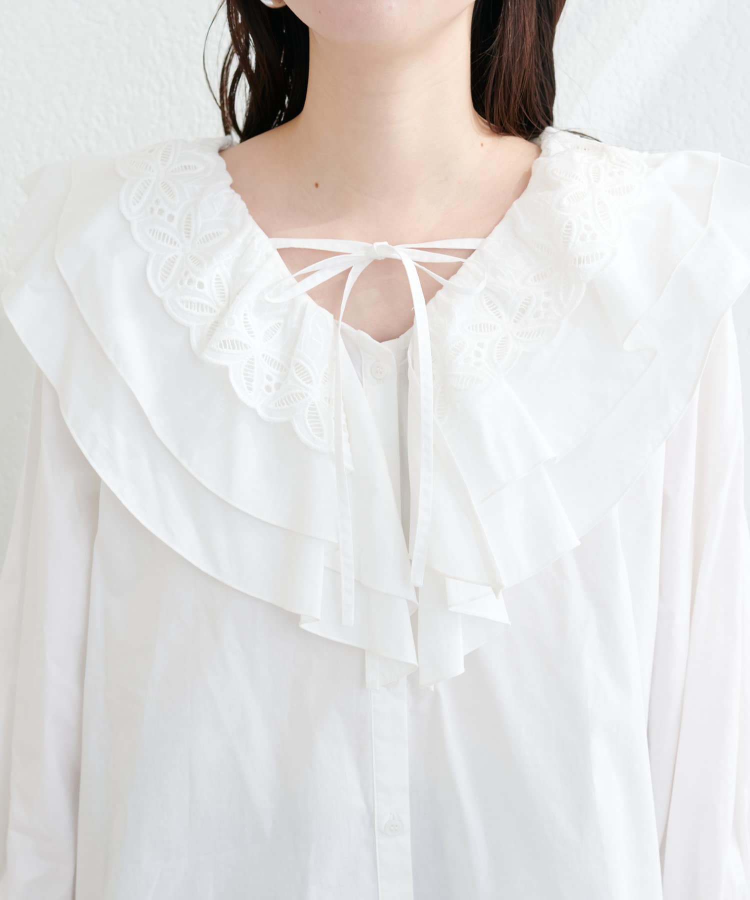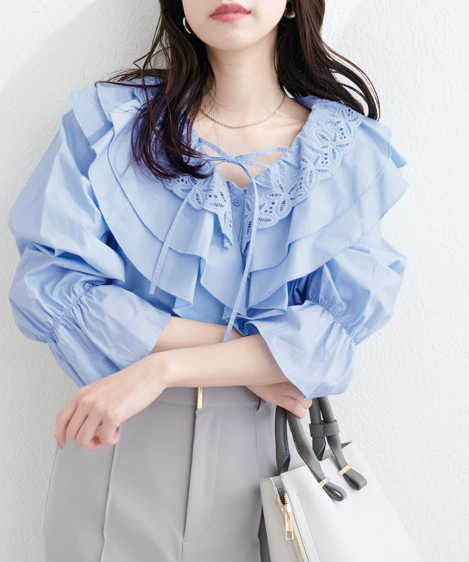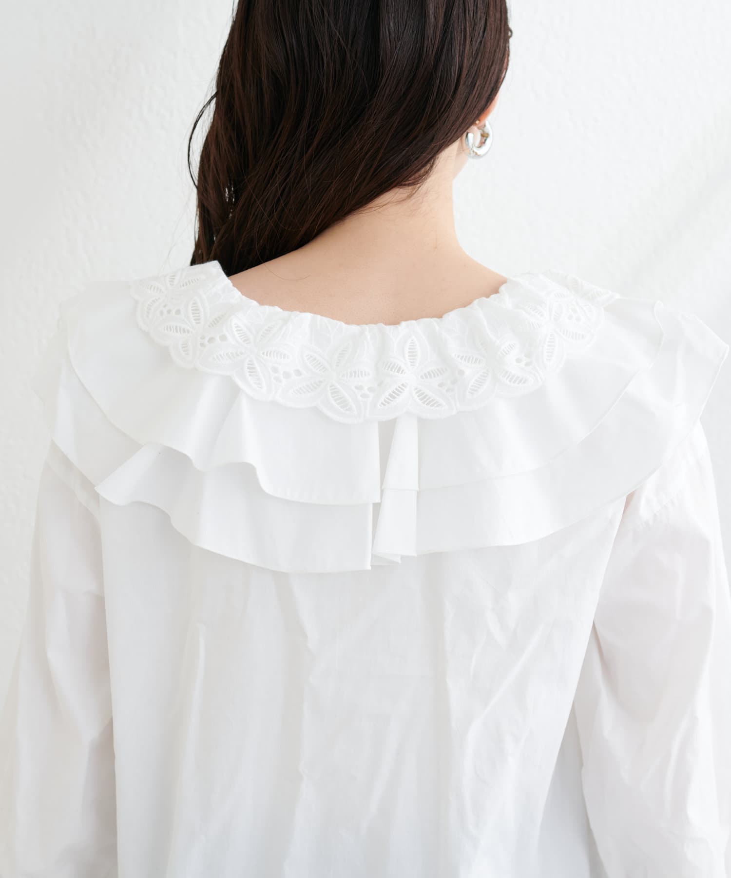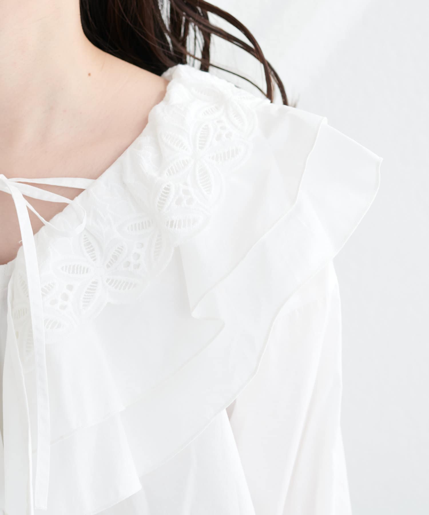 ふんわりと揺れる衿元のラッフルレースカラーが華やかな1枚