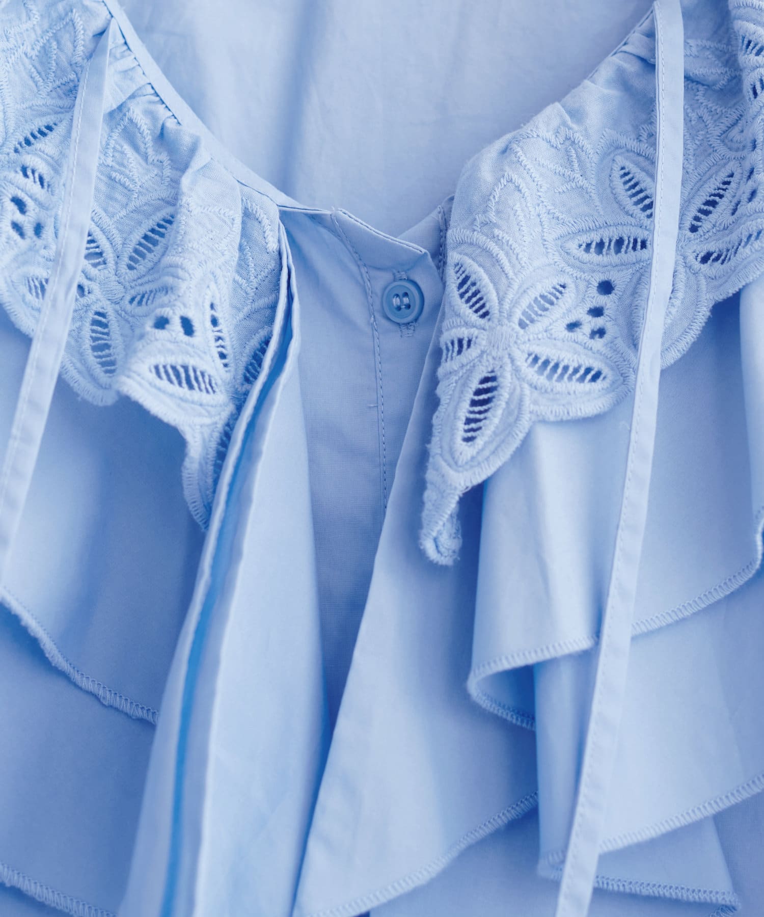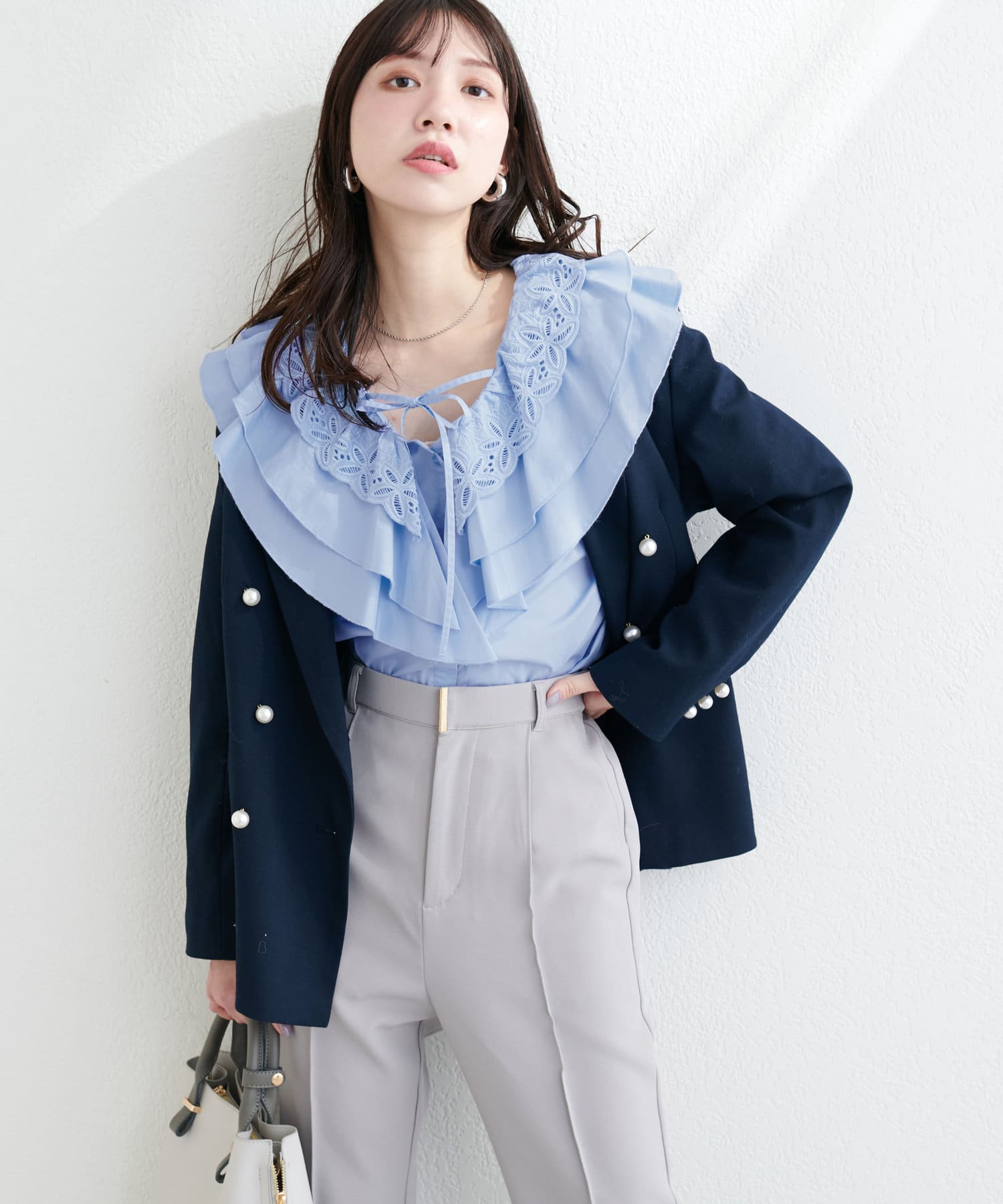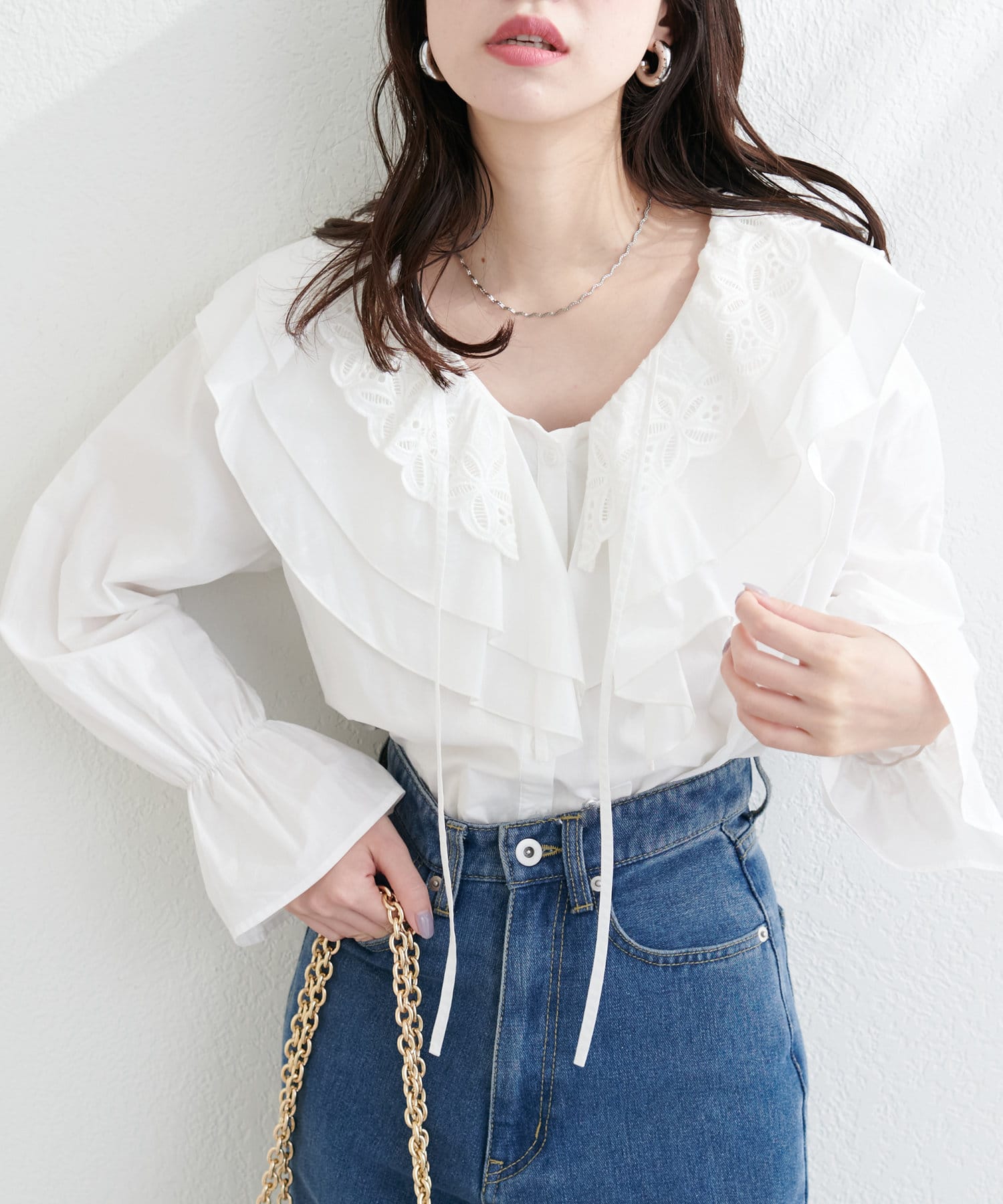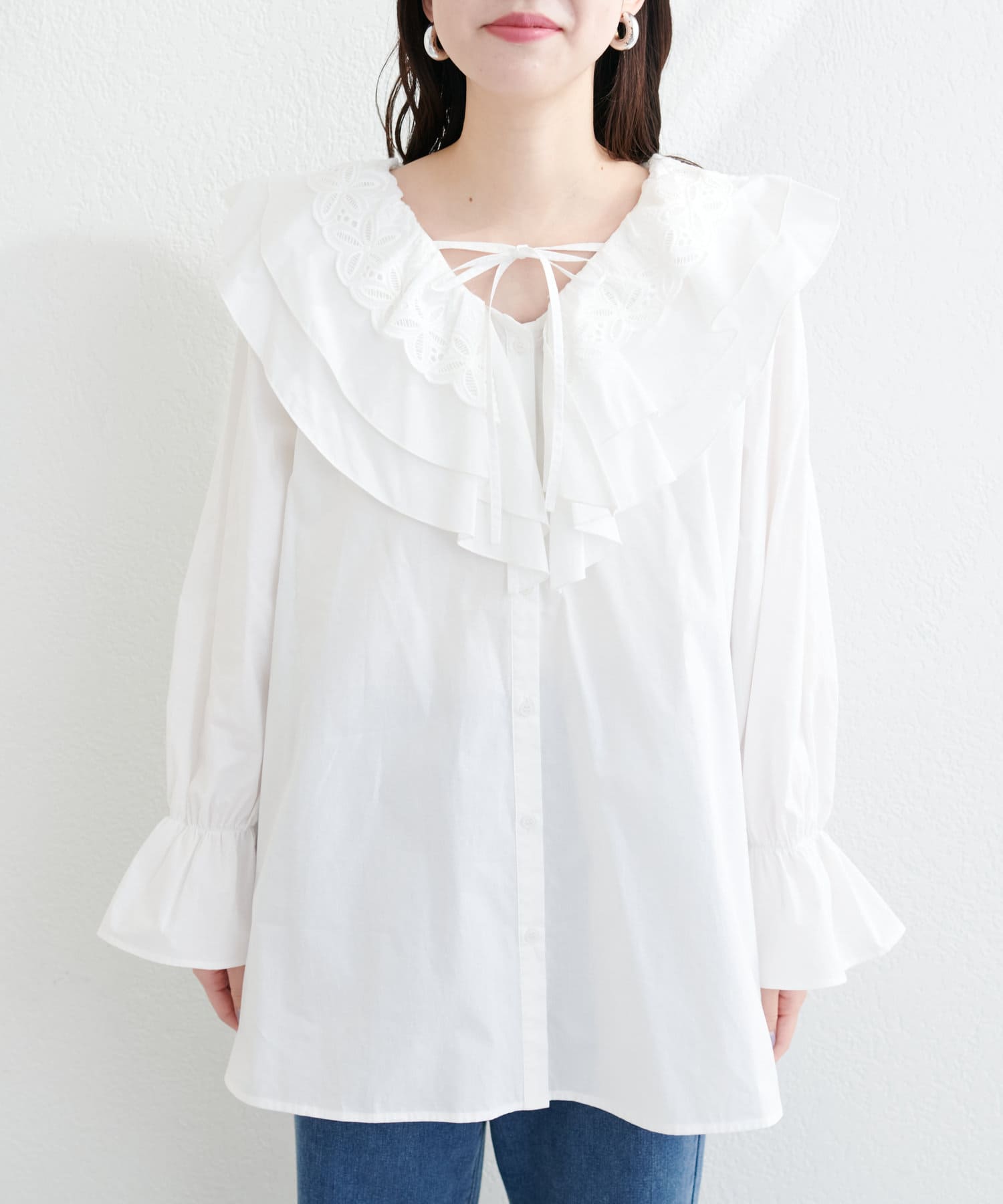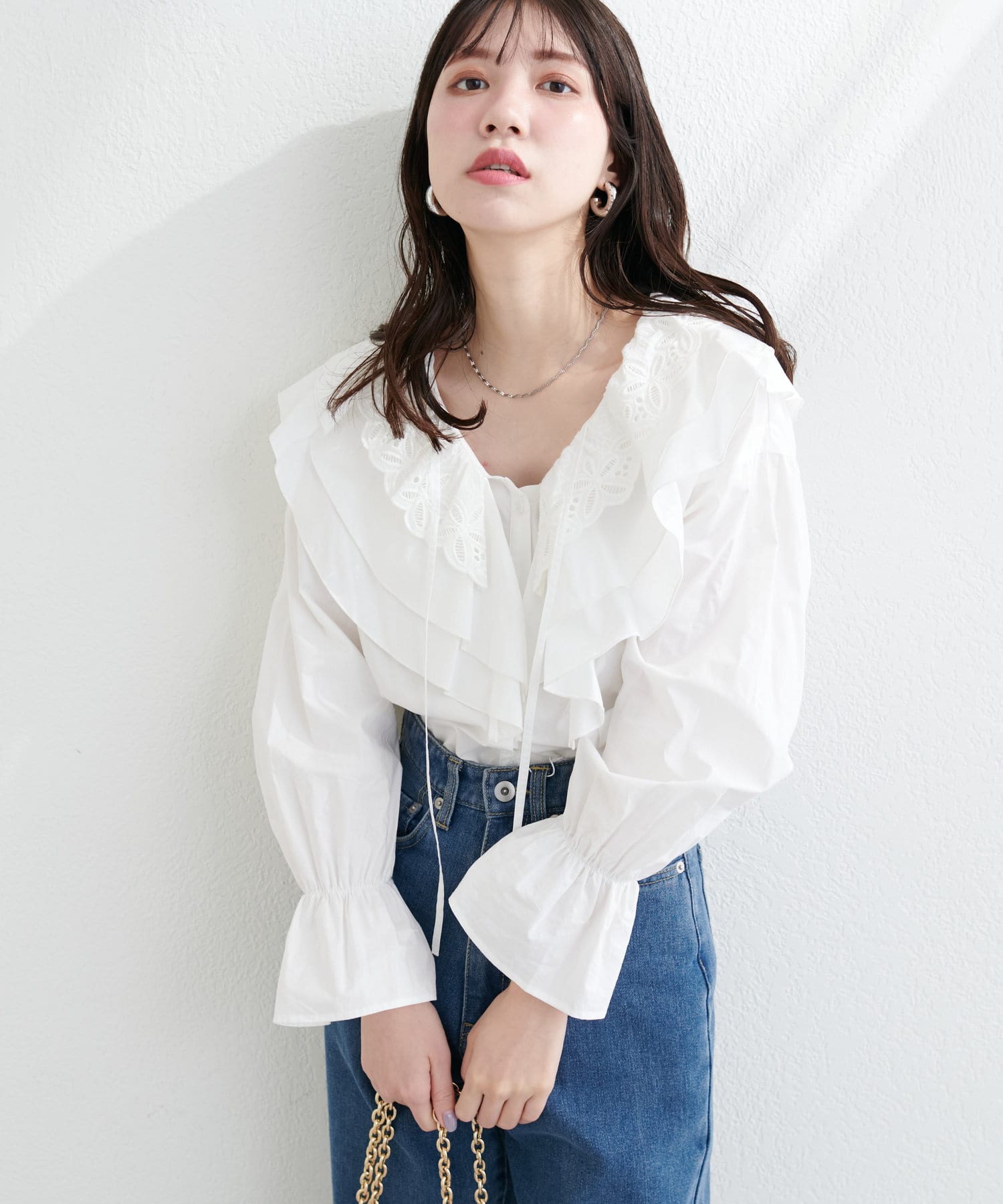ふんわりと揺れる衿元のラッフルレースカラーが華やかな1枚