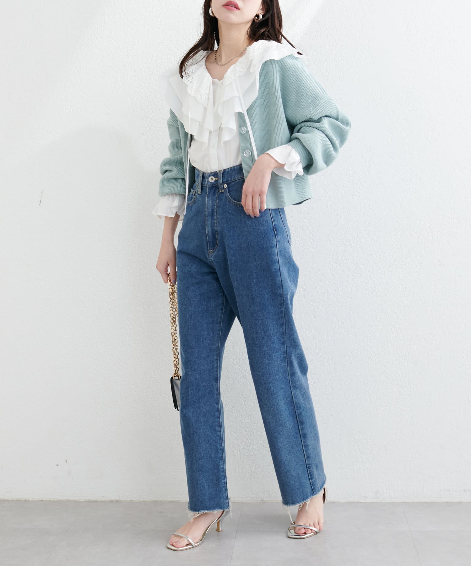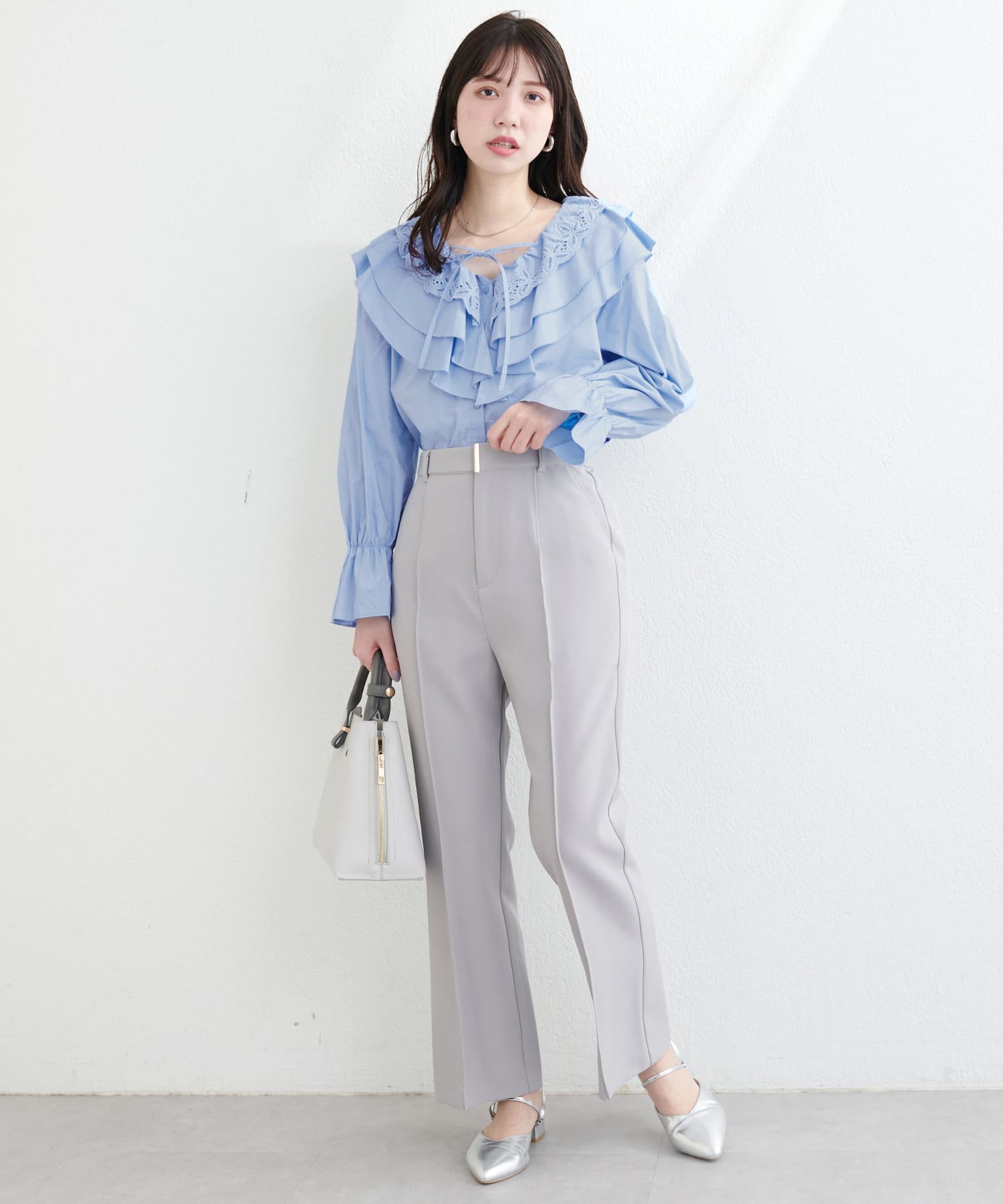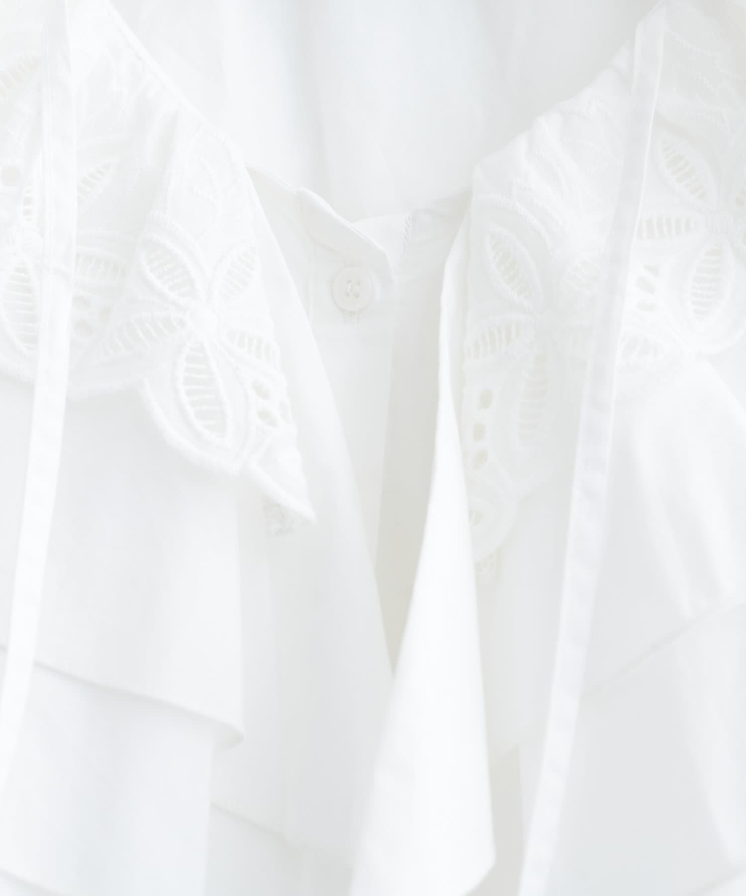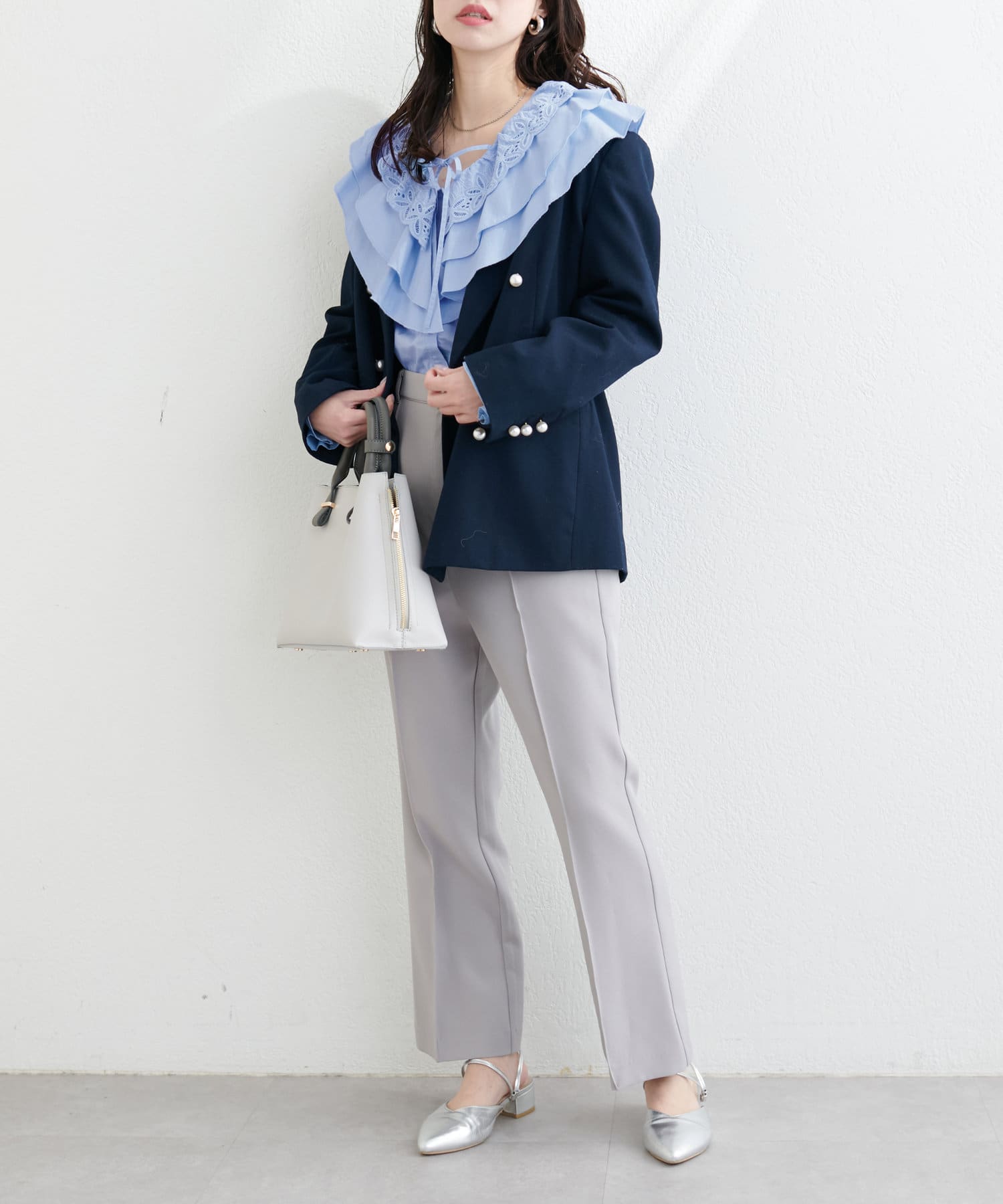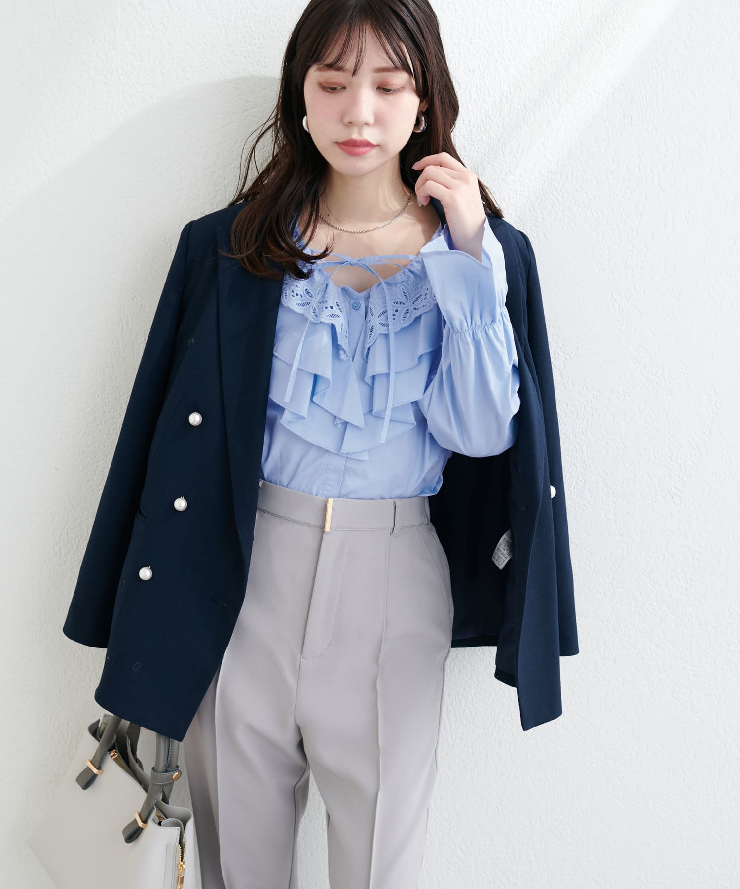 ふんわりと揺れる衿元のラッフルレースカラーが華やかな1枚