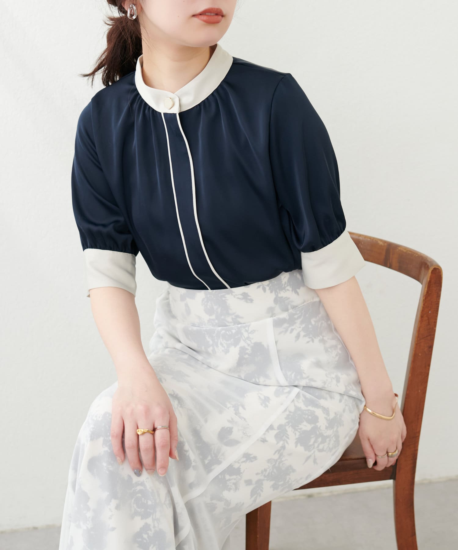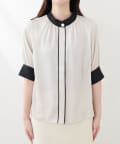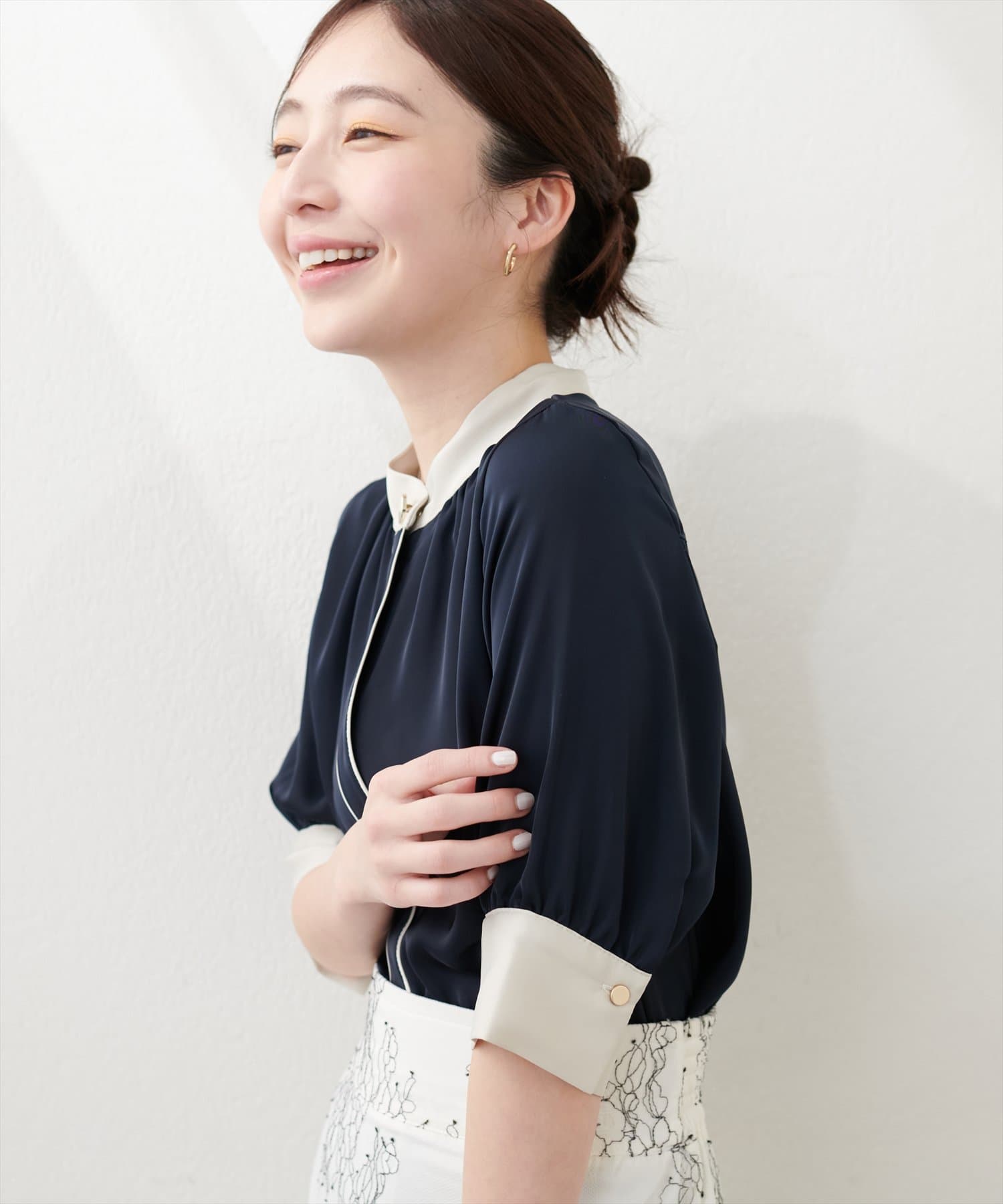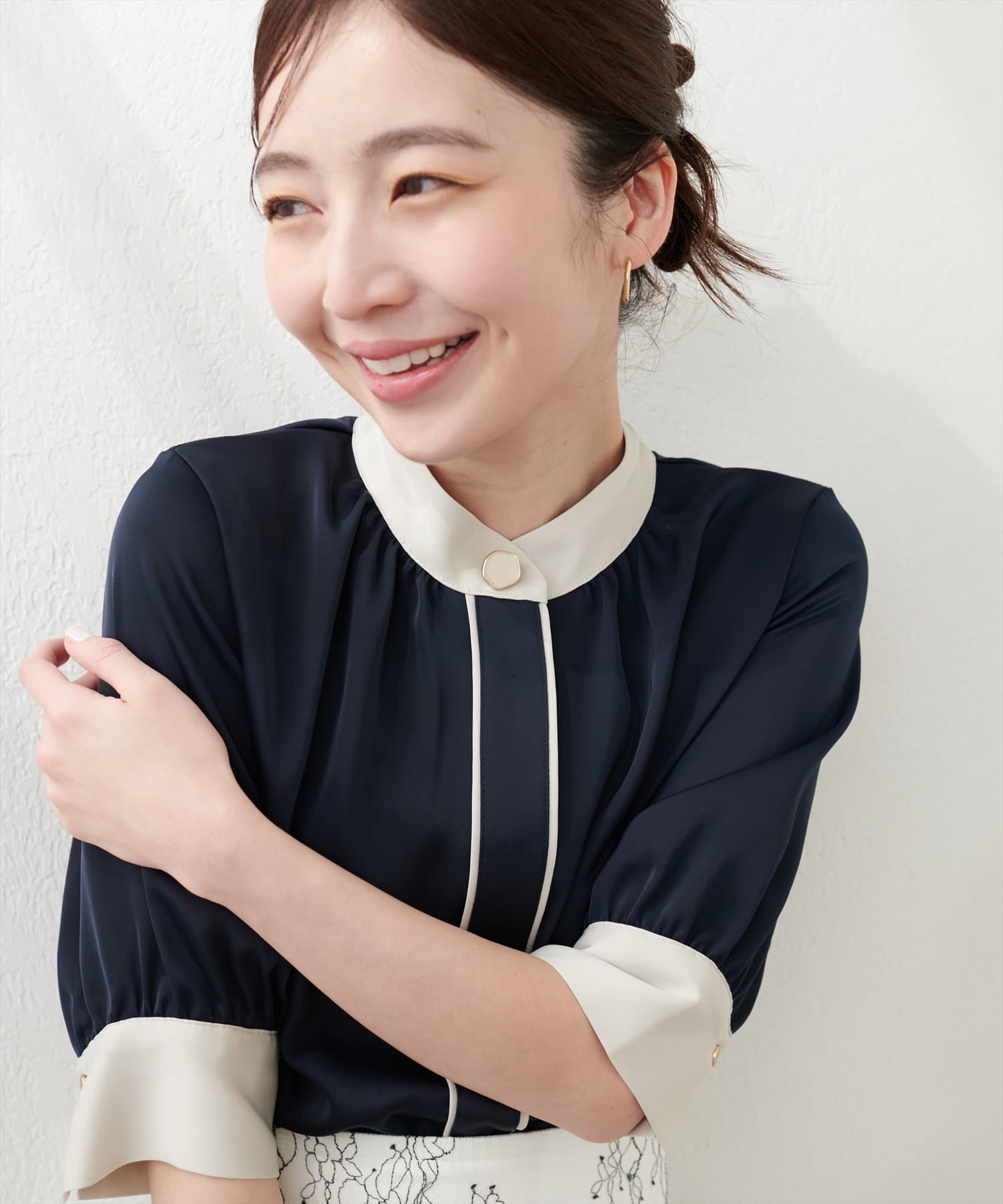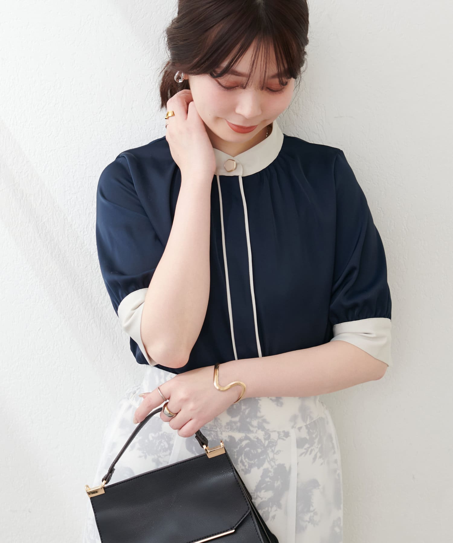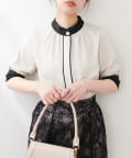 華やかで女性らしい雰囲気と配色のトリミングをアクセントにメリハリをつけたフェミニンブラウス。