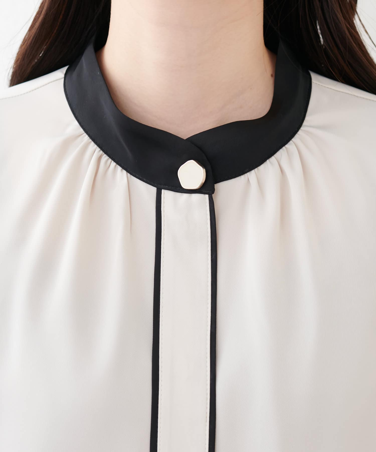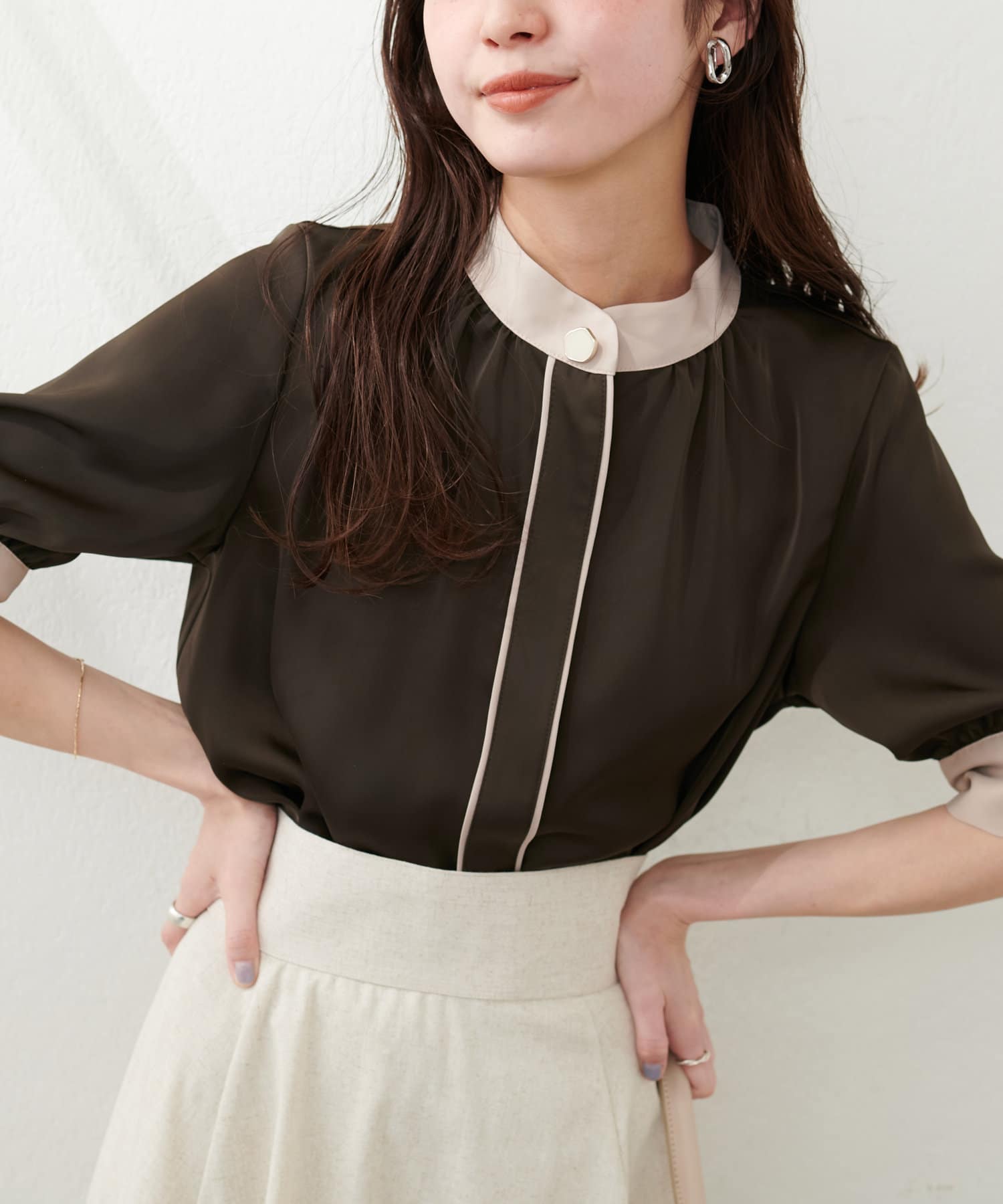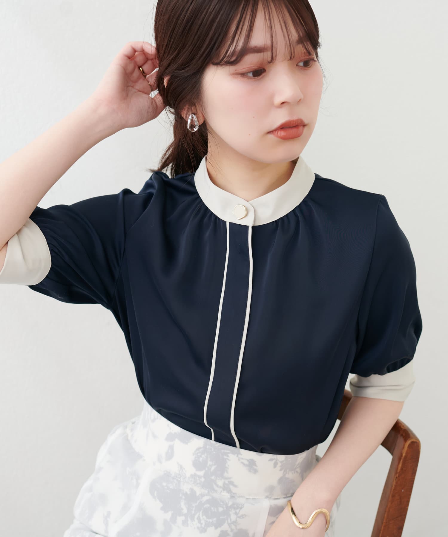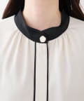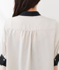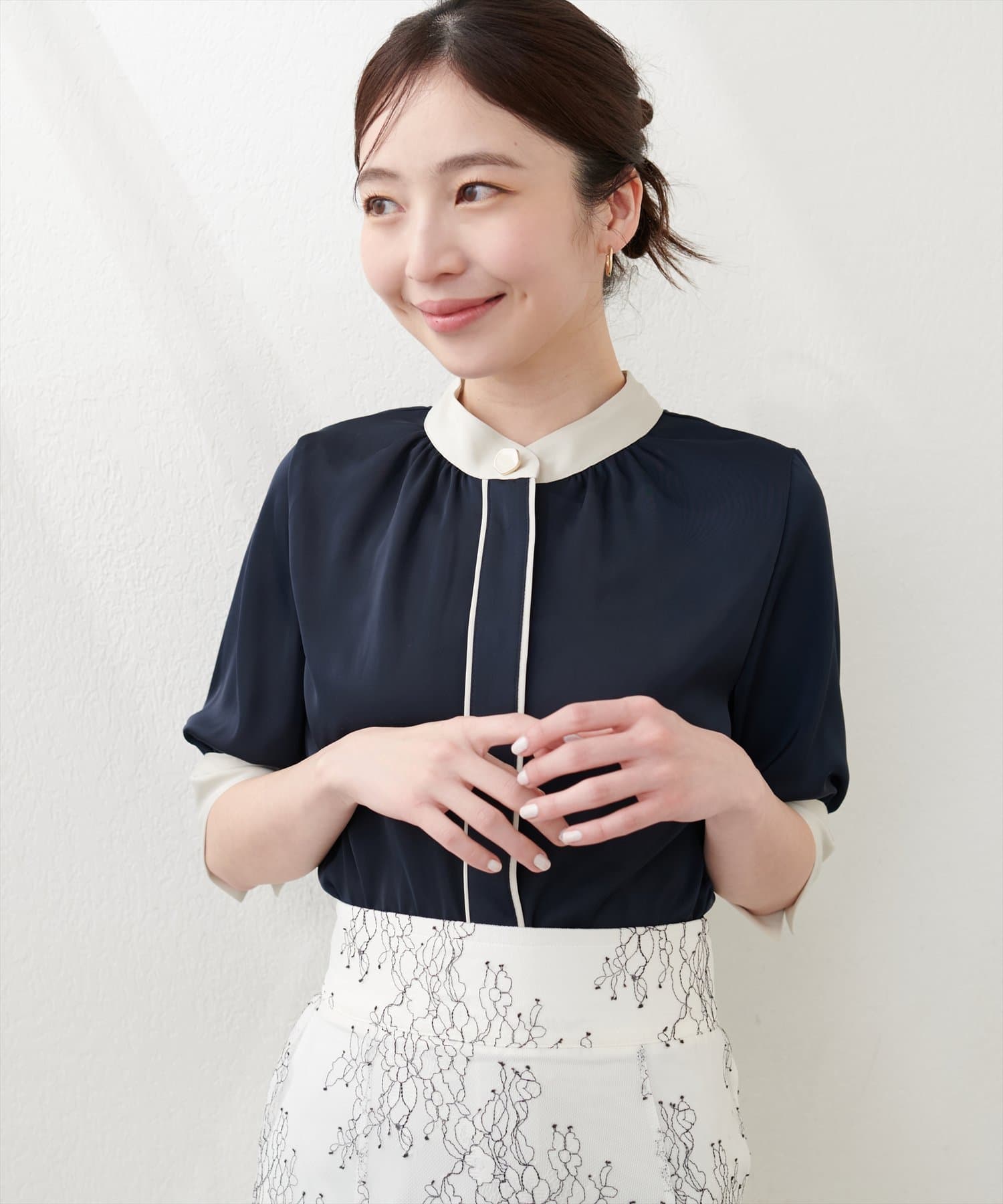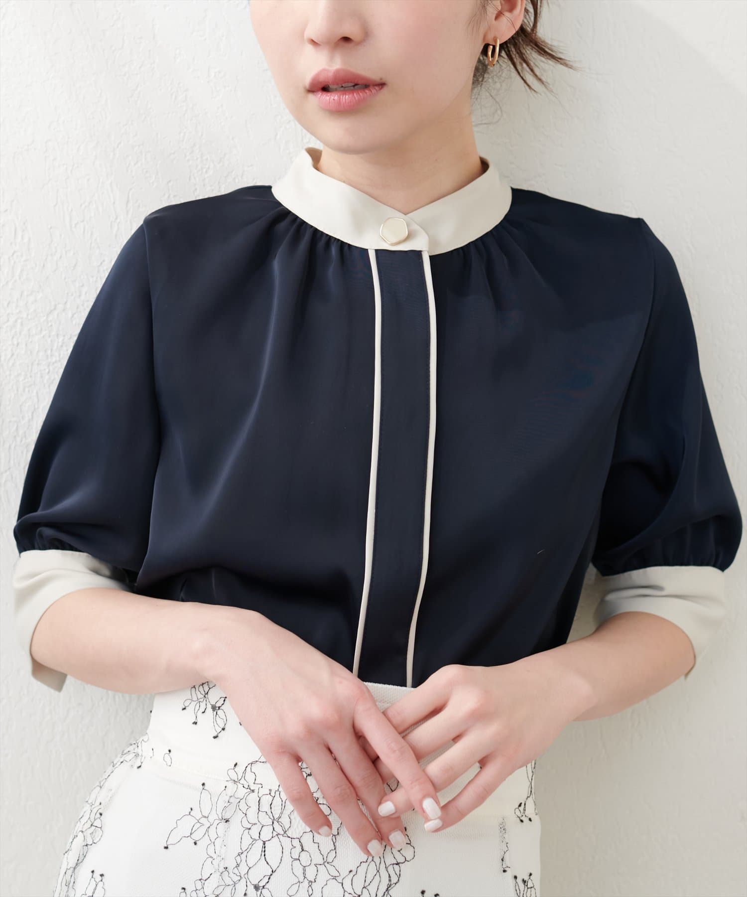 華やかで女性らしい雰囲気と配色のトリミングをアクセントにメリハリをつけたフェミニンブラウス。