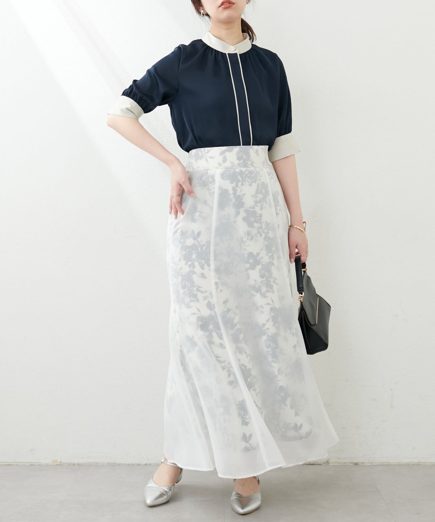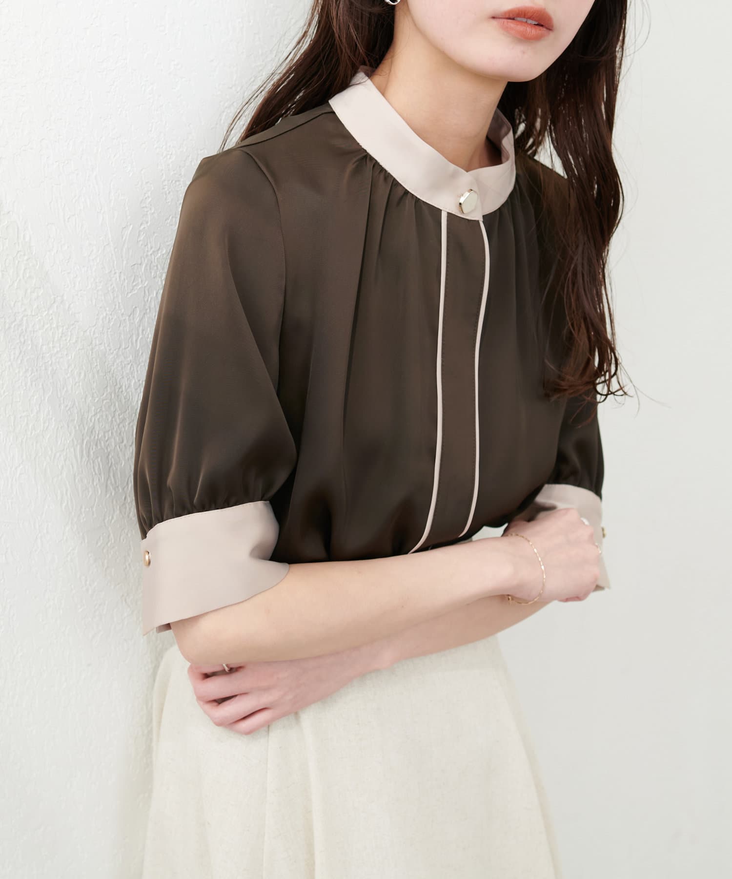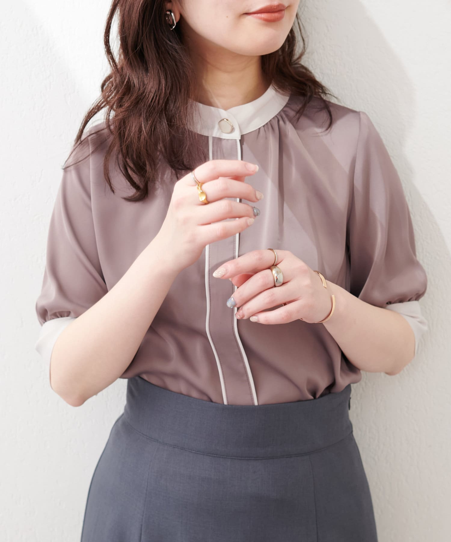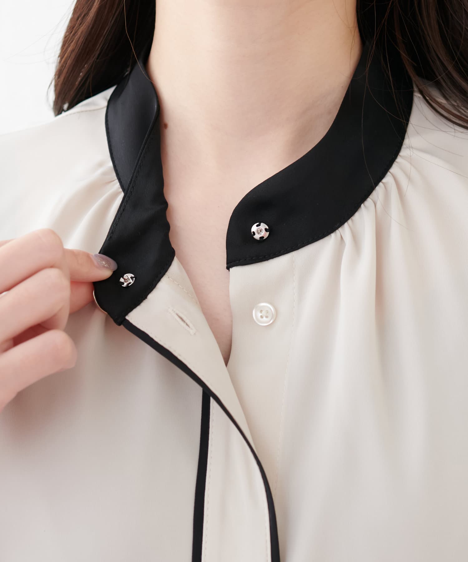 華やかで女性らしい雰囲気と配色のトリミングをアクセントにメリハリをつけたフェミニンブラウス。