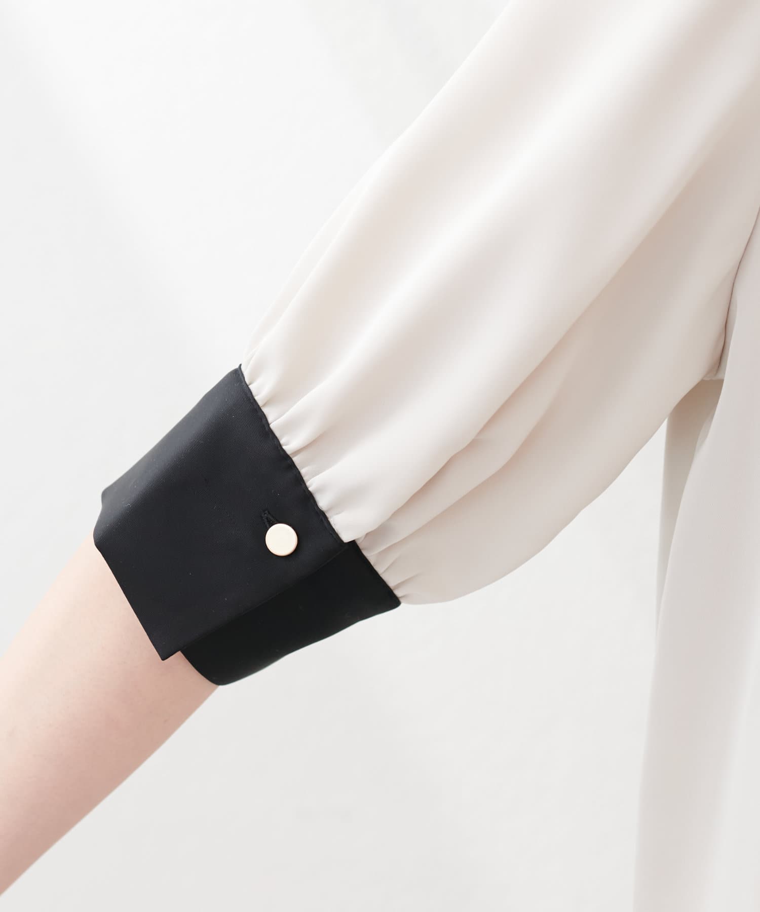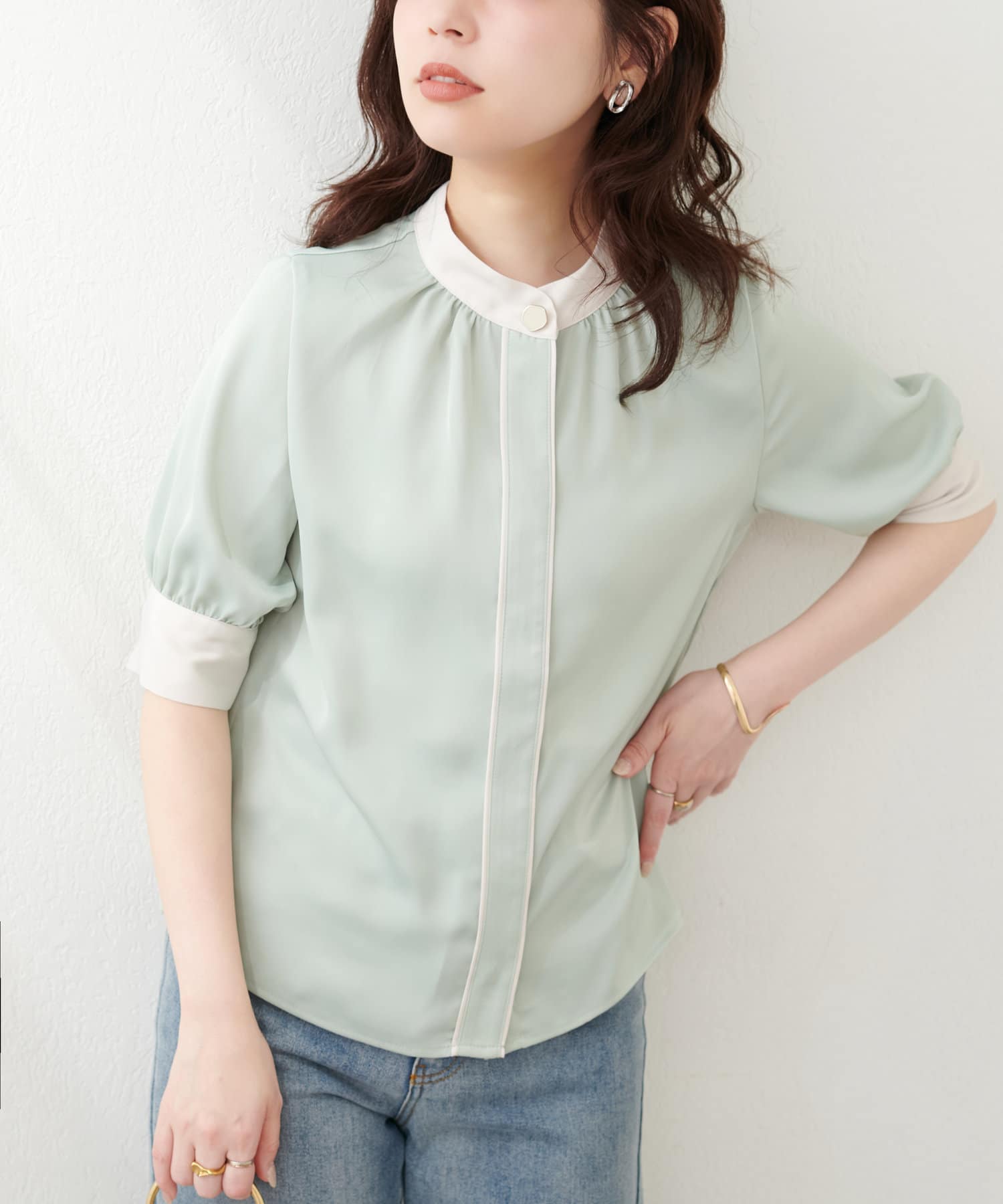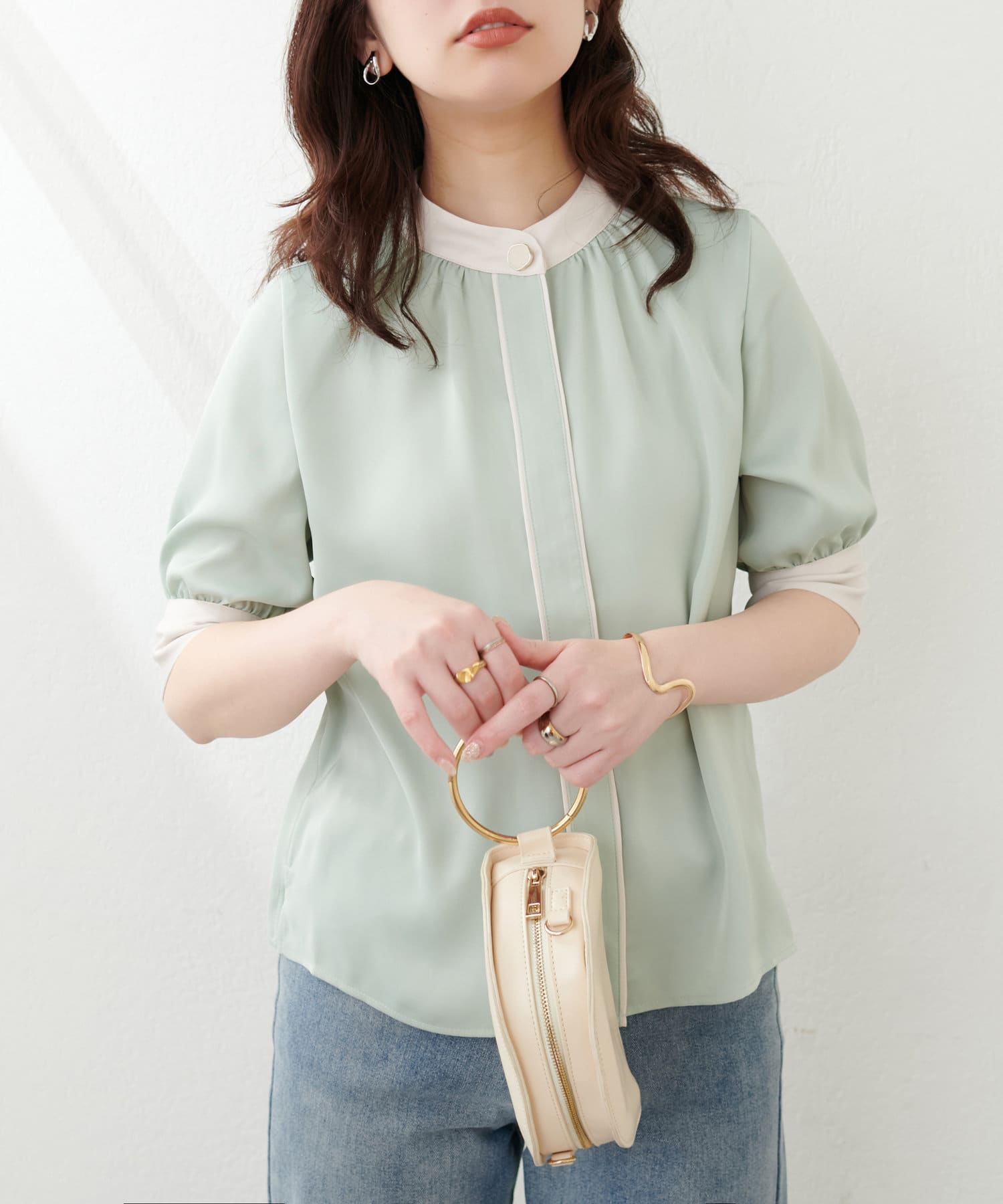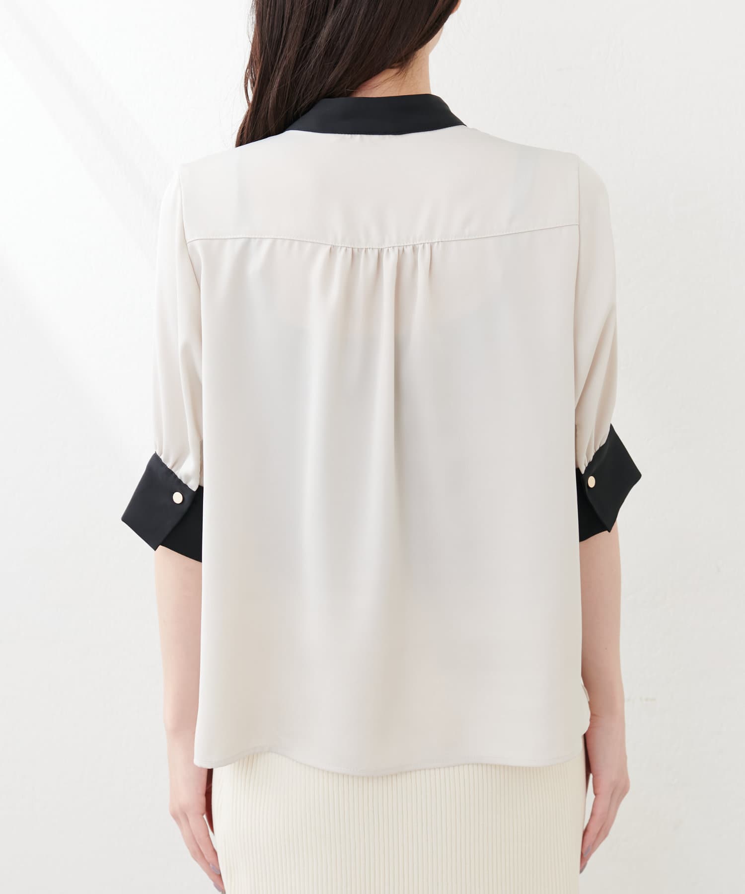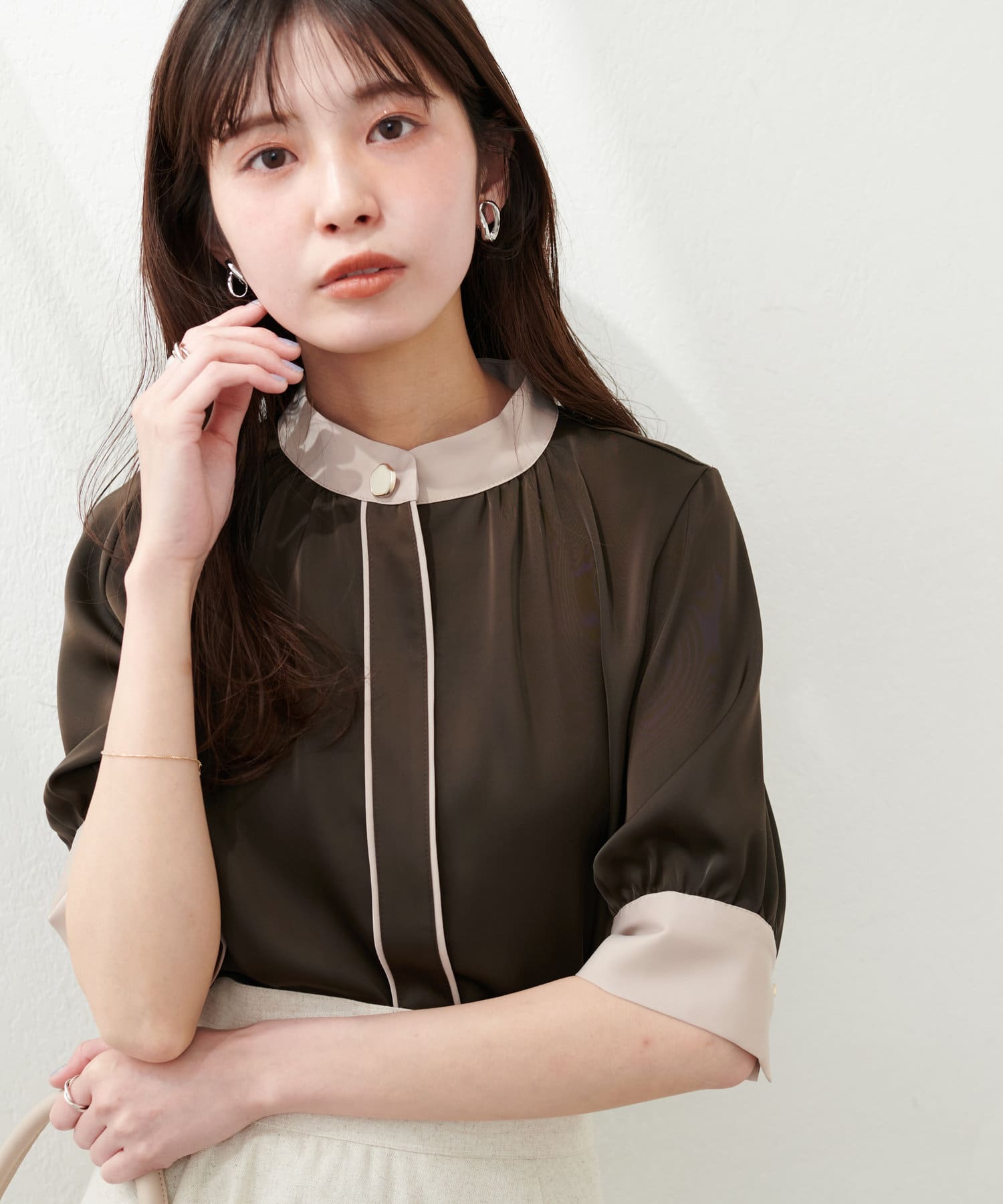 華やかで女性らしい雰囲気と配色のトリミングをアクセントにメリハリをつけたフェミニンブラウス。