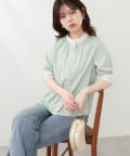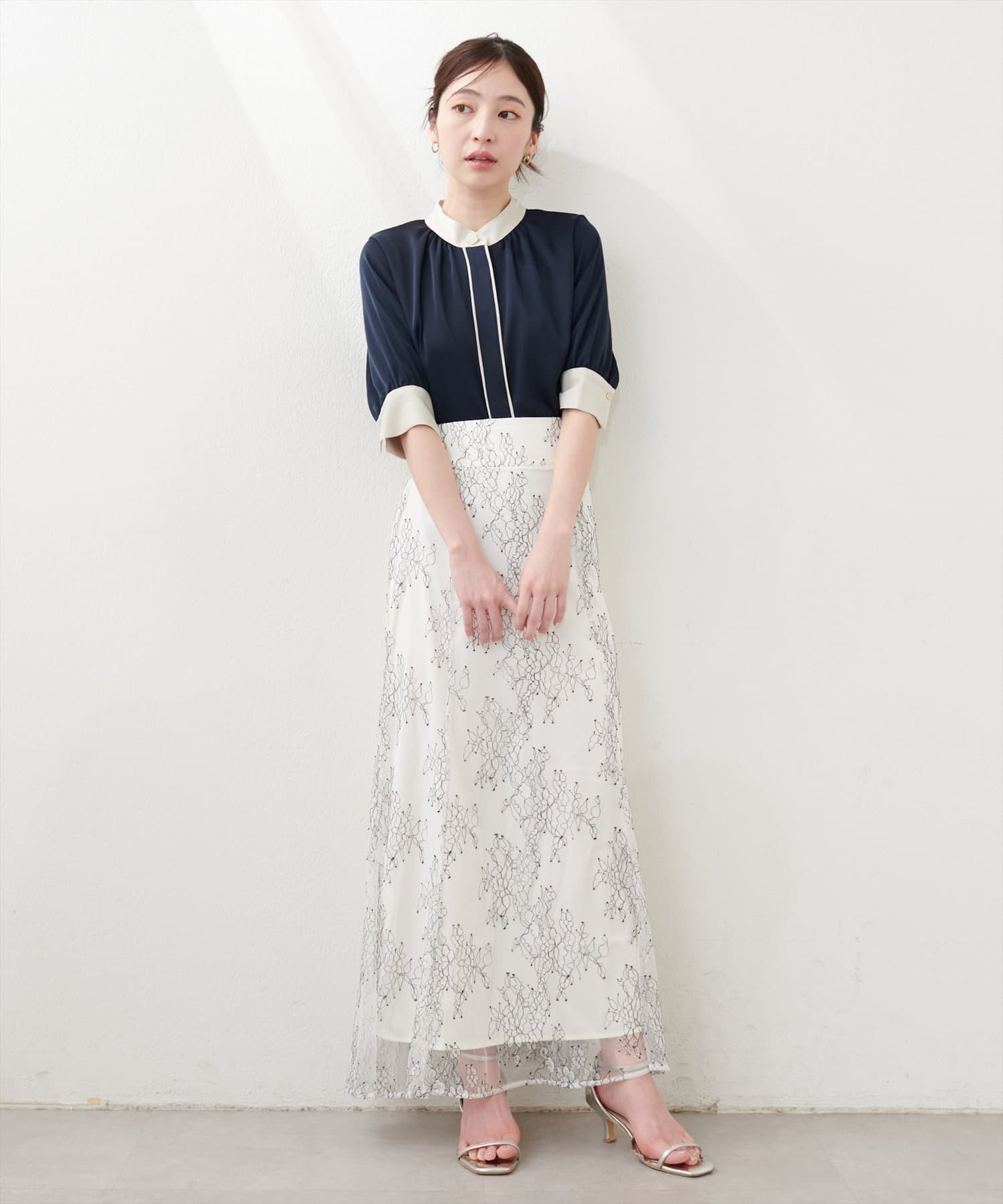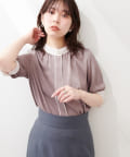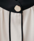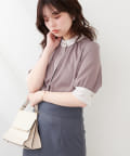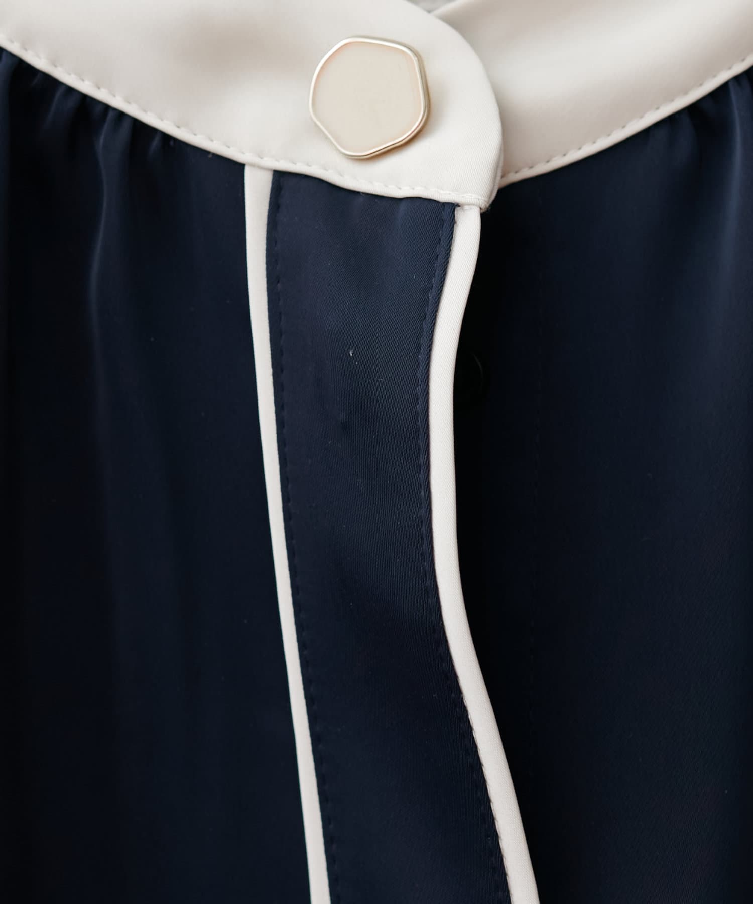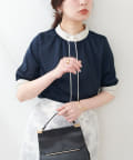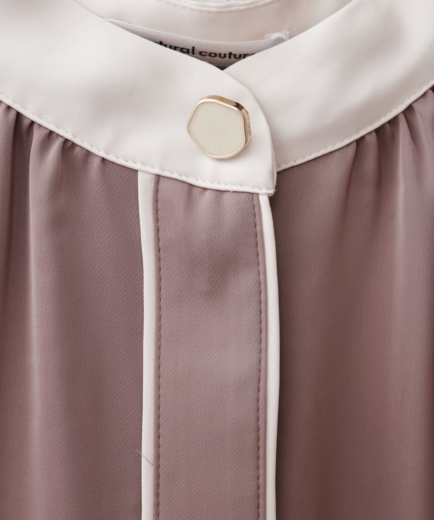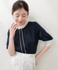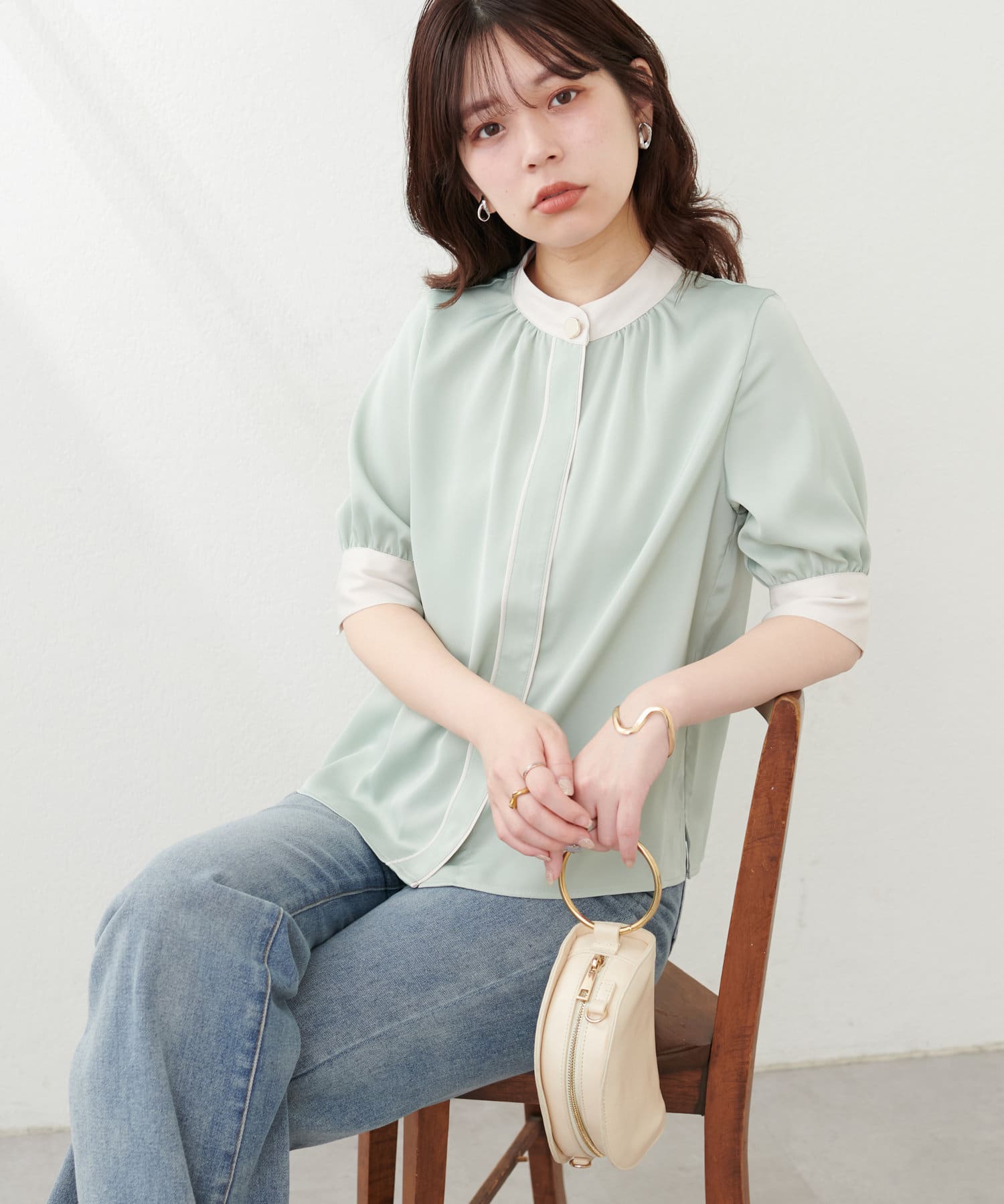 華やかで女性らしい雰囲気と配色のトリミングをアクセントにメリハリをつけたフェミニンブラウス。
