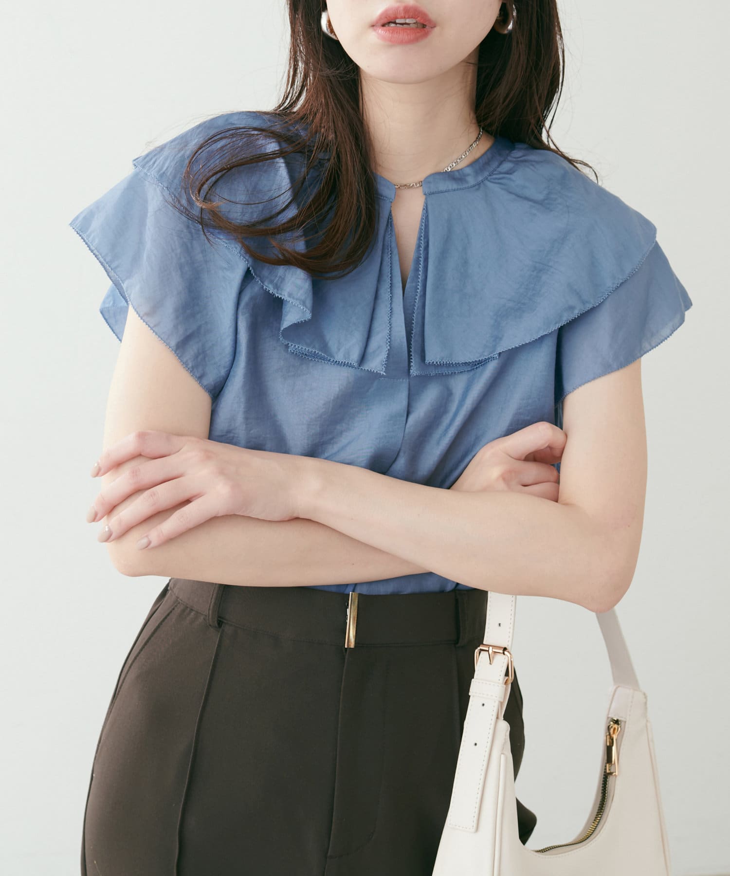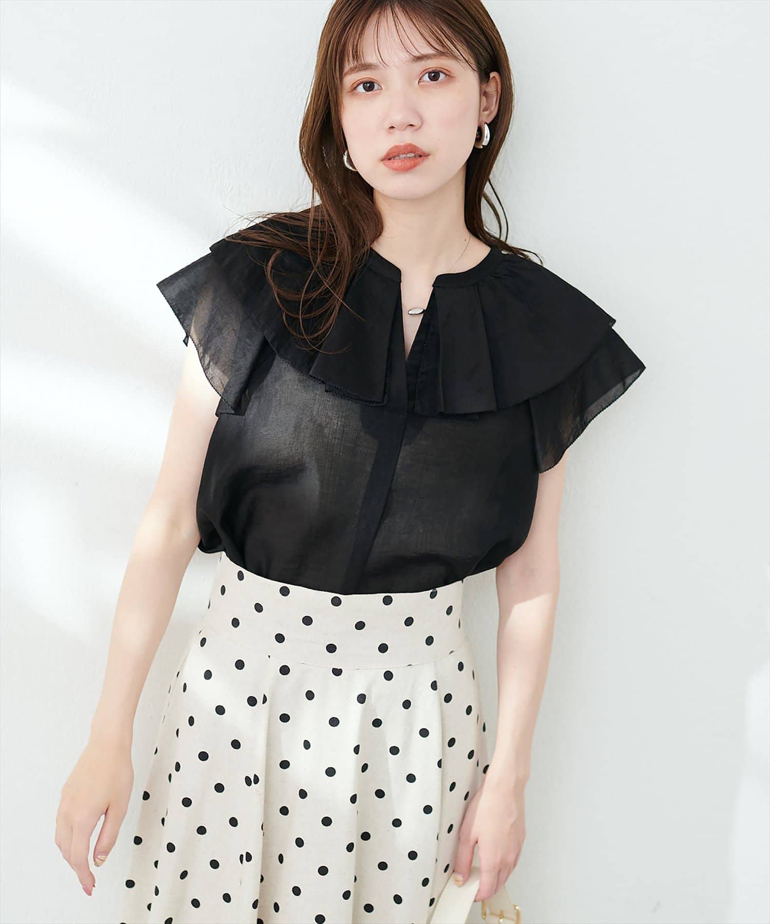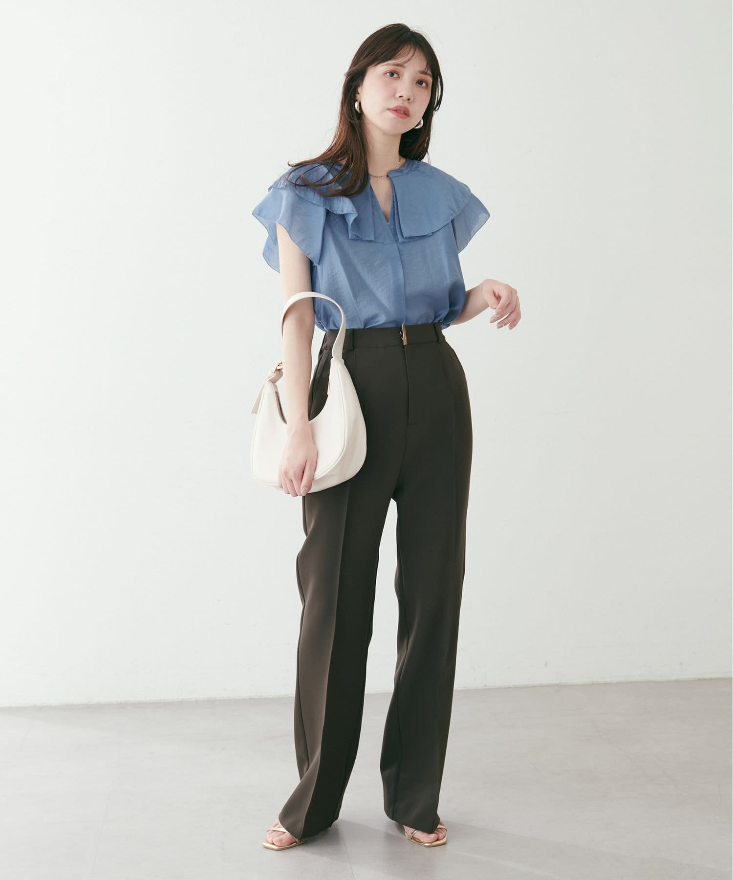甘すぎない柔らかなフリル使いが、コーデにさりげないポイントをプラスしてくれます。