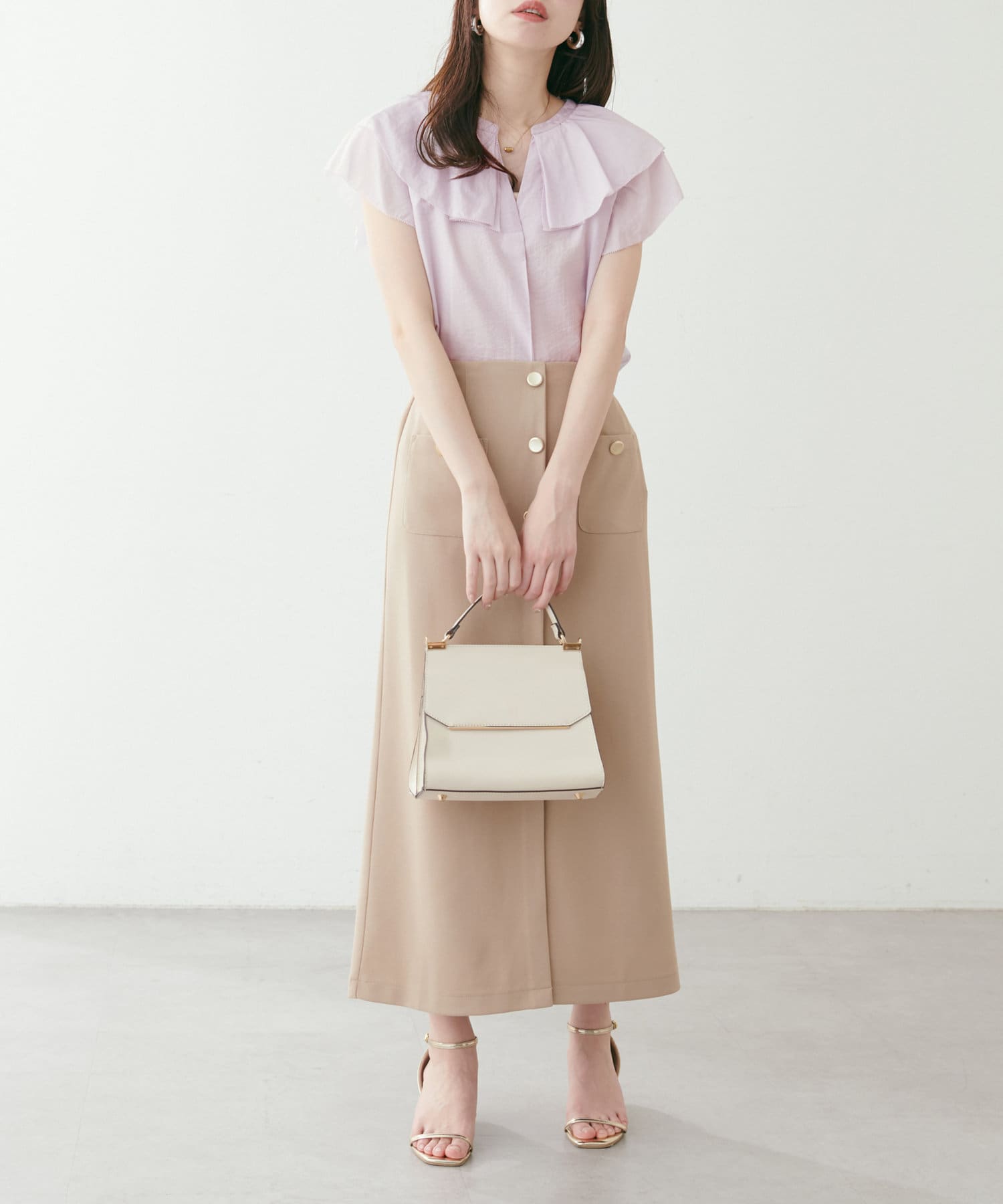 マーメイドシルエットやフレアラインのスカートにウエストインして頂くと、女性らしさが引き立つ上品スタイルに◎