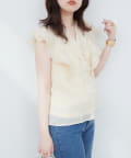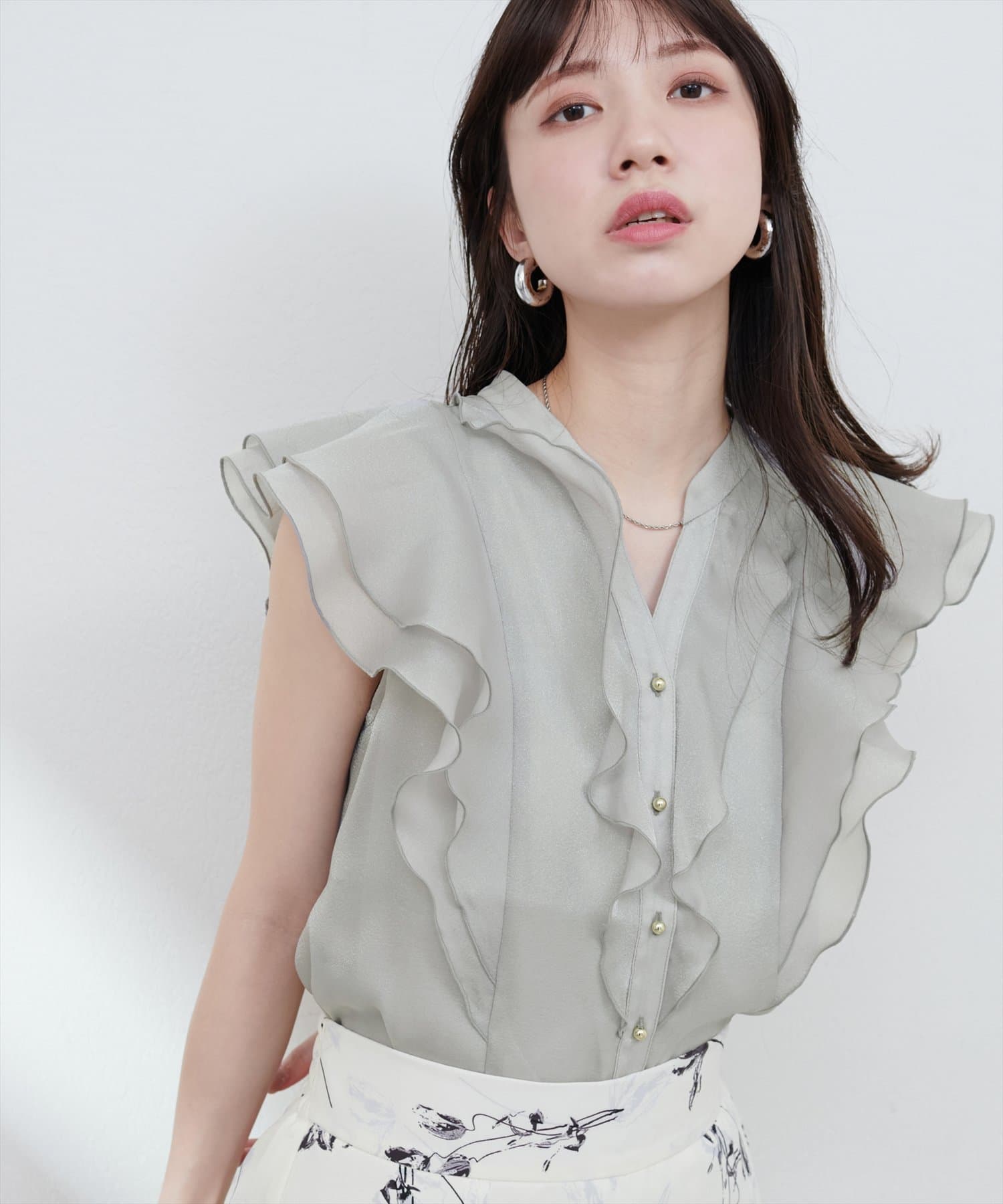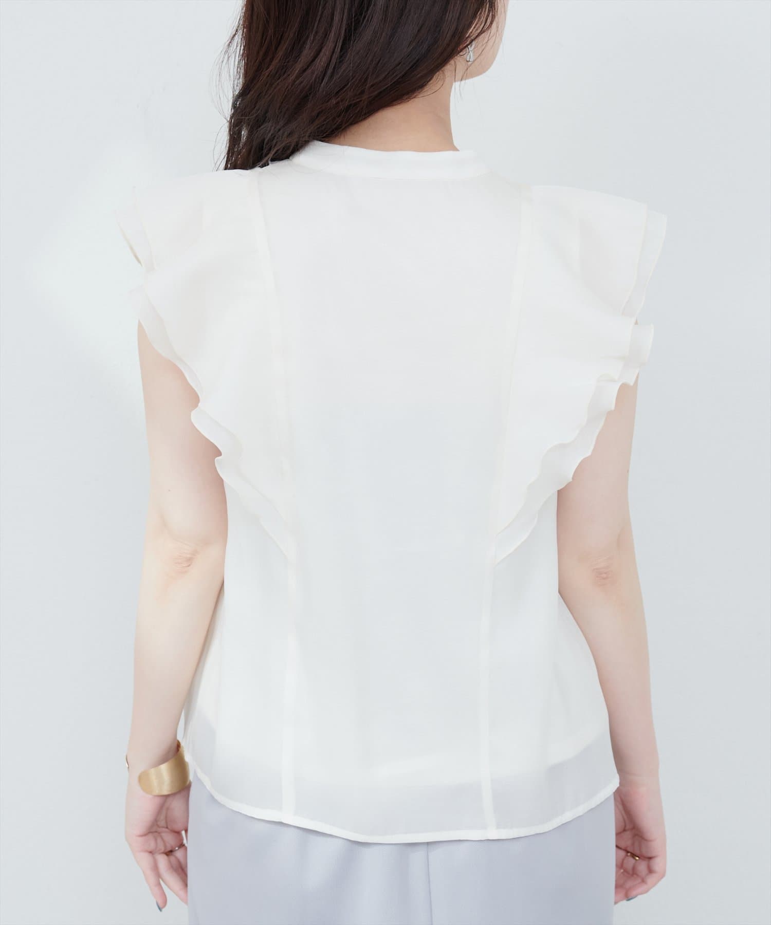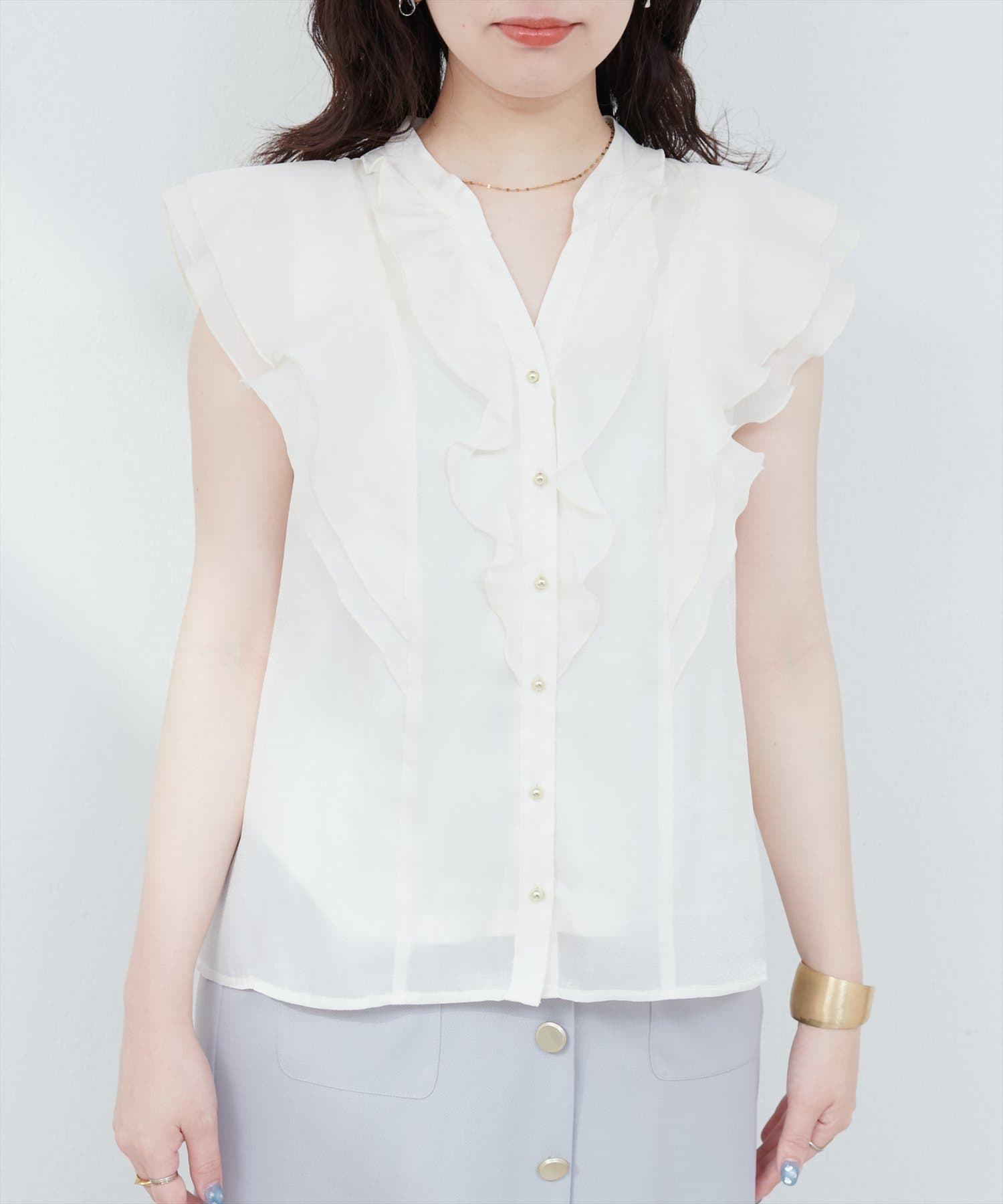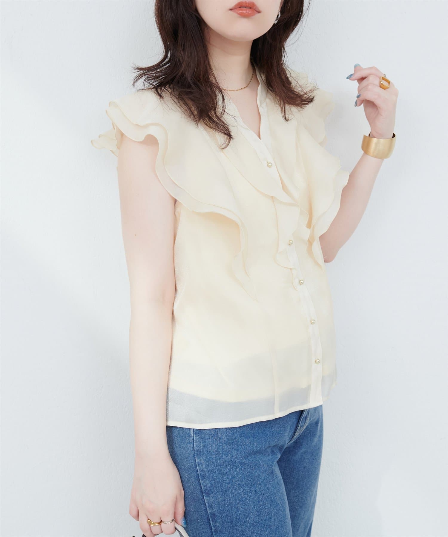 コーデに加えるだけで甘さをプラスしてくれる、ラッフルスリーブデザインが魅力なブラウス。